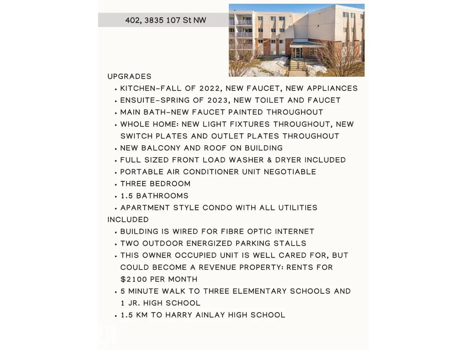 Fantastic 3 bed TOP FLOOR (private/quiet) w/IN-SUITE LAUNDRY: LG front-load washer/dryer. 2 PARKING STALLS (outdoor energized #'s 13 & 14). CONDO FEES $803.00/month ARE ALL INCLUSIVE: heat, electricity, water, snow removal, landscaping, and contributions to Reserve Fund. 10 blocks from Southgate/LRT (Century Park). Ideal rental property; rent 2 bedrooms out to cover your costs & live in the 3rd for free. In June 2017 RENO's THROUGHOUT ALL COMMON AREAS of the building included: new carpeting, baseboards, paint, light fixtures, fire doors, lobby. Newer power line to complex. Building is wired for Fibre optic internet. Whole home has been renovated, new fixtures throughout. Large West-facing deck. Master has 2 separate closets and ensuite washroom. Large storage room in suite. Cats allowed, but no dogs. Taxes 2025 $1,353.56. (id:27476)