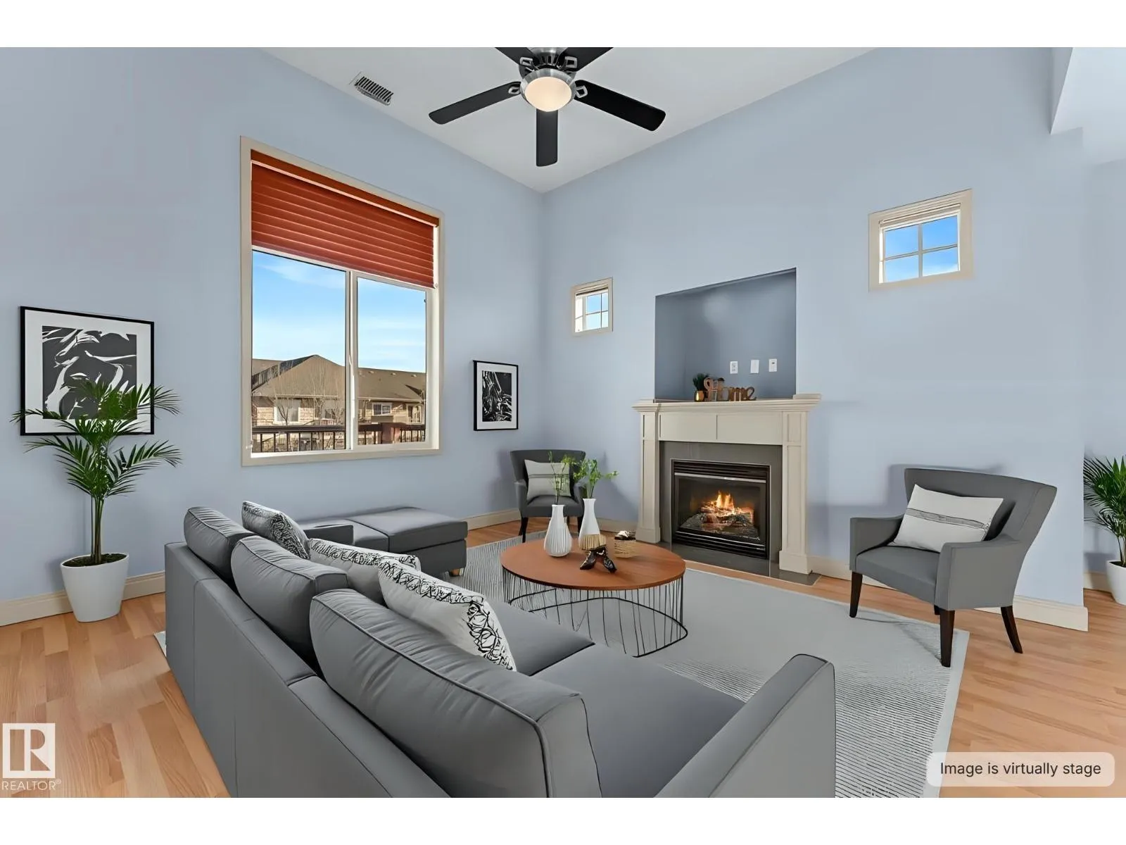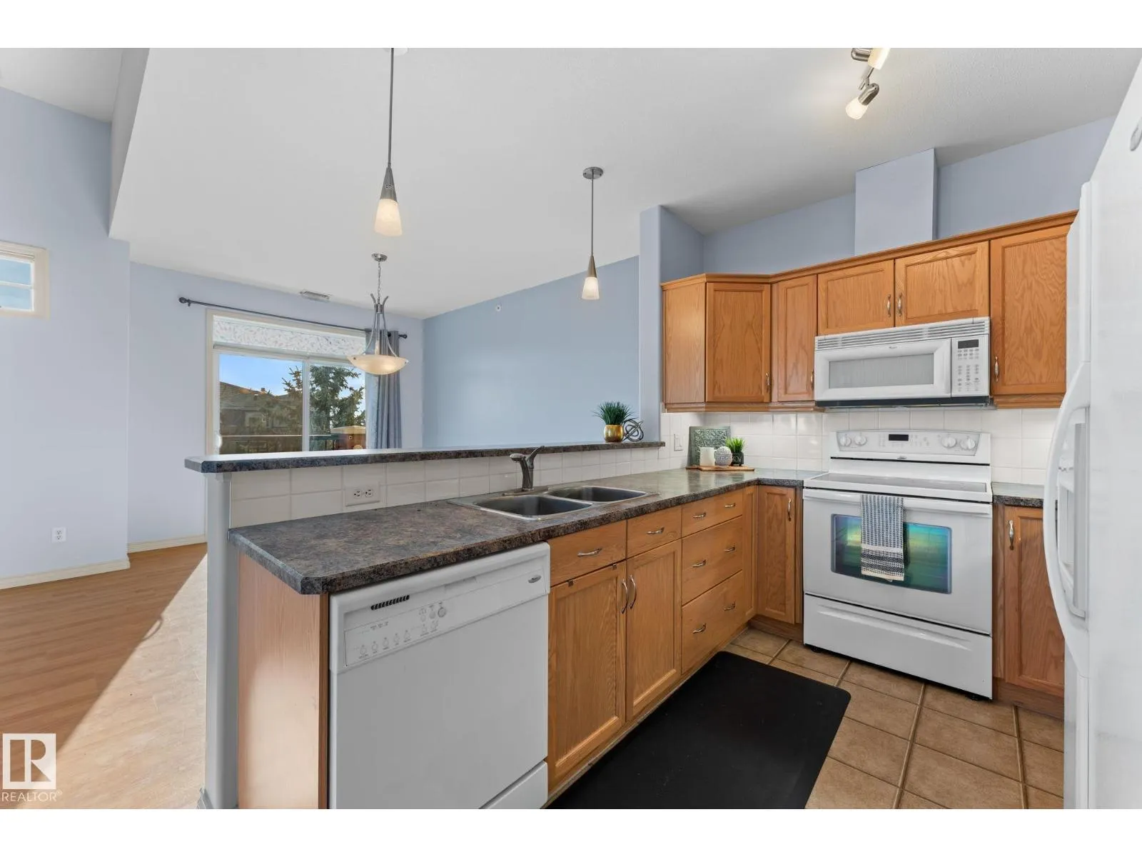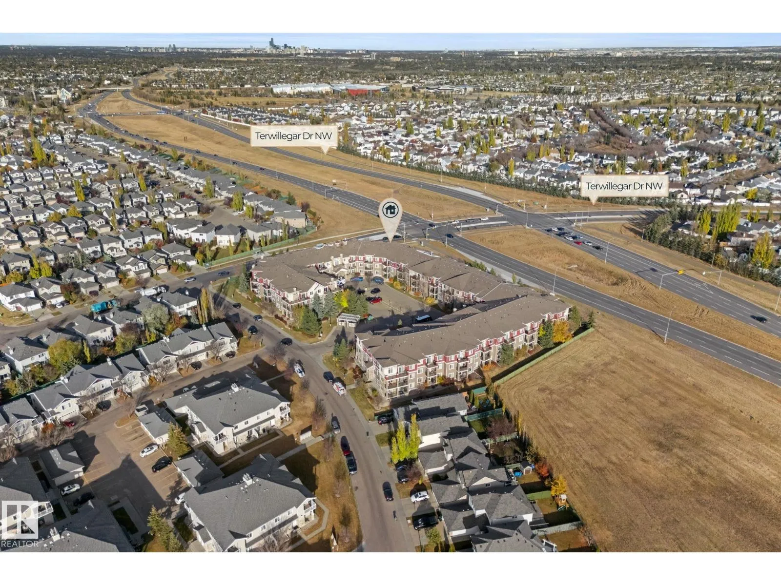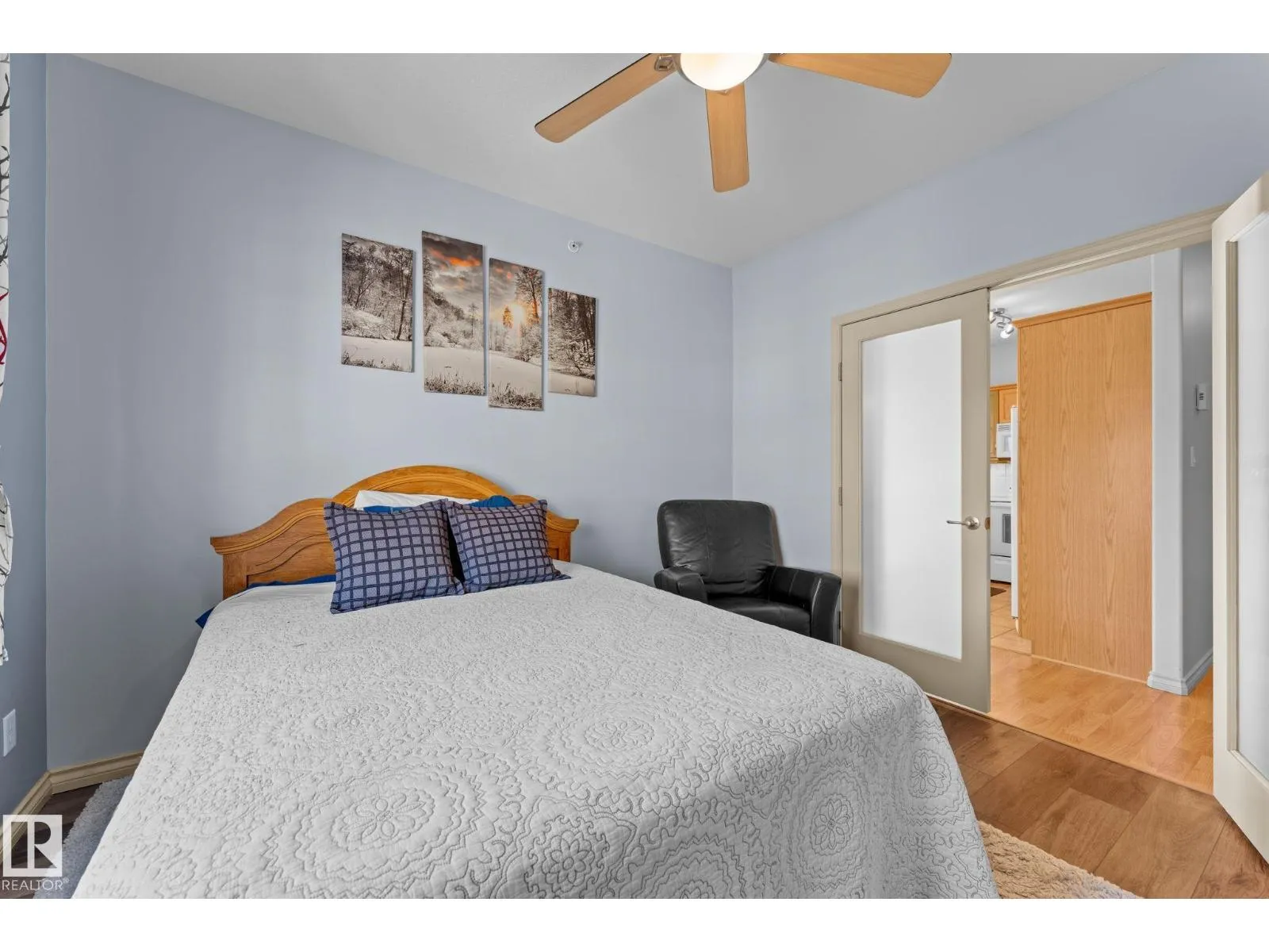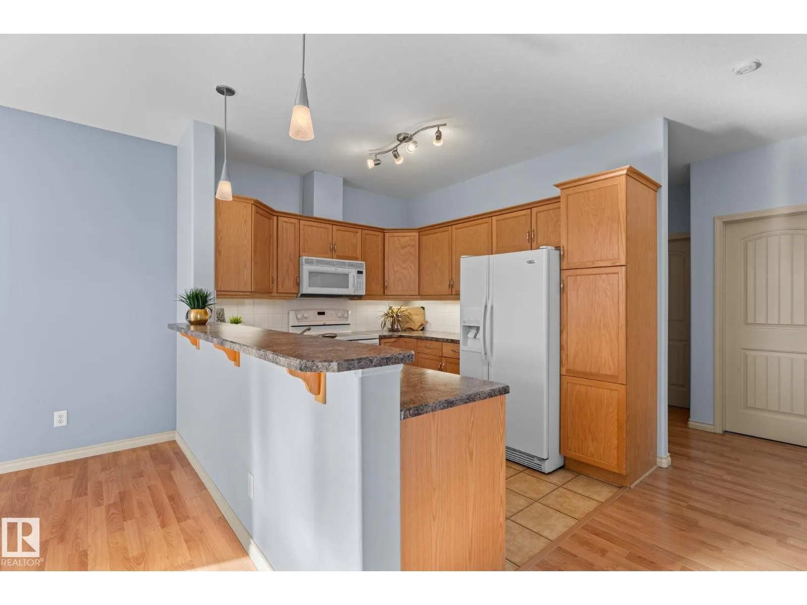 Rare offering, 3 bedroom, 2 bath top-floor corner unit w/ massive wrap-around southeast balcony. Extra large unit at over 1300 sq ft, vaulted 12-ft ceilings, a bright open-concept layout. The spacious primary suite is privately located away from the other bedrooms, easily fits a king bed, and includes dual walk-through closets and a 4-piece ensuite with double sinks and a walk-in shower. This immaculate unit offers newer flooring (no carpet), A/C, gas fireplace, gas BBQ hookup. The kitchen, dining, and living areas flow seamlessly, creating an airy, light-filled space perfect for entertaining. Large laundry room w/ extra storage, 2 titled heated underground parking stalls (one beside the elevator and one beside the stairwell), and storage locker. Condo fees incl. heat, water, and sewer. Pet-friendly building offers premium amenities: fitness room, theatre, games lounge, guest suite, and car wash bay Situated, within minutes of major shopping, dining, and quick access to the Anthony Henday. (id:27476)