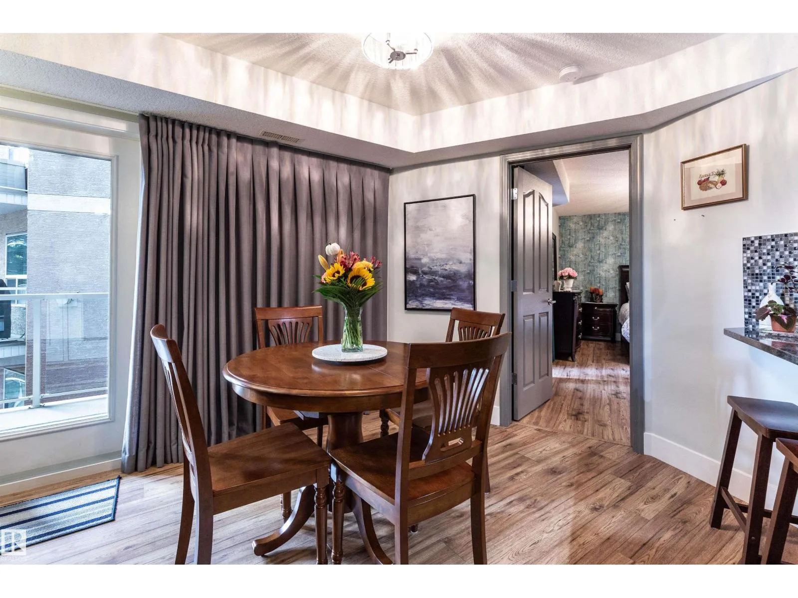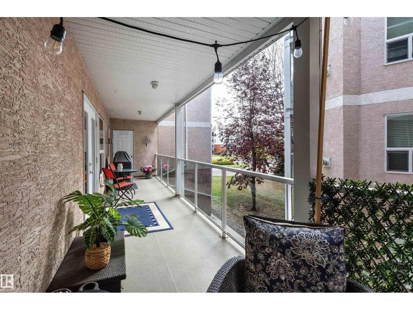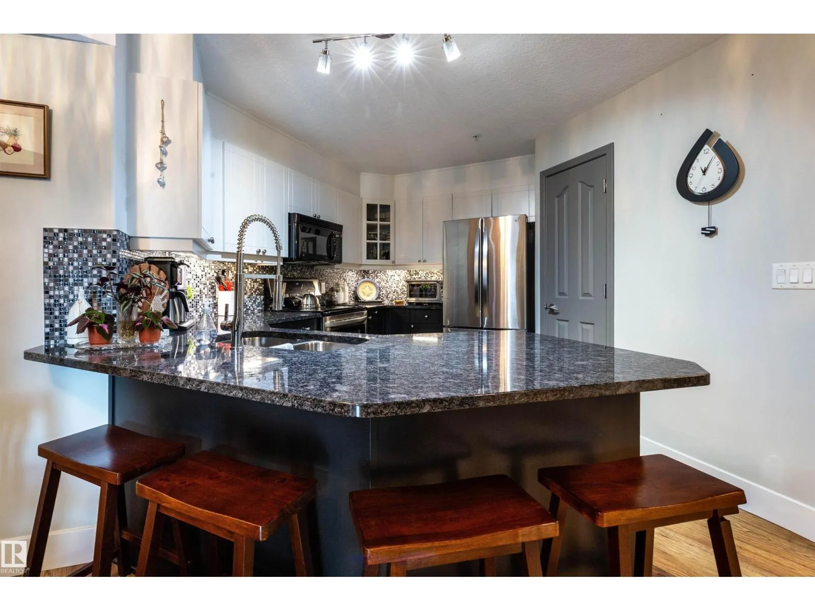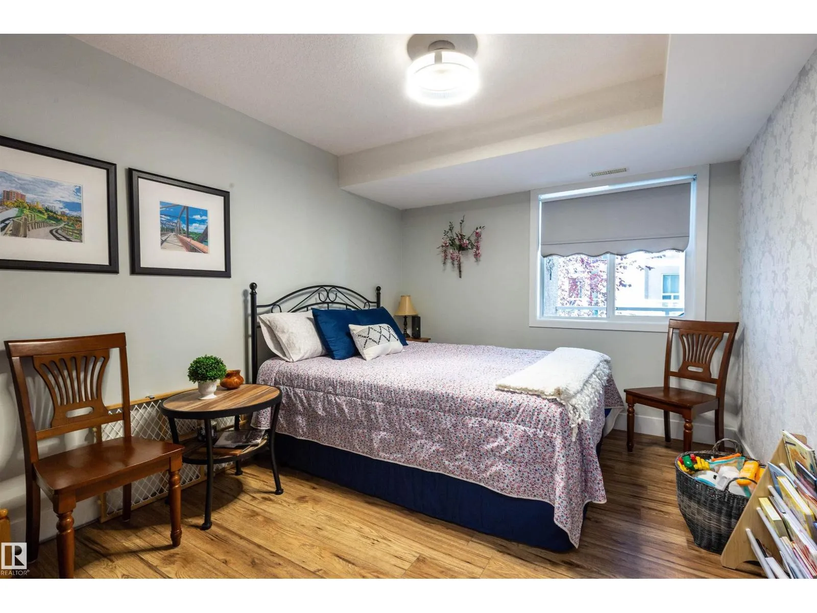 Welcome to the condo community of River Grande in Riverdale. This renovated 1010 sq ft 2nd floor unit has been Updates include new paint, wall paper, walk in wardrobes in both closets, new trim, lighting, updated bathrooms, custom drapery, a spacious laundry room with built in organization. Enjoy year-round comfort with underground heated tandem stall, front storage area, featuring a carwash. Central A/C, and a cozy gas fireplace. Walk in pantry, stainless steel appliances accent the kitchen's granite countertops. The primary bedroom easily accommodates a king-sized bed with two nightstands, while the second bedroom comfortably fits a queen and two nightstands. Your large private balcony is a beautiful space for relaxing or entertaining. This well-managed complex has a great community feel. Social room, gym, games room, car wash. Close to the River Valley Trails, minutes to Downtown, Bread & Butter Bakery steps away! Super Edmonton location! (id:27476)