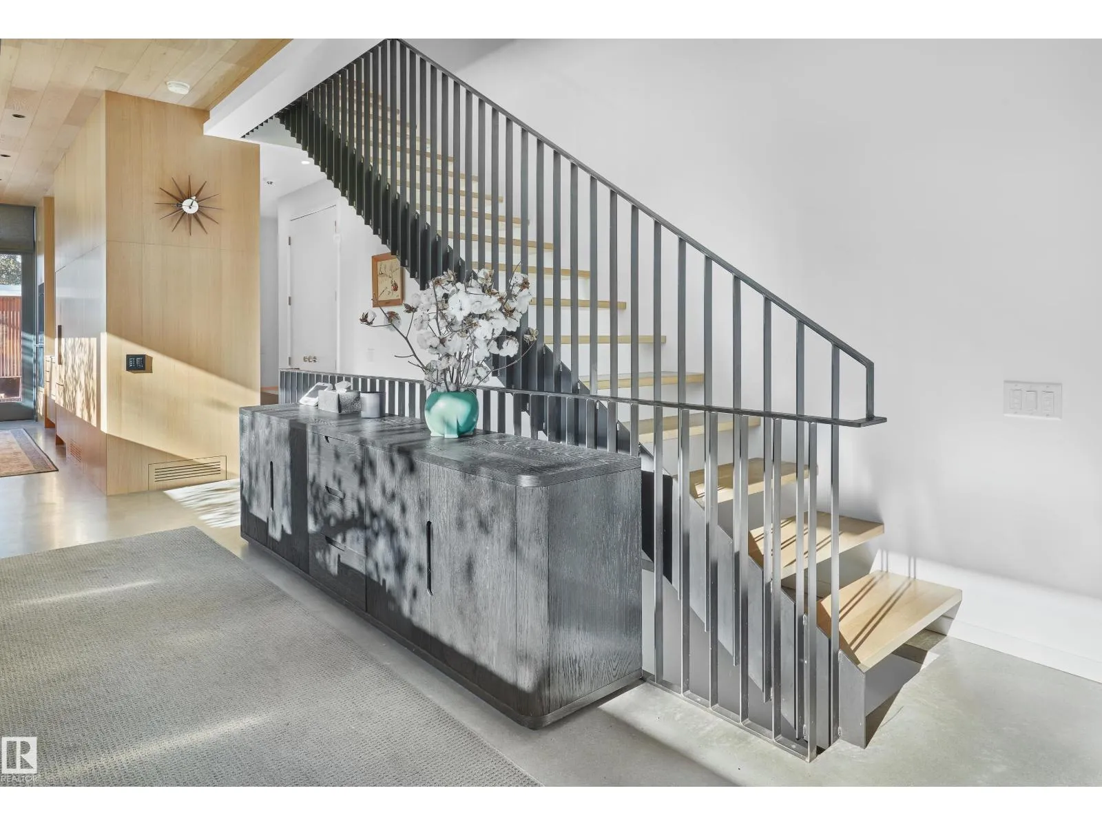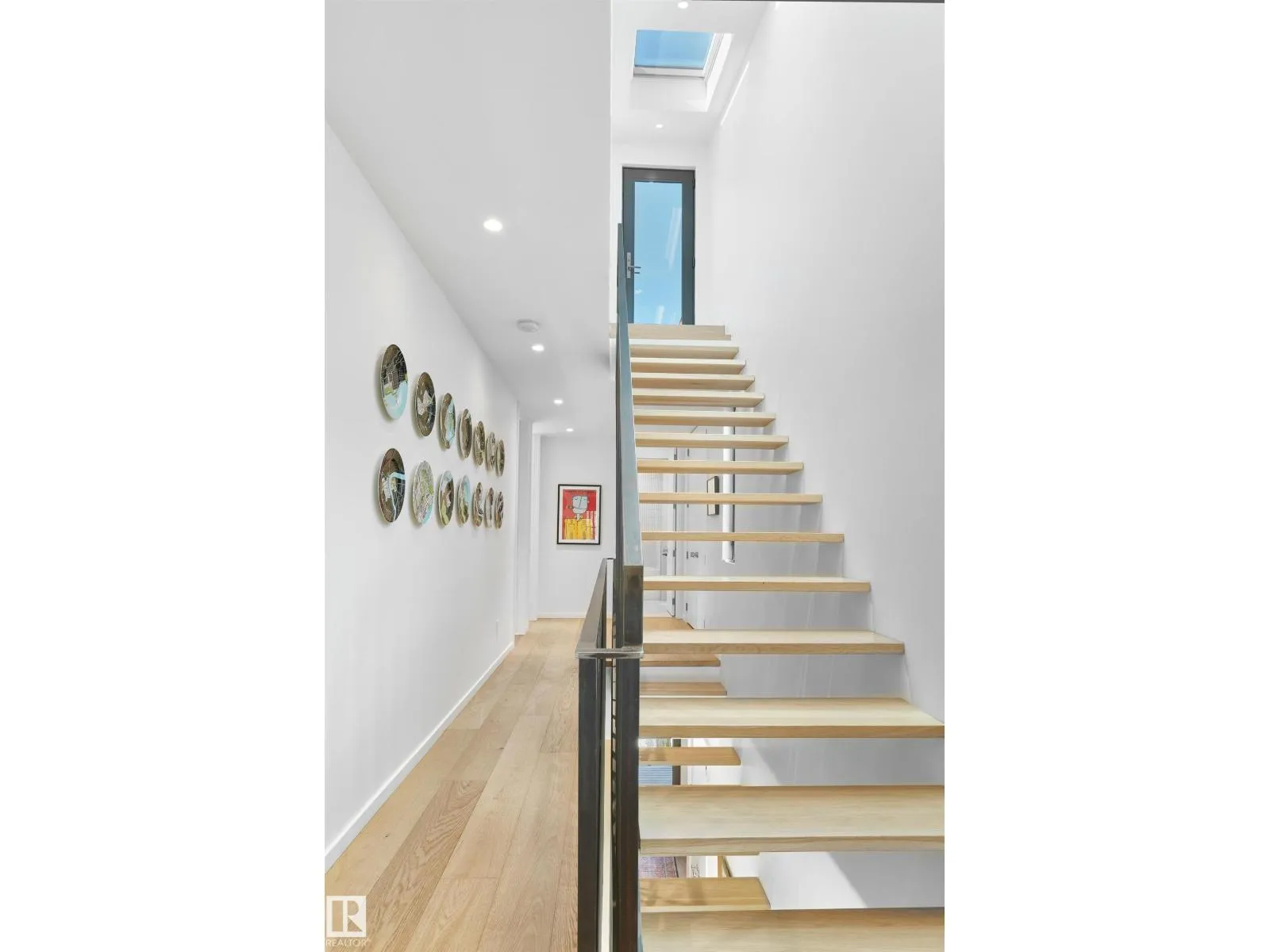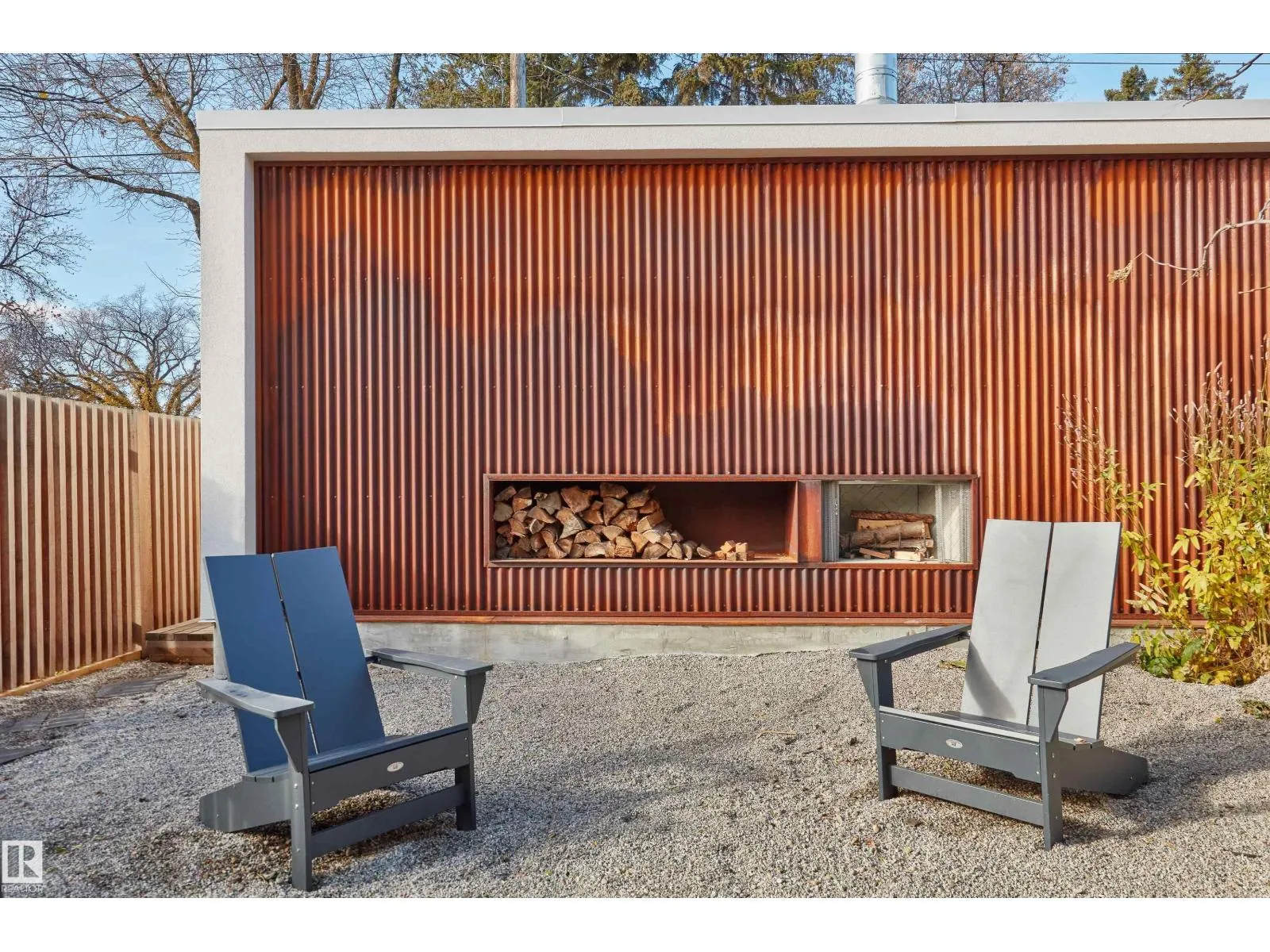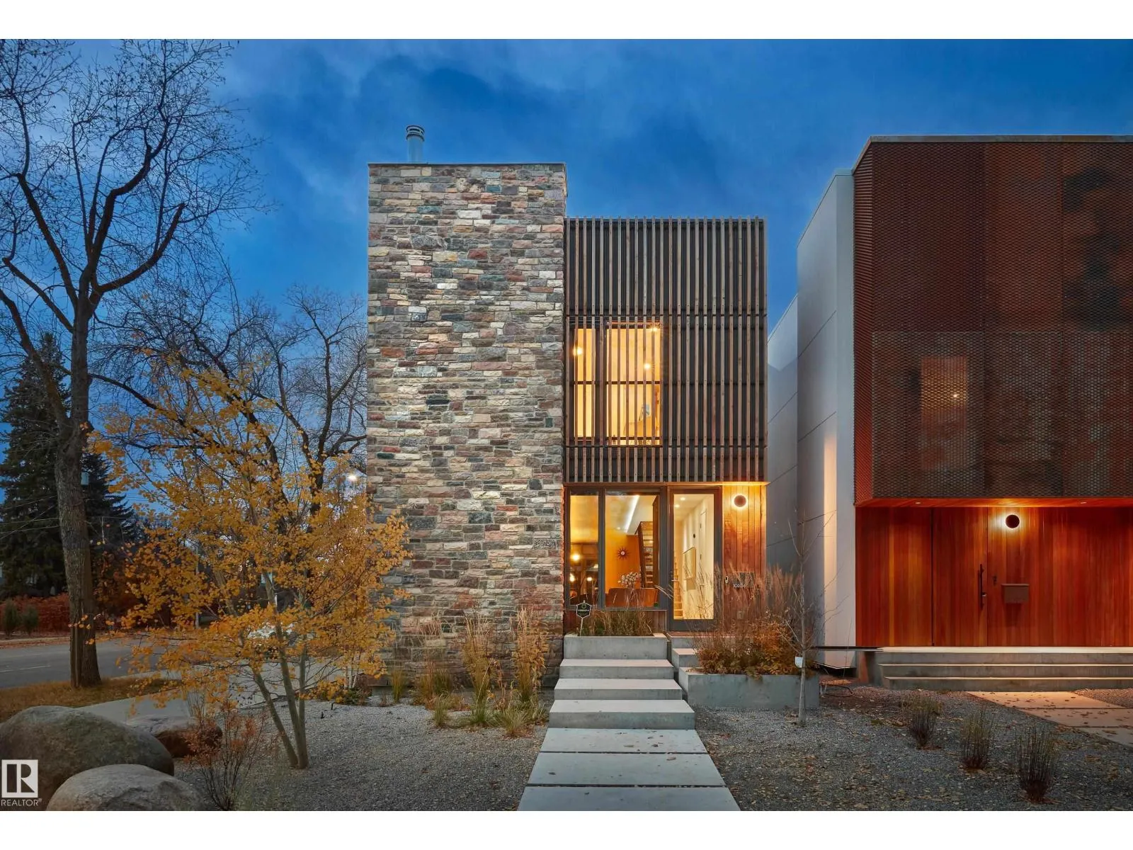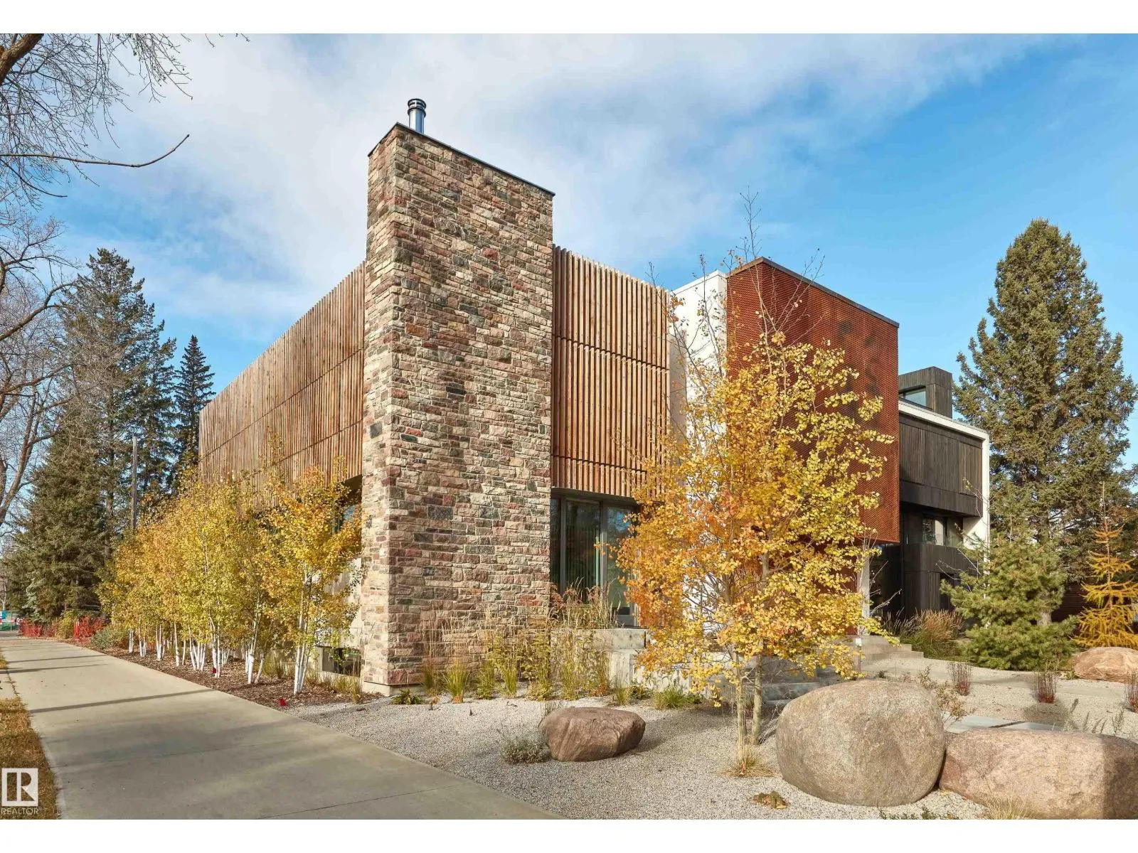 Designed by Edmonton City Architect Carol Belanger, this remarkable Old Glenora residence reinterprets the low-slung modernist home that once stood on the site. With over 2,800 sq. ft. of finished living space, it balances heritage and innovation with quiet confidence. The striking stone chimney, painstakingly rebuilt from salvaged materials, anchors the home in its history while defining a new architectural chapter. Inside, a luminous ribbon window traces the south façade, framing open horizons and intimate moments in equal measure. Wrapped in warm wood and textural stone, the upper level appears to float, a refined nod to a modern tree fort. Light shifts gently across each surface throughout the day, revealing new tones and textures. Every material, polished concrete, natural textural wood, cold-rolled steel, and verdant tile, contributes to an atmosphere of enduring craftsmanship and understated luxury. This is contemporary Edmonton living, rooted in legacy and elevated by design. (id:27476)