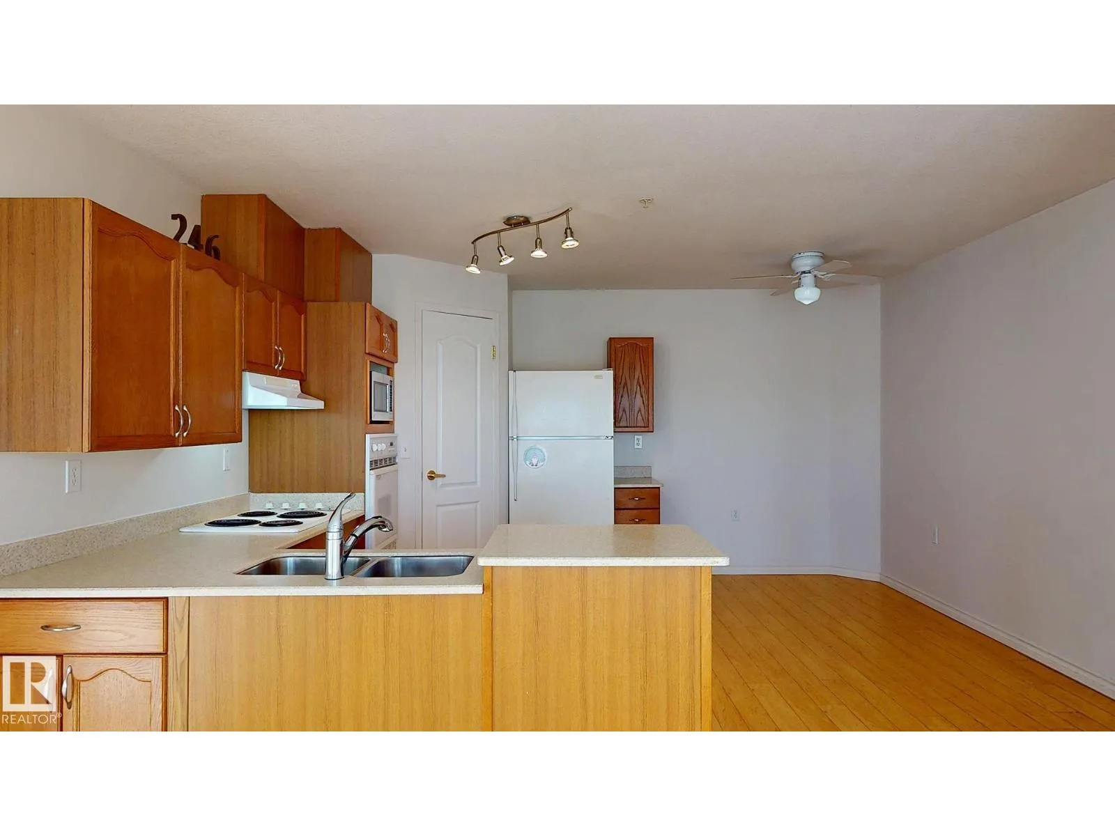 Adult living in desirable Kensington . Shephard's Place is a 55+ community complex. This 2 bedroom 790 square foot home has a wheelchair friendly design (no transitions). Large 11' x 12.9' primary bedroom and second bedroom or den. The bathroom is equipped with a custom easy access sit down shower. Separate laundry room in-suite with full size washer and dryer provides extra storage space. The spacious living room has access to the South facing balcony. Kitchen has Corian countertops, counter top stove, built-in dishwasher and pantry. This unit is carpet free. Amenities galore in the complex include a very private outdoor courtyard, hair salon, games room, chapel, dining facilities, social activities, exercise equipment and more. Indoor access to the other buildings - Shepherd's Garden Manor and Shepherds Care LTC. Conveniently located near shopping on 137 Avenue as well as Public Transit. Parking stall can be rented for $25 per month. (id:27476)