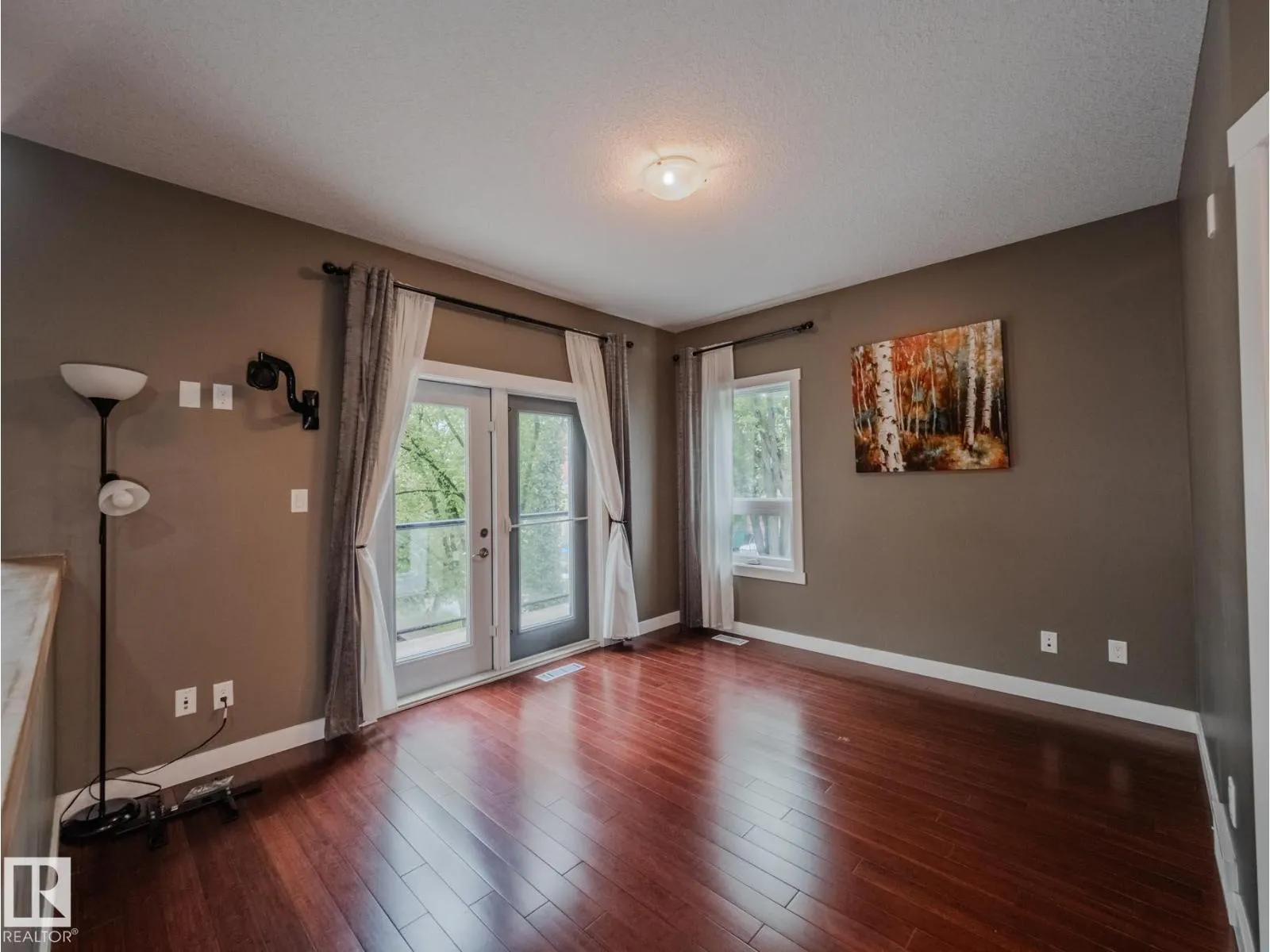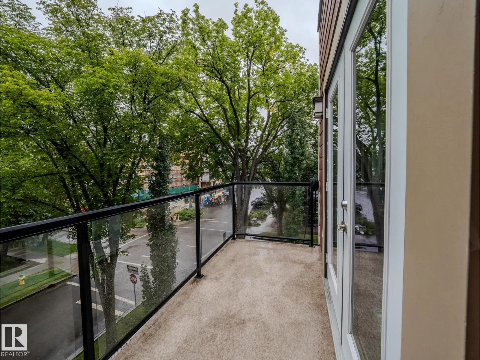IMMEDIATE POSSESSION. Incredible townhouse with THREE TITLED PARKING STALLS, a titled 13x13 workshop plus two balconies, nestled on a tree lined street, in the heart of Garneau. Less than a 5 minute walk to the U 0f A. This corner unit allows in tons of natural light from the numerous windows & 9' ceilings. The kitchen features a huge eat up island, granite counter tops, stainless steel appliances with gas stove & pantry. The open living/dining area has a stone encased gas fireplace & hardwood flooring. On the second level is a family room with large east facing balcony & built in shelving. Finishing this level is a three piece bathroom with large luxurious tiled shower & granite counter tops. The full size washer & dryer are stacked in this bathroom. On the upper level is the primary bedroom with south facing balcony, four piece en-suite & walk-in closet. The spacious titled workshop is located in the parkade. All three stalls are together. Additional sound insulation. A/C. Condo fees cover heat & water. (id:27476)
