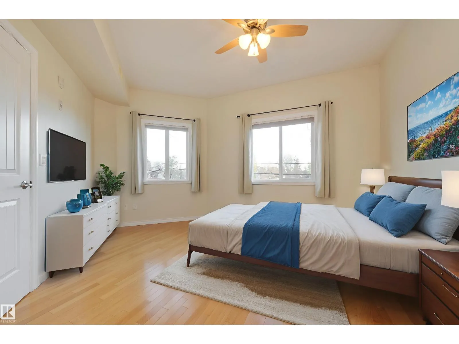 CORNER END UNIT! This gem has 2 beds, 2 baths, AIR CONDITIONING, 9-ft ceilings, GLEAMING HARDWOOD & upgrades throughout. Extremely well maintained by original owners. Freshly painted; move-in ready! The kitchen and living spaces are open concept. Loads of windows, natural light, and a cozy gas fireplace. The large west-facing balcony is your outdoor oasis and features a natural gas hook-up for the BBQ. The ultra-quiet & spacious primary suite has a walk-through closet that leads to your well equipped 3-pc ensuite bath. Another bed & bath are on the other side of the unit; minimal sound transfer! IN-SUITE LAUNDRY (machines less than 2 yrs old) and ample storage. You also have an assigned UNDERGROUND PARKING STALL to keep your vehicle warm all winter, along with a storage cage for your seasonal items. Belcanto Court is a 45+ building that has a real sense of community and fantastic amenities including a car wash in the heated parkade, a social room, and a guest suite. Bonnie Doon Mall & transit steps away! (id:27476)