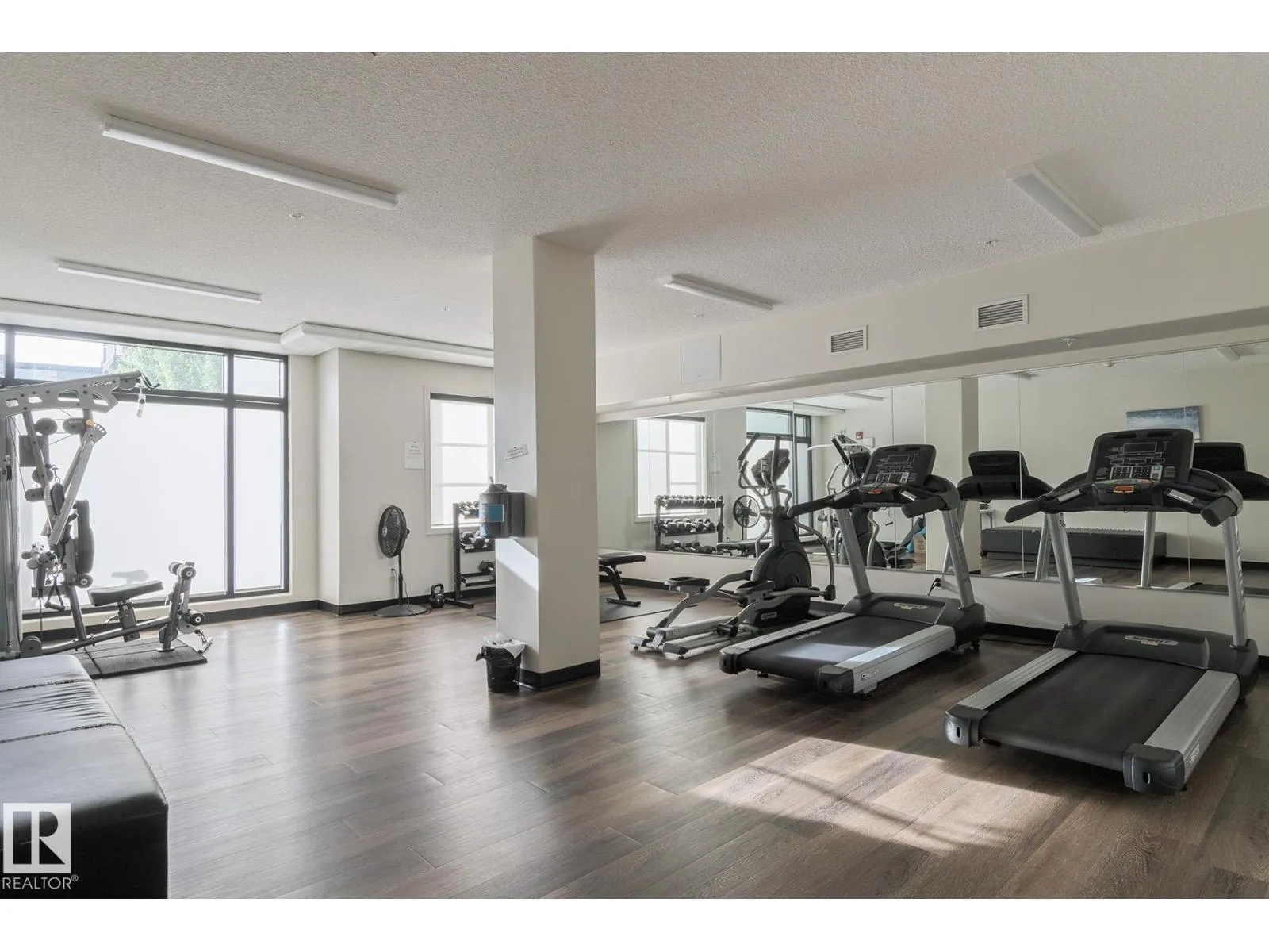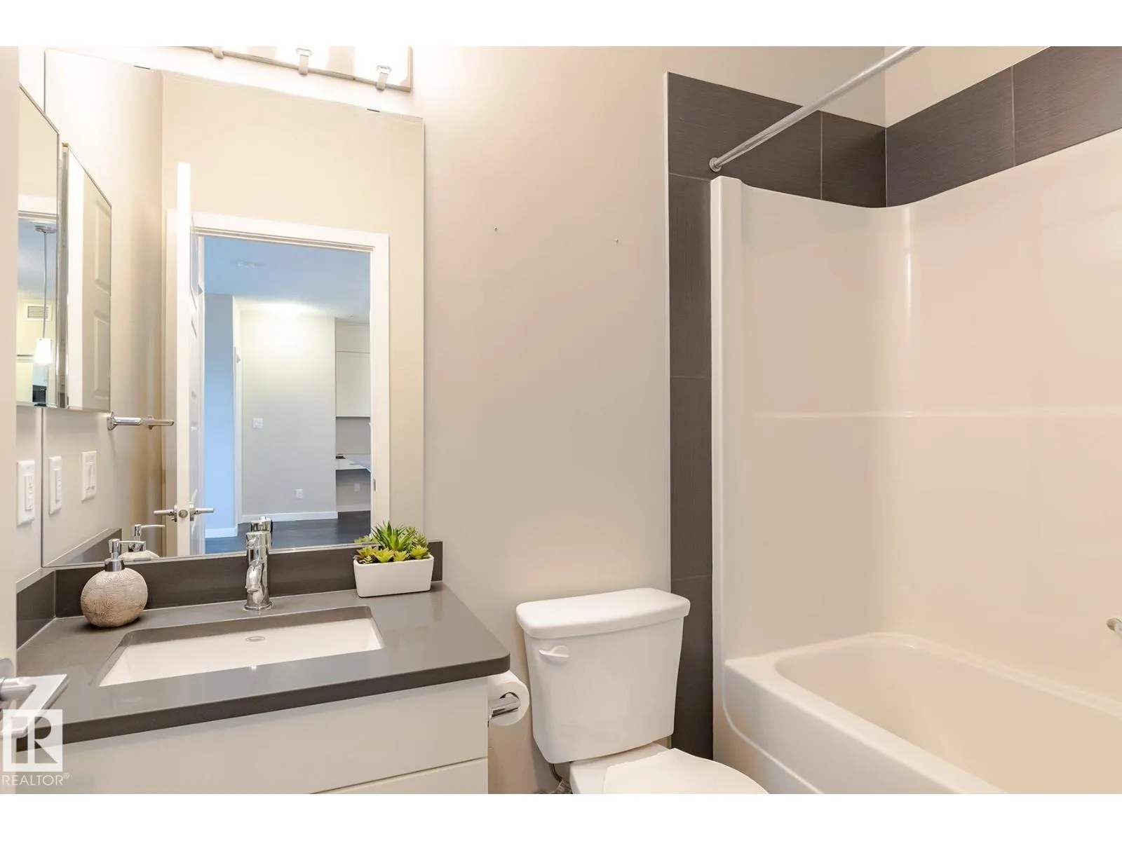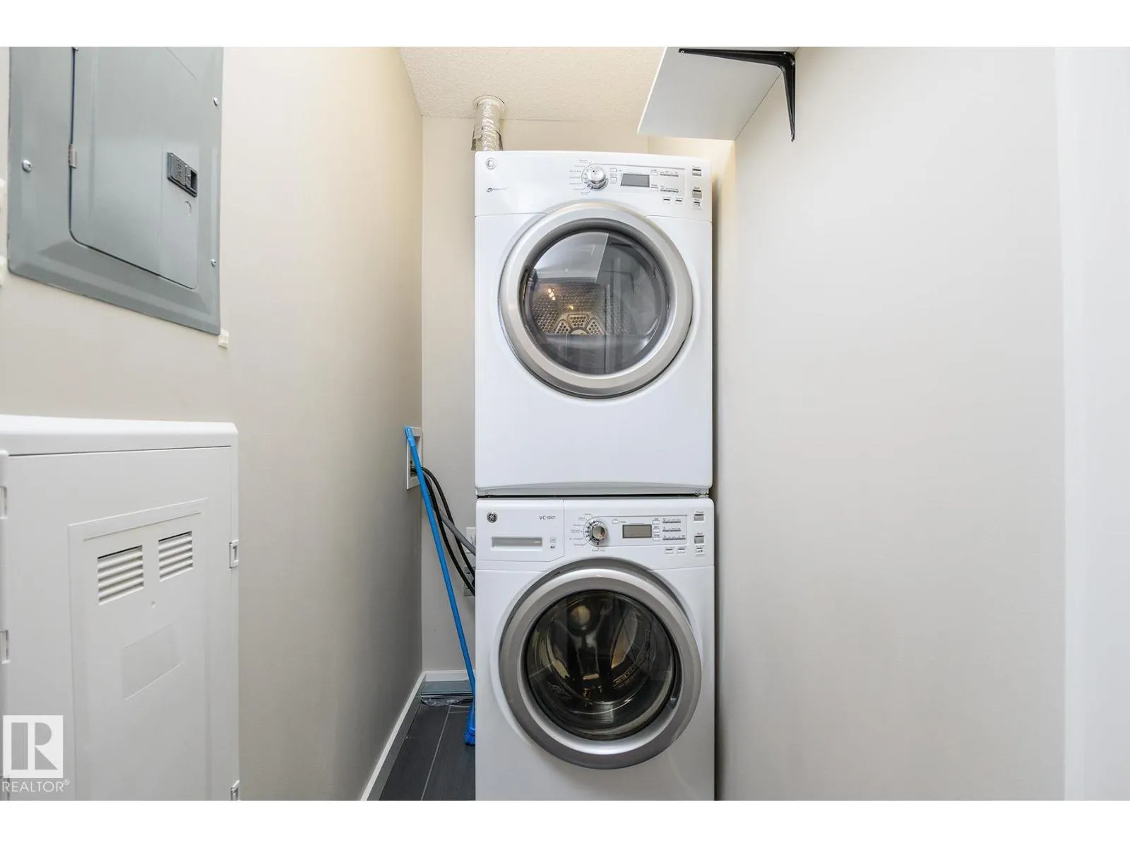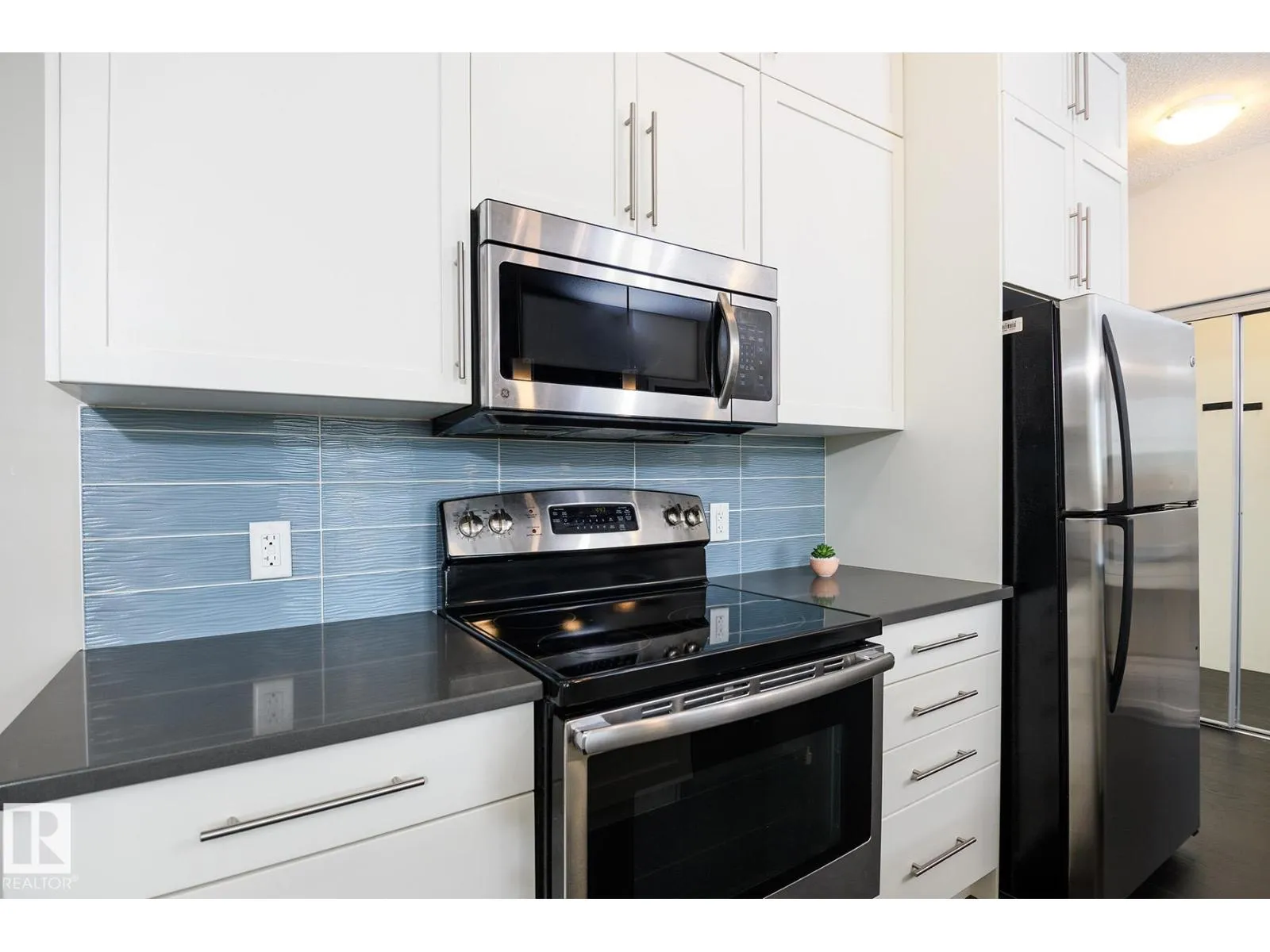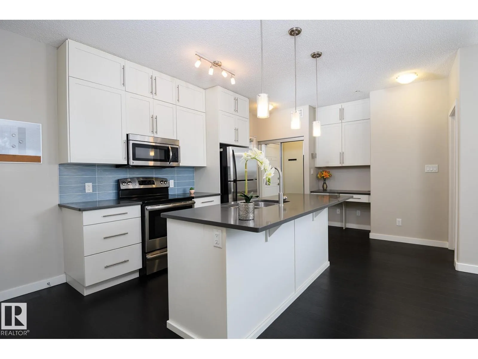 Top-floor living with park views! Welcome to Ãlan, one of southwest Edmontonâs most sought after condos. This beautifully maintained 2 bed 2 bath home offers a smart layout, upscale finishes, & 2 titled parking, 1 surface & other heated underground + private storage locker. Inside, youâll find rich dark laminate flooring, soft carpet in the bedrooms, & ceramic tile in the bathrooms for both style and durability. Open concept kitchen features stainless steel appliances, quartz countertops, white cabinetry & large island with seating, perfect for everyday living & entertaining. Spacious living room opens to a private East-facing balcony overlooking a tranquil park, offering sunshine & scenery year round. Master suite includes a walk through closet & full ensuite, while the second bedroom is ideal for guests, office, or roommate. In-suite laundry, a secure building with an exercise + social room, prime location close to shops, schools, and Henday make this a perfect place to call home. (id:27476)