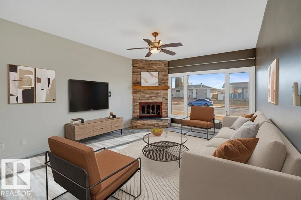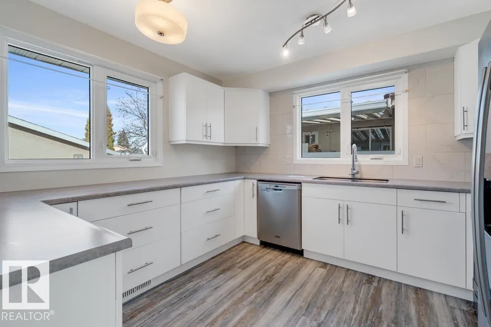 Welcome to this beautifully updated bungalow in the mature, family-friendly community of Evansdale. Large front windows fill the spacious living and dining area with natural light, while a cozy wood-burning fireplace and vinyl plank flooring create a warm and inviting atmosphere throughout the main level. The modern kitchen offers a clean, contemporary design with stainless steel appliances and ample cabinetry. Down the hall, youâll find three generously sized bedrooms and a 4-piece main bathroom, with the primary bedroom featuring its own convenient 2-piece ensuite.The fully finished basement offers even more functional living space, complete with an additional bedroom, a 4-piece bathroom, a wet bar, and a large recreation area ideal for movie nights, a home gym, or a playroom. The laundry area and plenty of storage make the lower level as practical as it is versatile. With quick possession available, this move-in-ready home is the perfect opportunity for those looking to settle in before the holidays. (id:27476)