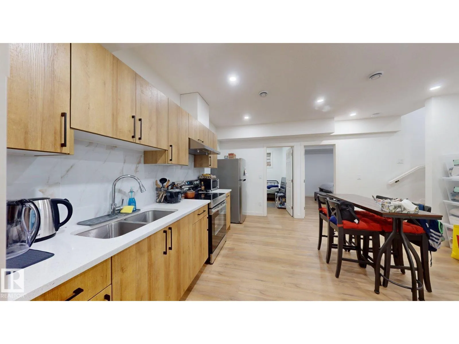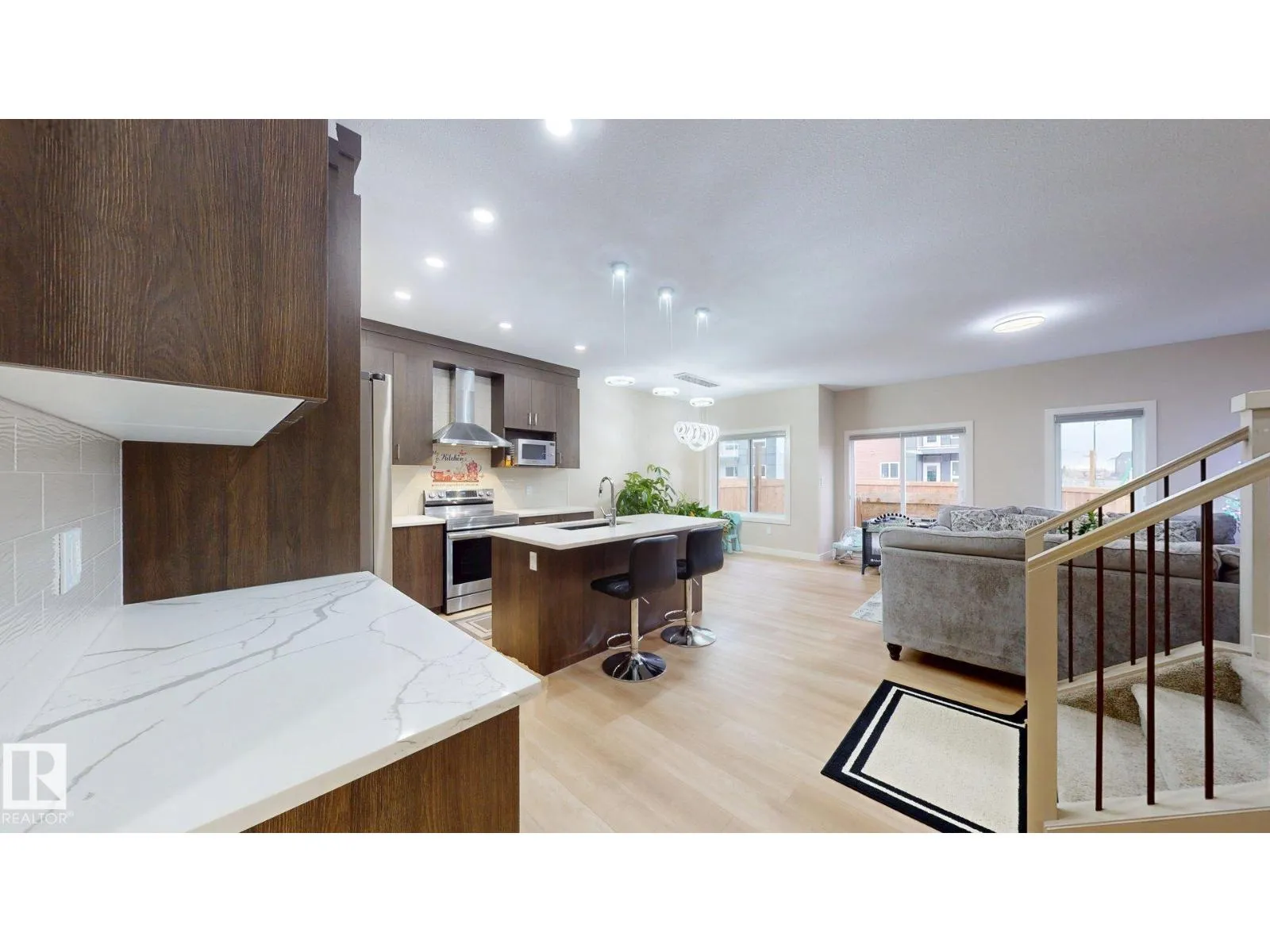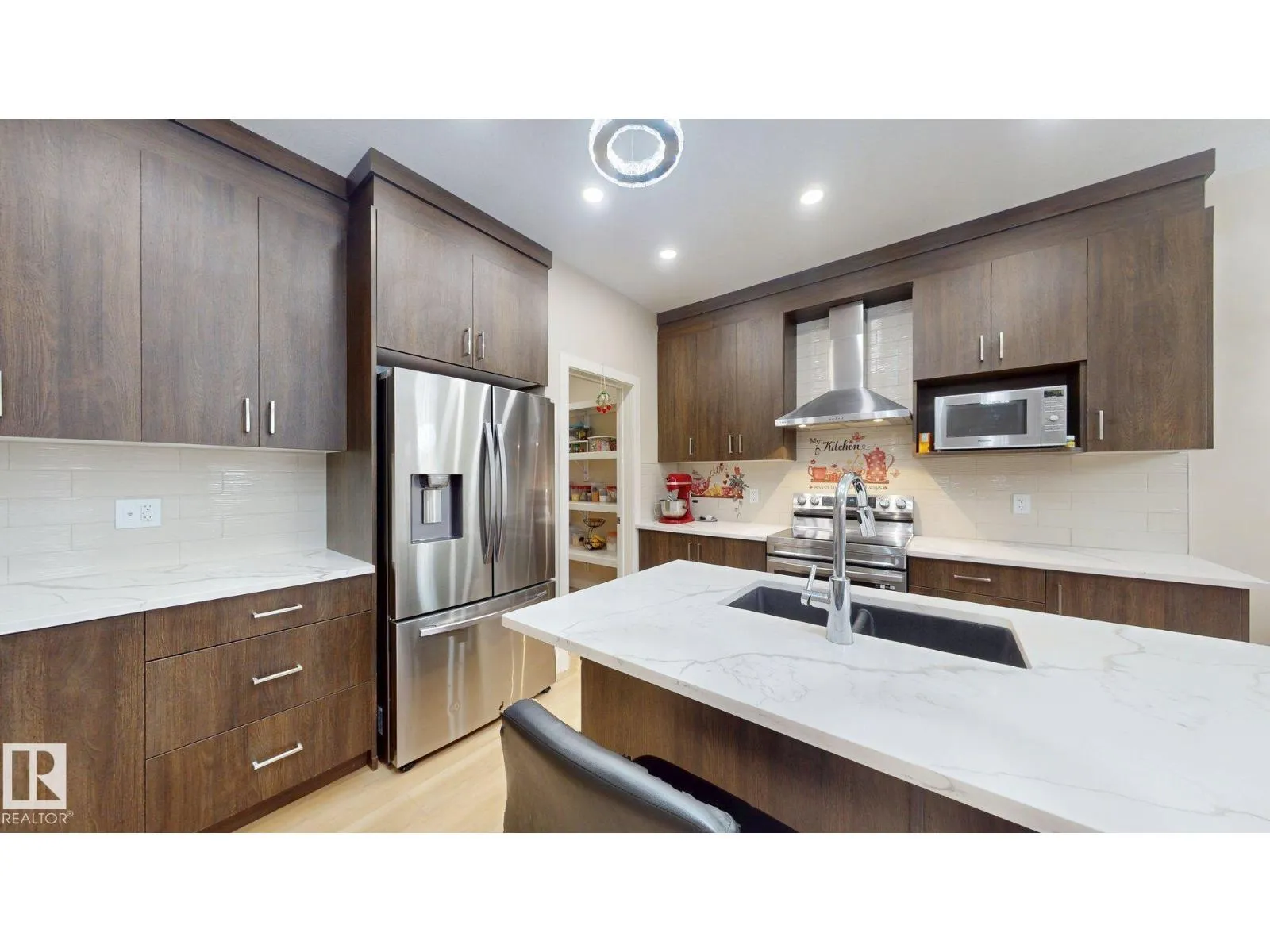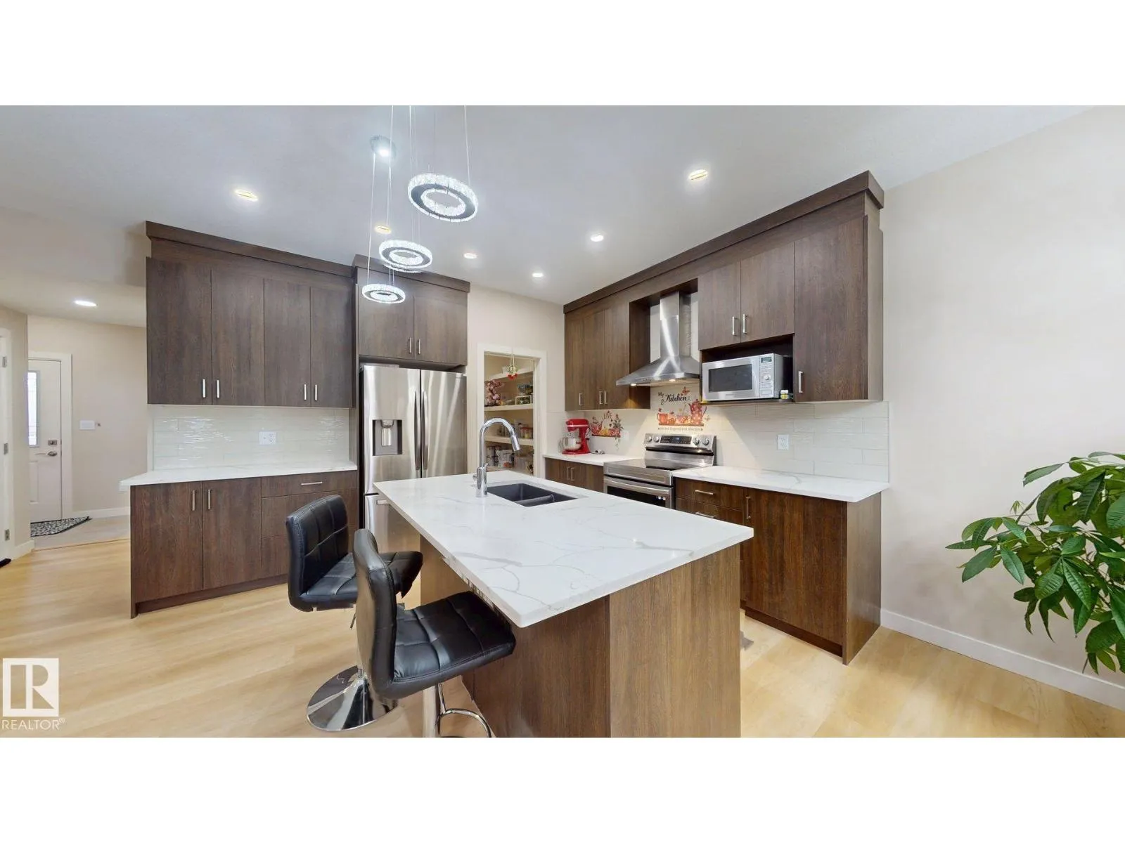 Beautiful 2-storey 1800+ sq ft CORNER LOT half duplex with double attached garage in sought-after Cavanagh! Built in 2022, this upgraded home offers a bright, open layout with vinyl flooring, designer lighting, and a custom fireplace feature wall. The chefâs kitchen impresses with quartz countertops, upgraded cabinets, a large island, stainless steel appliances, and a walk-in pantry. Main floor includes a powder room and mudroom with extra storage. Upstairs features a primary suite with 5-pc ensuite, two additional bedrooms, a bonus room, laundry, and a 3-pc bath. Separate side entrance leads to a finished LEGAL BASEMENT SUITE with 2 bedrooms, 2nd kitchen & living areaâideal for extended family or rental income. Located near parks, schools & major routes. Modern design, great location & incredible valueâdonât miss this one! (id:27476)