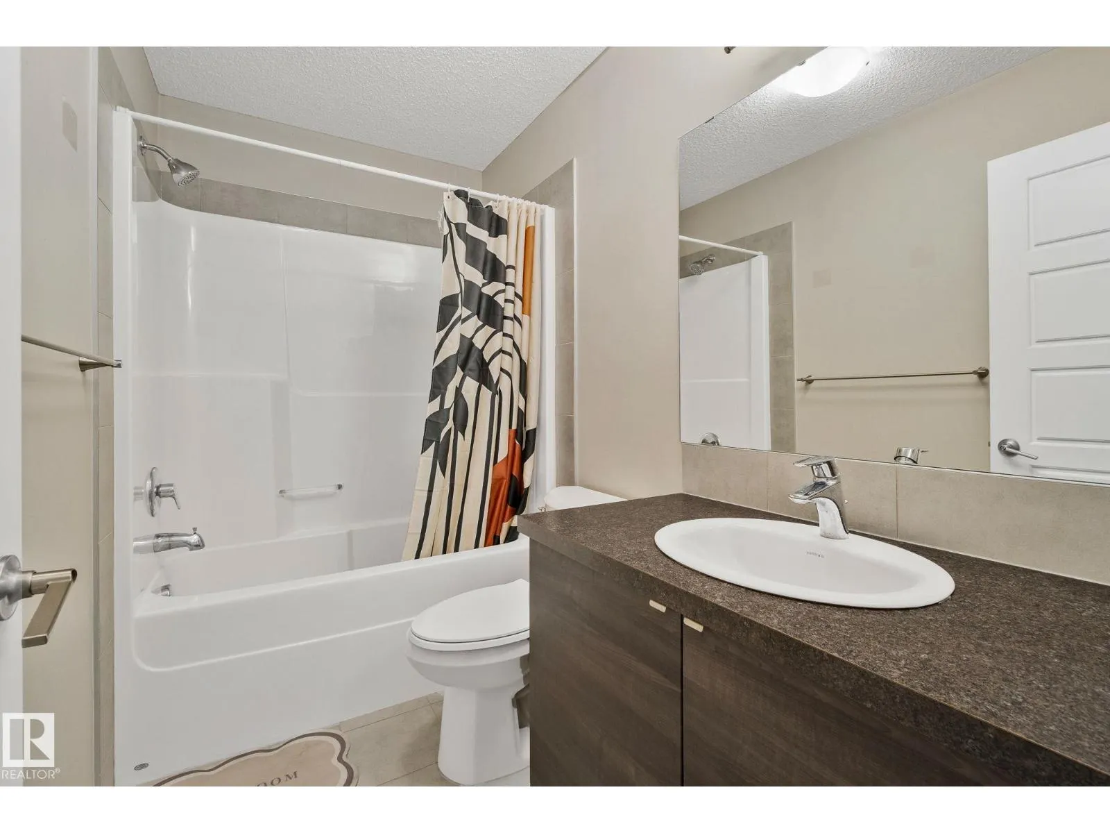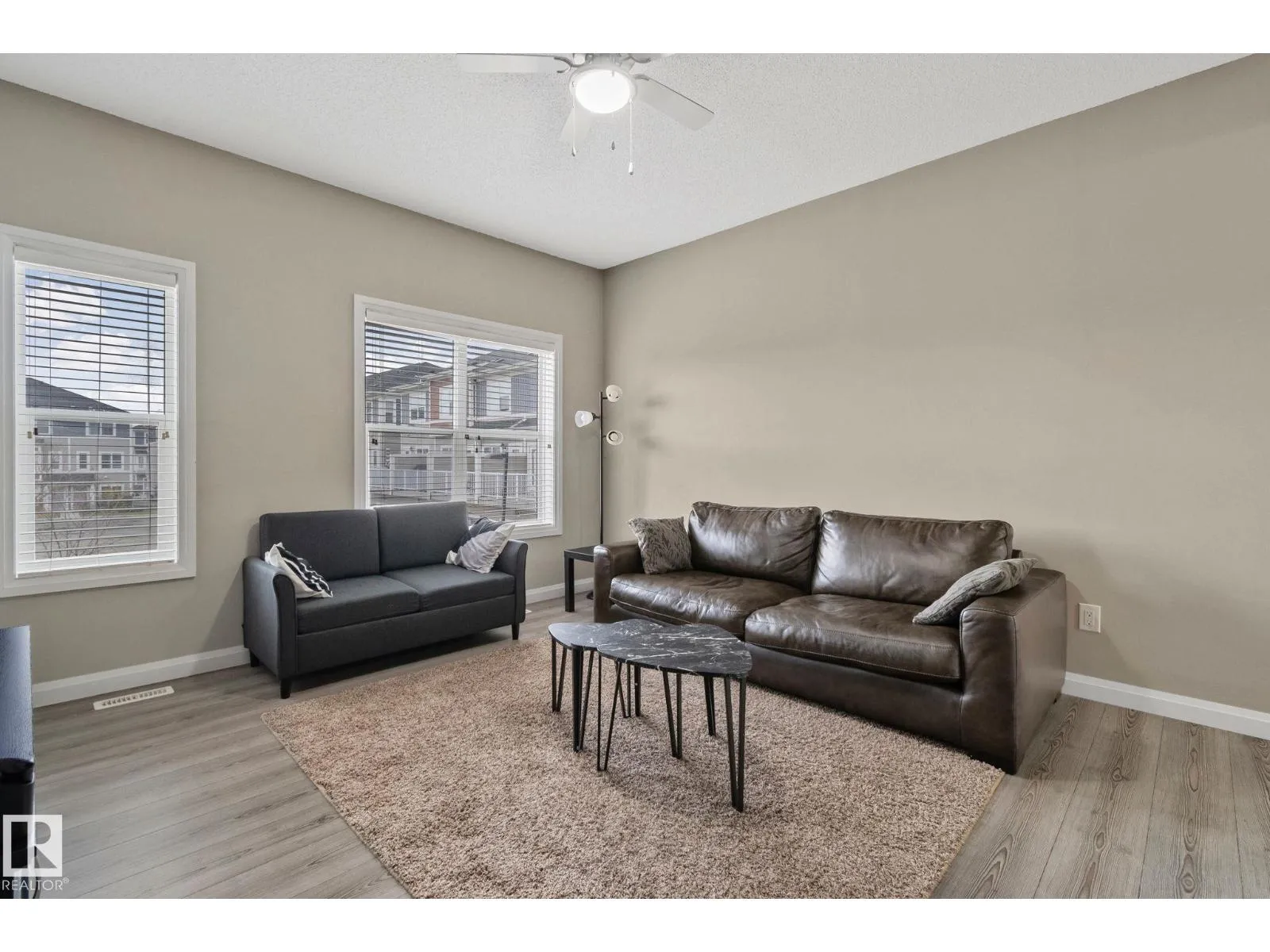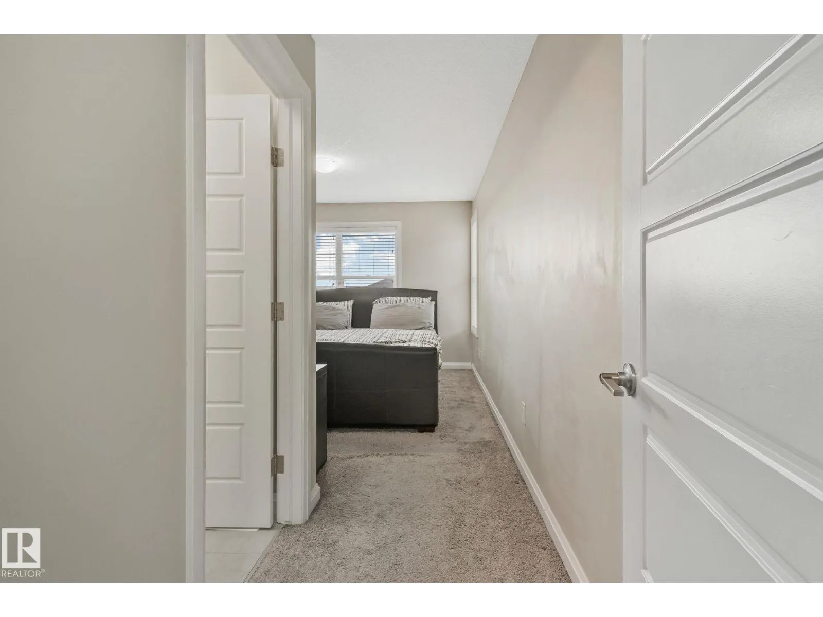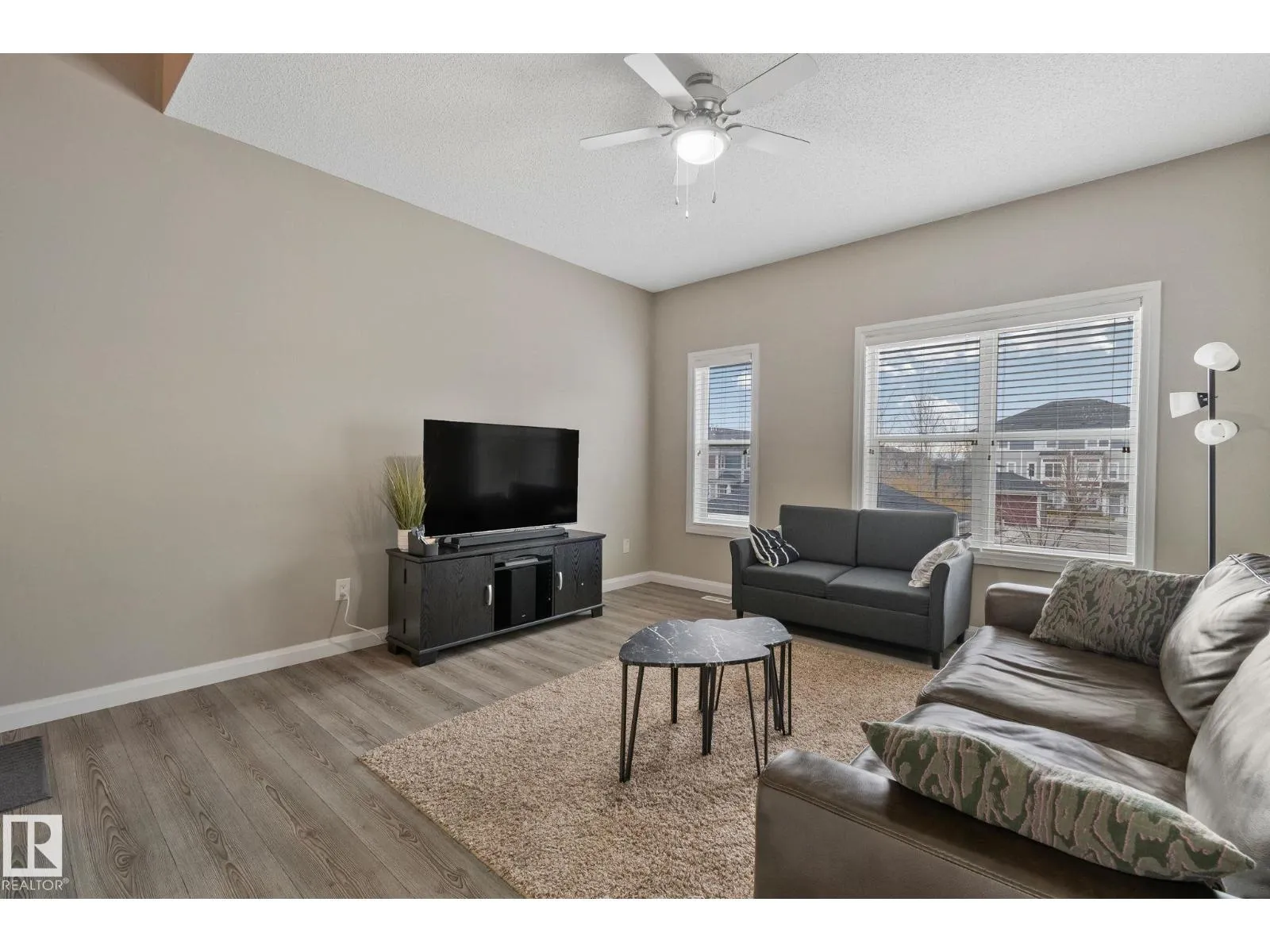 WELCOME to this modern and affordable 2 bedroom + den townhouse, ideally located across from Dr. Margaret-Ann Armour School. This corner unit features extra windows and 9-foot ceilings on two levels, creating a bright, open living space. The kitchen offers stainless steel appliances, a large island, and extended cabinetry which is perfect for daily living or entertaining. The dining area opens to a balcony overlooking a park/trail. Upstairs, two spacious bedrooms each feature a 4-piece ensuite and his/her dual closets. Ground-level den/home office is great for remote work or study. Enjoy the convenience of an attached heated garage (23x13) and driveway parking. Steps from public transit and minutes to the Currents of Windermere, schools, shopping, and the Anthony Henday. An exceptional choice for first-time buyers, downsizers, or investors! (id:27476)