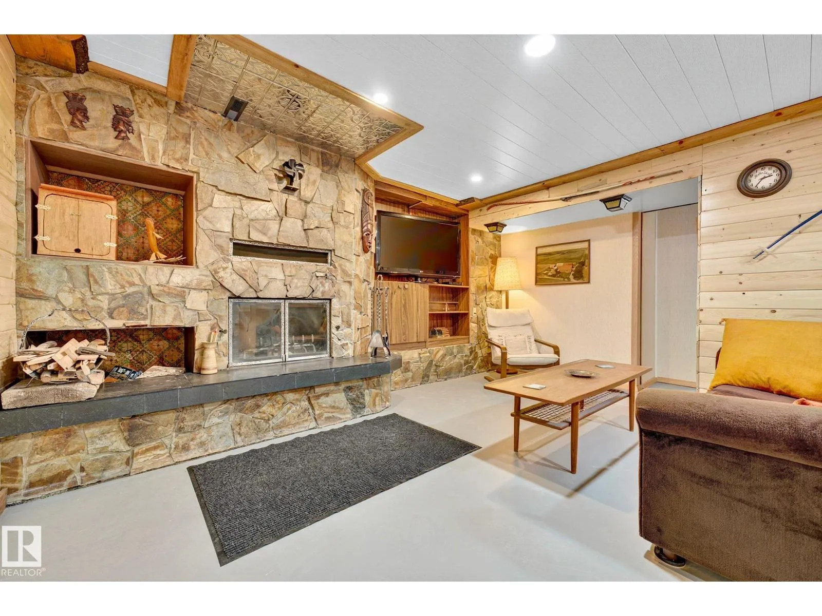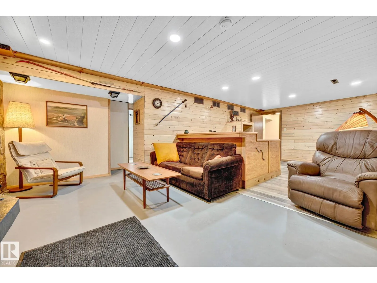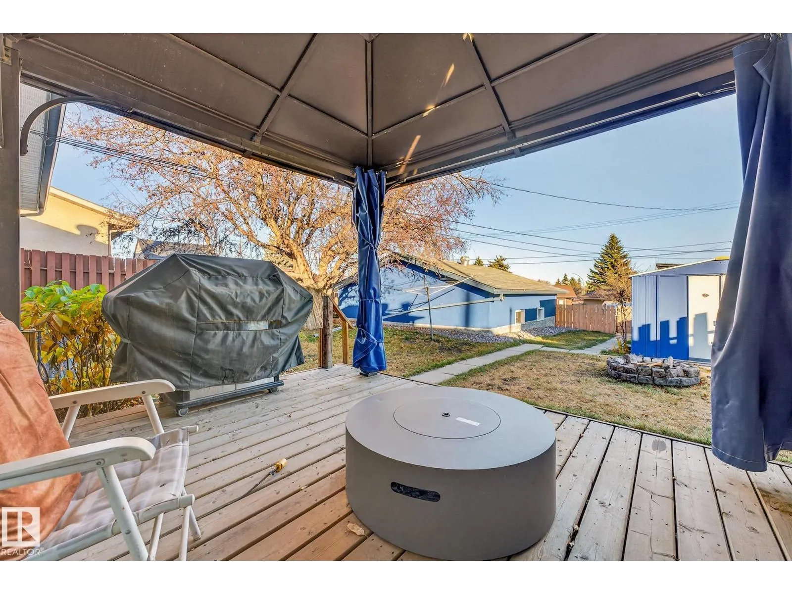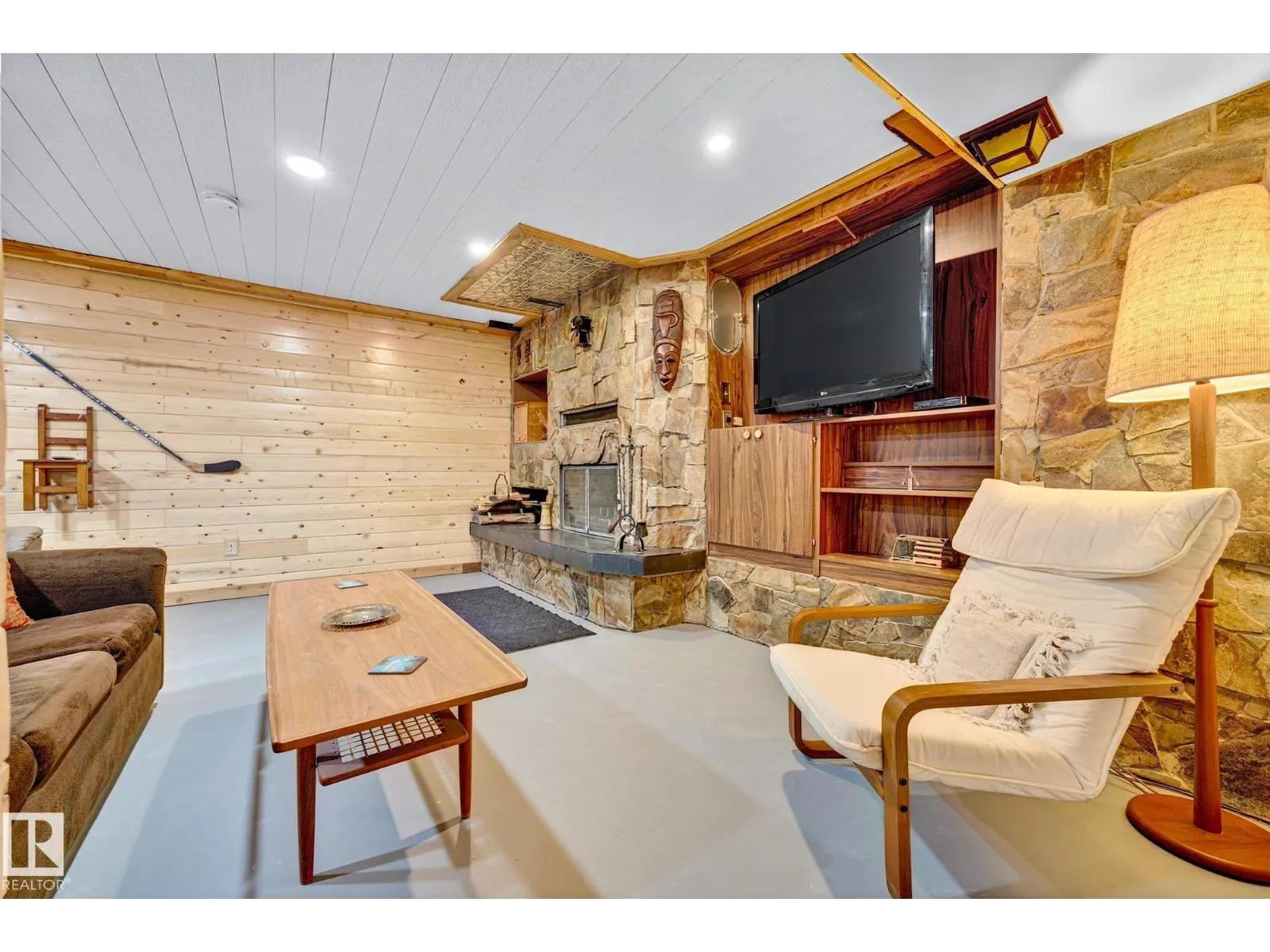 Nestled just off Ada Boulevard and steps from Rundle Park, this bungalow tells a story of warmth and belonging. Morning light filters through triple-pane Pella windows, catching the texture of hardwood floors and mid-century details that speak to another era of craftsmanship. The living and dining spaces flow effortlessly, creating room for conversation and quiet moments alike, while the bright kitchen overlooks the backyard, a view of changing seasons framed by trees and sky. Three main-floor bedrooms offer comfort and calm, and downstairs, a pine-paneled rec room with a wood-burning fireplace and wet bar sets the stage for gatherings that linger into the night. Two additional bedrooms, a full bath, and generous storage complete the homeâs thoughtful layout. Outside, a pergola-topped deck and oversized heated double garage extend both function and charm. In a community defined by river trails, parks, and connection, this is a haven where every season feels like home. (id:27476)