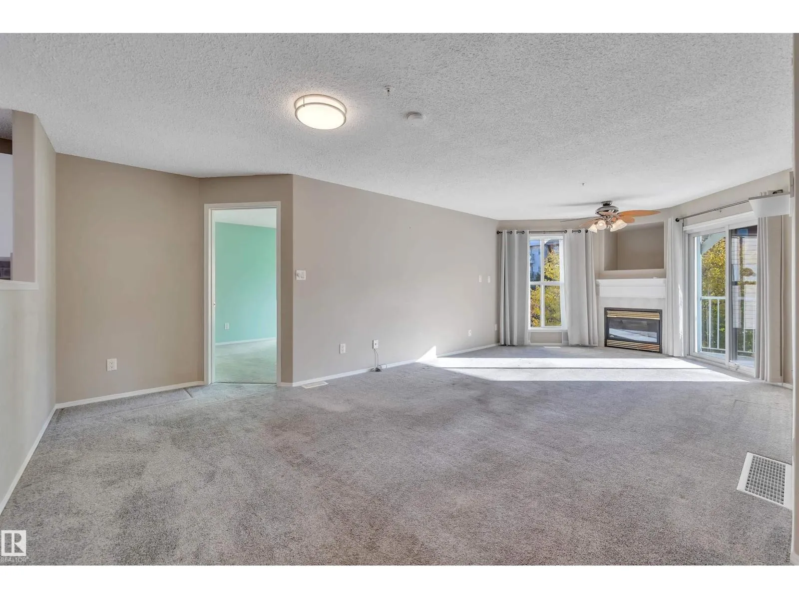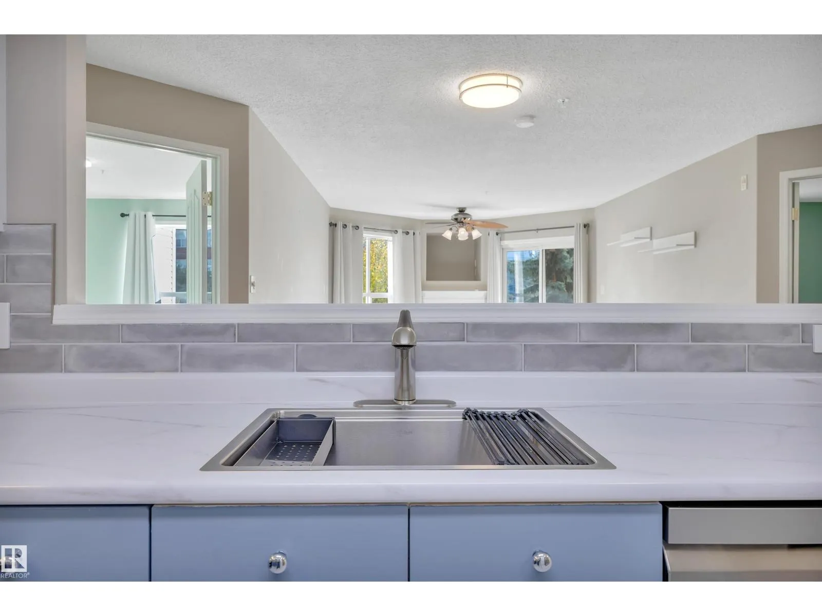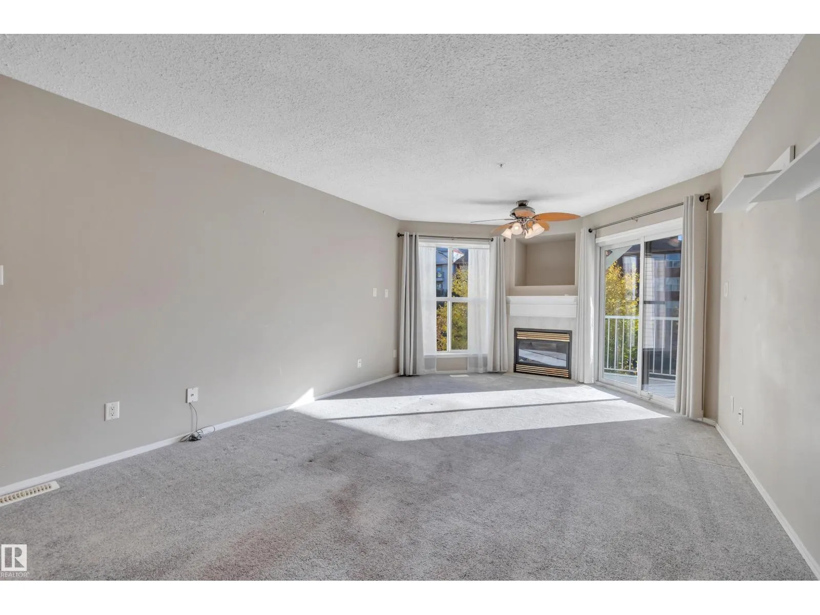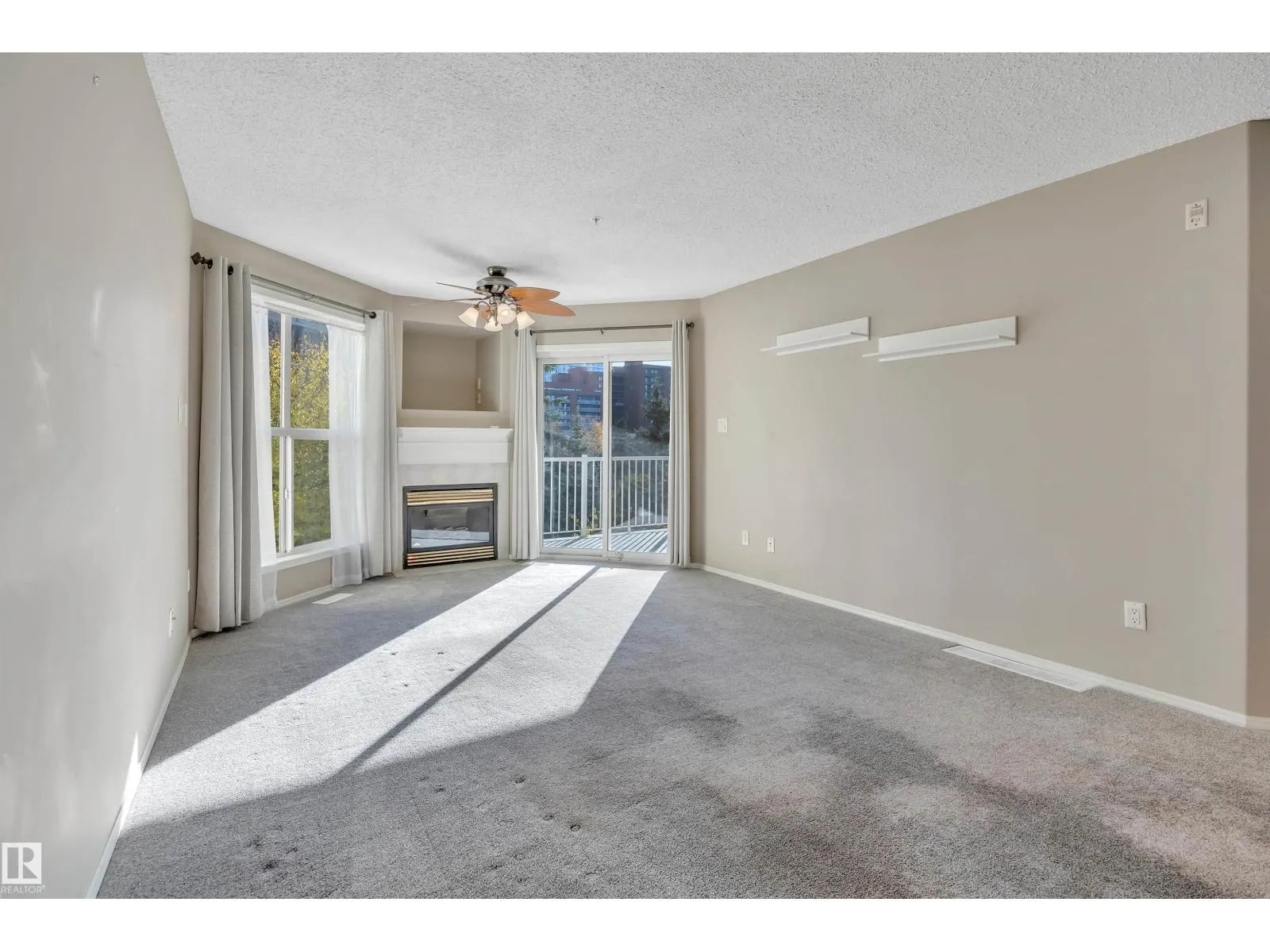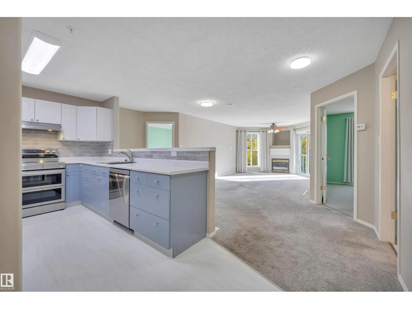 Welcome to this beautifully updated 3rd floor condo in the heart of Railtown! This bright and inviting home offers a beach house vibe with sea-blue kitchen cabinets, new white countertops, a large pantry, and top-of-the-line 2024 appliances. The cozy kitchen overlooks the open dining and living area anchored by a cozy fireplace, large windows, and patio access overlooking the trails. Enjoy a private utility room with a 5-year-old hot water tank and reconditioned furnace and A/C. The condo offers two bedrooms and two full baths, including a refreshed 3-piece ensuite with a new shower. New carpet and vinyl plank flooring throughout. The laundry room includes shelving, cabinetry, and newer washer and dryer with warranty. Located in a secure gated community with a covered parking stall, a gym, meeting room, and guest suite. Walking distance to the Ice District, shopping, and restaurantsâurban living with a relaxed coastal feel! (id:27476)