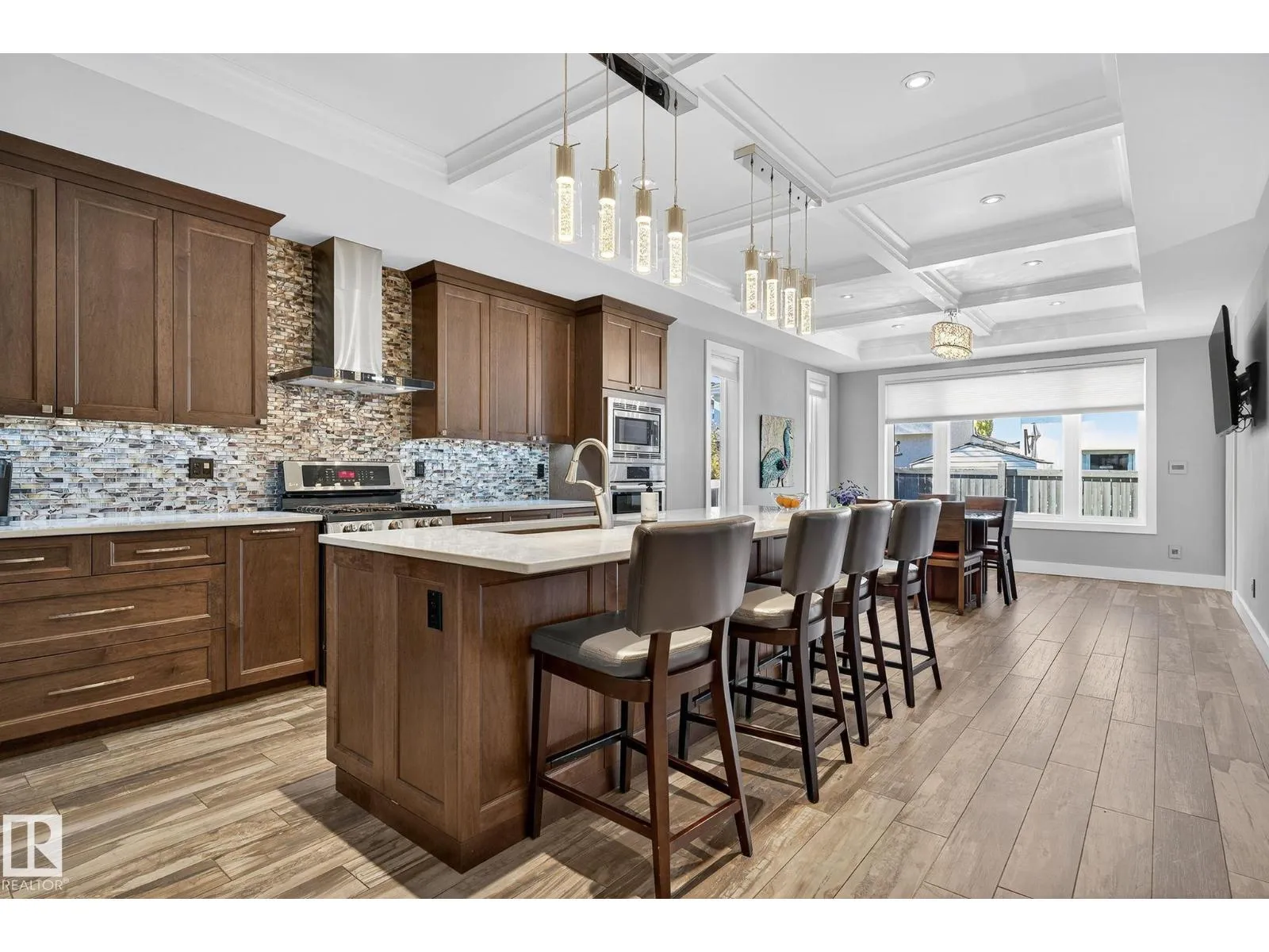 Exquisite custom-built estate in the prestigious Properties of Donsdale, one of Edmontonâs most sought-after communities. Offering 6,952sqft just steps from the river valley, this home seamlessly blends luxury, functionality & craftsmanship. Featuring an open floor plan with 9ft ceilings on all floors, spiral staircase, warm durable tile flooring & plenty of natural light. The chefâs kitchen stuns with quartz counters, dual ovens, dishwashers, fridges, massive pantry & coffered ceilings. Highlights include a presidential office, grand dining room, spacious mudroom. Upstairs, the primary suite offers dual walk-ins, a spa ensuite w/ heated floors, jetted tub & fireplace. Three additional bedrooms each enjoy walk-in closets & private ensuites + laundry & a cozy bonus room. The finished basement boasts zoned in-floor heat, wet bar, private HIDDEN BOOKSHELF theatre, multi-TV sports area, hockey & art room or 2 bedrooms. Oversized triple heated garage w/ drains & low maintenance turf yards + so much more. (id:27476)