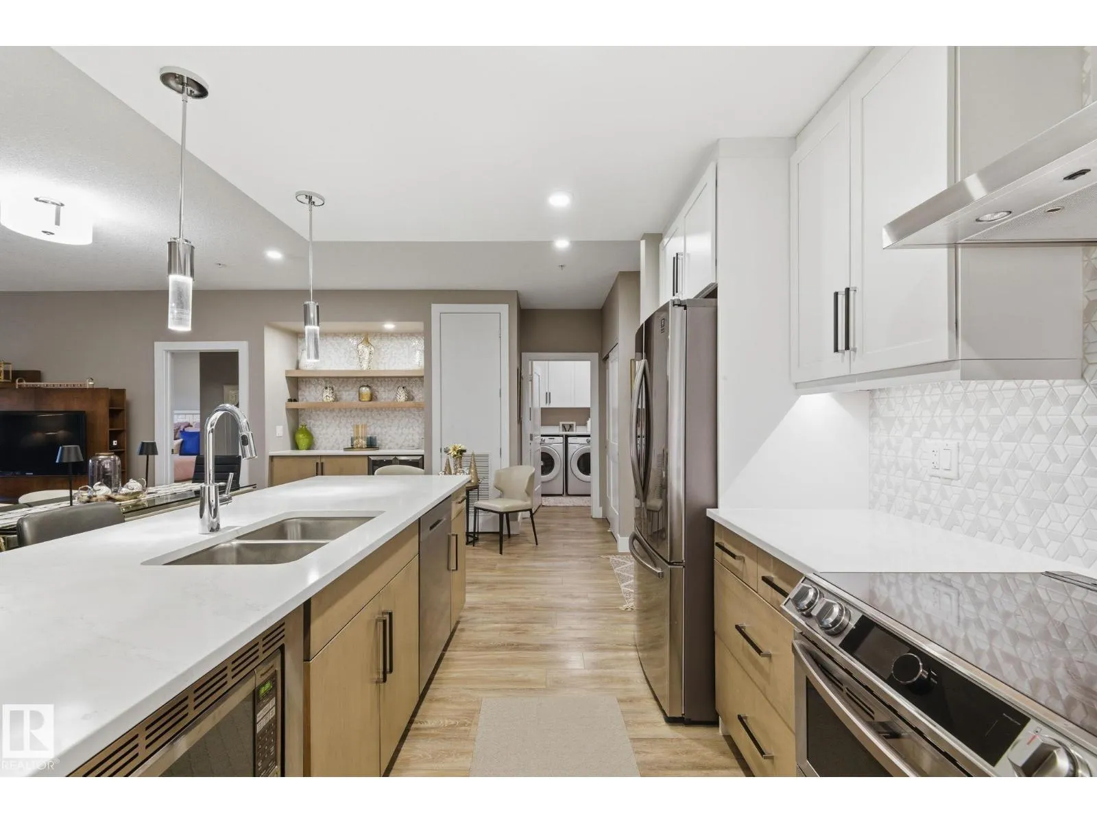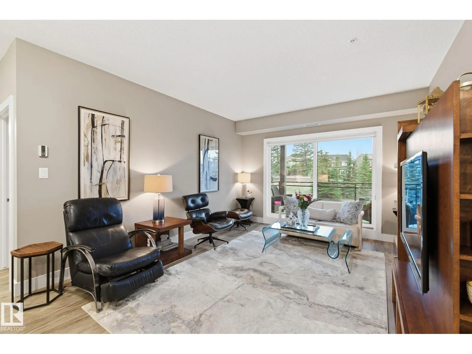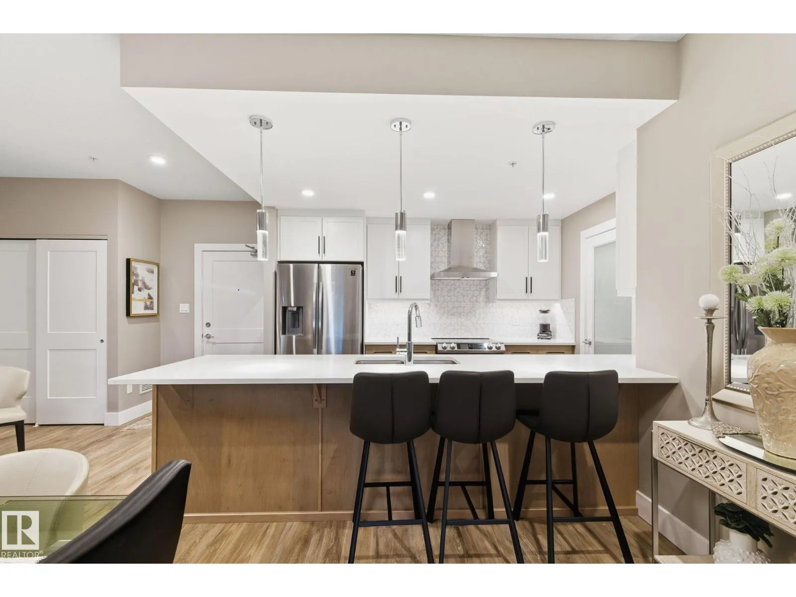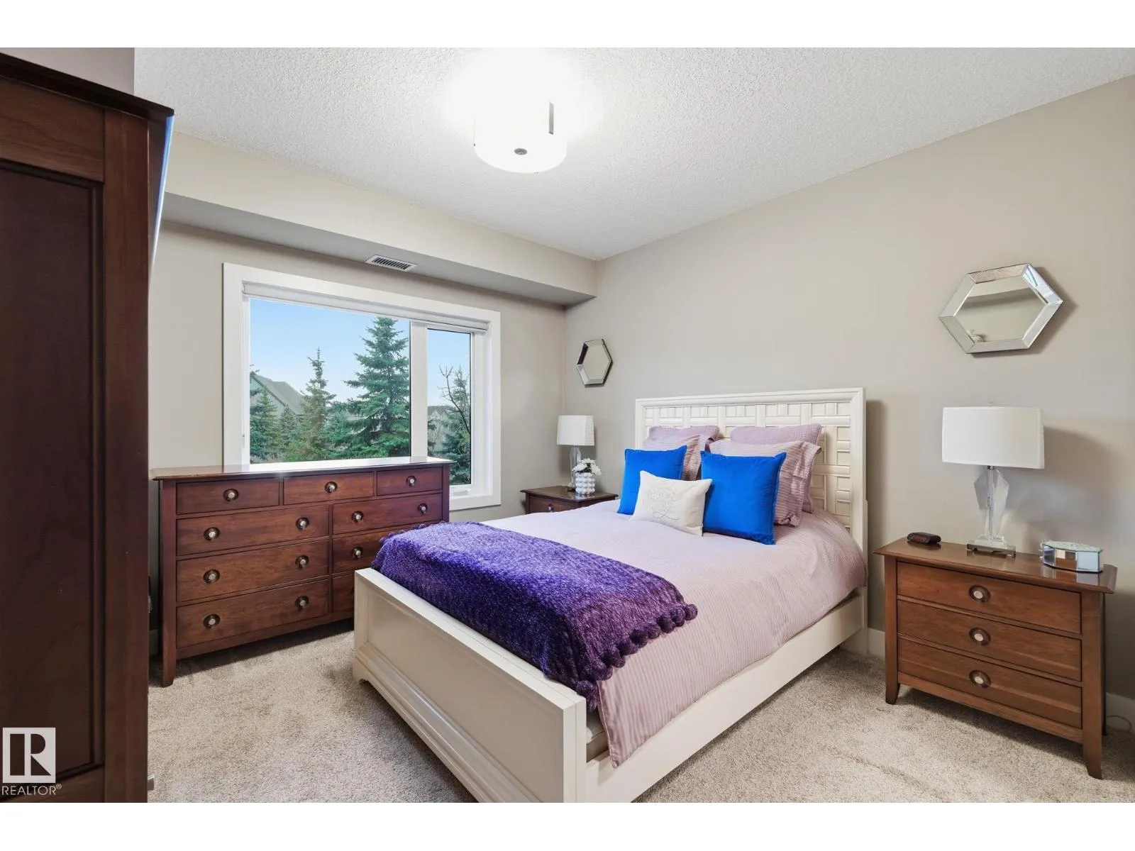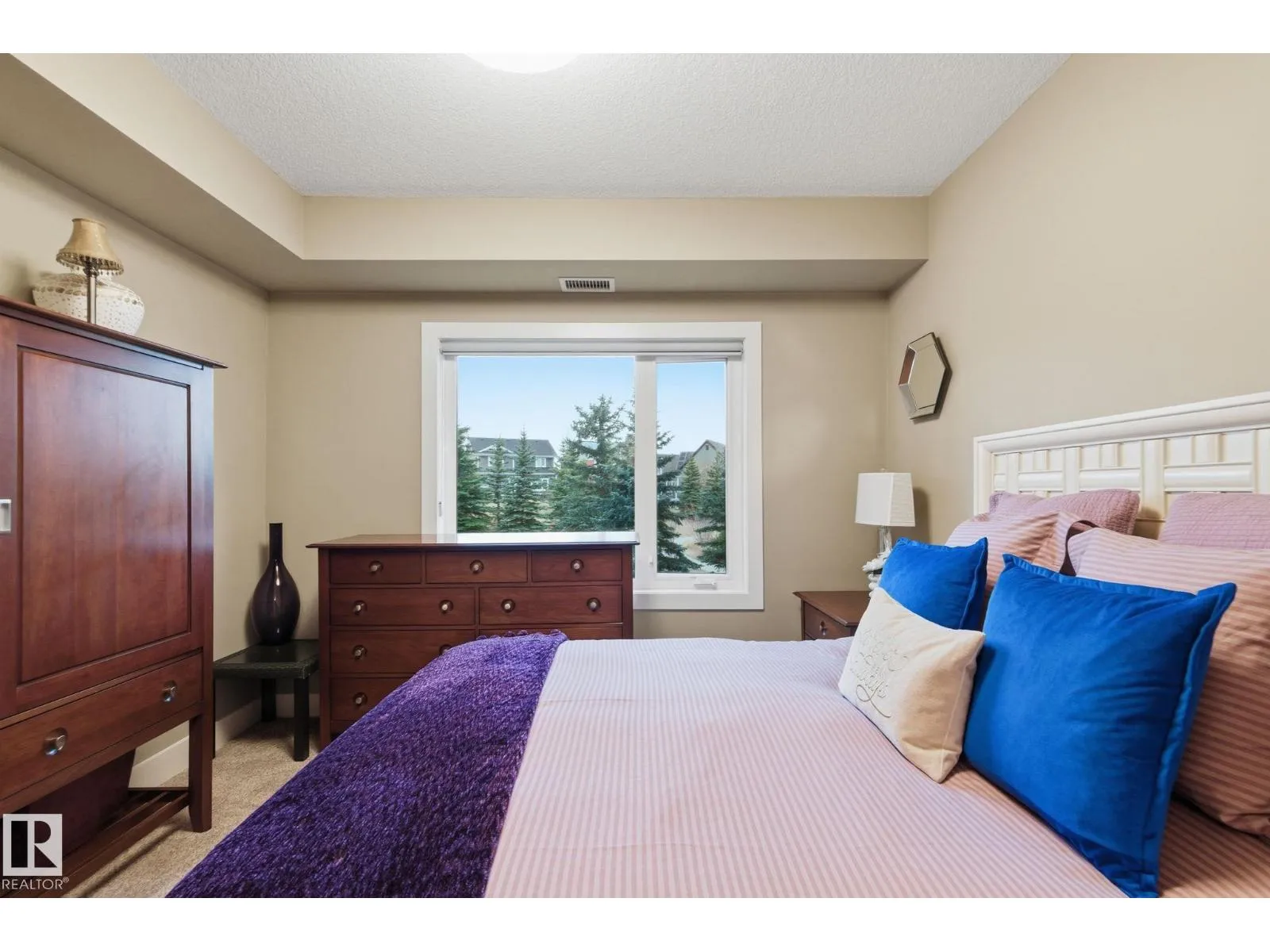 Experience refined luxury living at Veritas, the premier condominium residence in the community of Griesbach. This exquisite former show suite blends elegance and comfort, showcasing over $25,000 in designer upgrades with captivating park and lake views. Thoughtfully designed, this main-floor retreat features gourmet-inspired quartz countertops, a custom laundry room with counter and built-in cabinetry, a pantry, and a stylish bar area with wine fridge. Sophisticated finishes, open-concept living, and serene surroundings create an atmosphere of quiet indulgence. Enjoy the convenience of two titled parking stalls and access to Veritasâ exceptional amenities, including a state-of-the-art fitness centre, beautiful social lounge complete with billiard table, and a spacious guest suite for overnight guests. This unit is perfect for discerning professionals or empty nesters seeking a lifestyle of elegance, comfort, and effortless sophistication in one of Edmontonâs most sought-after residences. (id:27476)