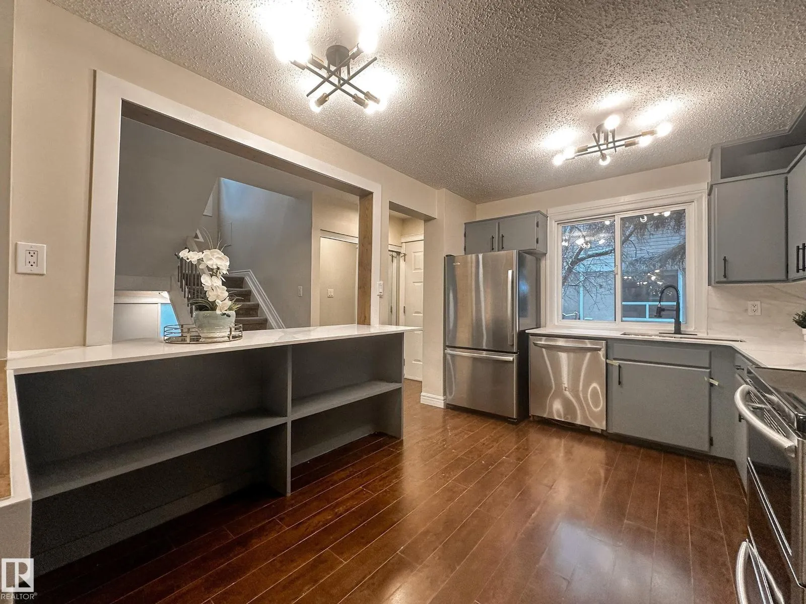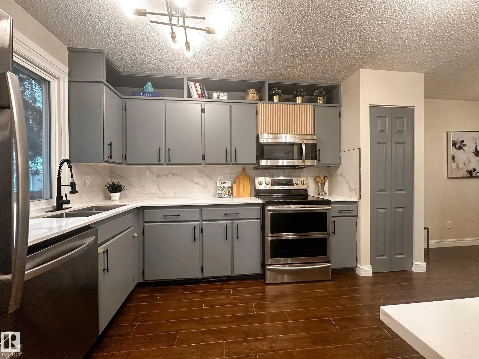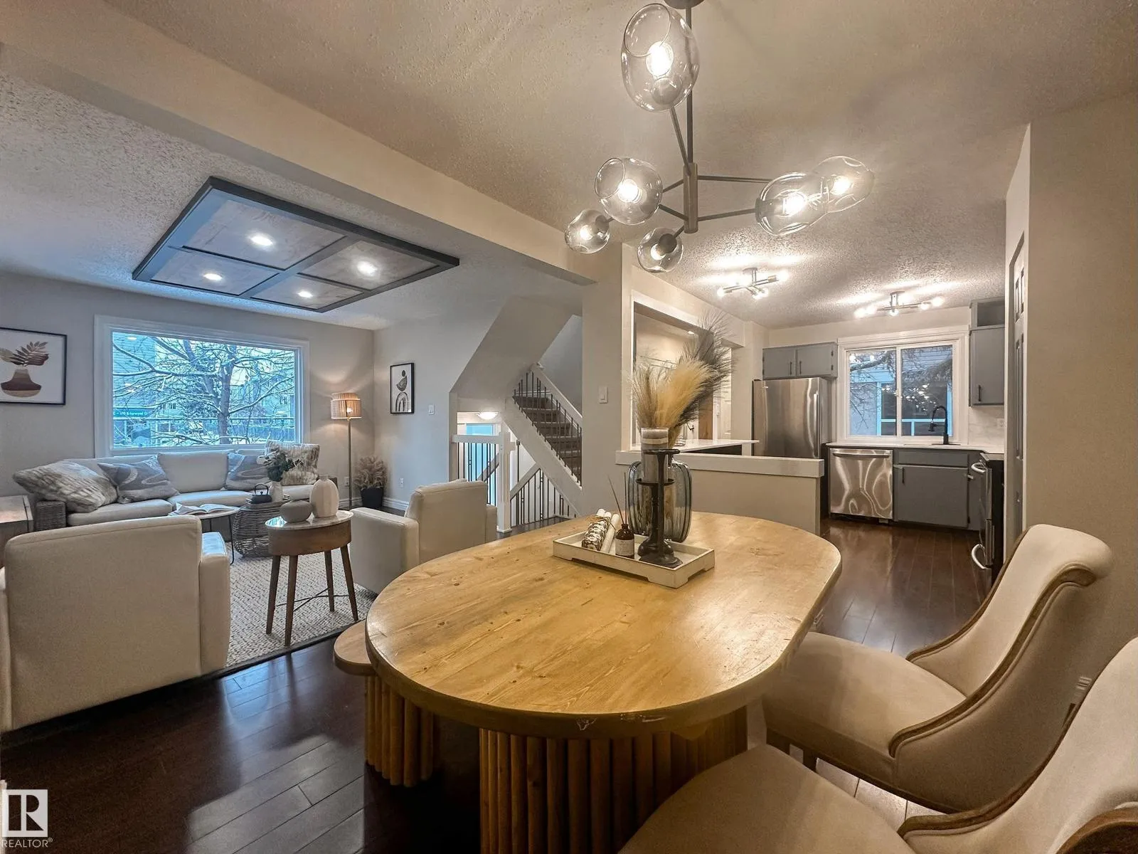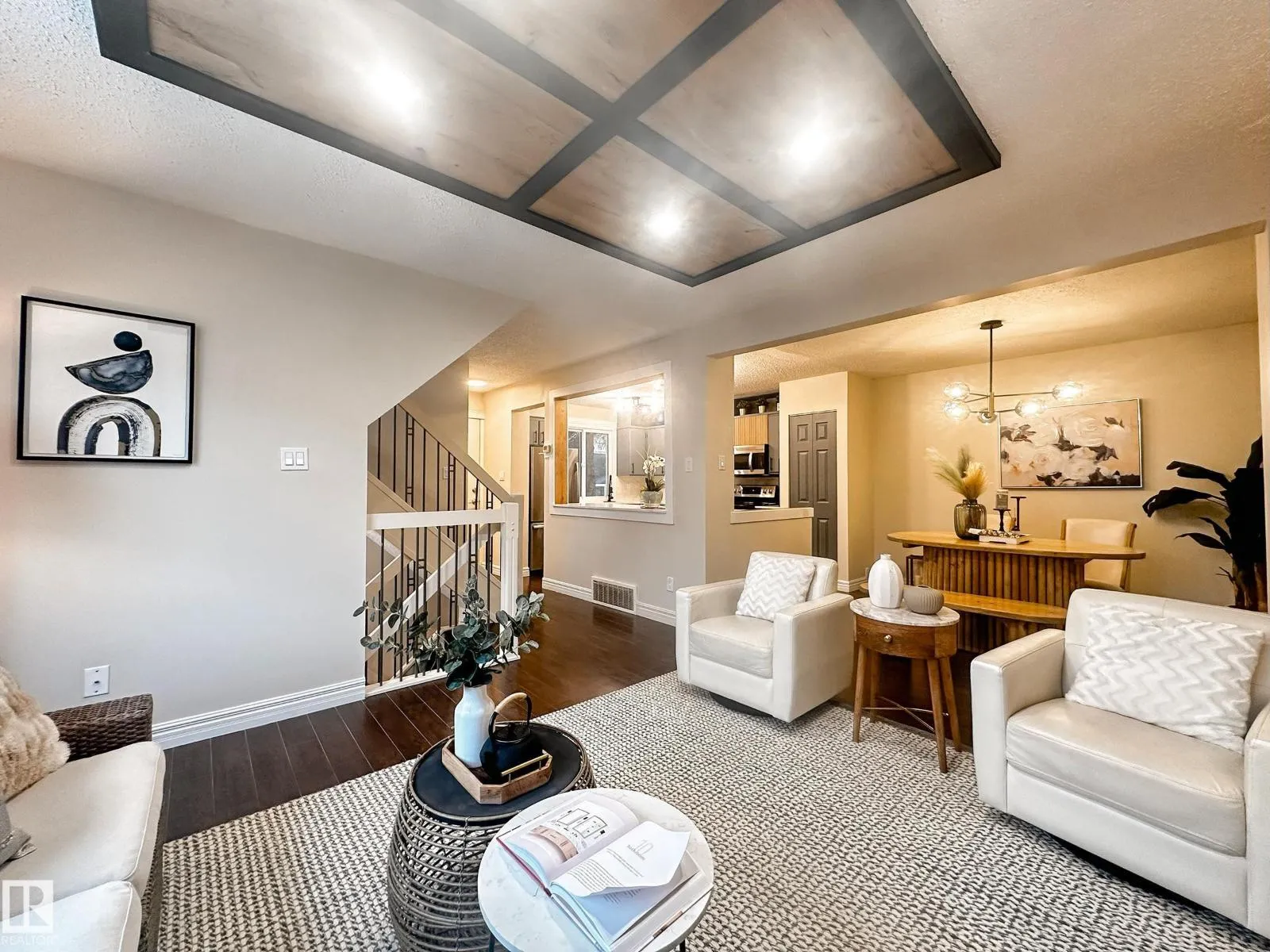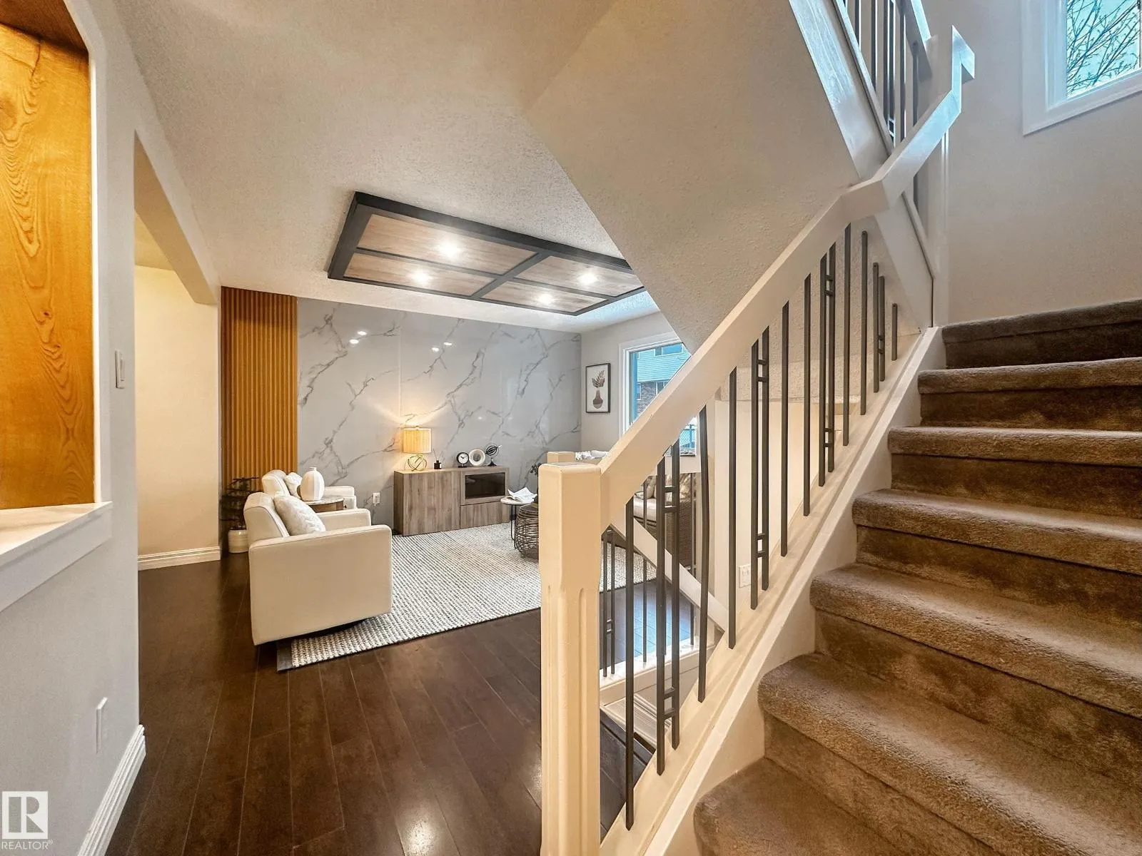 Welcome to this beautifully renovated End-Unit townhome, featuring 3+1 bedrooms, 2 full bathrooms, finished basement, and fenced private backyard, perfectly located within walking distance to West Edmonton Mall! Upon entering, youâll be impressed by the spacious open-concept layout, includes the renovated kitchen boasting abundant cabinetry, lustrous quartz countertops, large eating island, and stainless steel appliances. The bright living room showcases a custom full-length accent wall and coffer ceiling panel, overlooks the south-facing backyard, flooding the home with abundant natural light. Beautiful spindle railings leads you upstairs where to find three generous bedrooms and a custom tiled new bathroom. Separate back door leads you to the fully finished basement offers a fourth bedroom with a large window and a full bathroom. Additional upgrades include newer HTW, newer high-efficiency furnace, fresh paint and modern lighting fixtures throughout. Do not miss this great home! (id:27476)