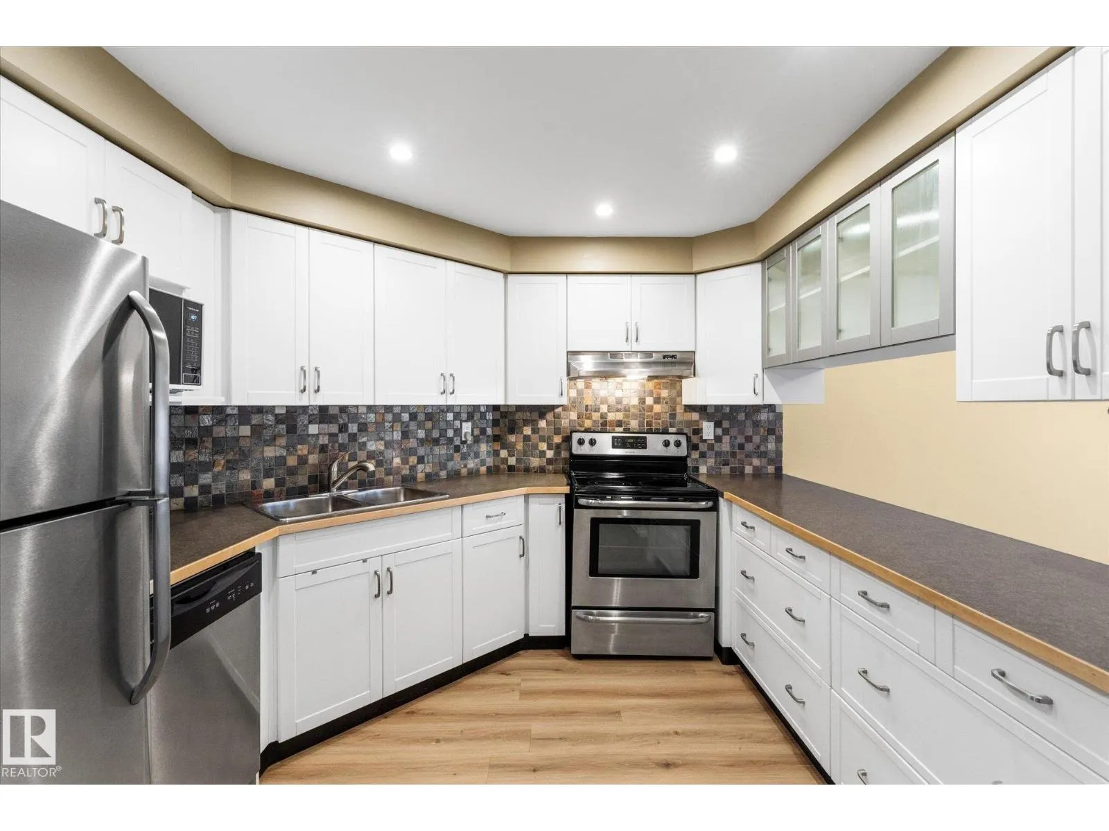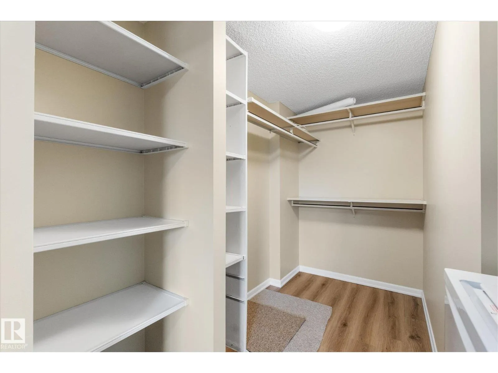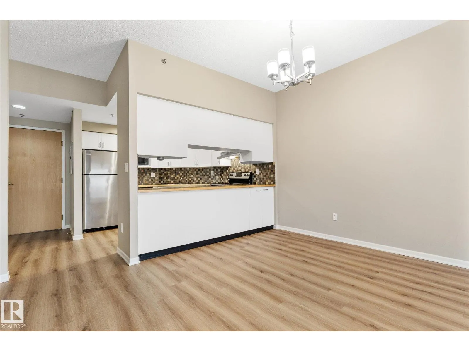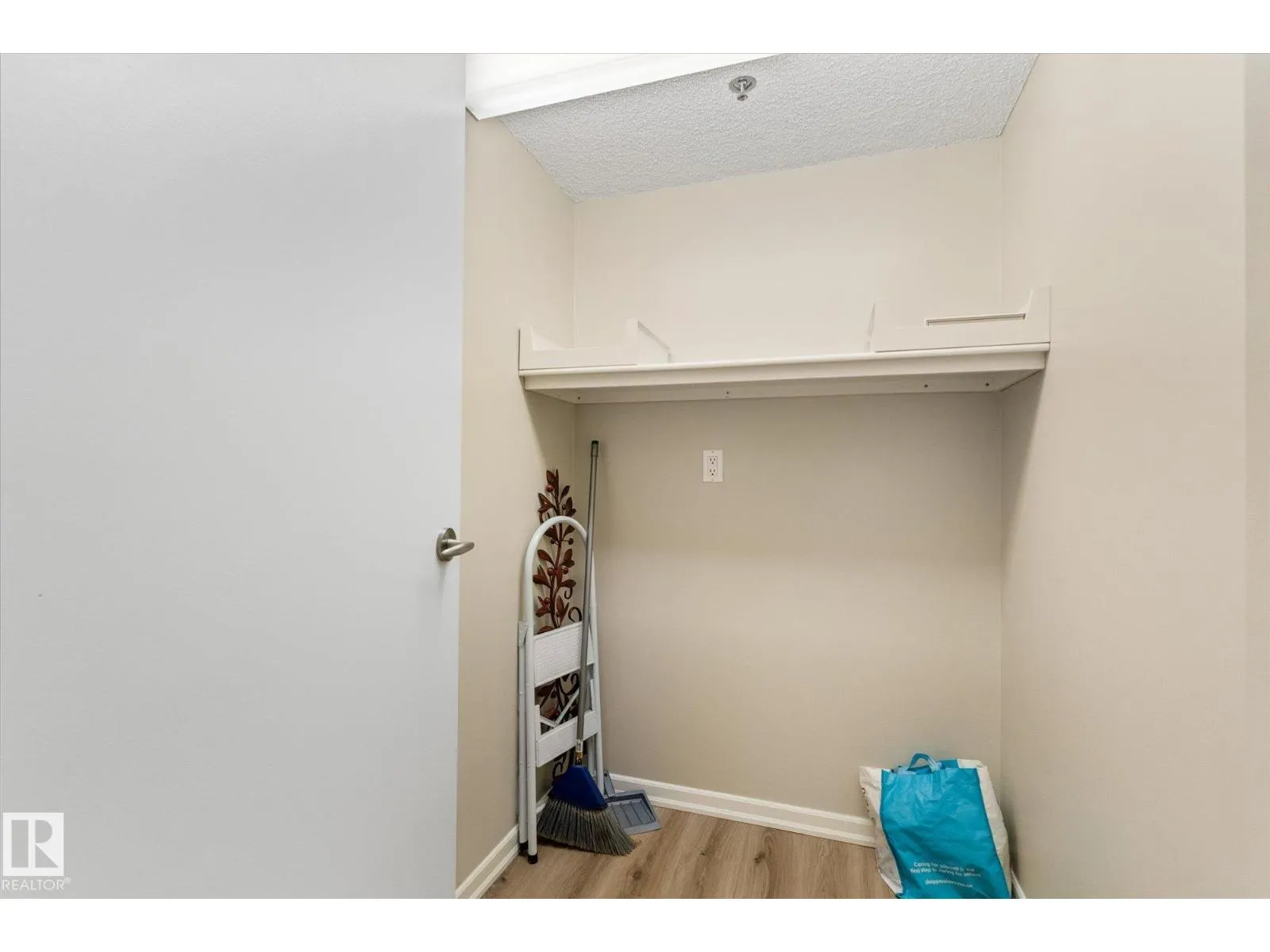 Immaculate and move-in ready! This stunning condo feels like a show suite and is located in a highly sought-after concrete and steel building overlooking Edmontonâs beautiful river valley. The updated kitchen features stylish cabinetry, stainless steel appliances, a designer hood fan, and endless counter space that opens to a spacious dining area and bright living room. Large windows flood the space with natural light, and a garden door leads to your patio. Recent upgrades include brand-new vinyl plank flooring throughout. The primary bedroom offers a large walk-in closet with convenient in-suite laundry, plus there is a 2nd bedroom down the hall, additional storage room, and a separate storage cage on the basement level. Heated underground parking includes a car wash bay, and owners enjoy top-tier amenities: library, social lounge, billiards room, craft space, and workshop. Steps from river valley trails, shopping, and transit, this one truly checks all the boxes! (id:27476)