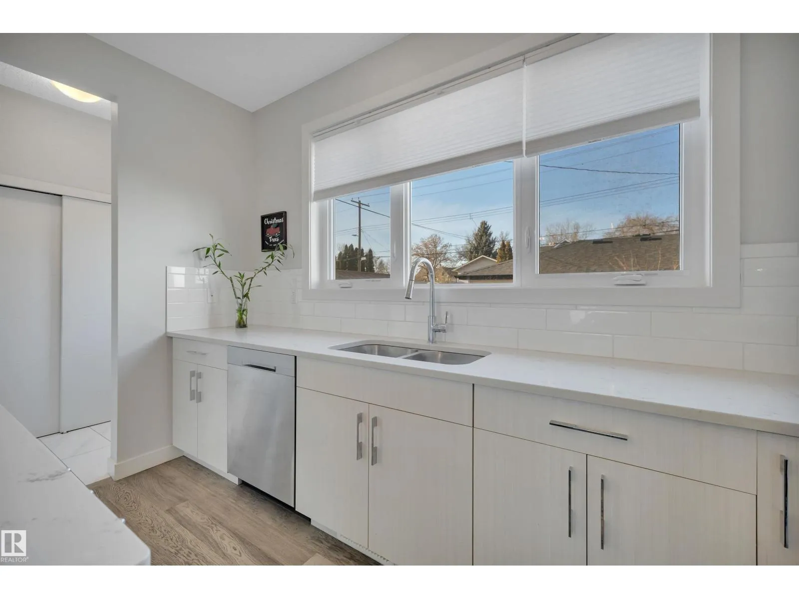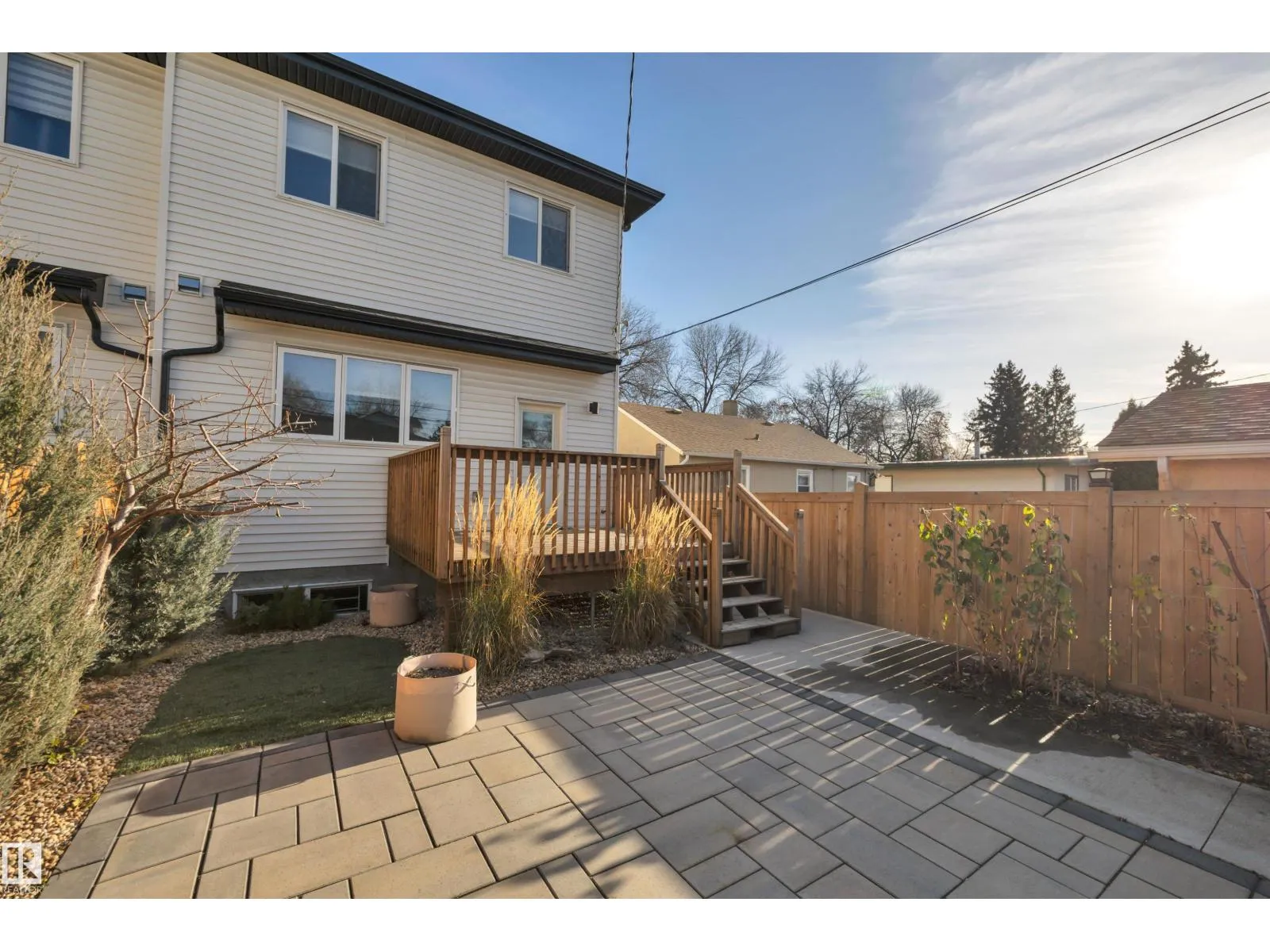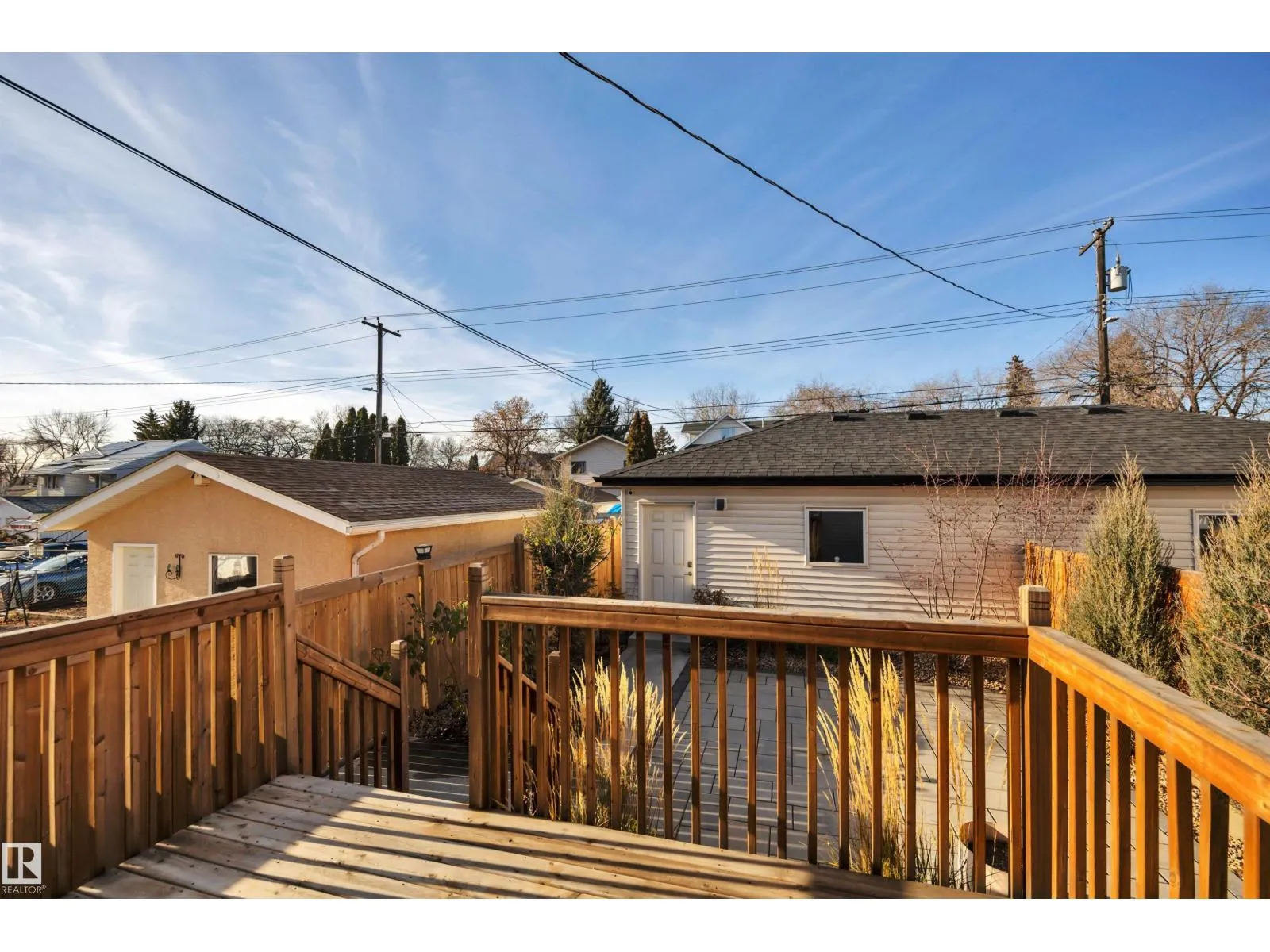 Centrally located in Bonnie Doon, and close to Downtown, Mill Creek Ravine, Whyte Ave, and the LRT, this stunning 4 bed half-duplex offers stylish living close to all the action. The 9' ceilings, engineered hardwood flooring, and spacious open concept layout welcomes you into this upgraded and well maintained home. Beyond the bright front dining/living room with gas fireplace lies your kitchen with stainless steel appliances, quartz countertops, pantry closet, gas stove, and ample counter space. The upstairs features your primary suite with walk-in closet and 5-piece ensuite with double vanity. The laundry room with sink, 2 additional bedrooms, and a 4-piece main bath completes the upstairs. The fully finished basement with separate entrance provides a large rec room, bar, 4-piece bathroom, and 4th bedroom. Enjoy entertaining in your backyard with concrete tile patio, large wood deck, and gas BBQ hook-up. Day to day life is easier with your double detached garage, triple pane window, and central AC. (id:27476)