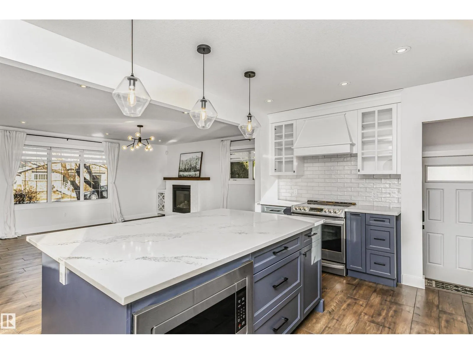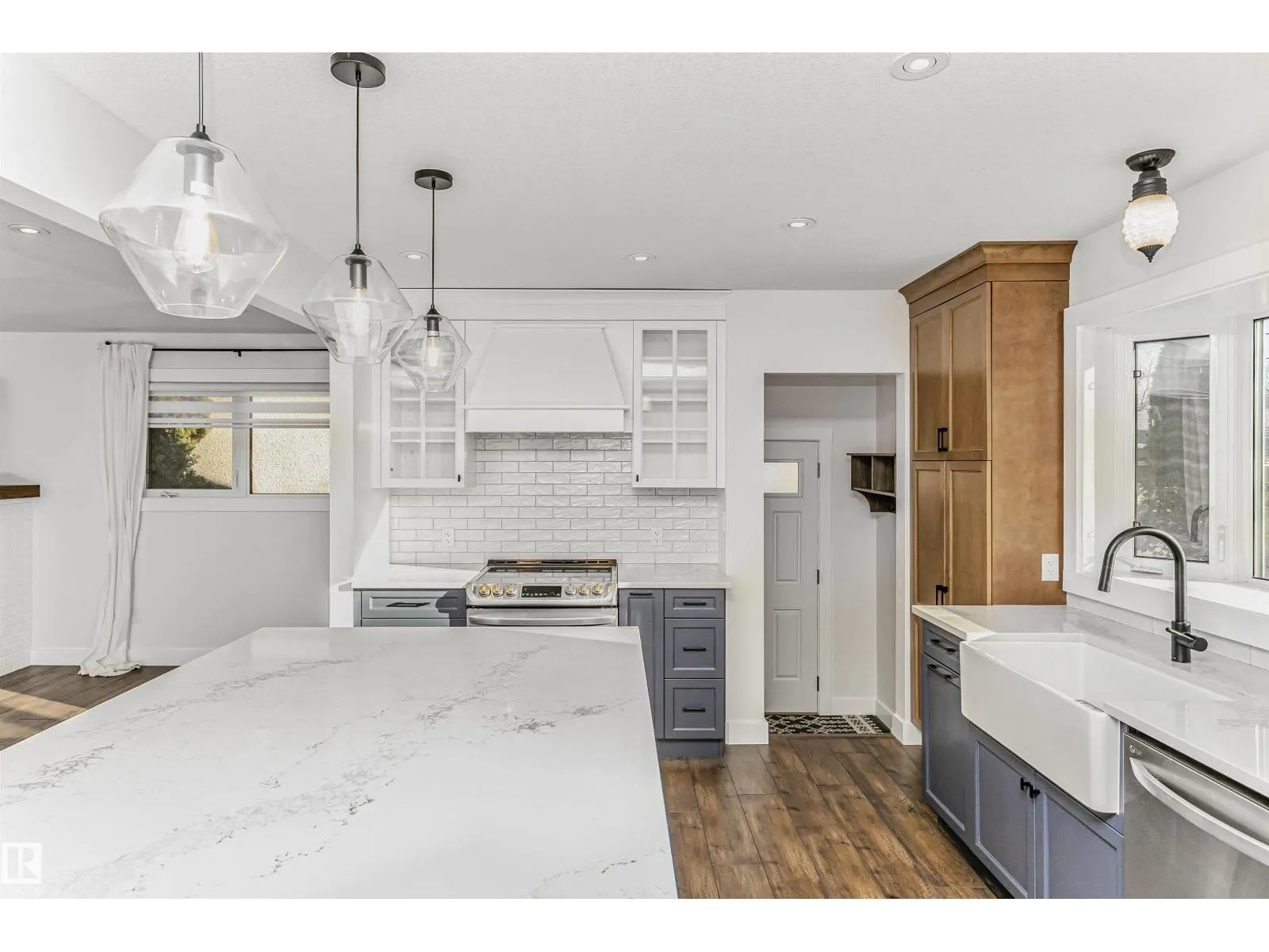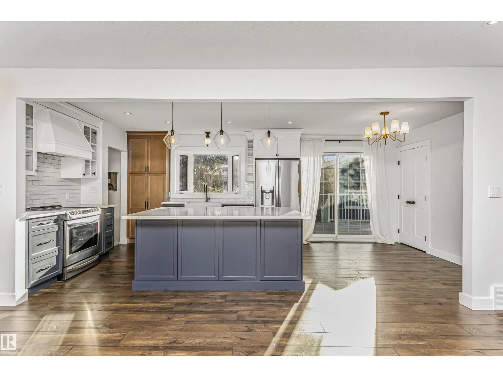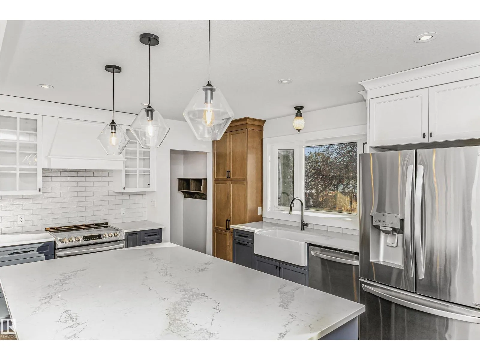 Beautifully renovated bungalow in the desirable neighbourhood of Fulton Place. The open concept main floor includes modern wide-plank wood flooring throughout. The tastefully upgraded kitchen includes a large quartz eat-in island, stainless steel appliances, white quartz counters and tons of stylish cabinetry. The kitchen looks out to a large bright living room with lots of windows, finished with a white brick-surround gas fireplace. Down the hall is a spacious primary bedroom and second bedroom adjacent to a 5-piece bath with double sinks and a vanity station. The basement includes a large recreation room open to a room with a wrap around wet bar, an additional full bathroom and tons of storage space. Additional features include A/C (2023) an oversized, heated double garage, beautiful spacious yard and recent upgrades including: windows, siding, deck, furnace and insulation. Close access to the Whitemud and only minutes from shopping and all amenities, this home is a must see! (id:27476)