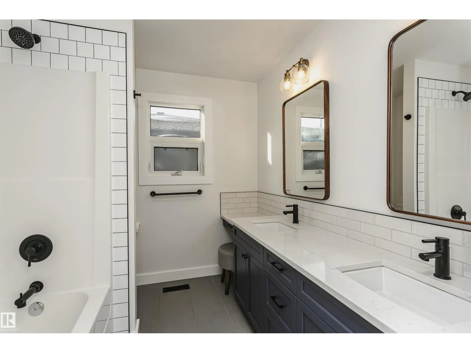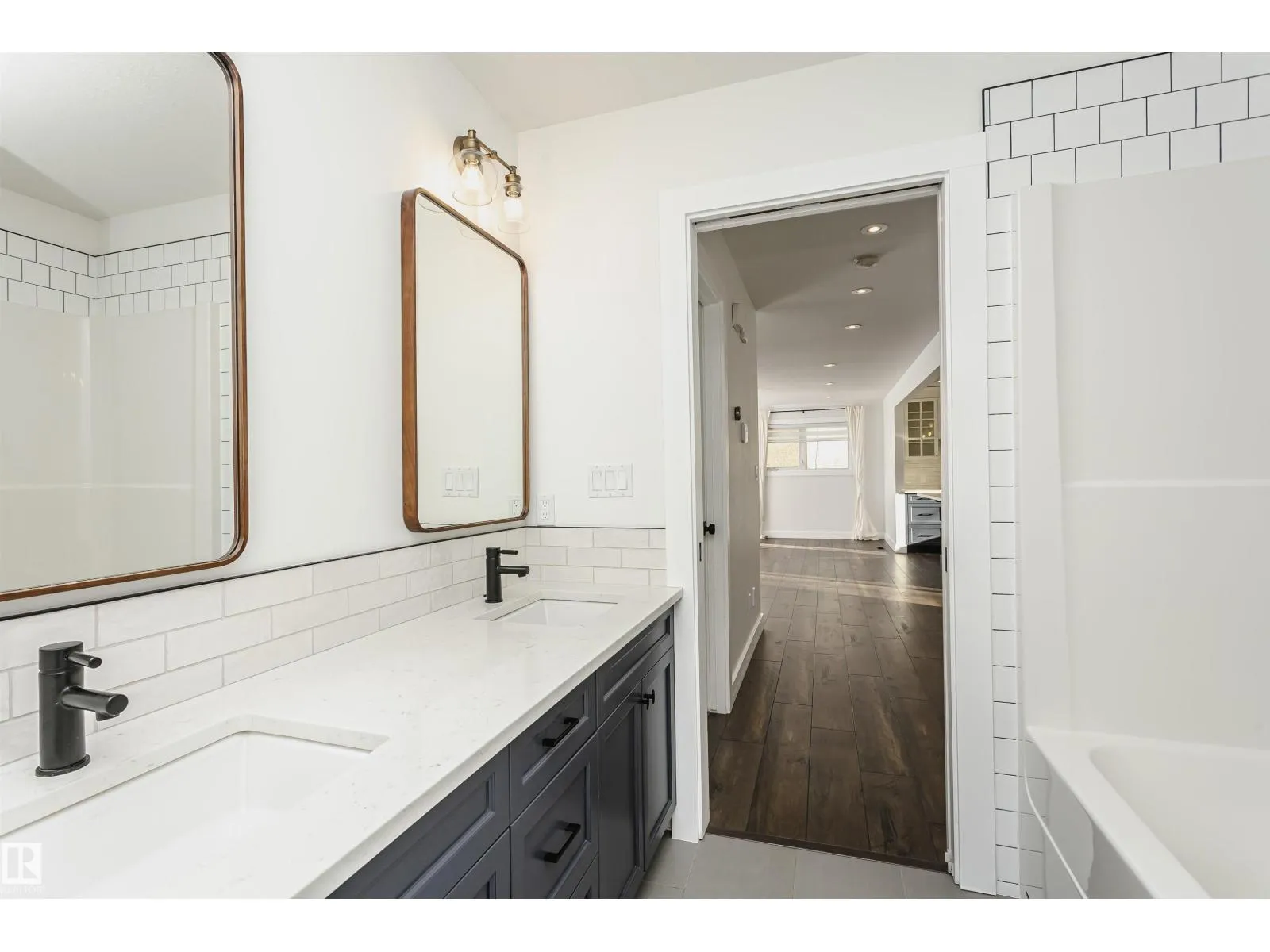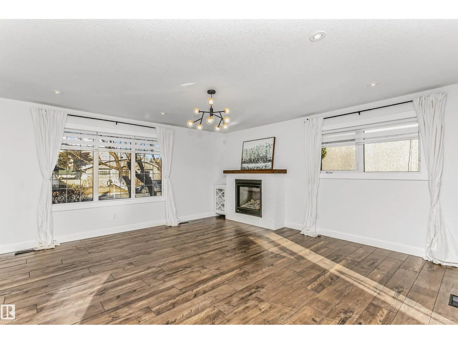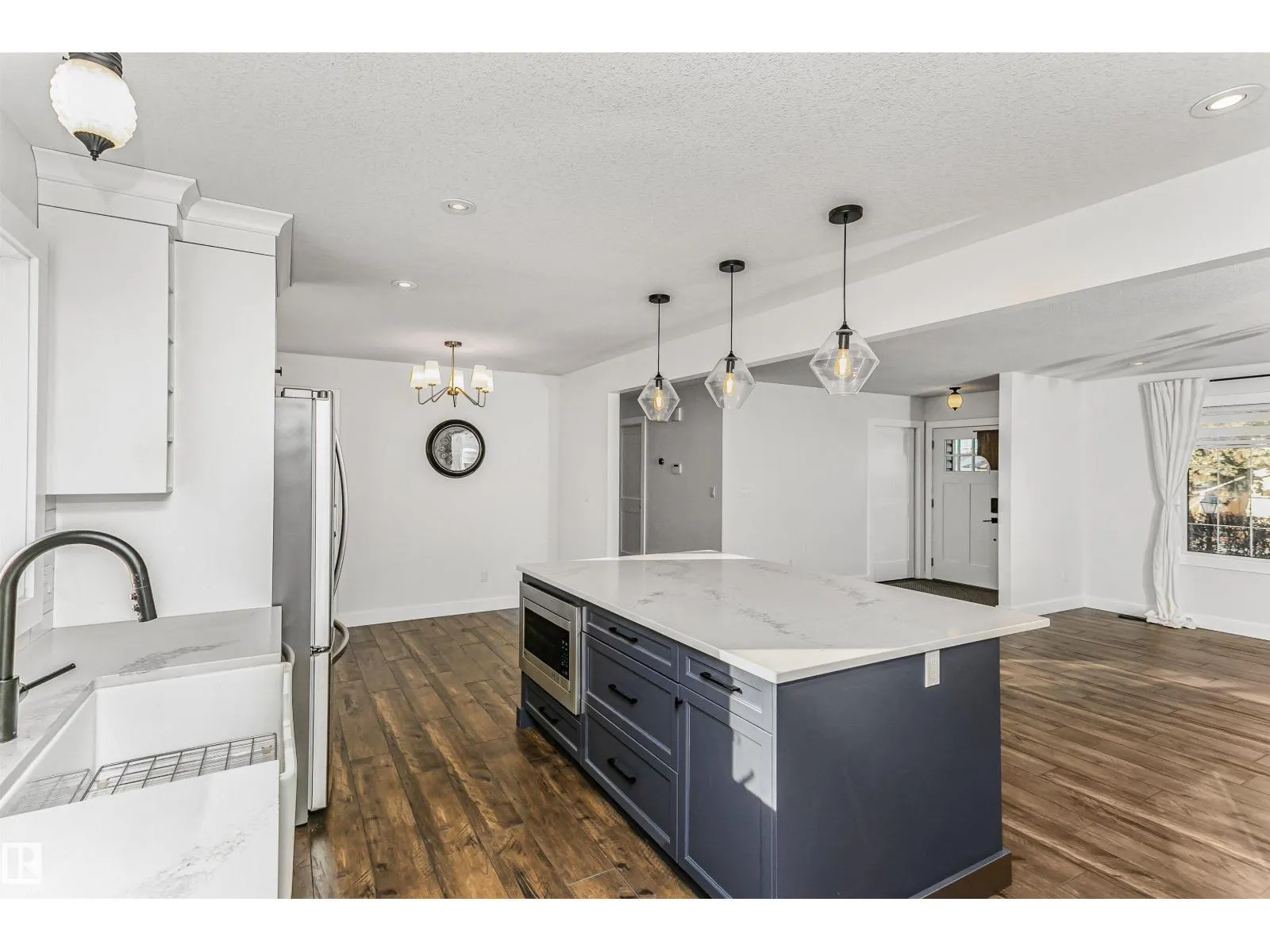 Beautifully renovated bungalow in the desirable neighbourhood of Fulton Place. The open concept main floor includes modern wide-plank wood flooring throughout. The tastefully upgraded kitchen includes a large quartz eat-in island, stainless steel appliances, white quartz counters and tons of stylish cabinetry. The kitchen looks out to a large bright living room with lots of windows, finished with a white brick-surround gas fireplace. Down the hall is a spacious primary bedroom and second bedroom adjacent to a 5-piece bath with double sinks and a vanity station. The basement includes a large recreation room open to a room with a wrap around wet bar, an additional full bathroom and tons of storage space. Additional features include A/C (2023) an oversized, heated double garage, beautiful spacious yard and recent upgrades including: windows, siding, deck, furnace and insulation. Close access to the Whitemud and only minutes from shopping and all amenities, this home is a must see! (id:27476)