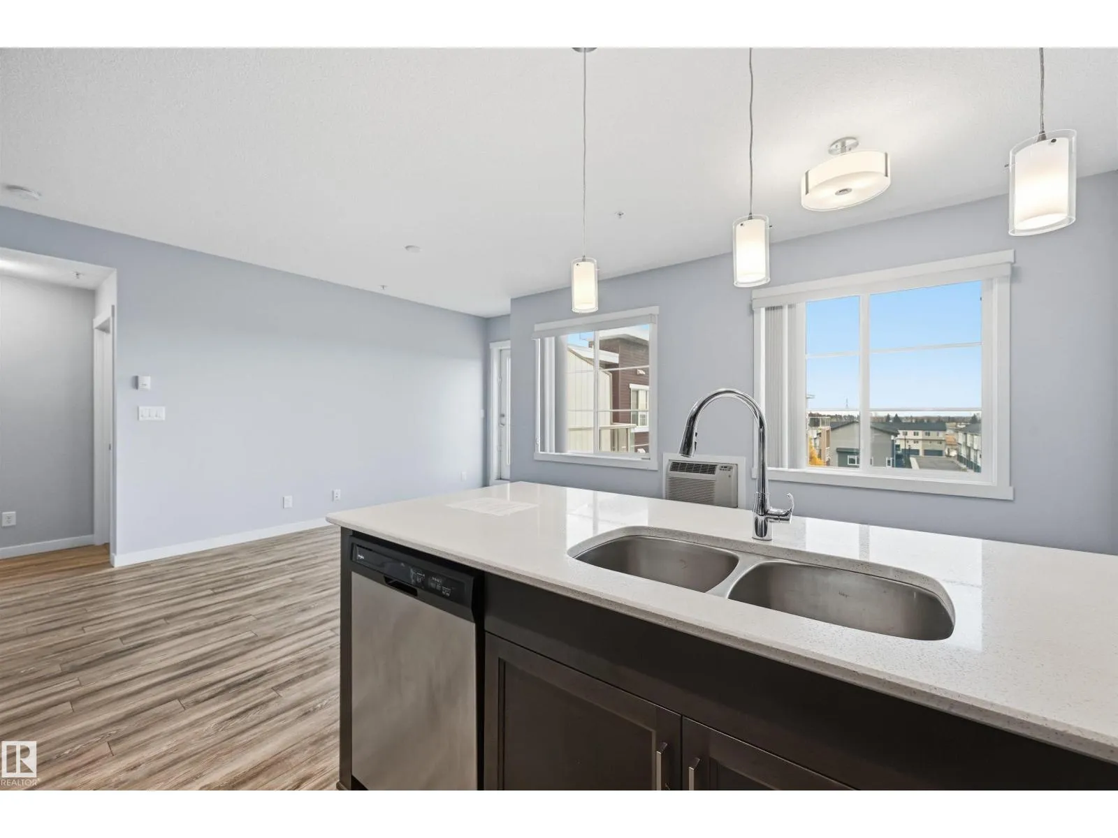 Well maintained and spacious TOP FLOOR 1 bed+den condo w/ AIR CONDITIONING! ALL UTILITIES INCL IN CONDO FEE - perfect for first time home buyers or investors. Prime location in South East Edmonton at Village at Walker Lake, close to everything! Unit features 9' ceilings, quartz countertops, laminate flooring, stainless steel kitchen appliances & a large island with eating bar. Open concept floor plan seamlessly connects the dining nook and roomy living room/patio. Primary bedroom has a unique layout and well-sized closet. The den is perfect for a home office space or a cozy second bedroom. Comes with a HEATED UNDERGROUND parking stall. Visitor parking available. Conveniently located close to schools, public transportation, grocery stores, shopping & dining at South Edmonton Common, walking trails & ponds. Easy access to major commuter routes including Ellerslie Rd and Anthony Henday for effortless city wide commuting. (id:27476)