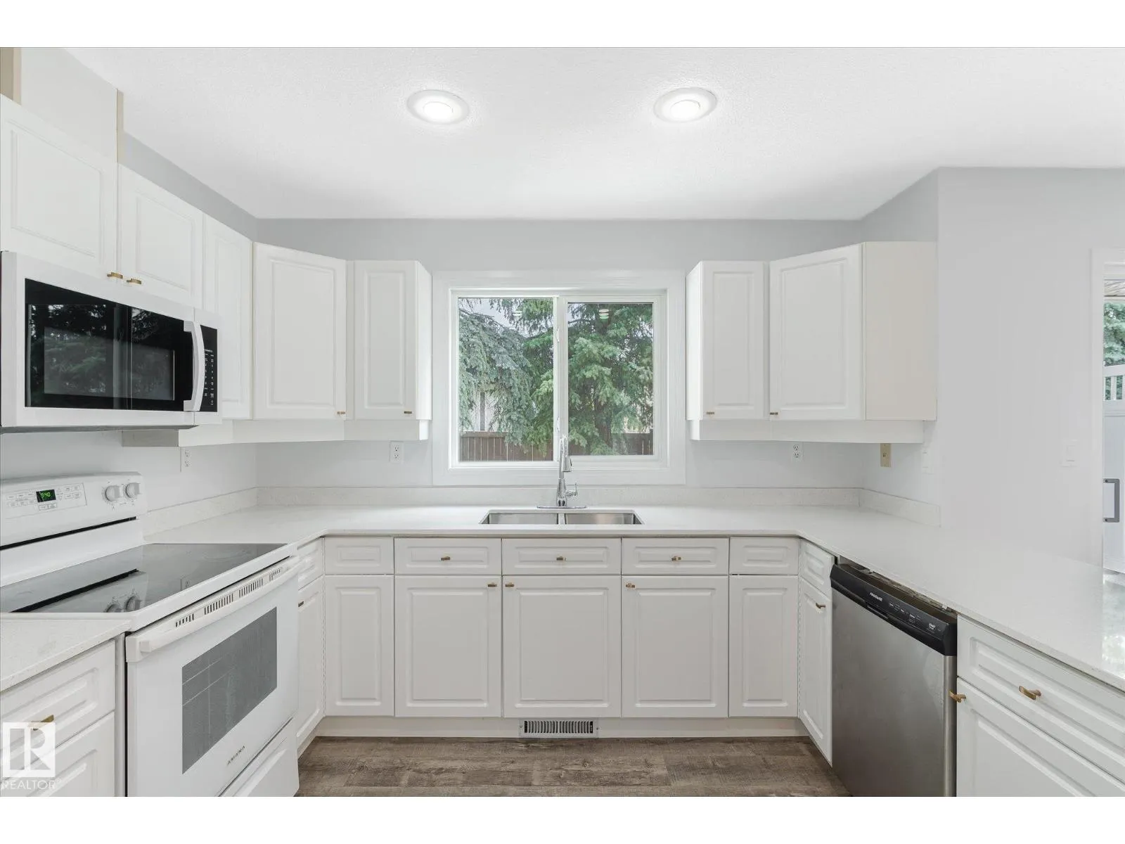 Located in the hidden gem of west EdmontonTerra Losa! This home is steps from walking trails, a park, shopping, & lake. This fully finished home has a white kitchen with brand new quartz counter tops, sink, new stainless steel fridge, luxury vinyl plank flooring. Eating area leads to patio doors & deck w/ privacy wall where you can enjoy the seclusion of the treed backyard. Laminate floors gleam in the living room with the sunny south facing window & there is a gas fireplace to keep you warm. Updated 2 piece powder room and updated light fixtures rounds out this level. Upstairs there are 3 bedrooms including a master bedroom with full ensuite & vinyl plank flooring. The main bathroom upstairs also features vinyl plank flooring and quartz counters. The basement has family room with large window and the laundry room. Furnace and hot water tank have both been replaced in the last few years. Single garage is an added bonus. Enjoy a quiet walkable area that blends natural beauty w/ urban convenience. (id:27476)