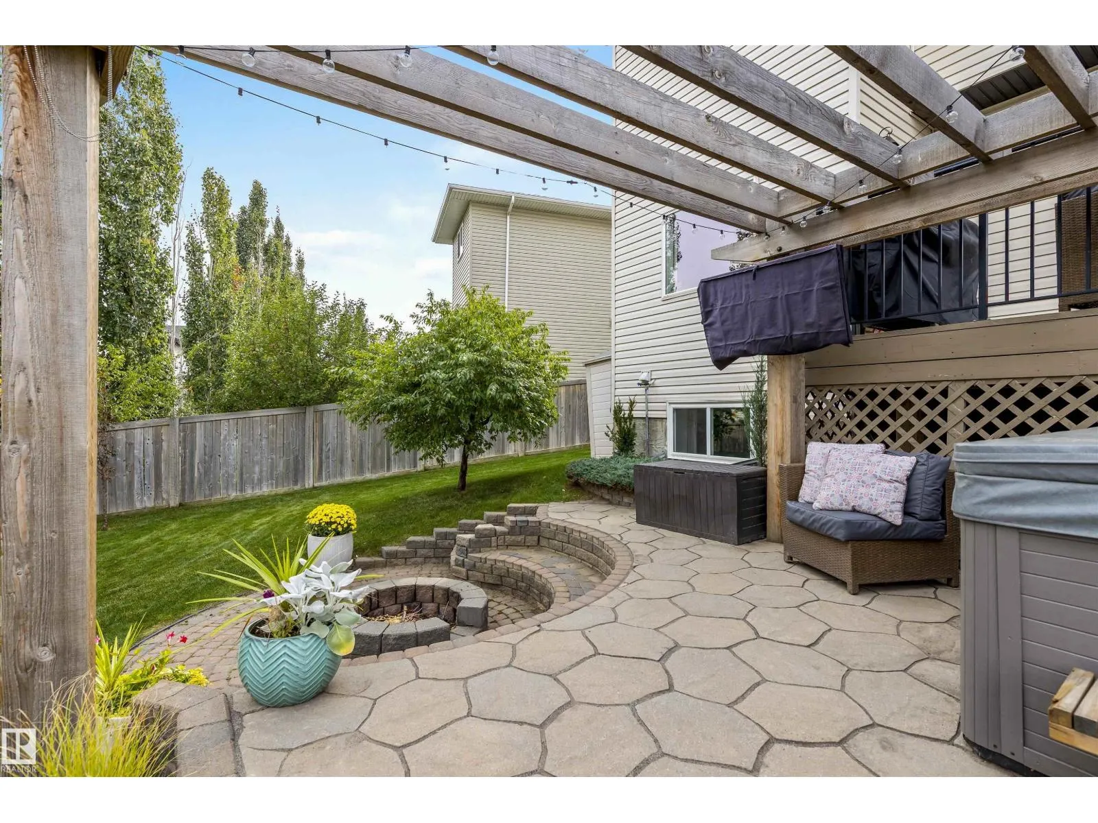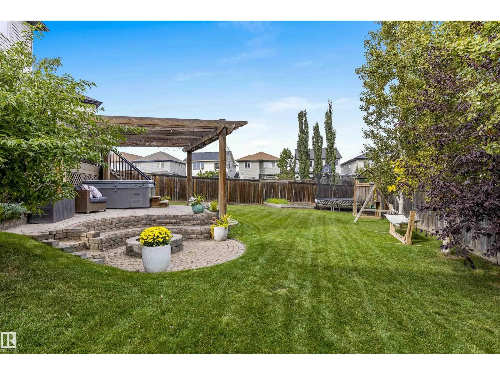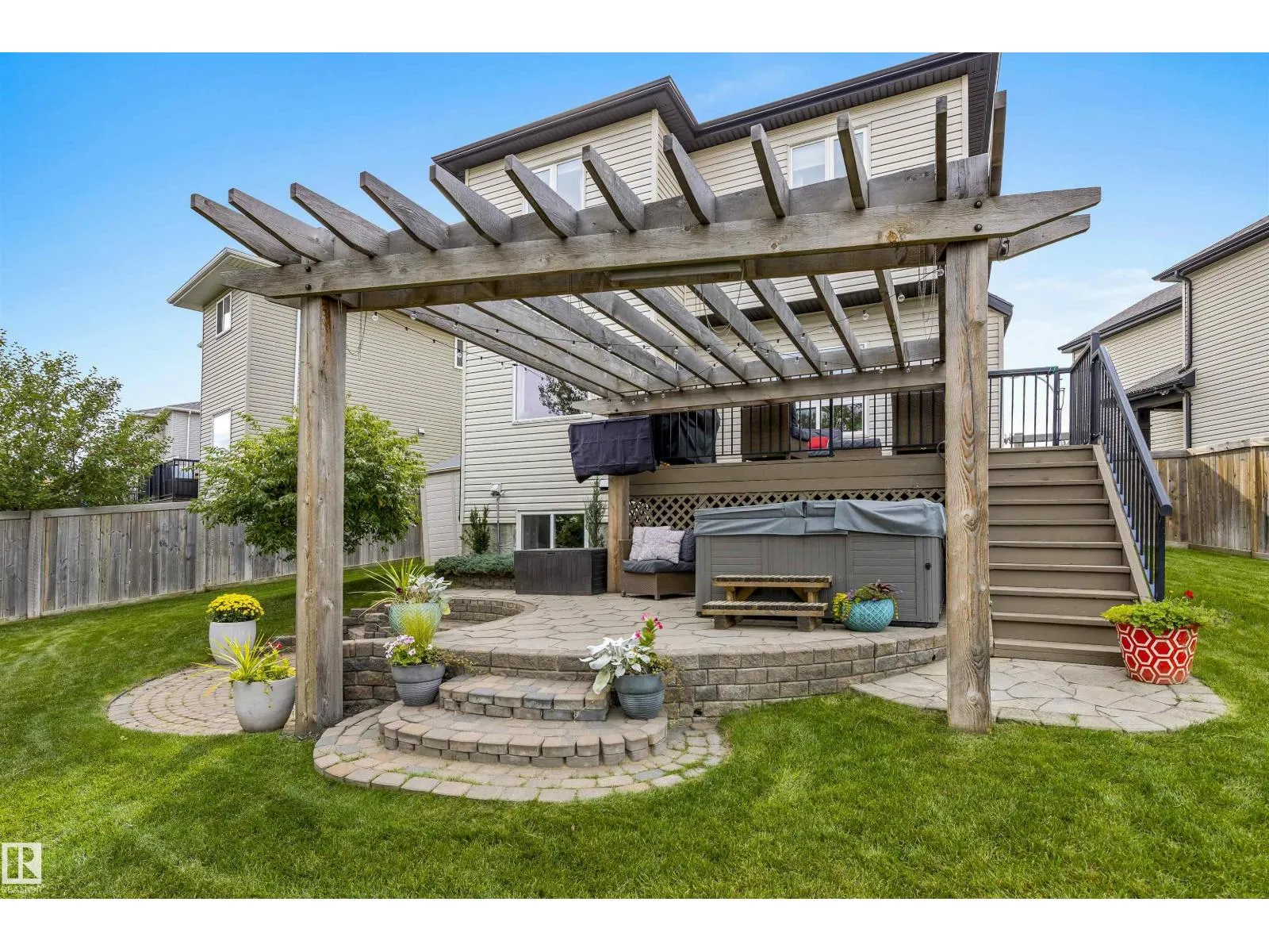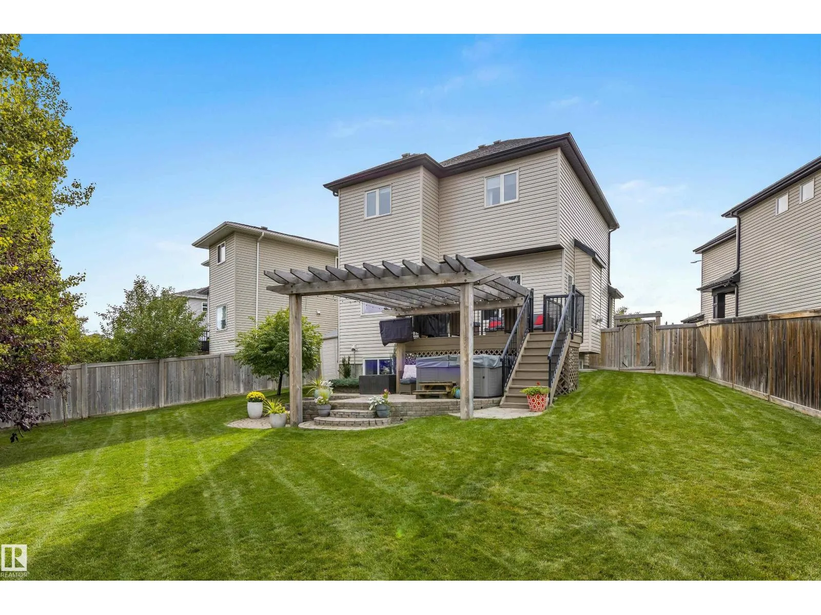Absolutely stunning home on a big PIE lot! Great open layout- gorgeous kitchen with cabinets all the way up the 9' ceilings, 8' granite island, stainless appliances including new range & walk through pantry to the garage. Currently set up for a large dining table by the cozy gas fireplace & a bright sitting area at the back of the home, but easily switched for a larger living room on the main floor & a table in the nook. The patio door leads out to an incredible yard with an elevated deck, pergola, hot tub & beautifully landscaped paving stone & lush irrigated green oasis! Upstairs are 3 good sized bedrooms, 2 full baths & a central bonus room to separate the bedrooms. The primary has a great walk-in closet & tile & glass shower with quartz counters. The basement is fully finished with a 4th bedroom, 3rd full bathroom & a good sized family room. Quiet street with excellent neighbours, close to walking trails, parks, Public & Catholic schools & Lewis Farms Rec Centre. Central A/C & HWT 2022 (id:27476)
