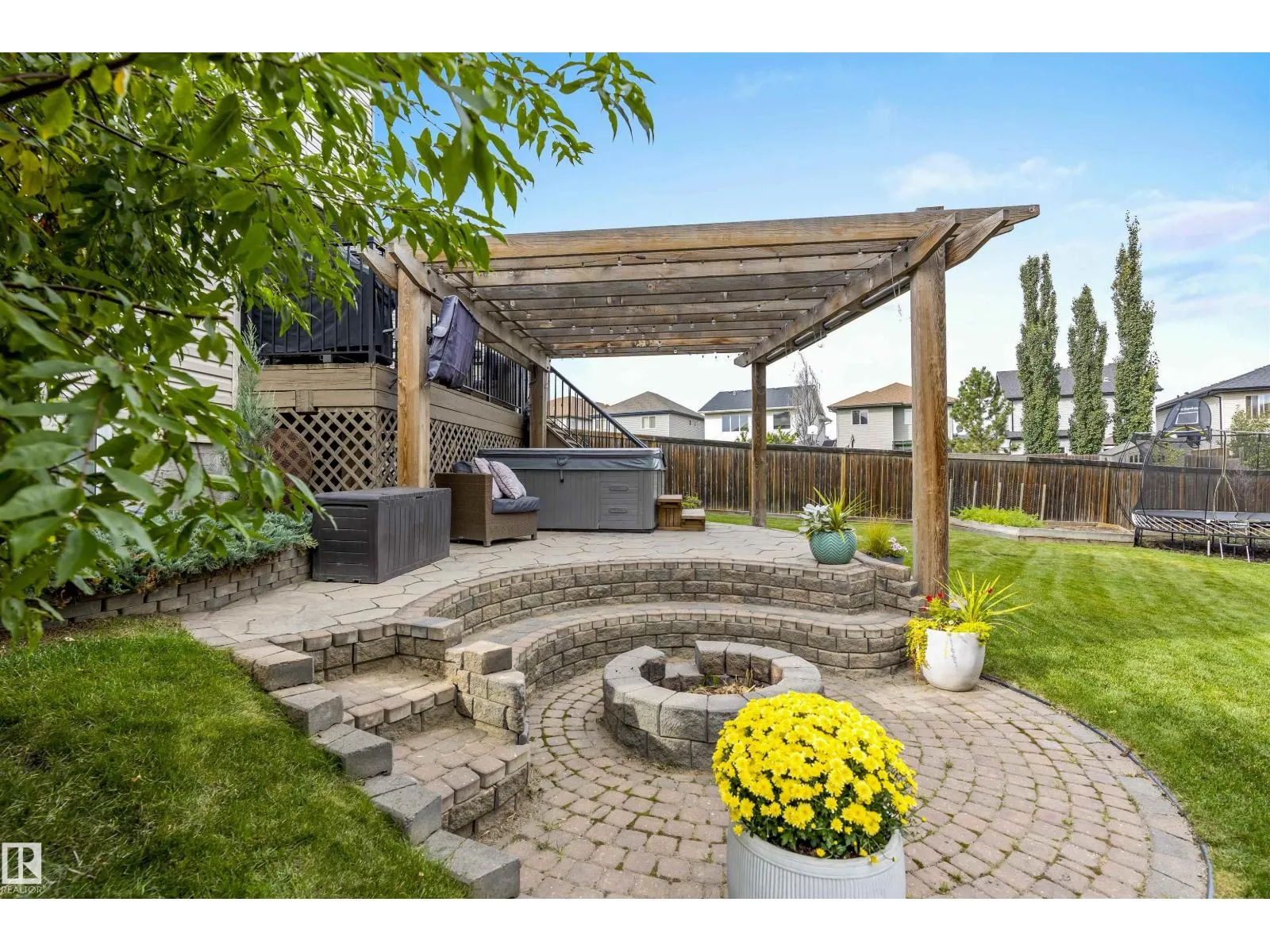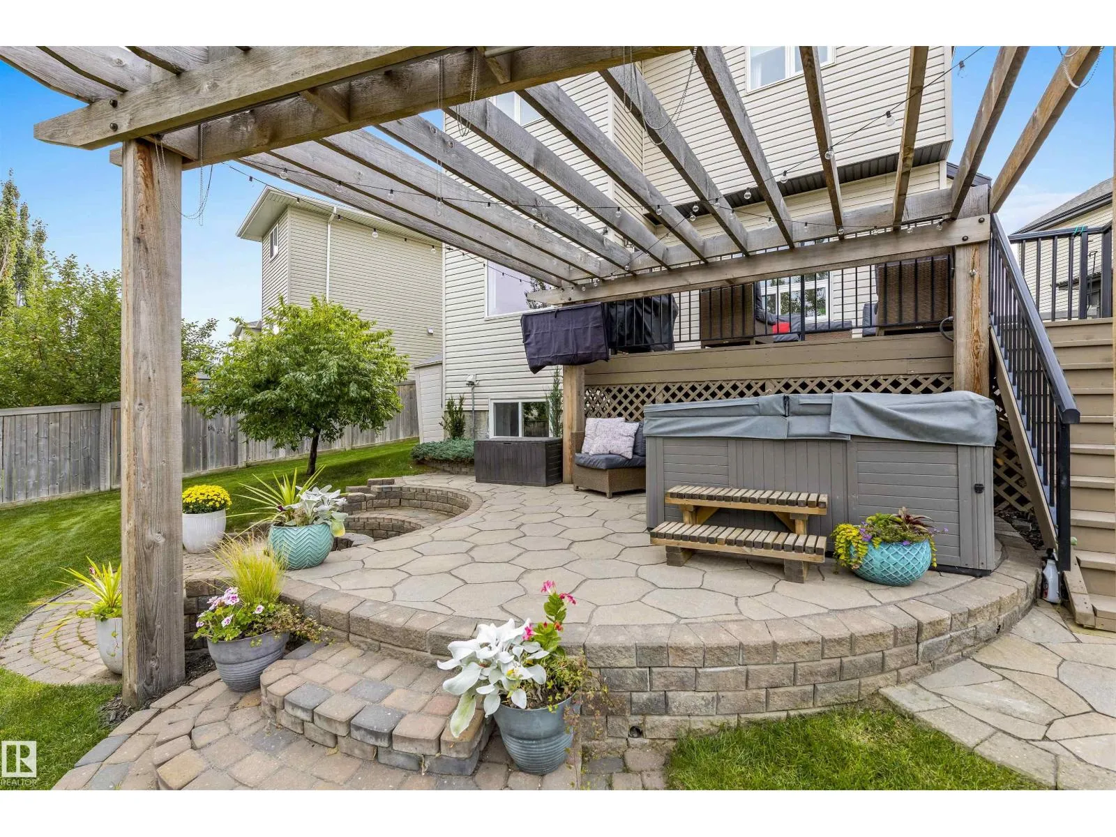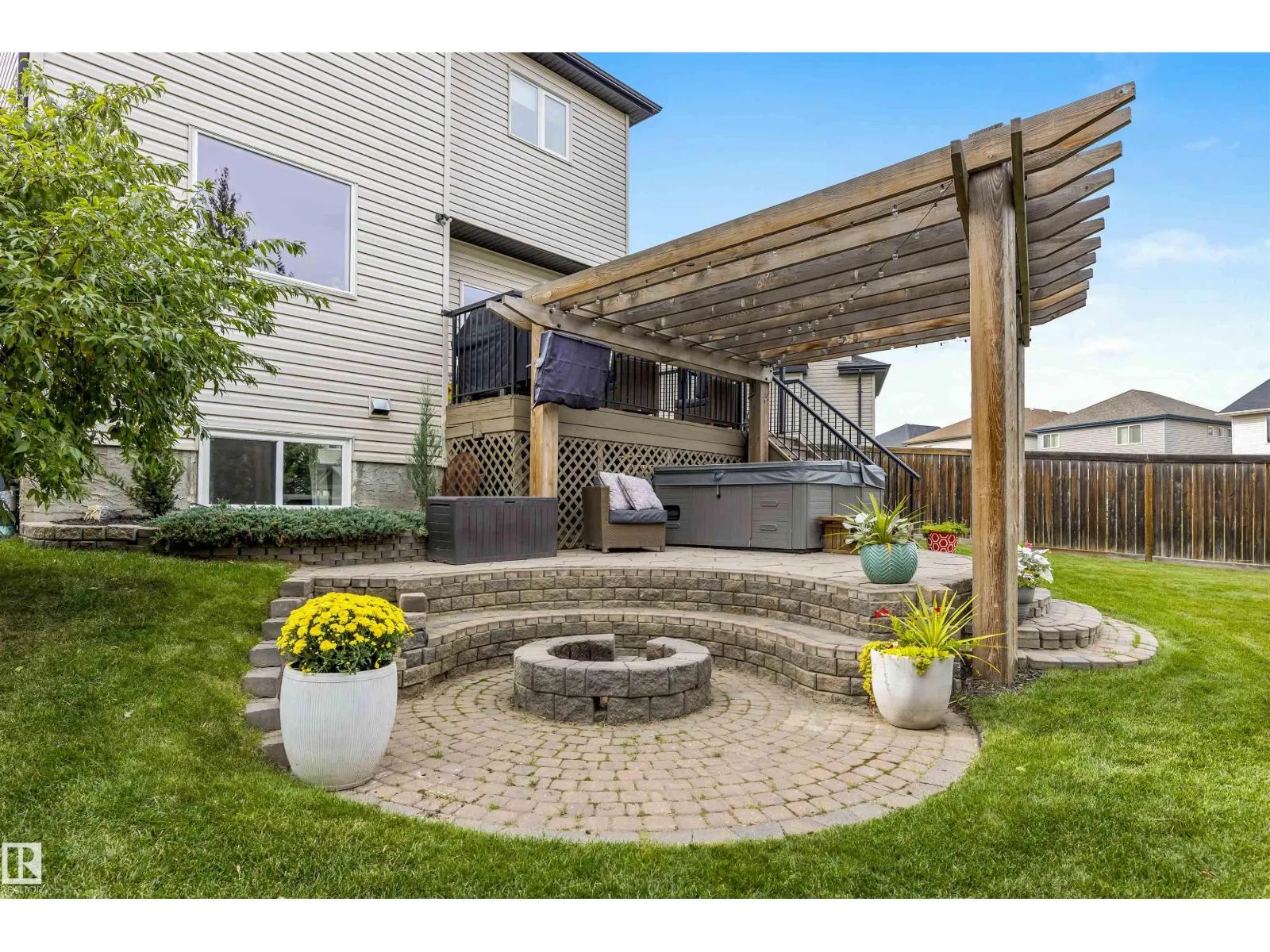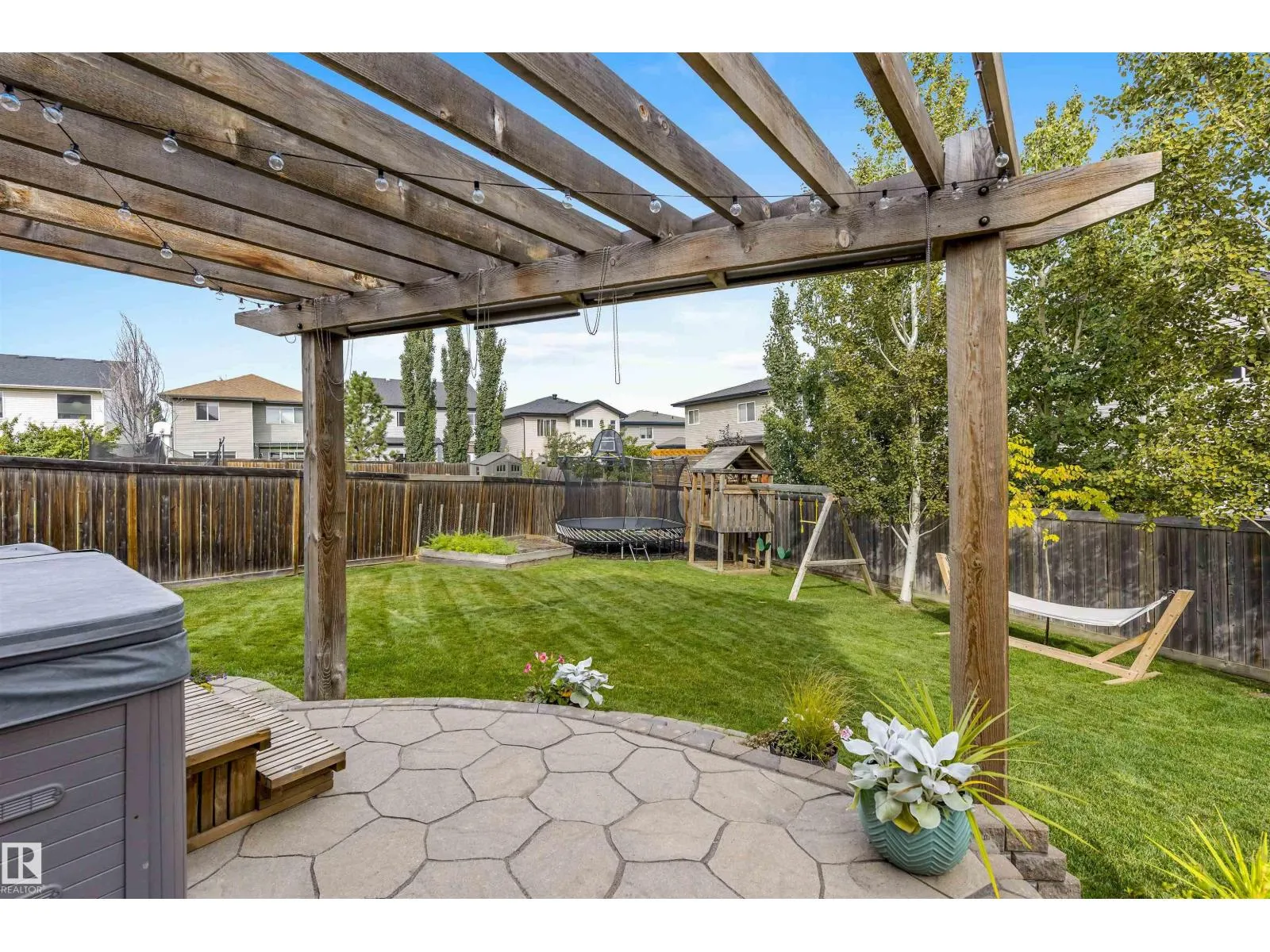 Absolutely stunning home on a big PIE lot! Great open layout- gorgeous kitchen with cabinets all the way up the 9' ceilings, 8' granite island, stainless appliances including new range & walk through pantry to the garage. Currently set up for a large dining table by the cozy gas fireplace & a bright sitting area at the back of the home, but easily switched for a larger living room on the main floor & a table in the nook. The patio door leads out to an incredible yard with an elevated deck, pergola, hot tub & beautifully landscaped paving stone & lush irrigated green oasis! Upstairs are 3 good sized bedrooms, 2 full baths & a central bonus room to separate the bedrooms. The primary has a great walk-in closet & tile & glass shower with quartz counters. The basement is fully finished with a 4th bedroom, 3rd full bathroom & a good sized family room. Quiet street with excellent neighbours, close to walking trails, parks, Public & Catholic schools & Lewis Farms Rec Centre. Central A/C & HWT 2022 (id:27476)