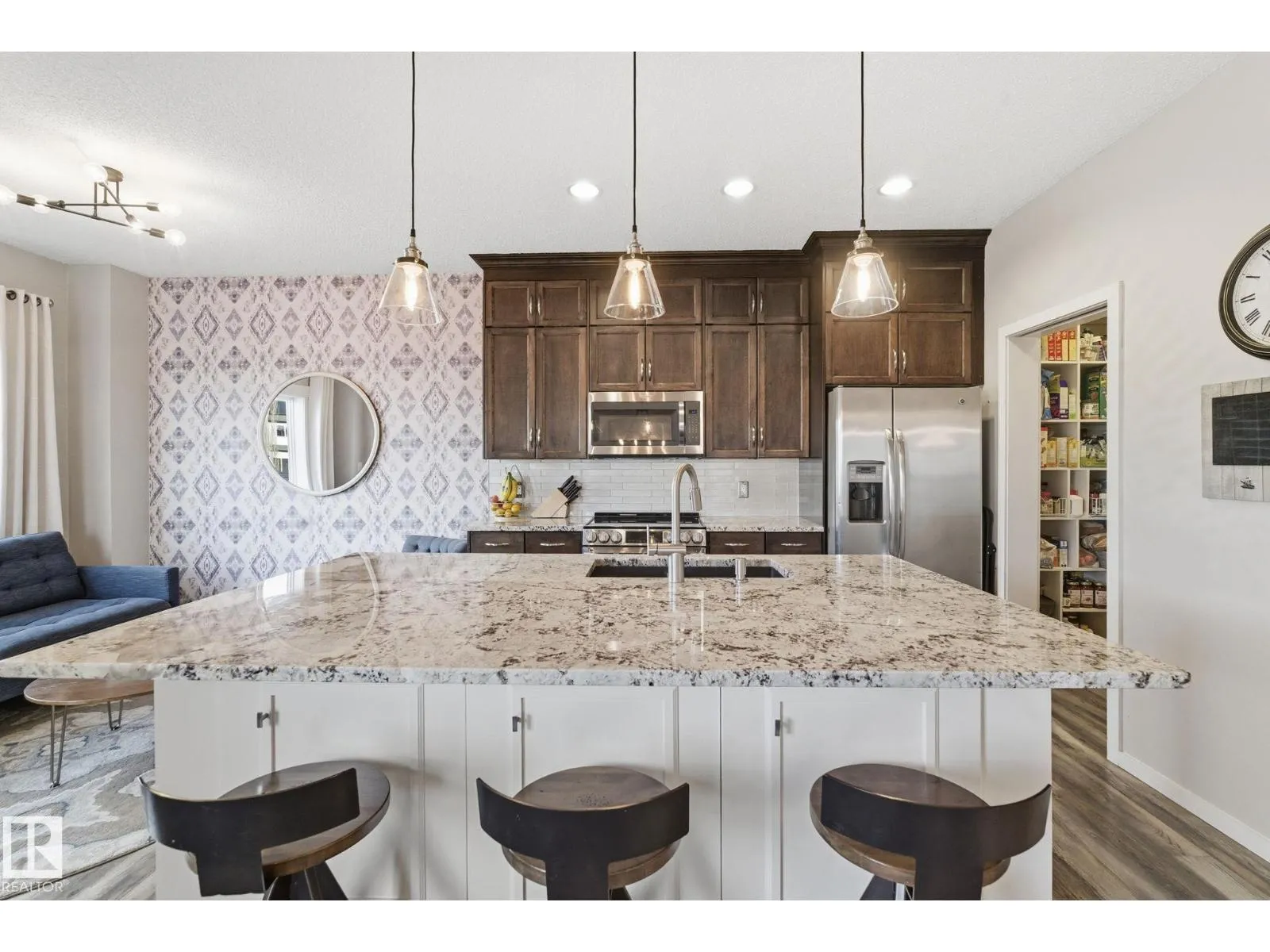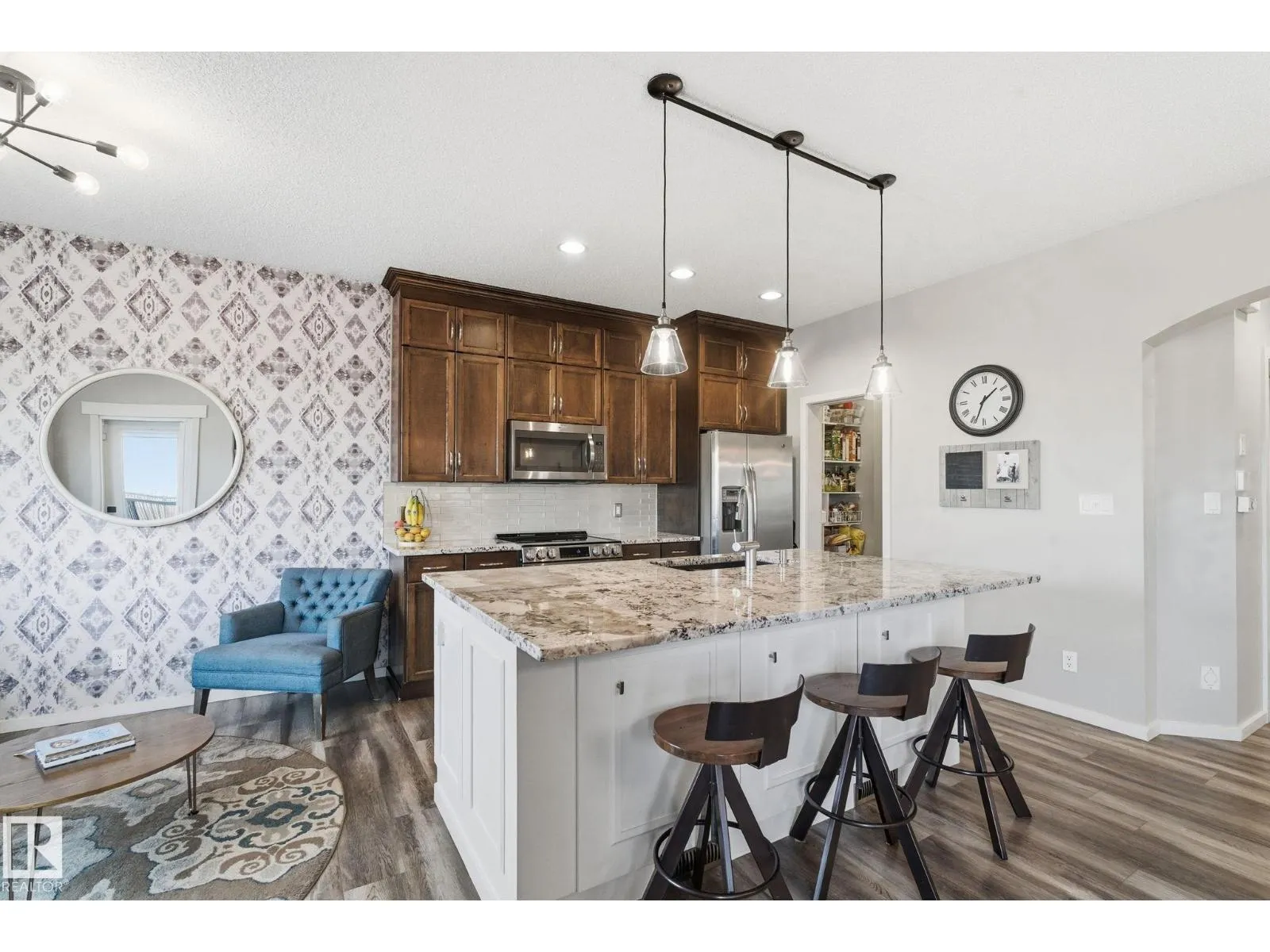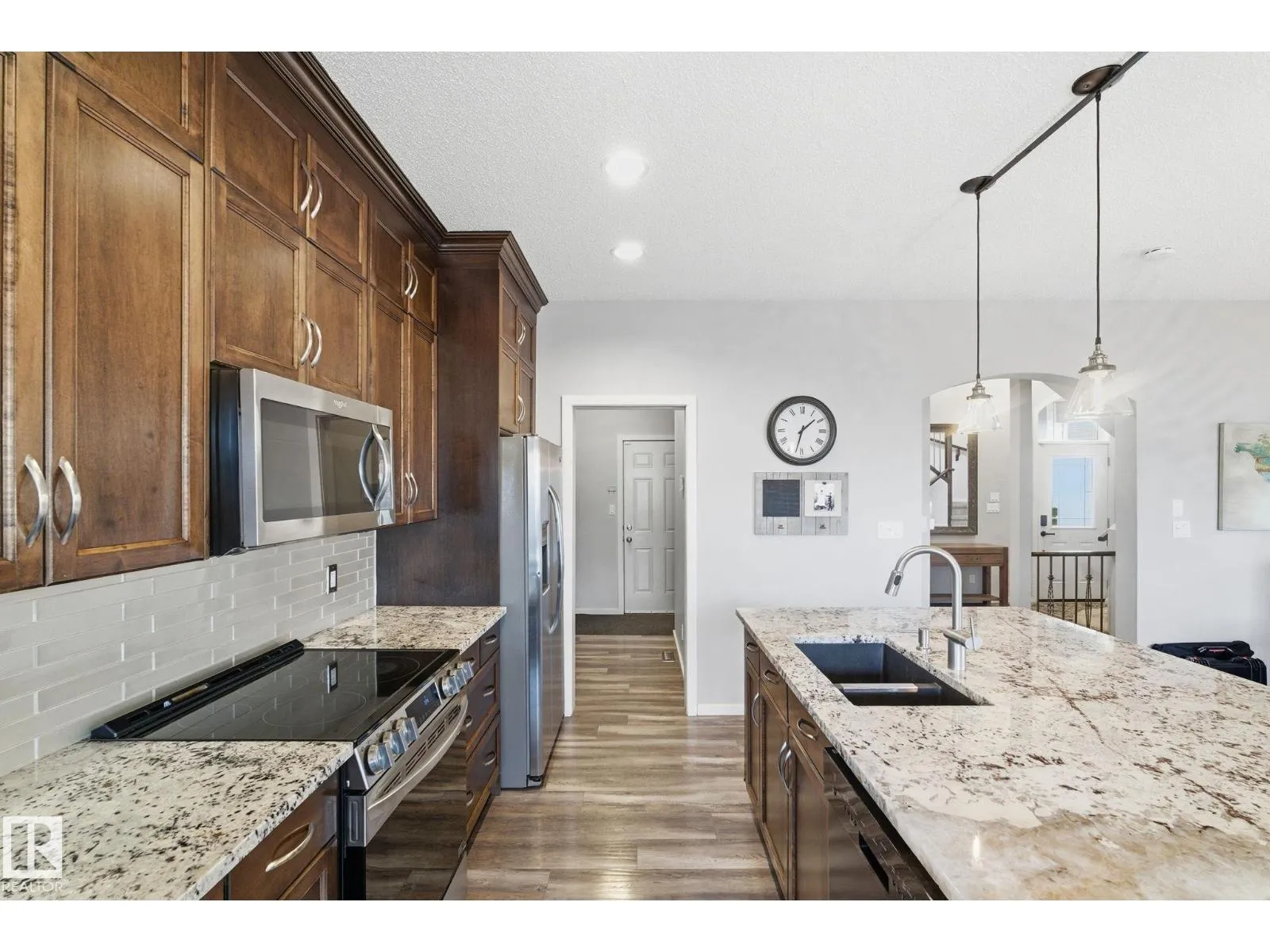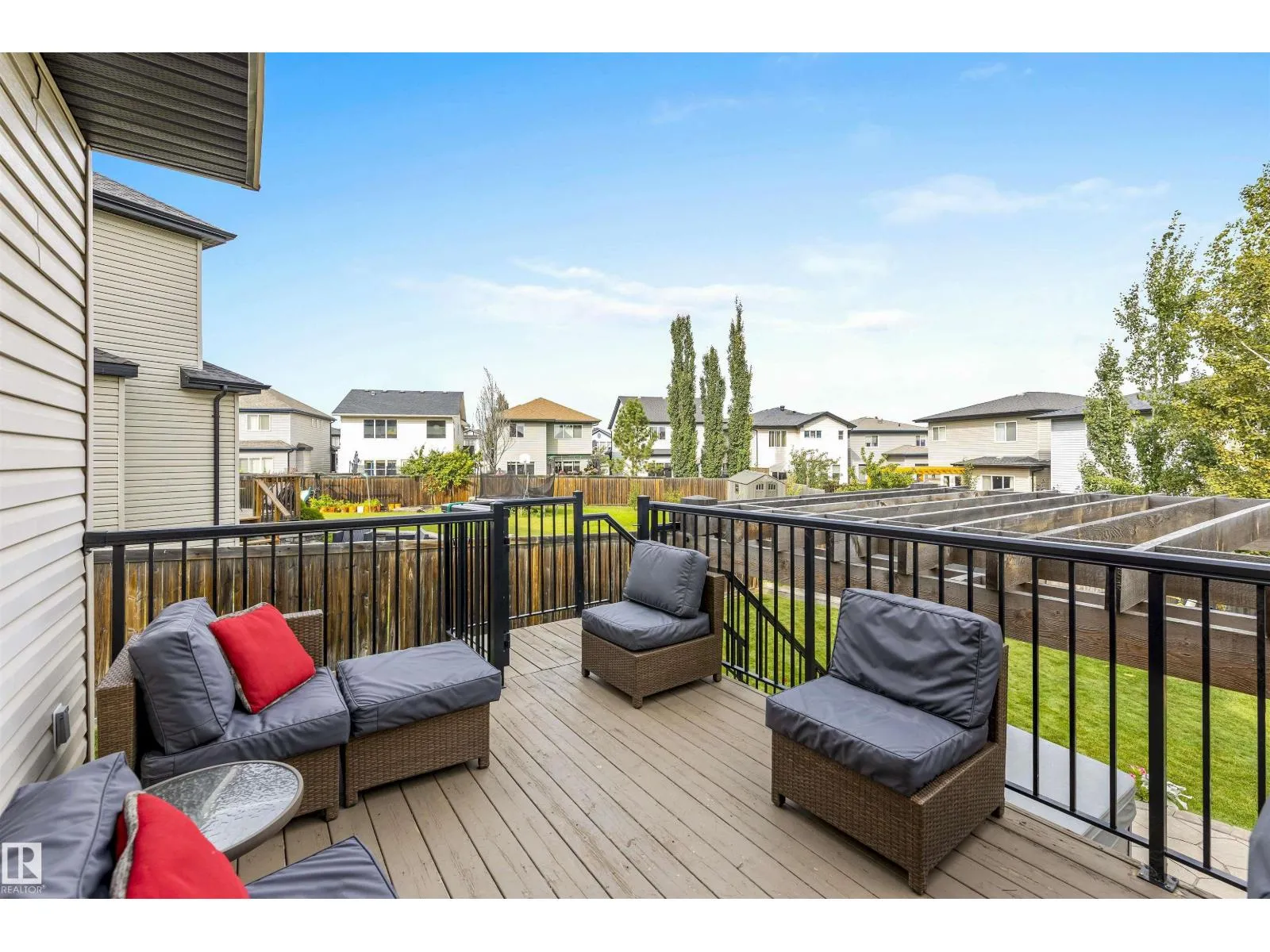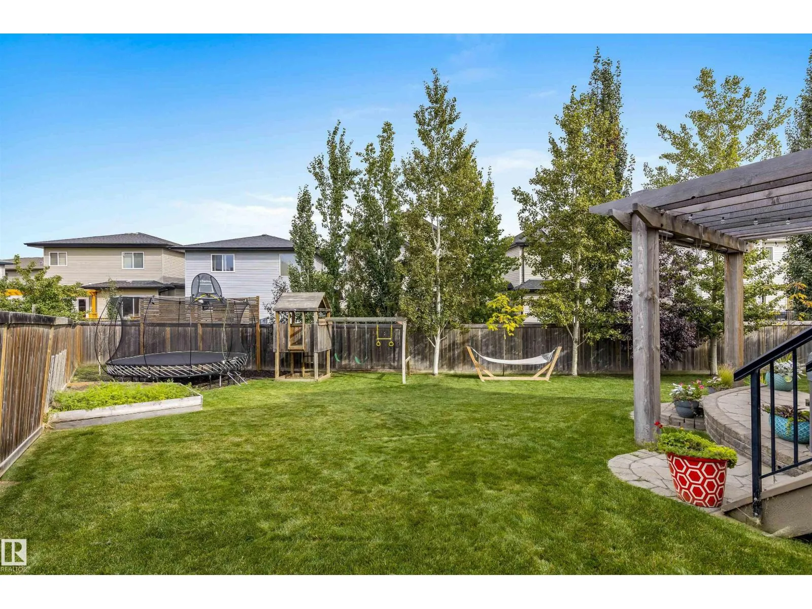 Absolutely stunning home on a big PIE lot! Great open layout- gorgeous kitchen with cabinets all the way up the 9' ceilings, 8' granite island, stainless appliances including new range & walk through pantry to the garage. Currently set up for a large dining table by the cozy gas fireplace & a bright sitting area at the back of the home, but easily switched for a larger living room on the main floor & a table in the nook. The patio door leads out to an incredible yard with an elevated deck, pergola, hot tub & beautifully landscaped paving stone & lush irrigated green oasis! Upstairs are 3 good sized bedrooms, 2 full baths & a central bonus room to separate the bedrooms. The primary has a great walk-in closet & tile & glass shower with quartz counters. The basement is fully finished with a 4th bedroom, 3rd full bathroom & a good sized family room. Quiet street with excellent neighbours, close to walking trails, parks, Public & Catholic schools & Lewis Farms Rec Centre. Central A/C & HWT 2022 (id:27476)