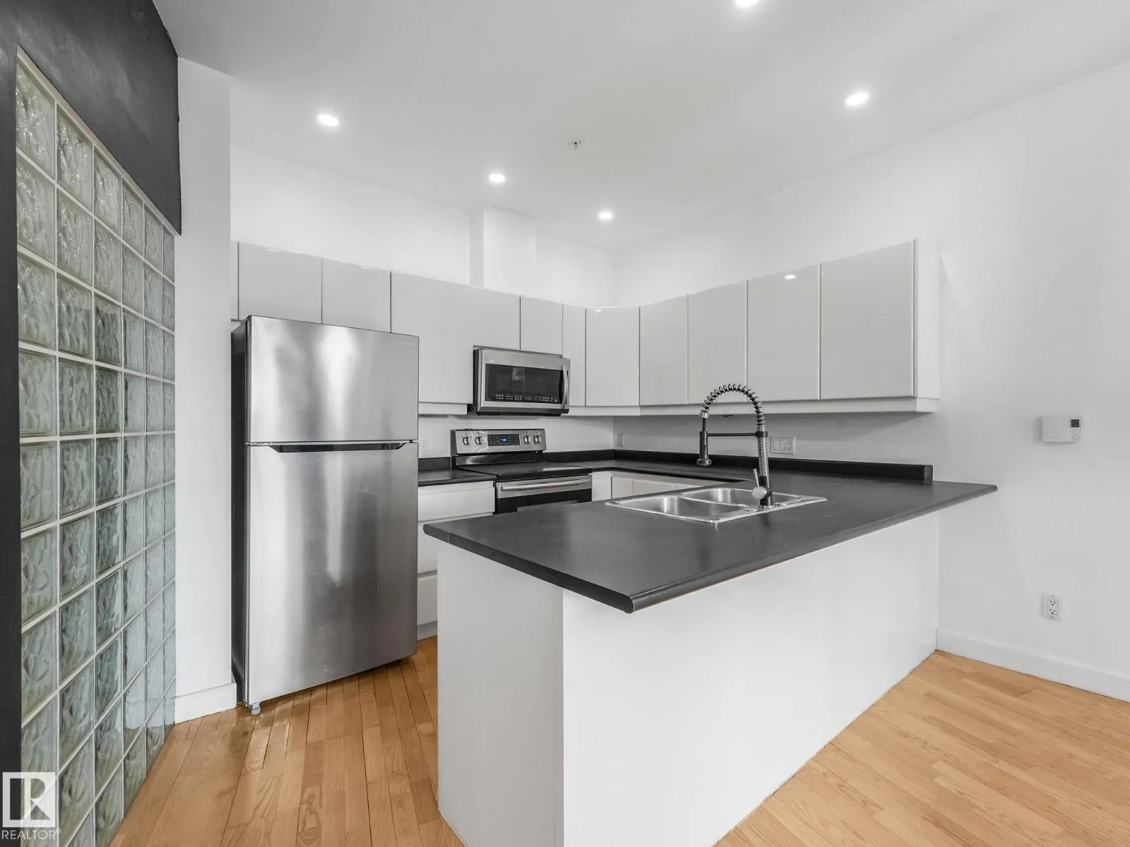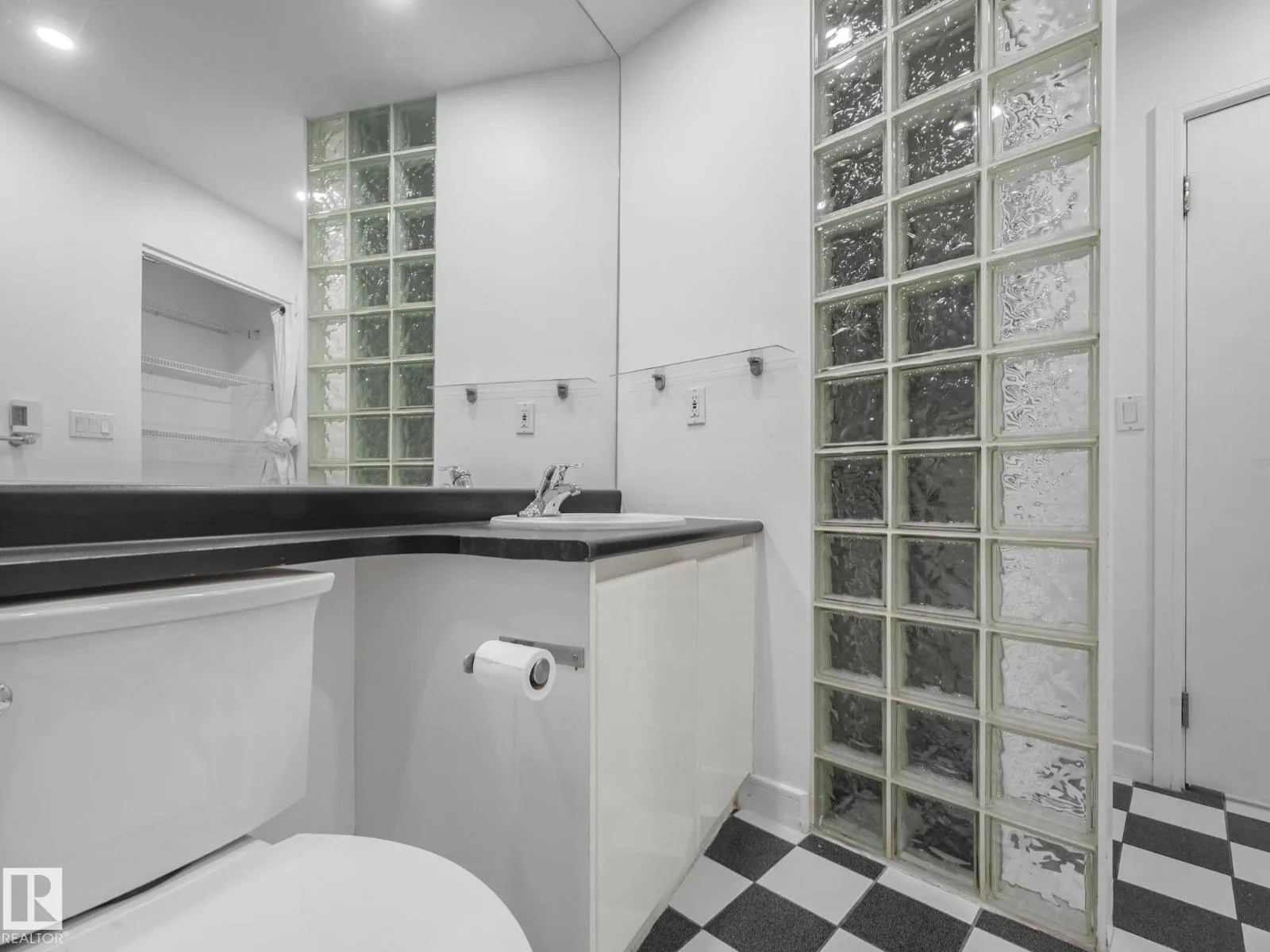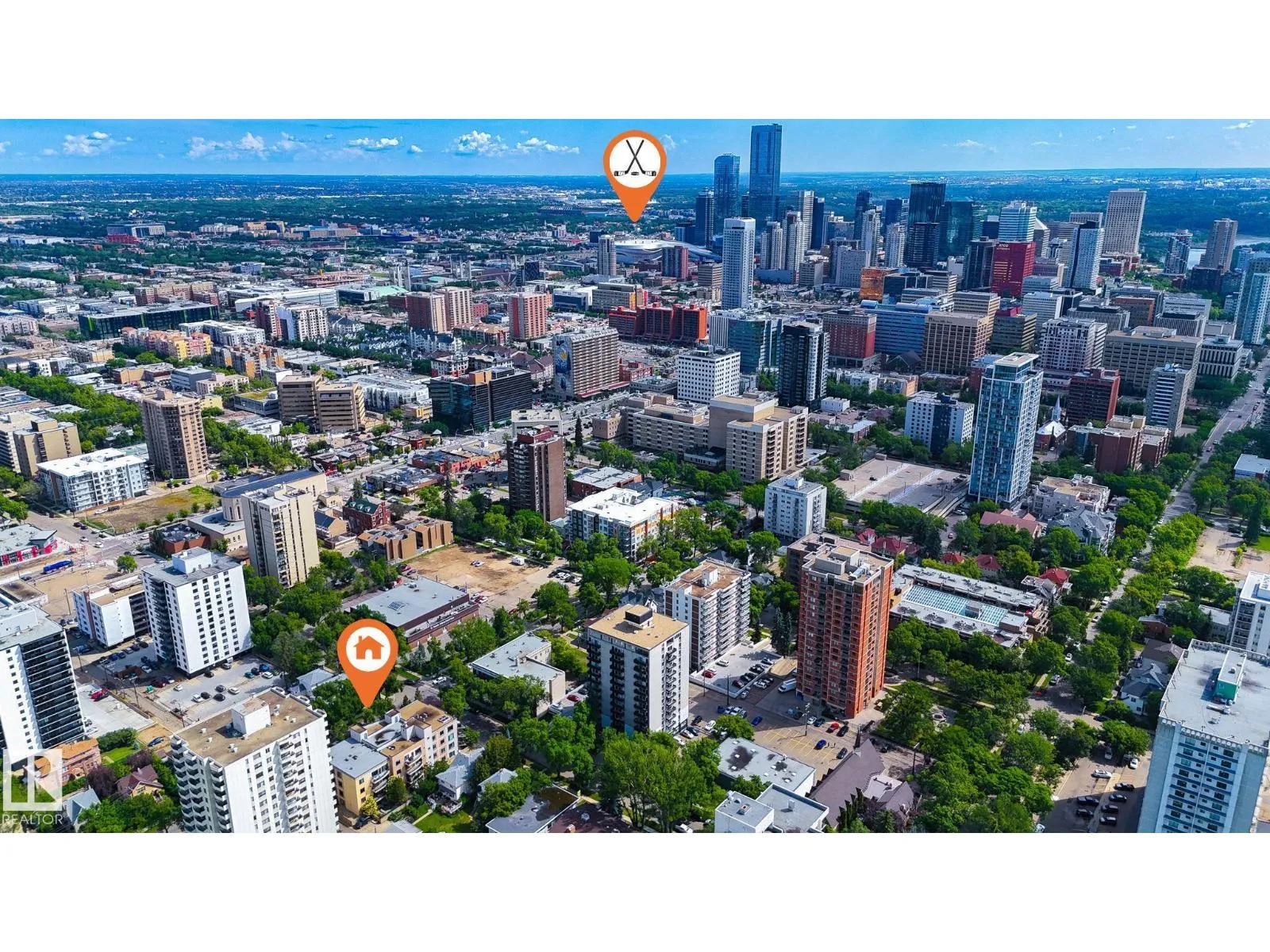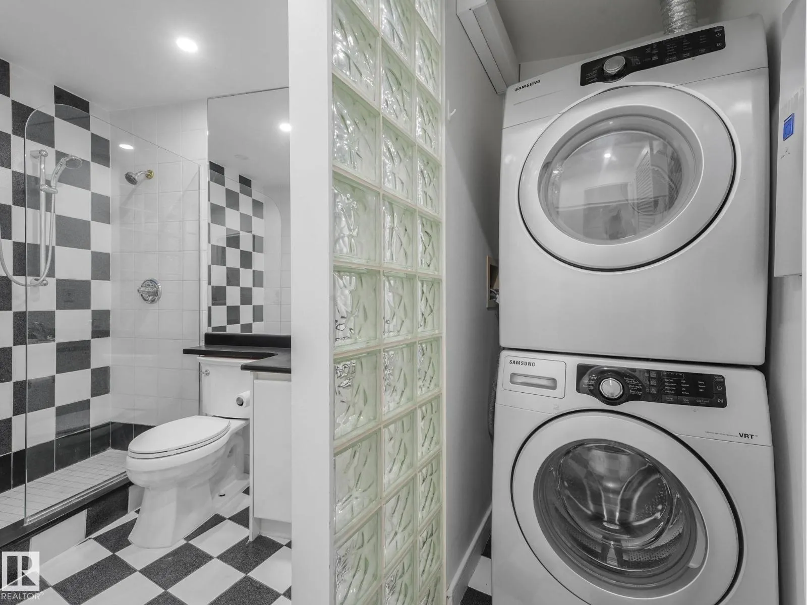 Welcome to The Metropol and this beautifully designed condo, where stylish Art Deco living meets modern comfort. Enjoy open-concept living with a spacious kitchen, dining, and living area, perfect for entertaining or relaxing at home. Enjoy 9â ceilings and a cozy gas fireplace. Step through French doors into the well-sized primary bedroom, featuring two closets and a window that overlooks your own private walled patio. The modern kitchen showcases sleek white lacquer cabinetry, an eating bar, stainless steel appliances, ample storage, and stylish glass block accents. The tiled bathroom is both functional and elegant, while in-suite laundry adds everyday convenience. Step outside to your private 420 ft² patio for gardening, barbecuing, and entertaining. Extras include underground parking, a separate storage locker, and unbeatable access to downtown, shopping, the river valley, and public transit. Stylish, spacious, and steps from everything downtown living has to offer. (id:27476)