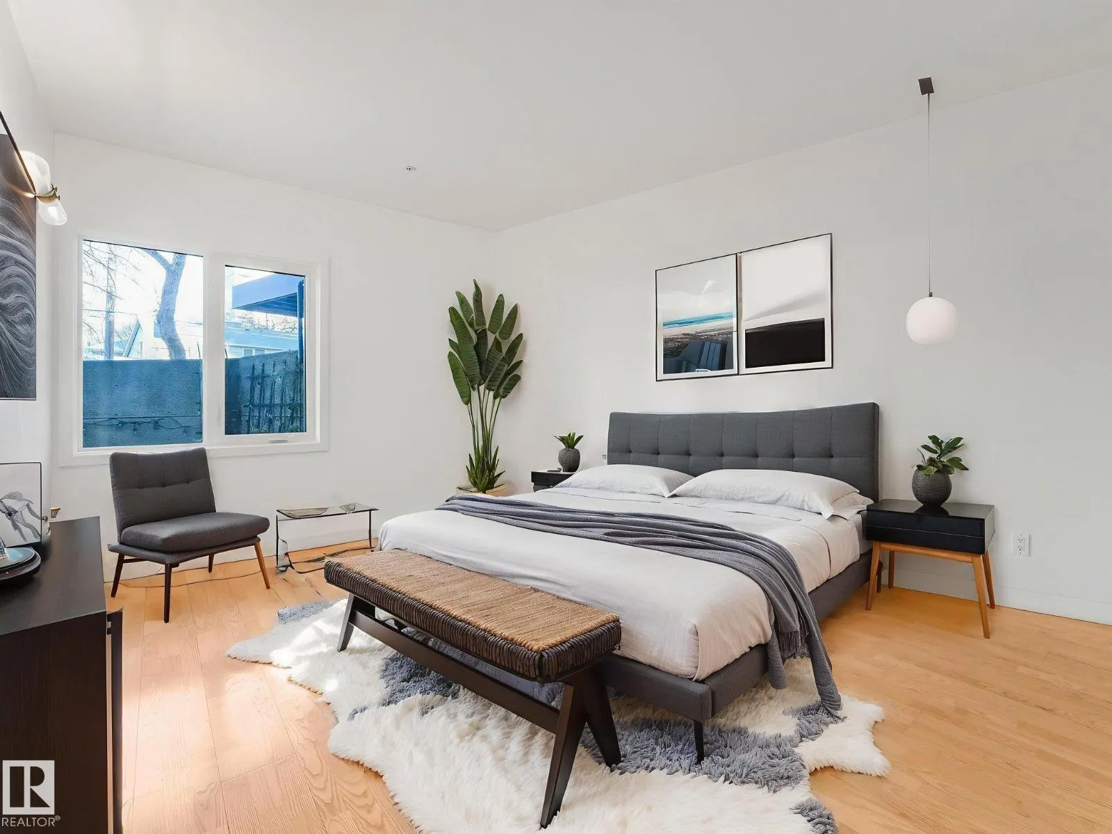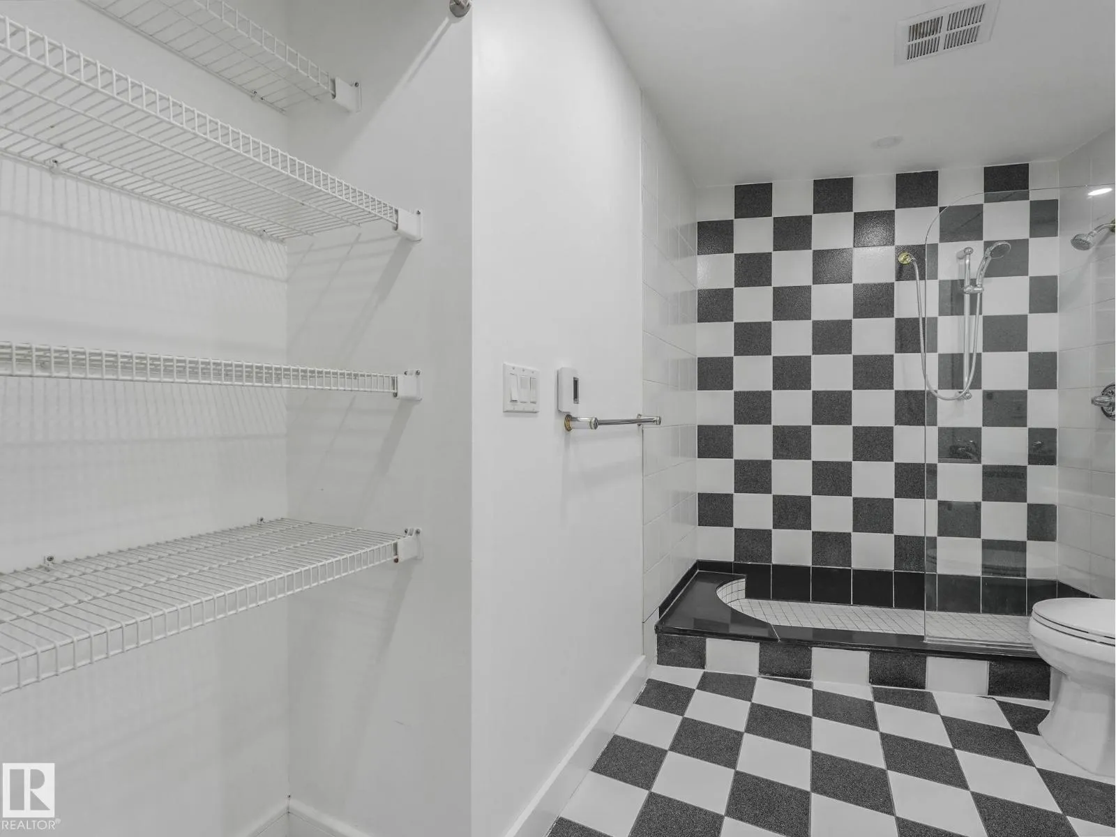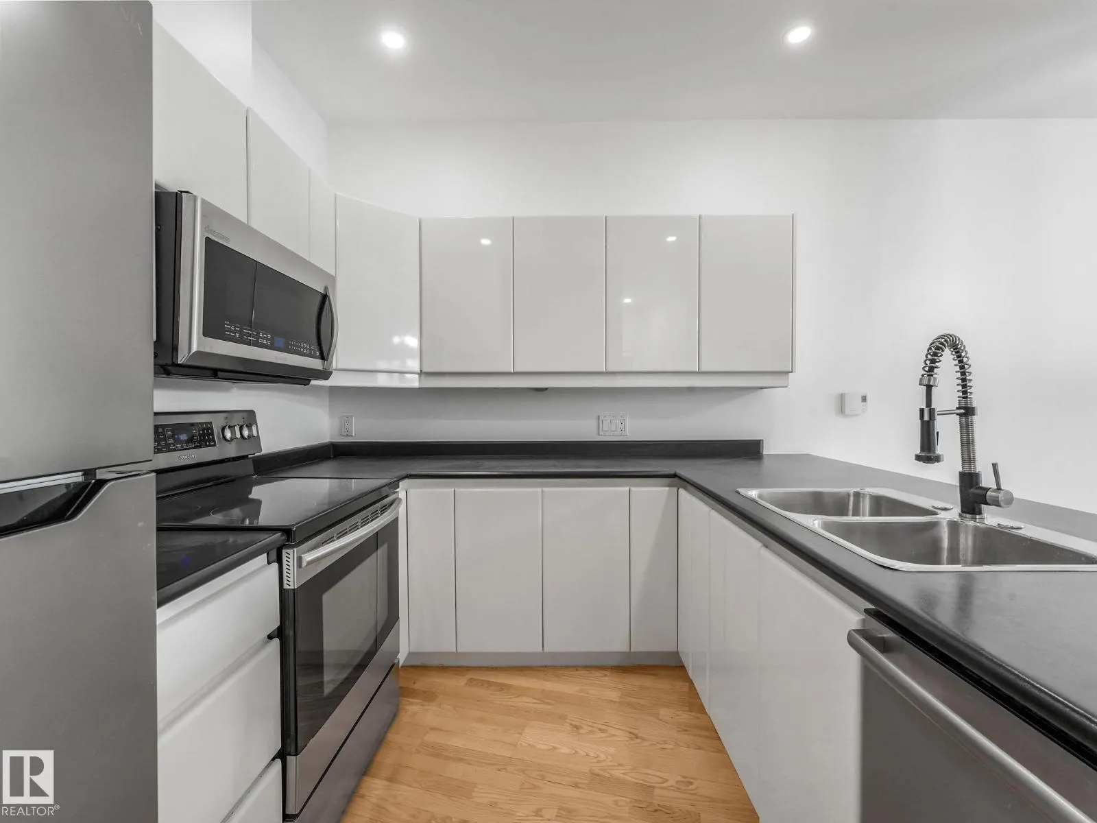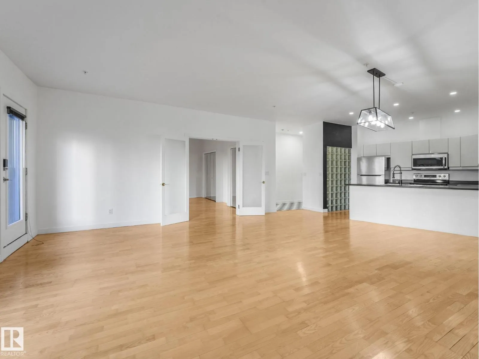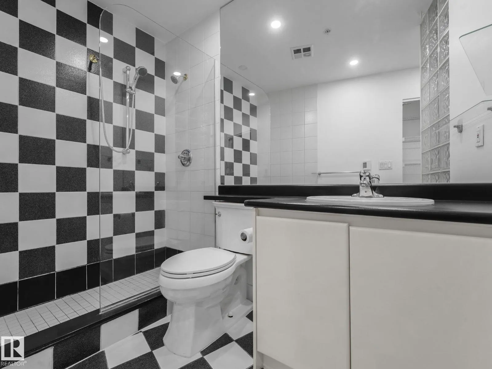 Welcome to The Metropol and this beautifully designed condo, where stylish Art Deco living meets modern comfort. Enjoy open-concept living with a spacious kitchen, dining, and living area, perfect for entertaining or relaxing at home. Enjoy 9â ceilings and a cozy gas fireplace. Step through French doors into the well-sized primary bedroom, featuring two closets and a window that overlooks your own private walled patio. The modern kitchen showcases sleek white lacquer cabinetry, an eating bar, stainless steel appliances, ample storage, and stylish glass block accents. The tiled bathroom is both functional and elegant, while in-suite laundry adds everyday convenience. Step outside to your private 420 ft² patio for gardening, barbecuing, and entertaining. Extras include underground parking, a separate storage locker, and unbeatable access to downtown, shopping, the river valley, and public transit. Stylish, spacious, and steps from everything downtown living has to offer. (id:27476)