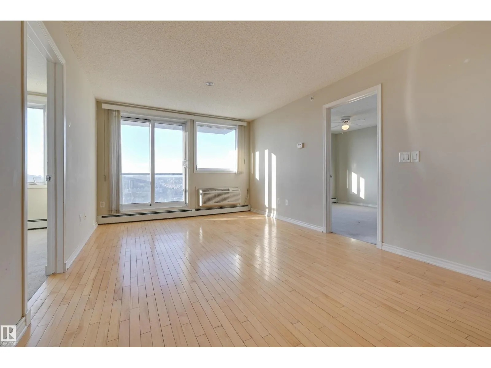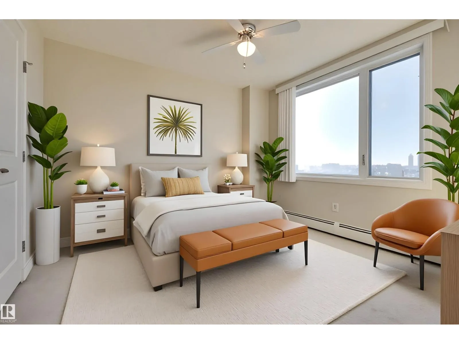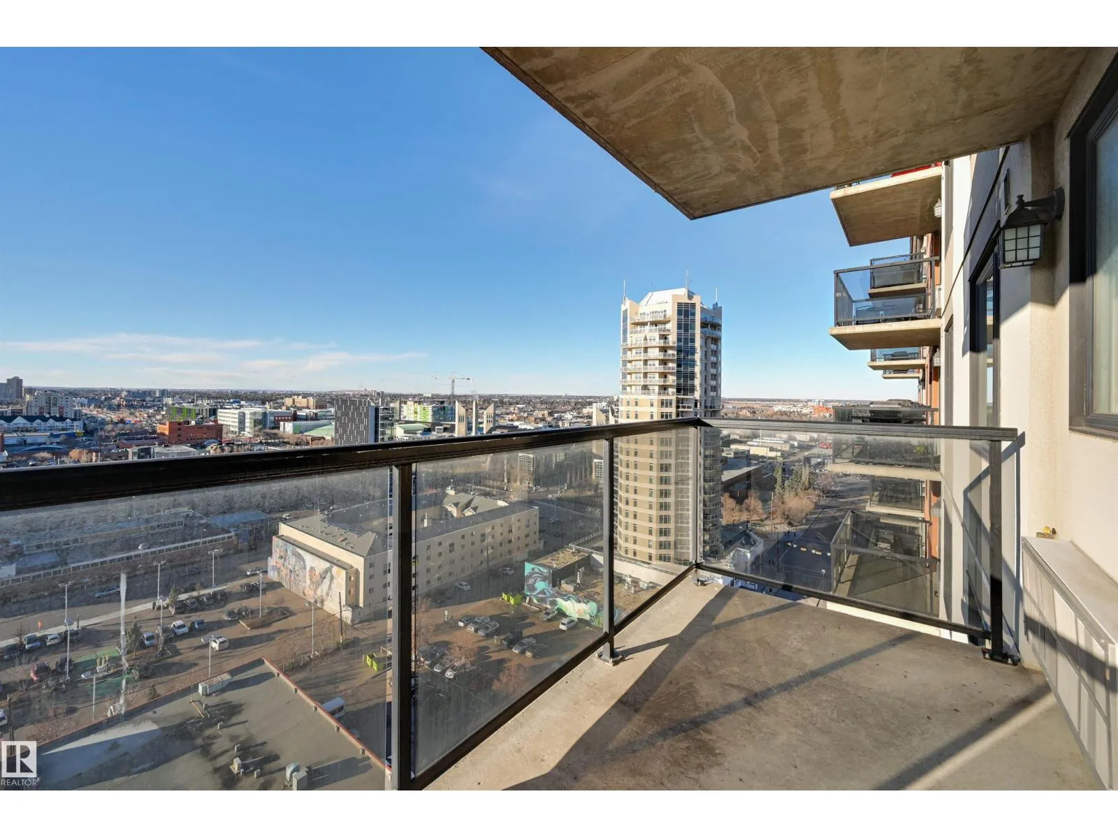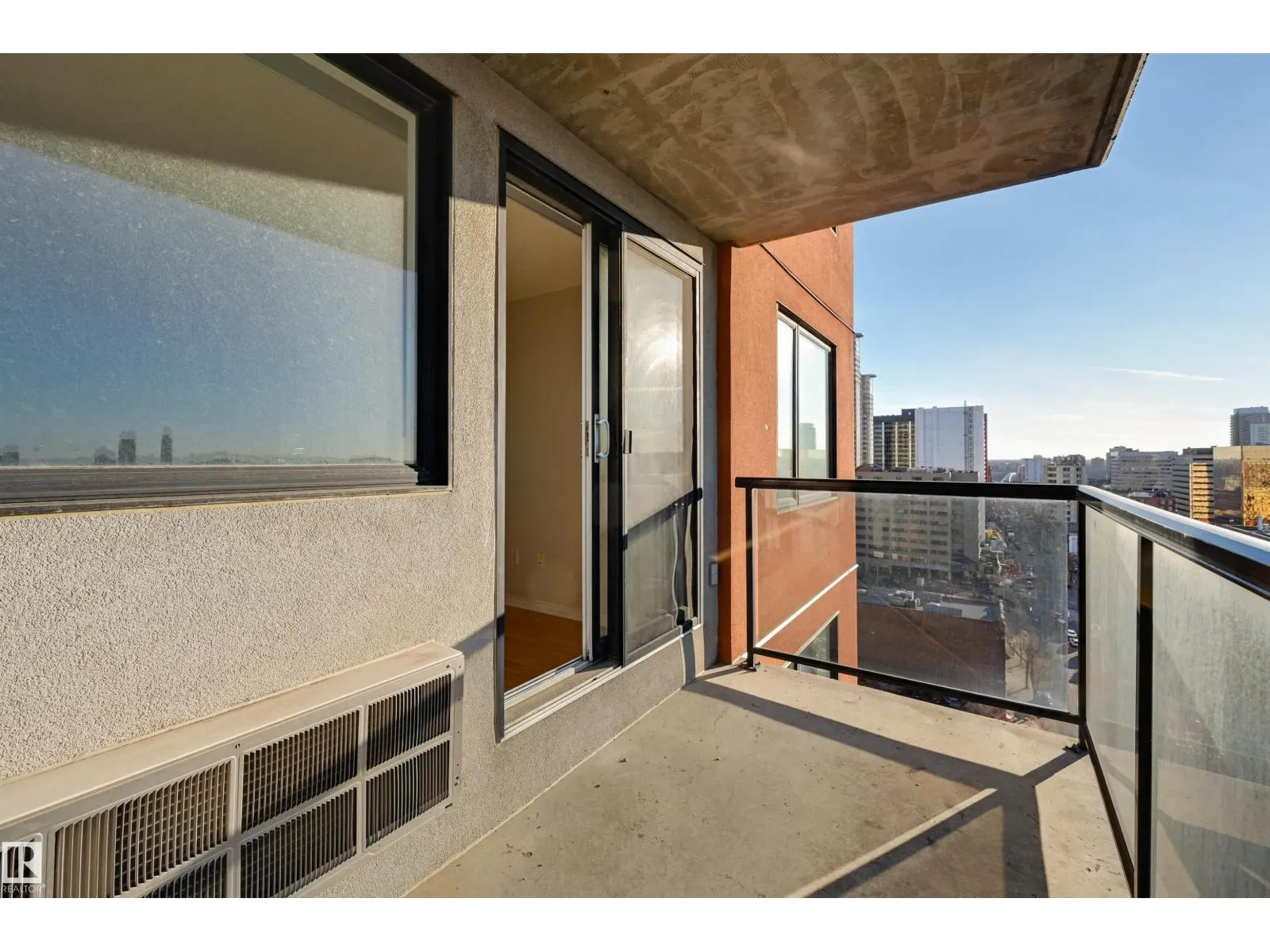 Unobstructed COTY VIEWS from this 2 bedroom SW CORNER UNIT in THE LEGACY. Conveniently located within walking distance of the LRT, MacEwan University, Ice District, shopping, restaurants, coffee shops and quick access to the river valley/walking trails, the Brewery District and the U of A. Lots of natural light with an west facing balcony with stunning views & gas BBQ hookup. Desirable layout with the bedrooms at the opposite ends of the living room. A bonus south facing kitchen window for the corner suite providing natural light to the kitchen & dining spaces. Hardwood floors in the main living space and carpet in the bedrooms. Upgraded with AIR CONDITONING. Stainless steel appliances, insuite laundry (stacking washer/dryer), good size storage room, underground parking #175. The building amenities include an exercise room, bike storage room, two great on site resident managers, and visitor parking. (id:27476)
