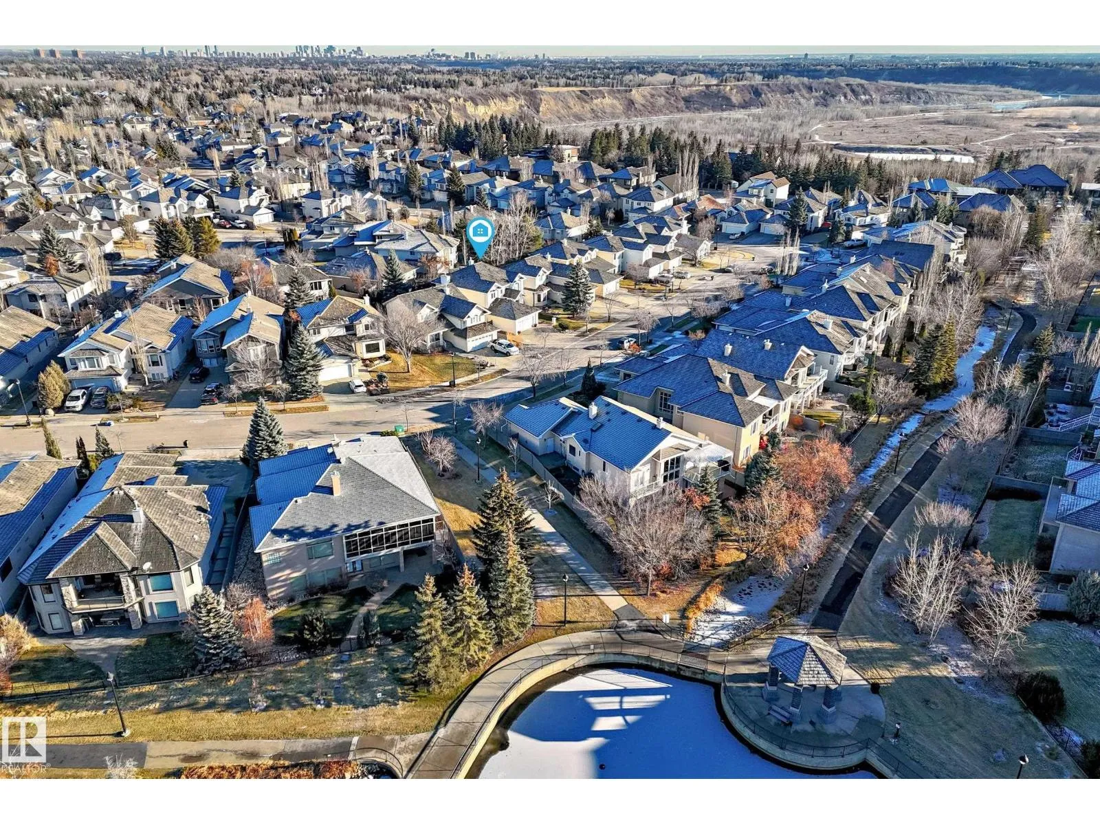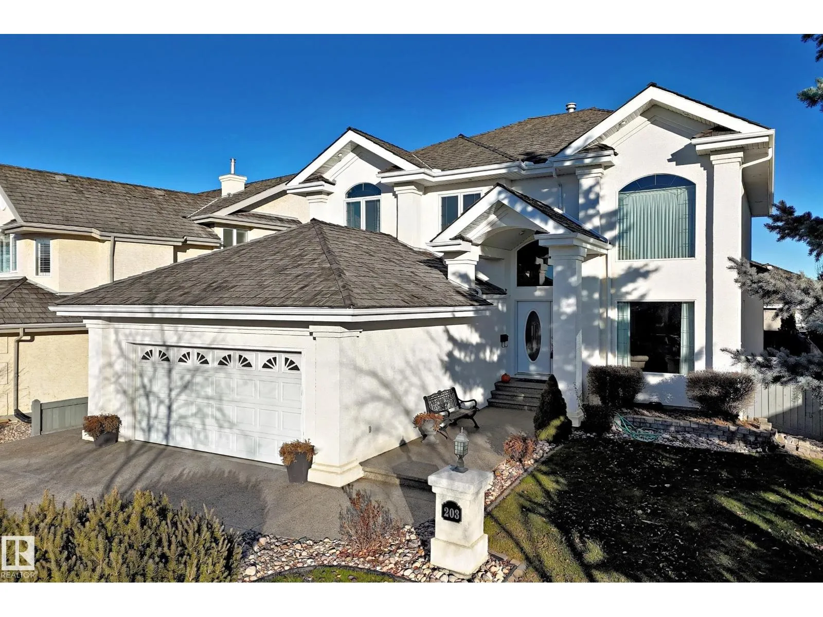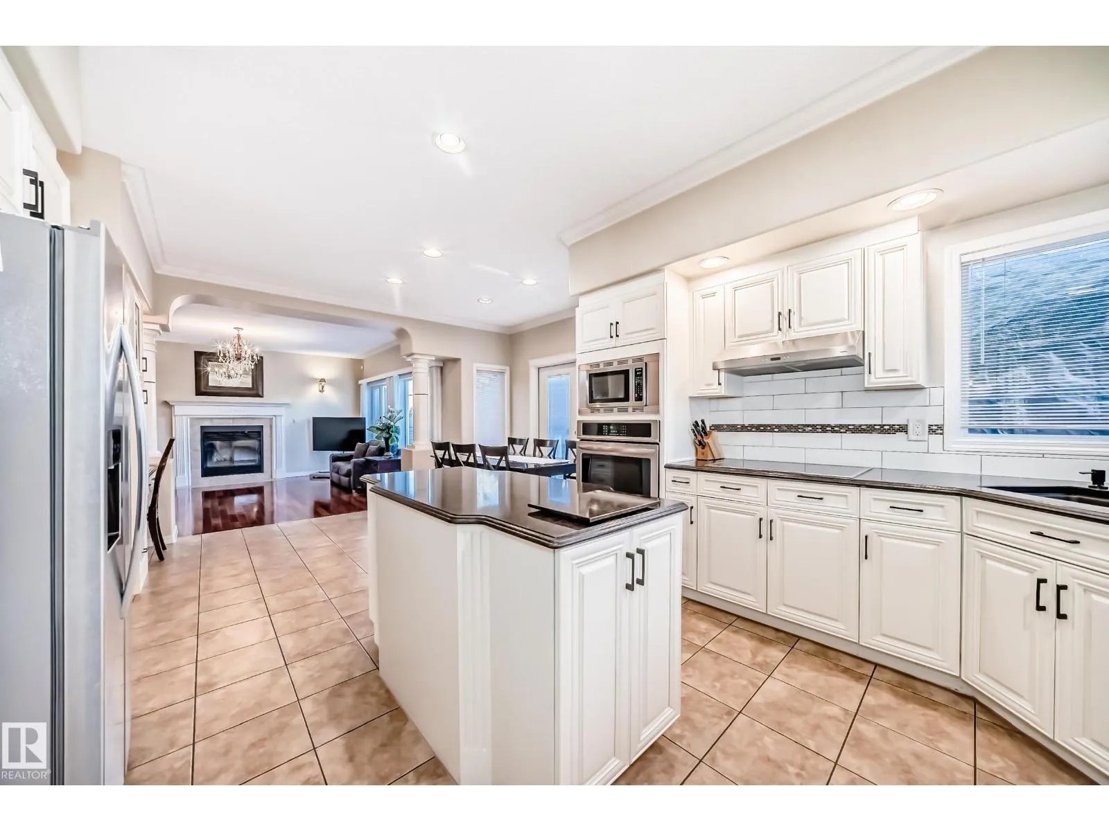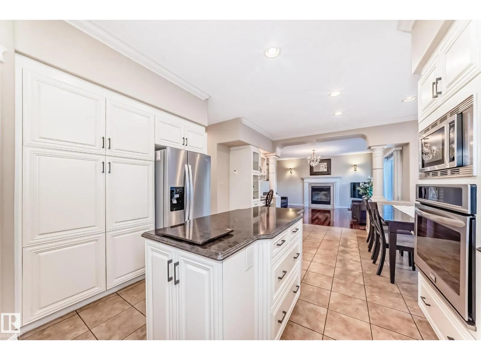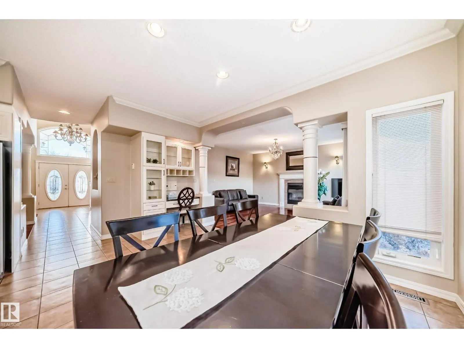 LUXURY EXECUTIVE LIVING in prestigious Donsdale Estates! This stunning 5-bed, 2-storey home offers in-floor heating throughout, dual A/C units and furnaces for exceptional temperature control, plus an irrigation systemâperfect for a large family. A grand double-door entrance opens to soaring cathedral ceilings and an elegant living room with massive windows, flowing into the formal dining room. The gourmet kitchen features high-end white cabinetry, quartz counters, pantry and island, with a bright breakfast nook overlooking the cozy family room with fireplace. The main floor also includes a den/office, laundry and bath. Upstairs, enjoy a gorgeous primary suite with spa-like 5-pc ensuite, plus two additional bedrooms and full bath. The finished basement adds a spacious family room, two bedrooms, full bath and ample storage. Beautifully landscaped yard with cedar roof, maintenance-free deck, glass railings, fencing and paved path. Steps to the pond, gazebo and scenic walking trailsâWelcome Home! (id:27476)
