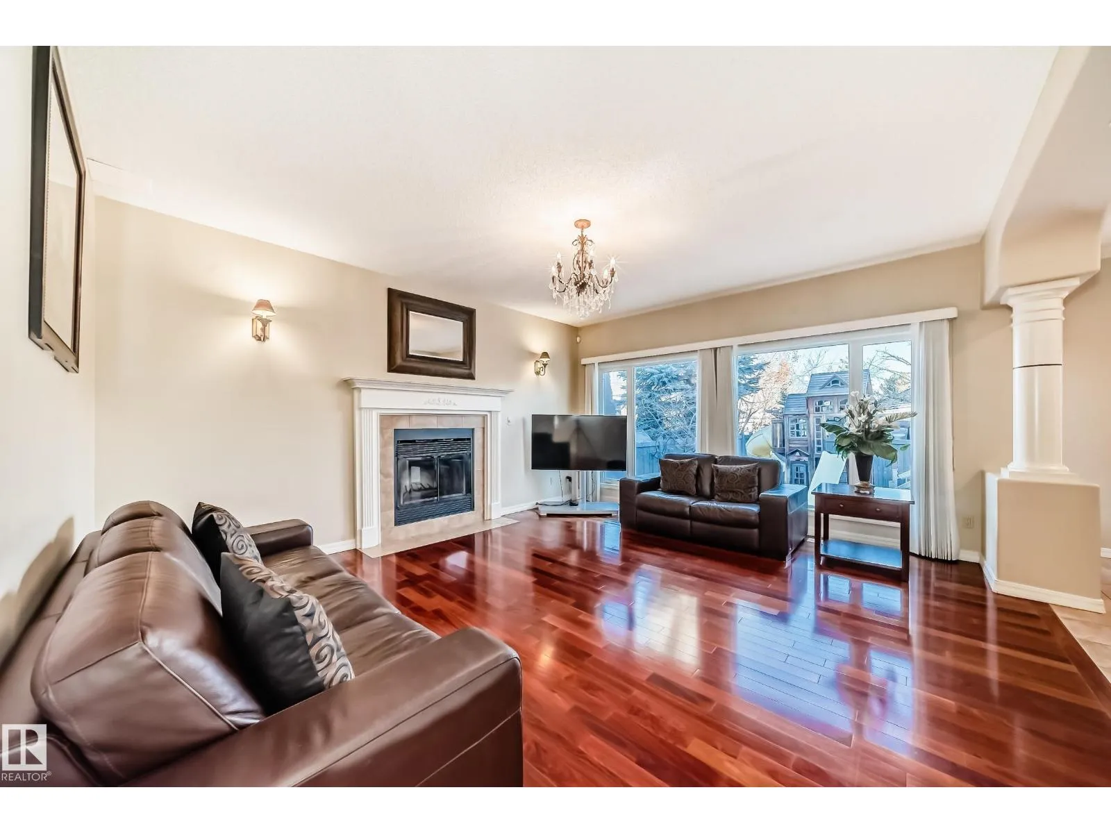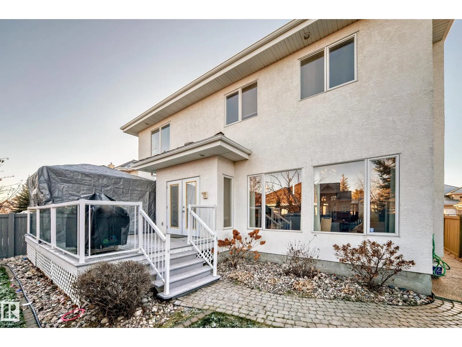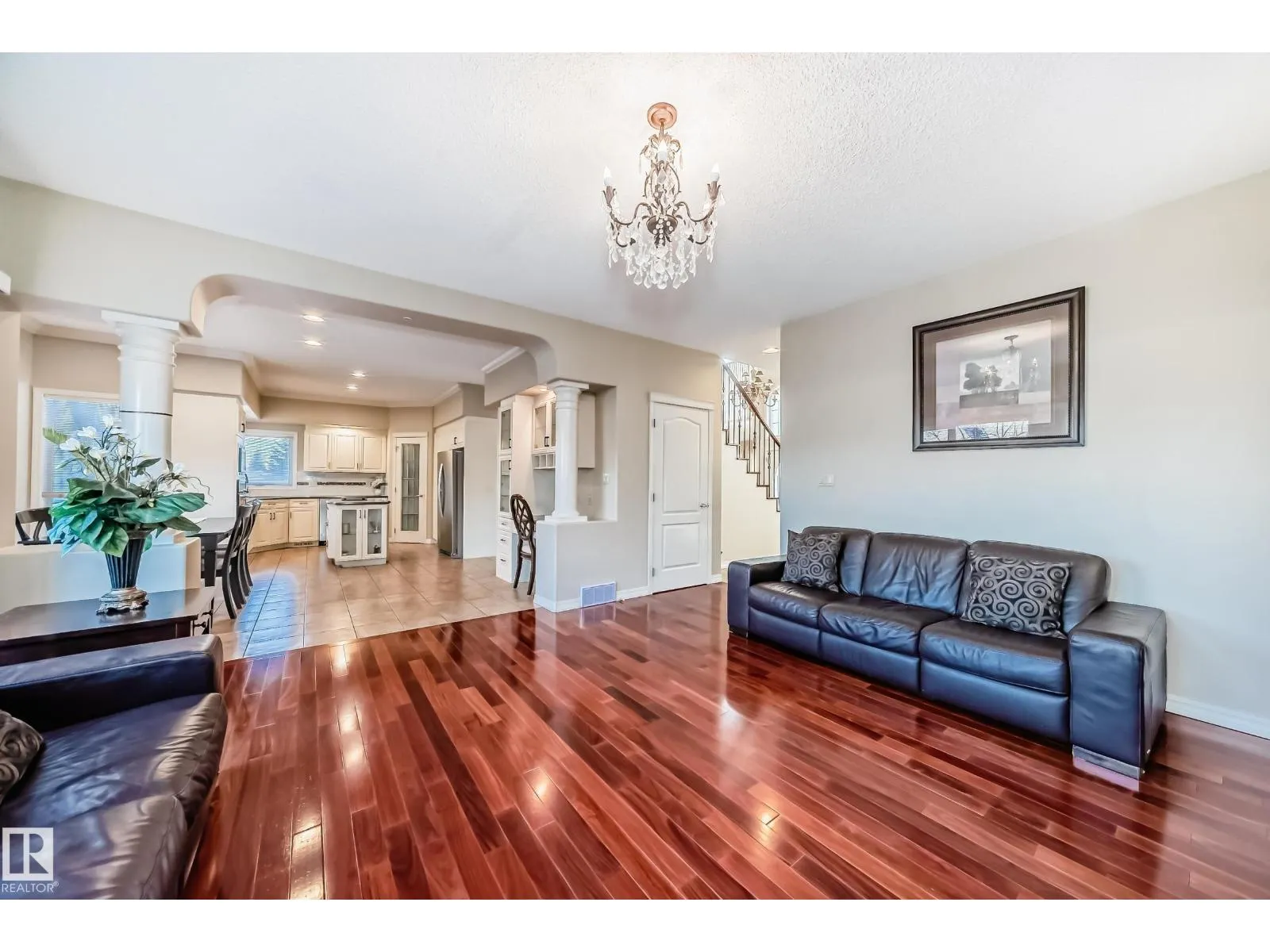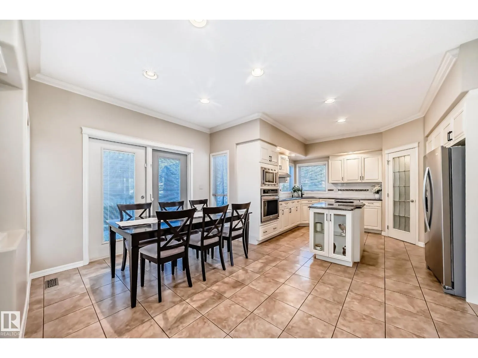 LUXURY EXECUTIVE LIVING in prestigious Donsdale Estates! This stunning 5-bed, 2-storey home offers in-floor heating throughout, dual A/C units and furnaces for exceptional temperature control, plus an irrigation systemâperfect for a large family. A grand double-door entrance opens to soaring cathedral ceilings and an elegant living room with massive windows, flowing into the formal dining room. The gourmet kitchen features high-end white cabinetry, quartz counters, pantry and island, with a bright breakfast nook overlooking the cozy family room with fireplace. The main floor also includes a den/office, laundry and bath. Upstairs, enjoy a gorgeous primary suite with spa-like 5-pc ensuite, plus two additional bedrooms and full bath. The finished basement adds a spacious family room, two bedrooms, full bath and ample storage. Beautifully landscaped yard with cedar roof, maintenance-free deck, glass railings, fencing and paved path. Steps to the pond, gazebo and scenic walking trailsâWelcome Home! (id:27476)
