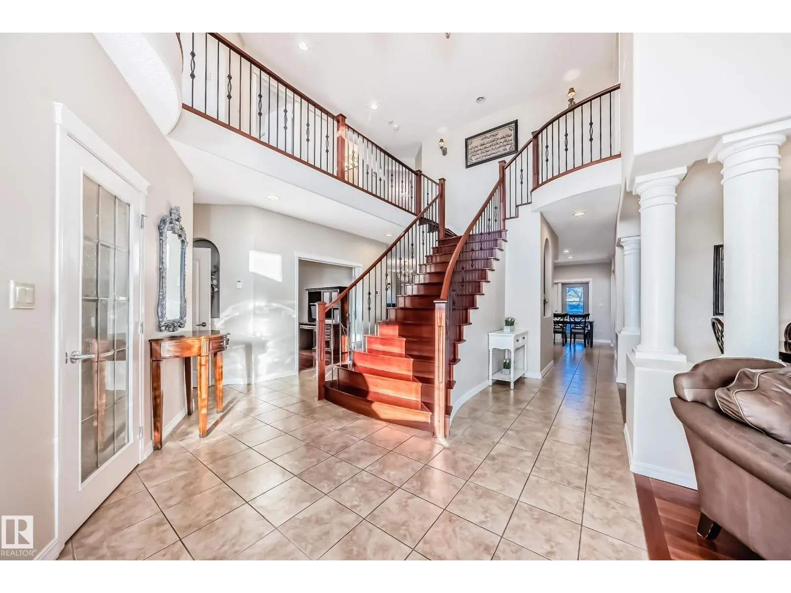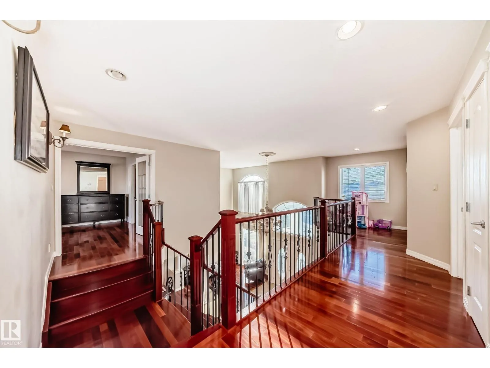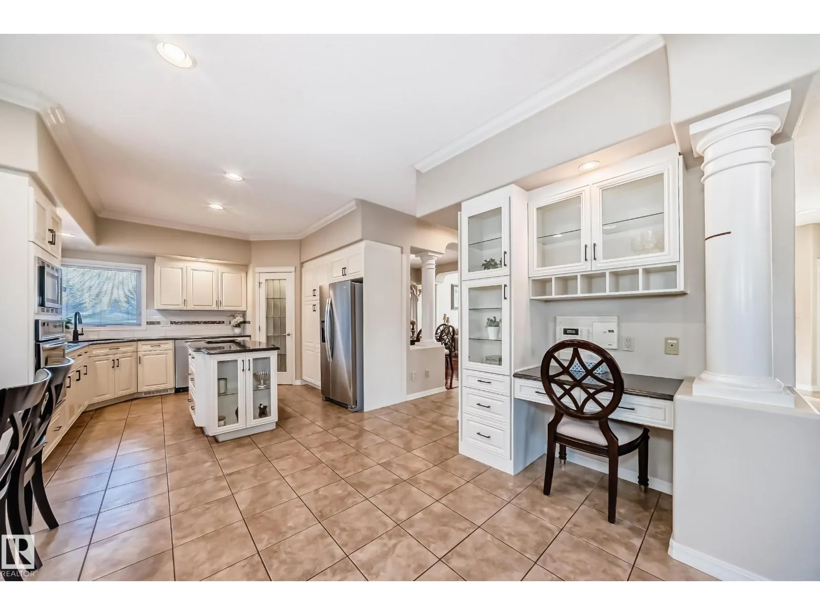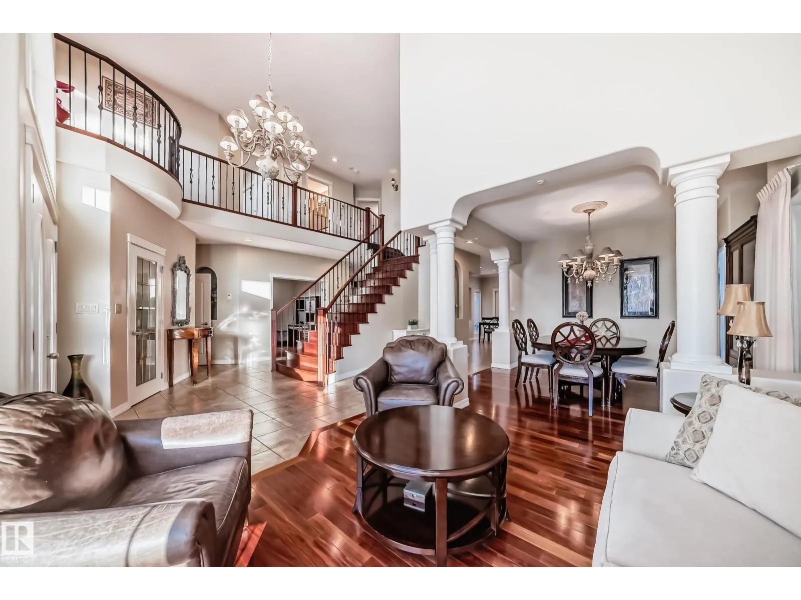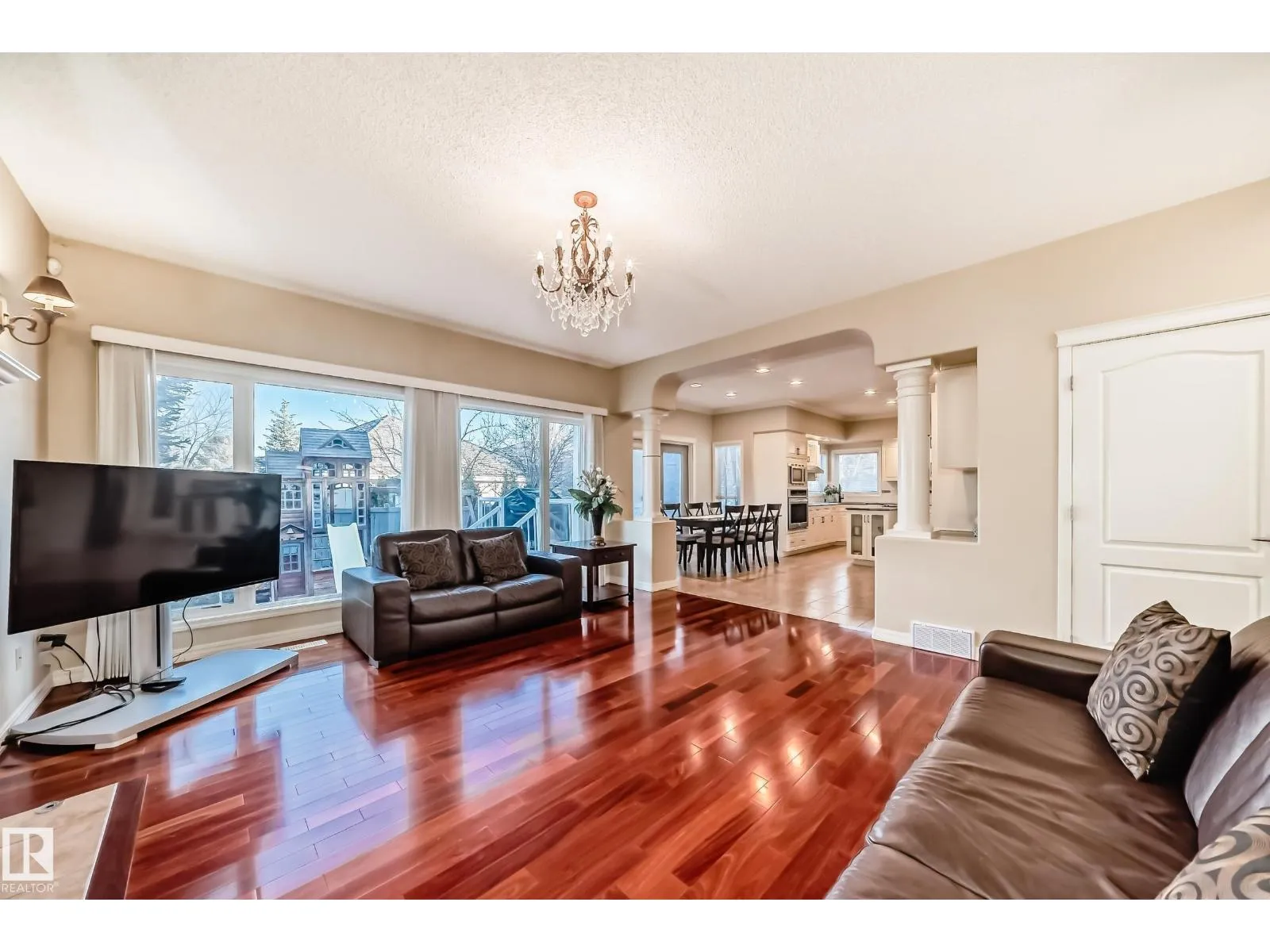 LUXURY EXECUTIVE LIVING in prestigious Donsdale Estates! This stunning 5-bed, 2-storey home offers in-floor heating throughout, dual A/C units and furnaces for exceptional temperature control, plus an irrigation systemâperfect for a large family. A grand double-door entrance opens to soaring cathedral ceilings and an elegant living room with massive windows, flowing into the formal dining room. The gourmet kitchen features high-end white cabinetry, quartz counters, pantry and island, with a bright breakfast nook overlooking the cozy family room with fireplace. The main floor also includes a den/office, laundry and bath. Upstairs, enjoy a gorgeous primary suite with spa-like 5-pc ensuite, plus two additional bedrooms and full bath. The finished basement adds a spacious family room, two bedrooms, full bath and ample storage. Beautifully landscaped yard with cedar roof, maintenance-free deck, glass railings, fencing and paved path. Steps to the pond, gazebo and scenic walking trailsâWelcome Home! (id:27476)