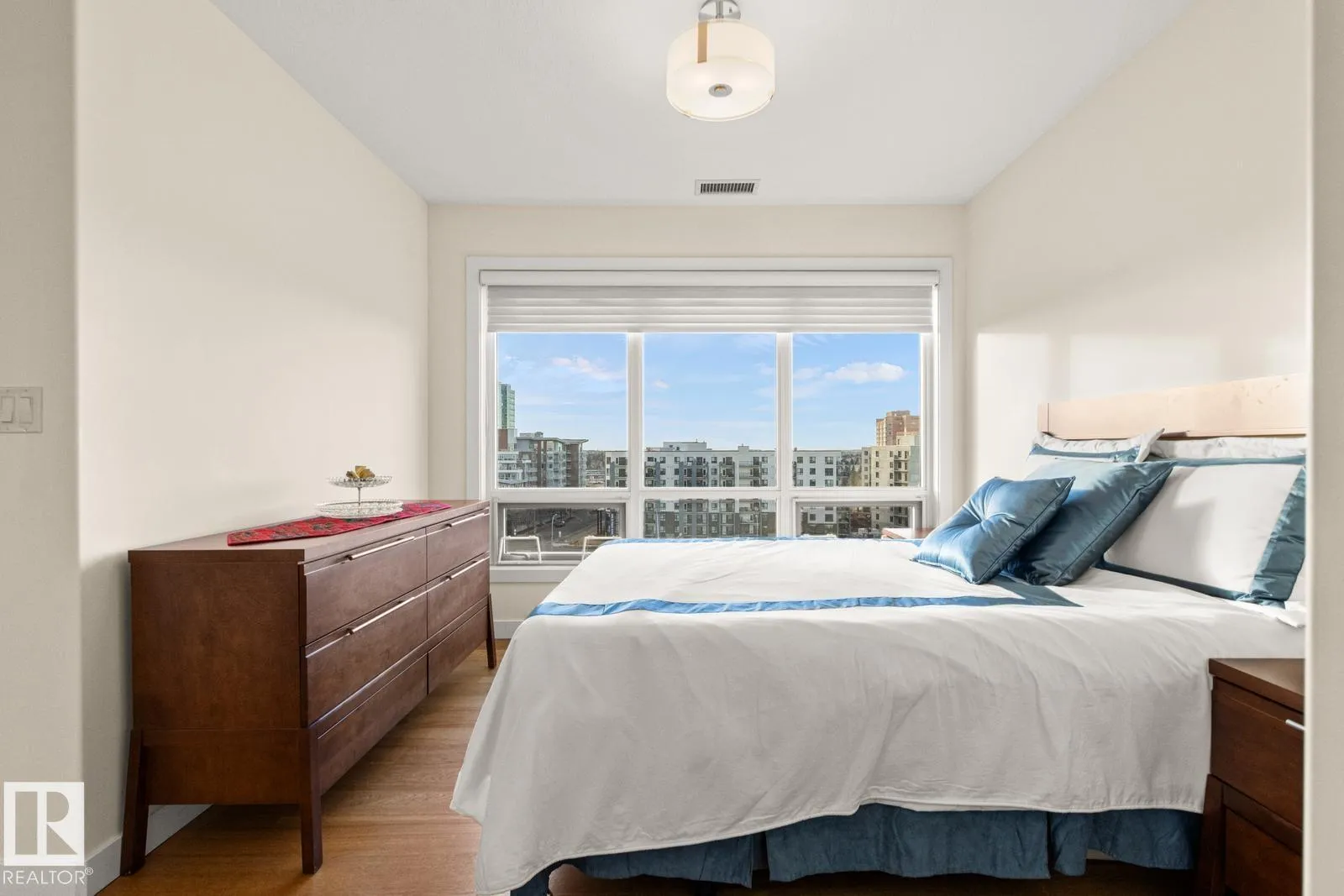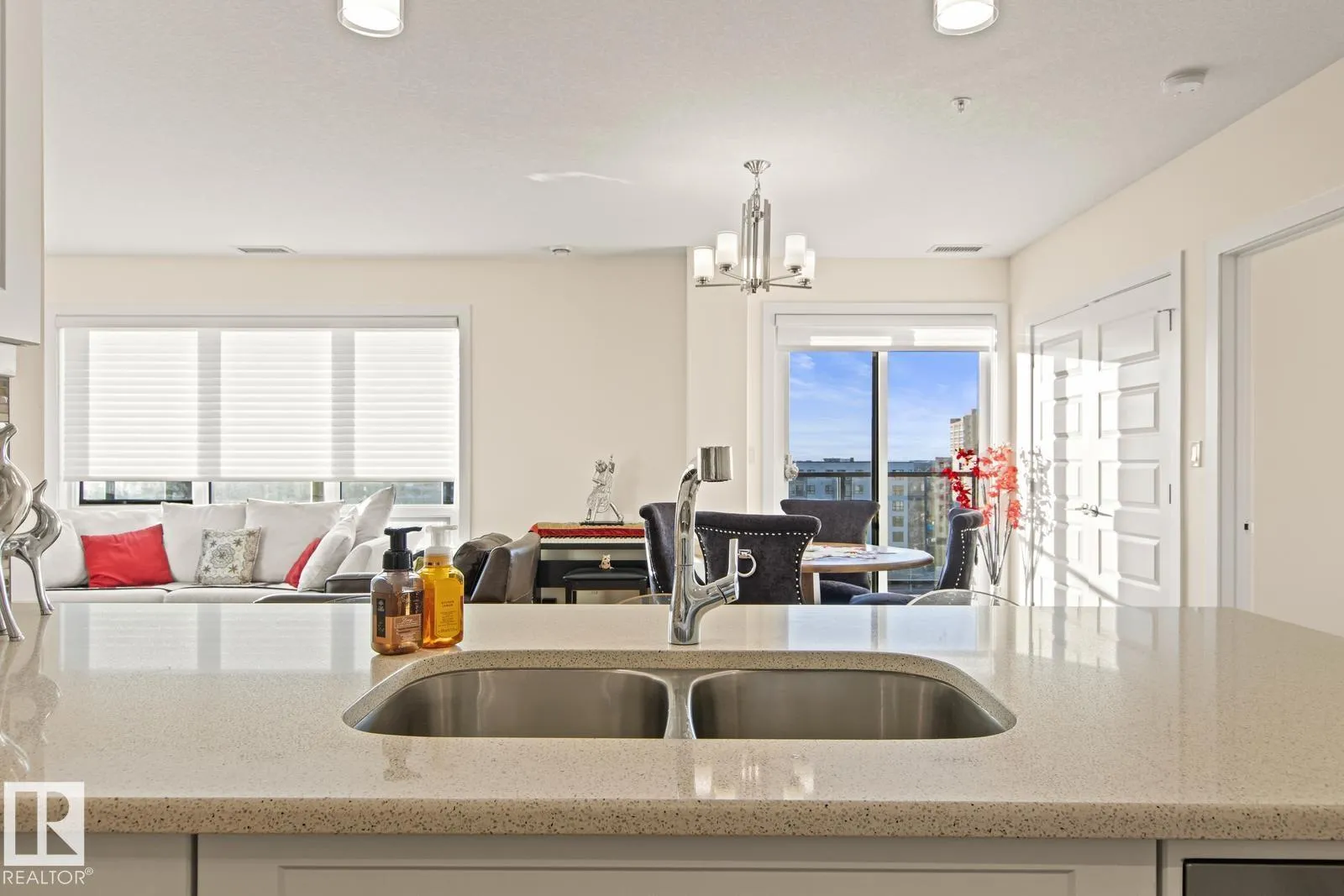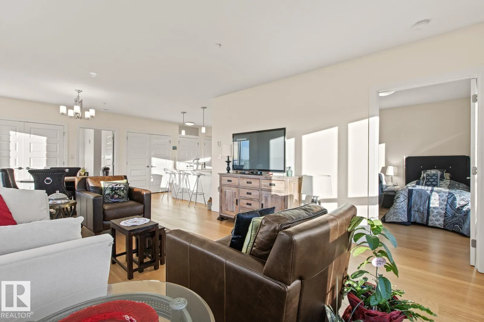 Amazing Opportunity in this ADULT Community! Incredible VIEWS from this SW corner unit - enjoy sunsets from the expansive windows in every room. Not only does this unit offer 2 bedrooms both w/ ensuite bathrooms. Open concept kitchen, dining & living spaces offers something for everyone. Kitchen boasts white cabinetry, QUARTZ counters, eat-up bar, undercabinet lighting & SS appliances. Primary Bedroom Suite offers generous walk-through closet & spacious ensuite w/ separate WALK-IN shower, low-rise tub, HEATED TILE FLOORS & lg. vanity w/ quartz counters. Engineered wood floors throughout for ease of cleaning, IN-SUITE LAUNDRY, A/C, gas BBQ hookup are a few more thoughtful features. Unit has only had 1 occupant & has been lightly lived in & meticulously maintained. Some appliances are still in brand new state. Included w/ this unit comes 1 titled UNDERGROUND parking stall, an additional outdoor stall just outside entrance PLUS a titled STORAGE unit. Bldg offers restaurant, hair salon & active social room. (id:27476)
