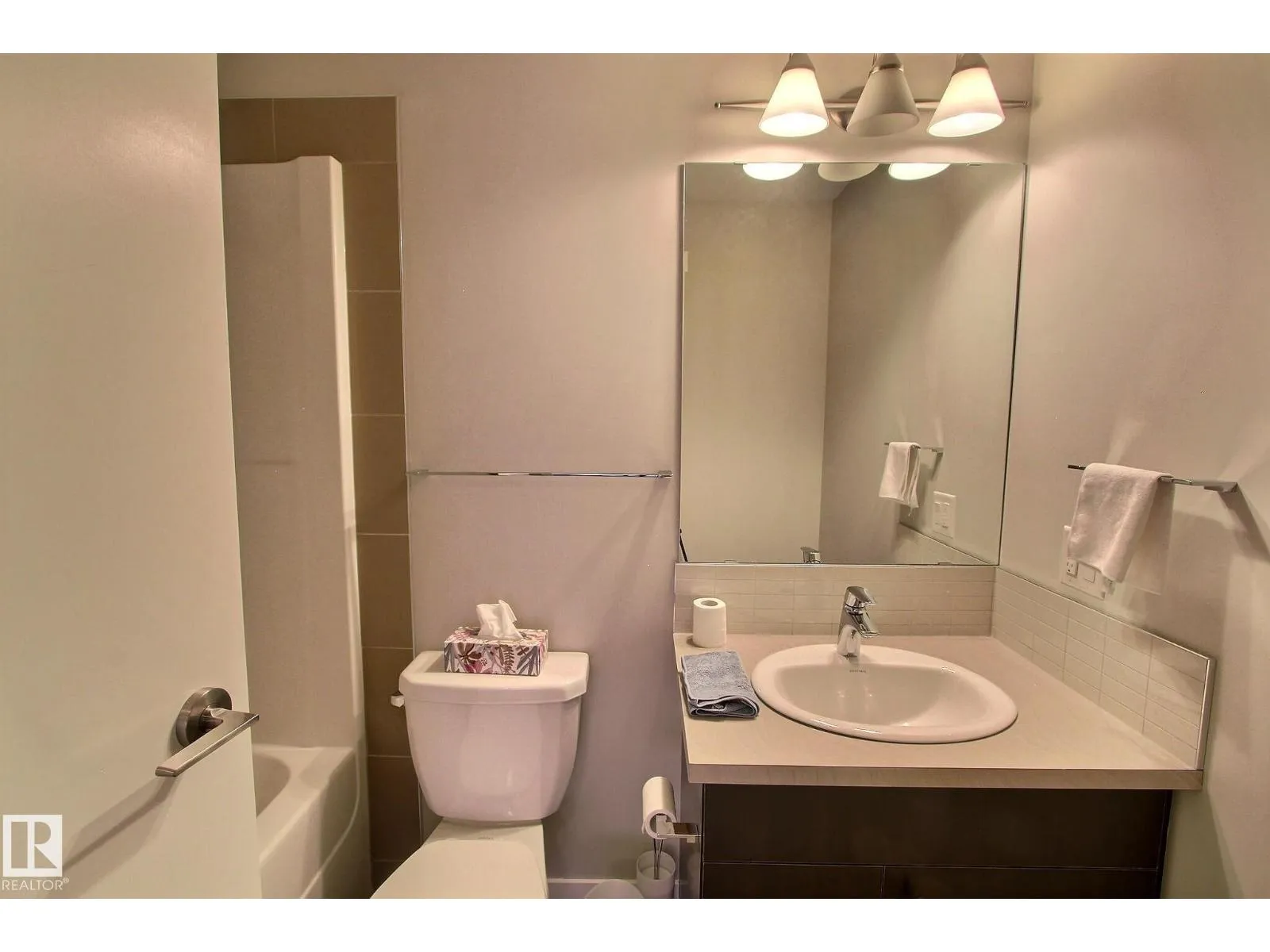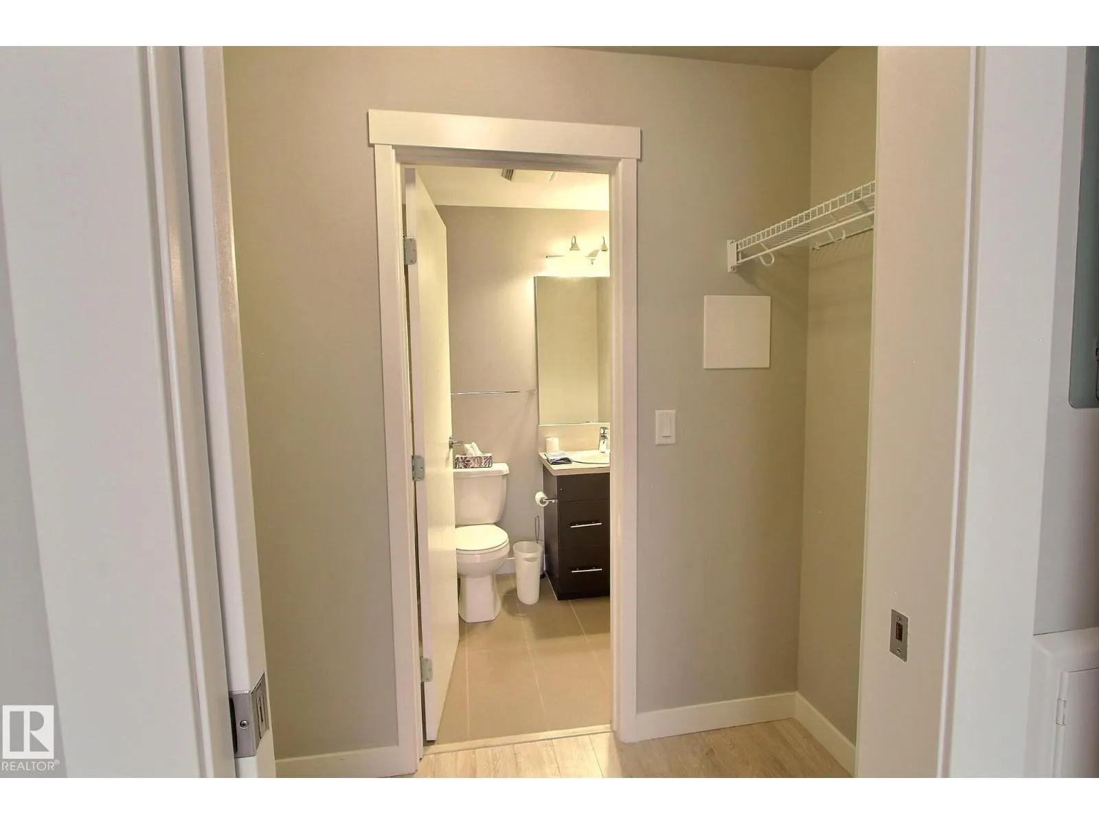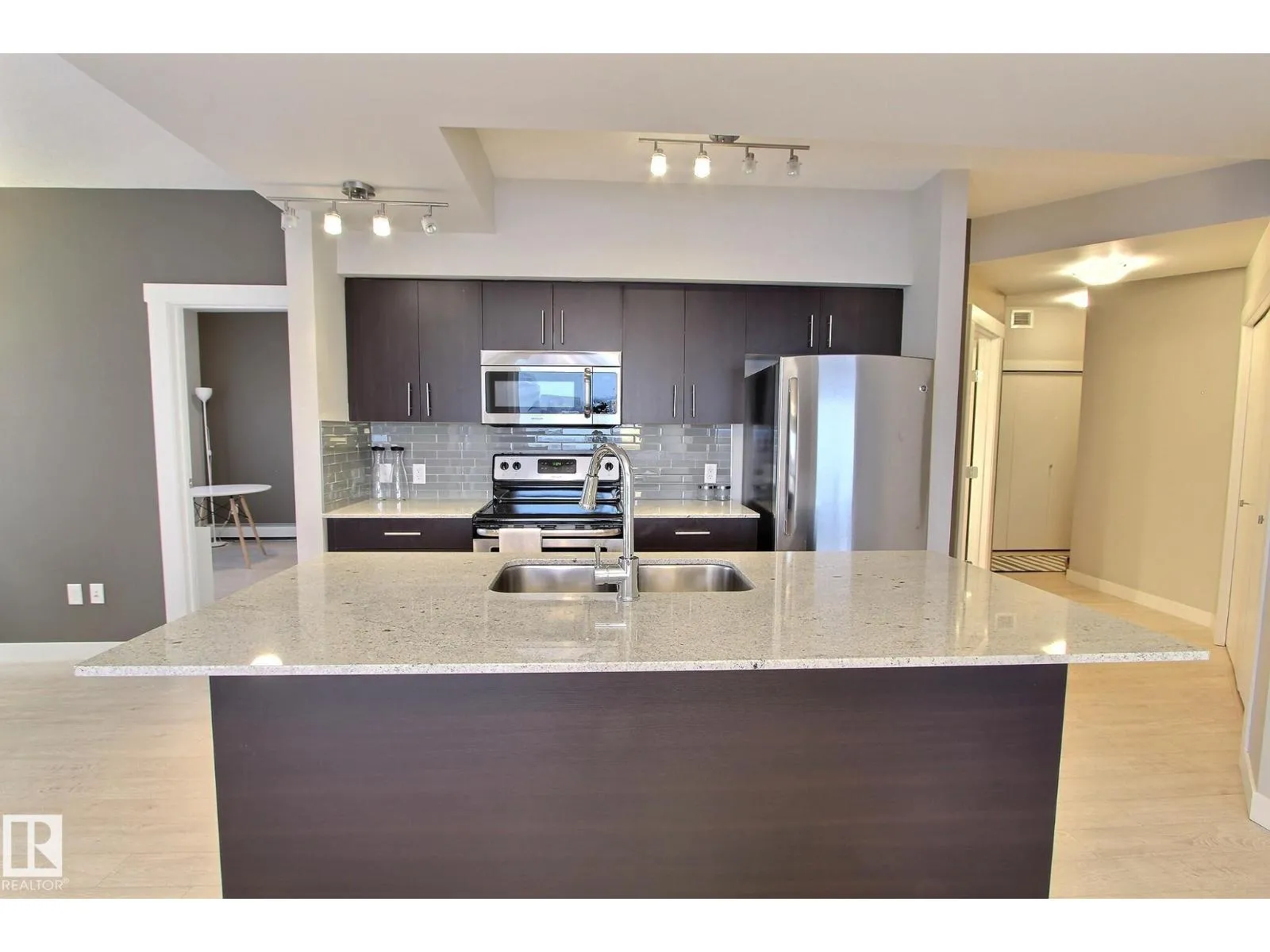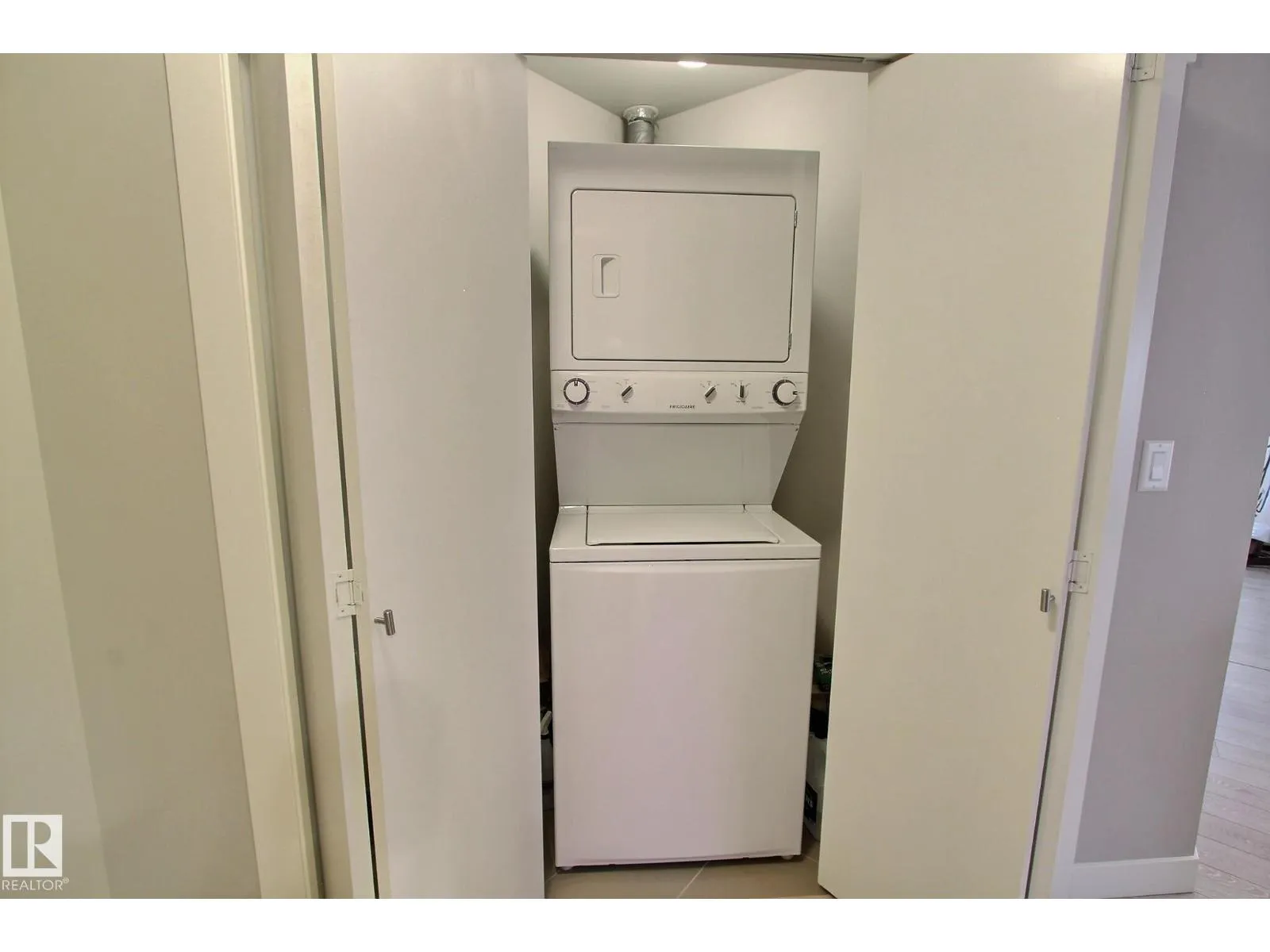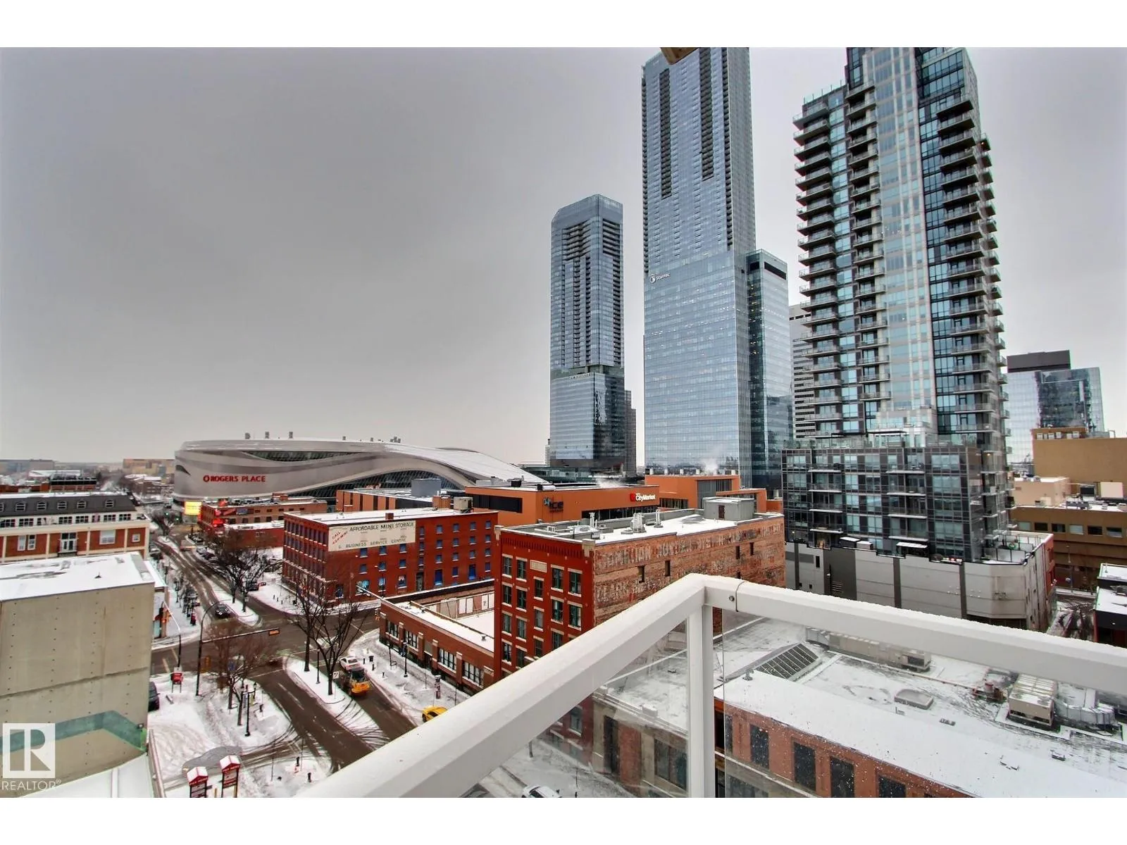 This 8th floor unit is in IMMACULATE condition. Featuring north and west views, in suite laundry, titled parking, and titled storage. Located on vibrant 104 Street, near Rogers Place and the Ice District - walking distance to a plethora of bars, restaurants and entertainment venues. This condo has been used as an office space, and as such has never been regularly occupied - the appliances and finishings are in like new condition. The main living space is open to the dining room and kitchen, perfect for entertaining. The kitchen features granite counters, stainless appliances and a centre island with room for barstools. The primary suite has a walkthrough closet to a full ensuite. The second bedroom and full bathroom are located on the other side of the condo, great for privacy. There are also custom double layer Hunter Douglas blinds with a blackout option. This home is a MUST SEE! (id:27476)