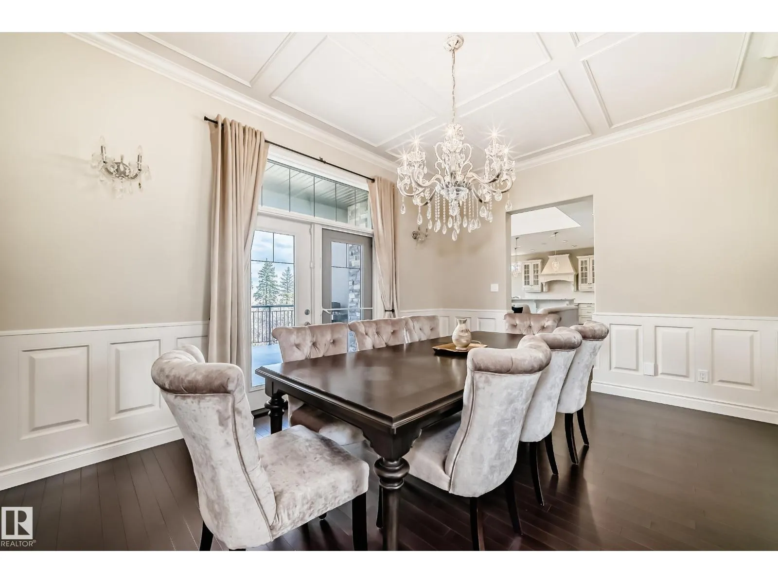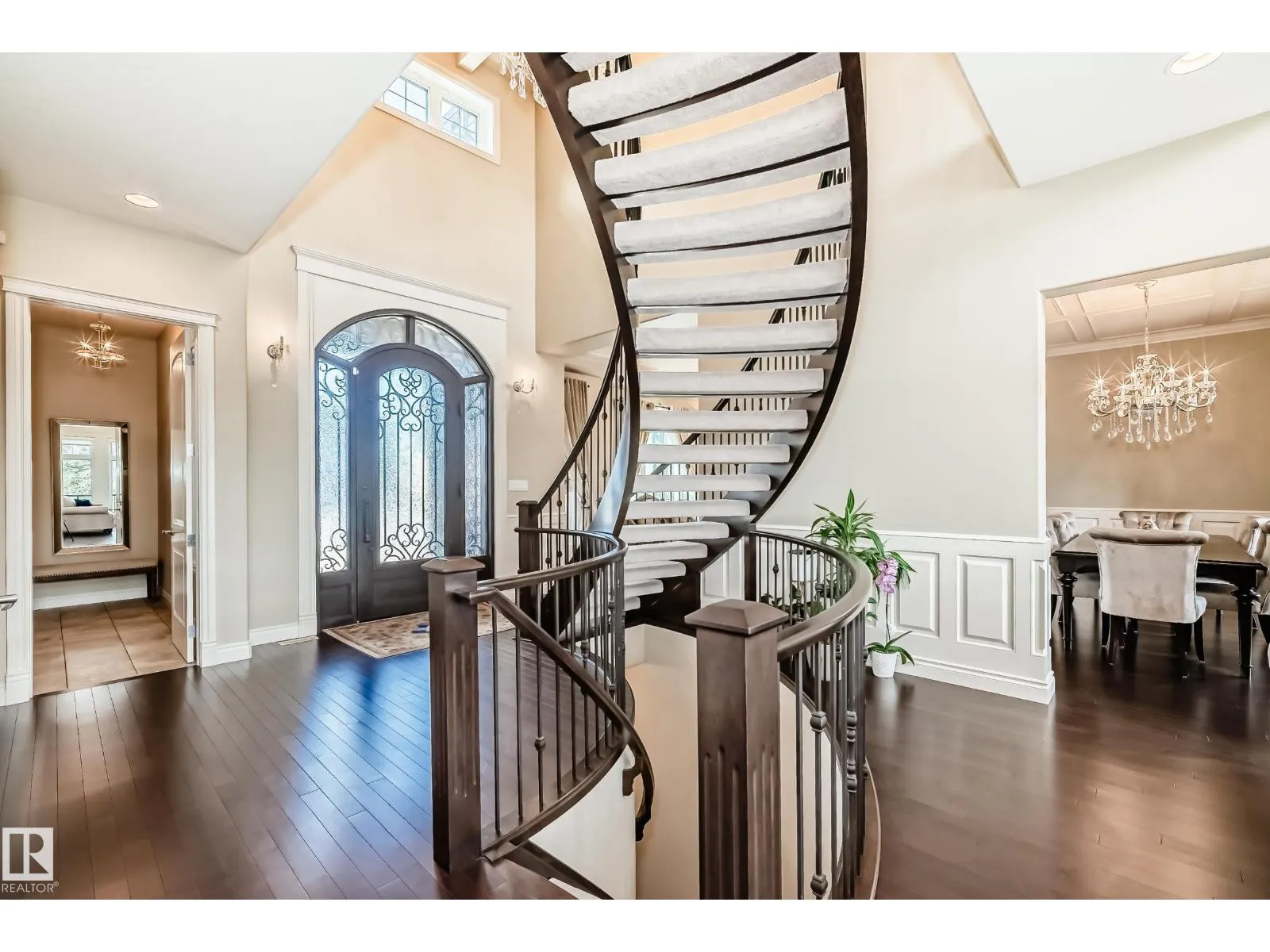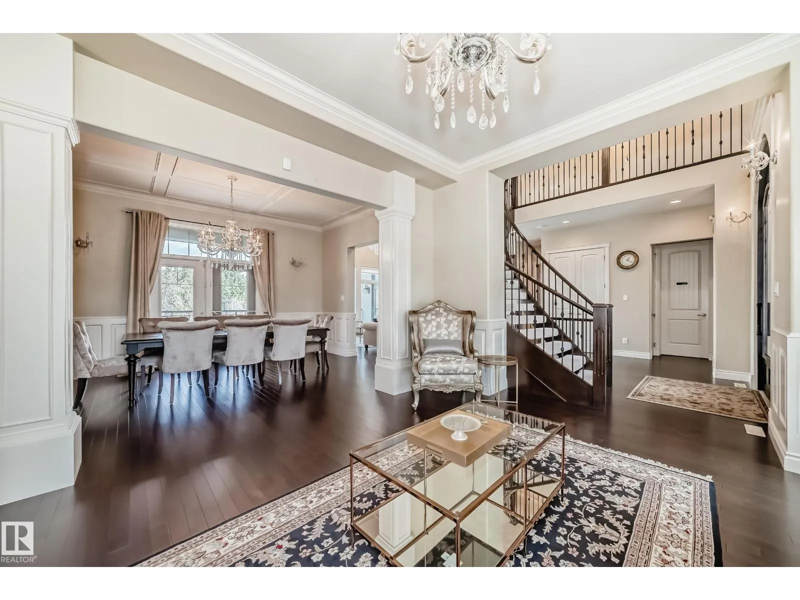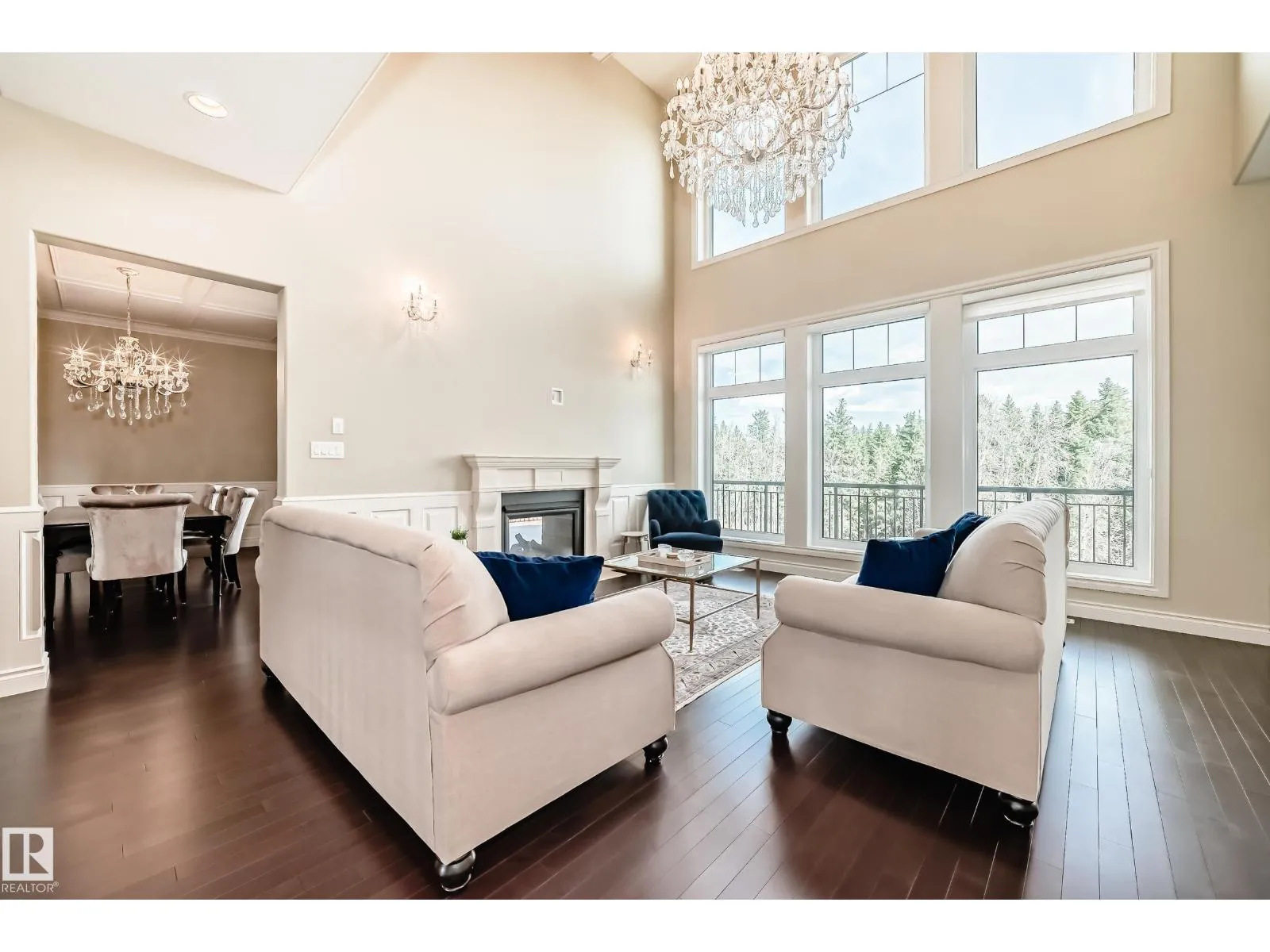 Experience refined luxury in this one-of-a-kind estate on a private walkout ravine lot in Jaguar Ridge, custom-built by Carriage Homes. This elegant residence offers 3 living areas, 3 dining areas, 4 bedrooms, 5 bathrooms, and an oversized heated triple garage. A grand entrance with 19-ft ceilings, a curved staircase, natural light, and hardwood flooring leads to a greeting room, formal dining, and an open-to-above great room. The chefâs kitchen connects to a full dining area with access to the covered deck and a dual-sided fireplace overlooking nature. The main floor includes a bedroom with a 3-pc ensuite. Upstairs features a bonus room, a spacious primary suite with private balcony, 5-pc spa ensuite, and dressing room, plus two additional bedrooms with ensuites. The walkout basement, with three entrances, 9-ft ceilings, rough-ins, and a planned two-sided fireplace, is ready for development. Stunning chandeliers and detailed wainscoting elevate this homeâs timeless elegance. Made for classy living! (id:27476)