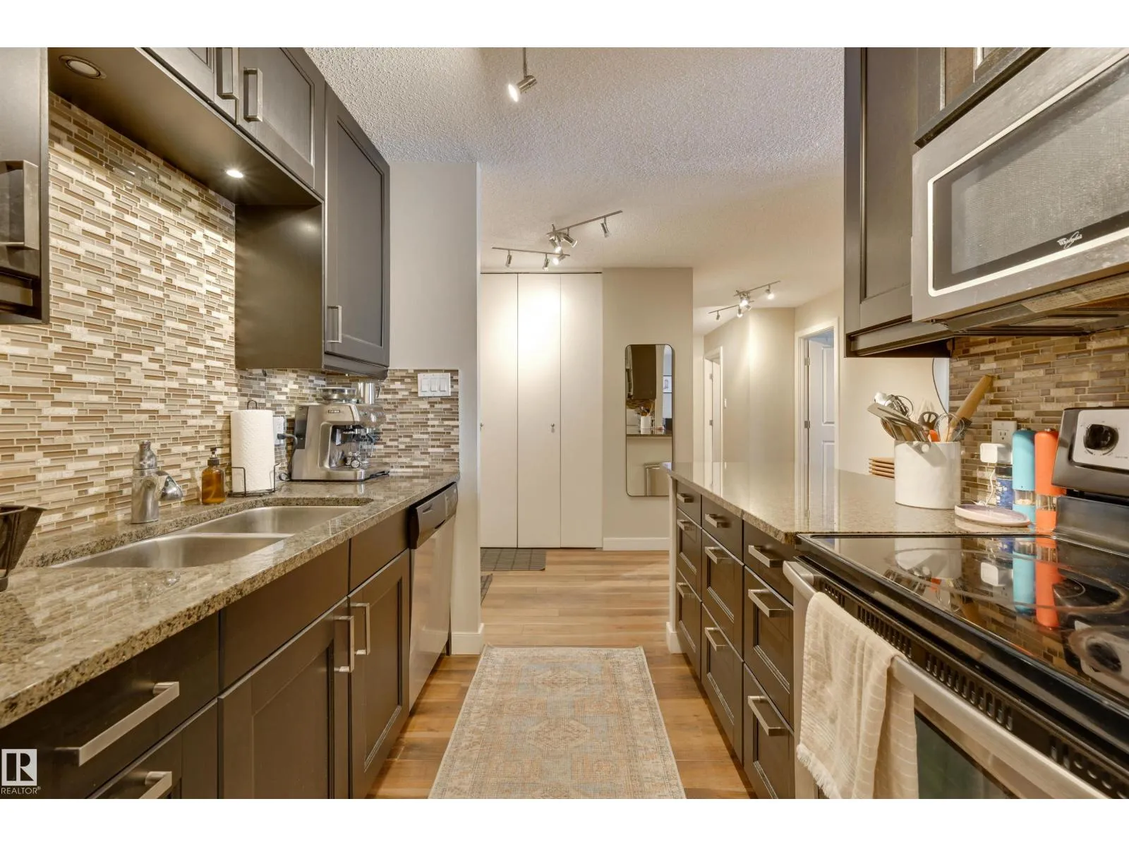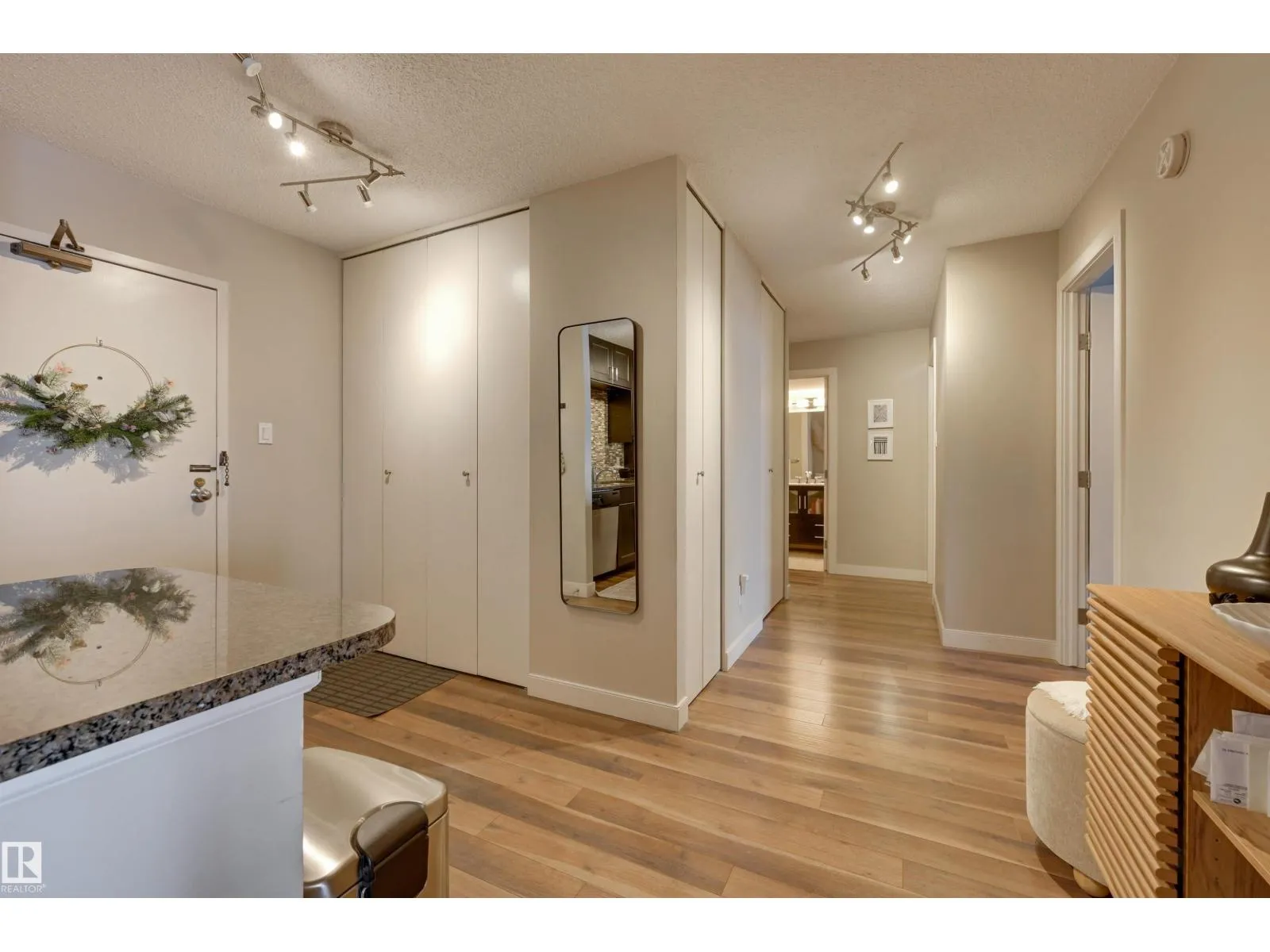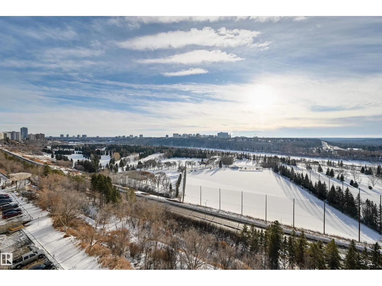 SPECTACULAR RIVER VALLEY VIEW from every window in this BRIGHT, COMPLETELY RENOVATED 1126 sq.ft. 2 bedroom 1.5 bathroom condo in TOP OF THE VALLEY conveniently located with transportation at your doorstep, close to unique shops, restaurants, coffee shops, Art Galleries, the Brewery District, the river valley walking/biking trails & quick access to the U of A. Spacious living room overlooking the river & access to the sunny south facing balcony. The gourmet kitchen is open to the living area with espresso color cabinetry, granite countertops, S/S appliances. The dining room has built-in cabinets. The primary suite is complete with a walk-in closet & a 2 piece bathroom. Spacious 2nd bedroom & a 4 piece bathroom with tile tub surround, new vanity & toilet. Laminate flooring throughout except for tile in the bathrooms. Large storage room. The condo fees include heat, water, power, laundry & underground parking. The building features a completely remodelled exercise room & lobby. Shows very well! (id:27476)