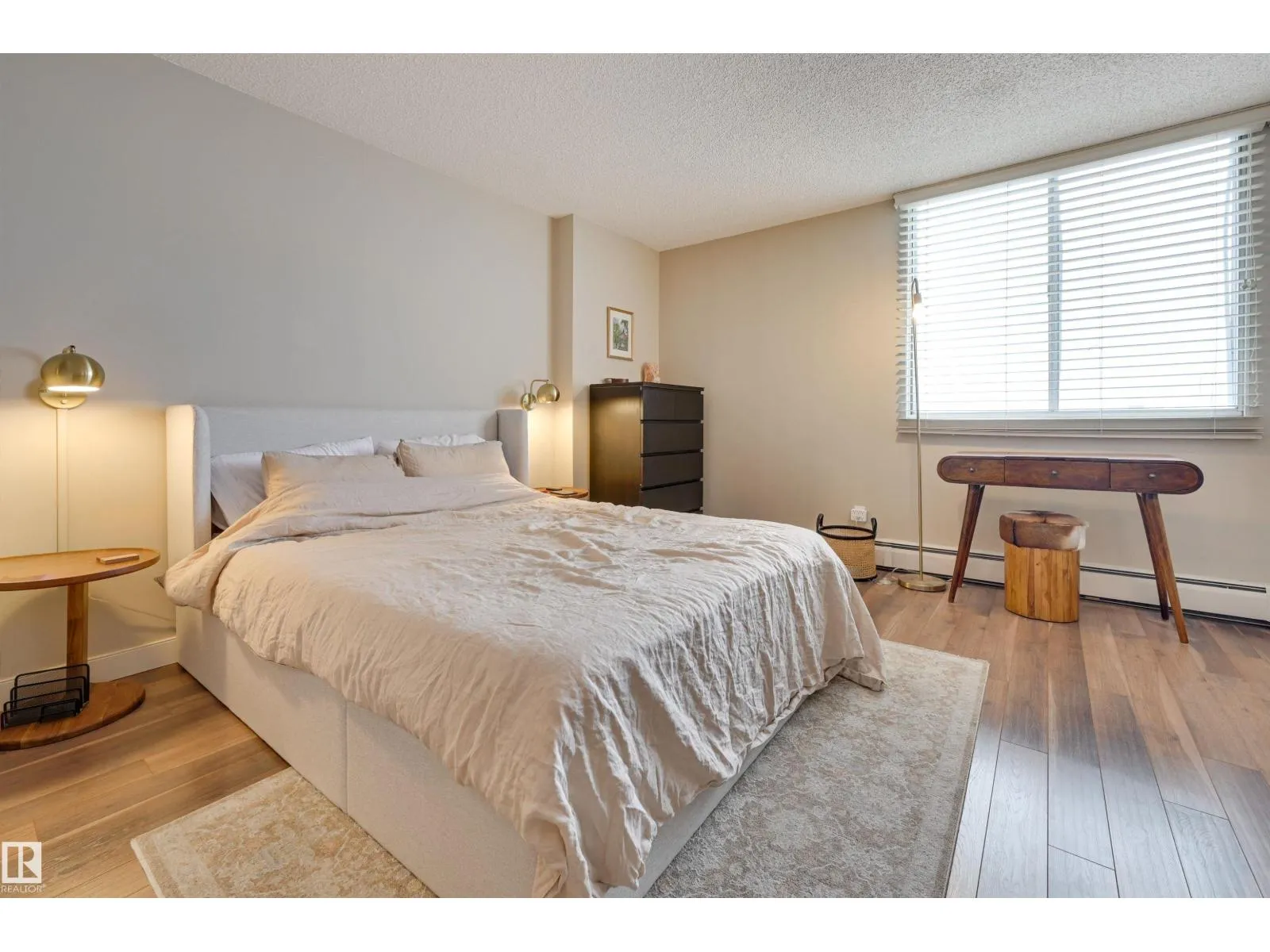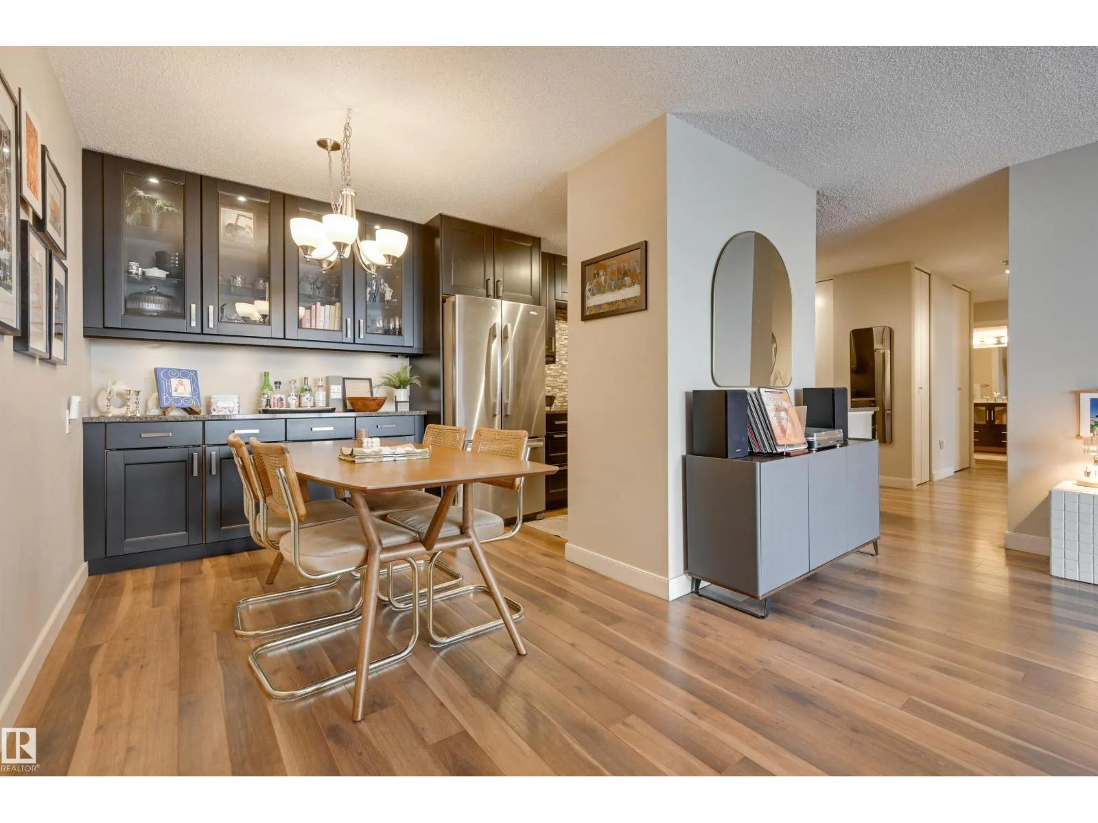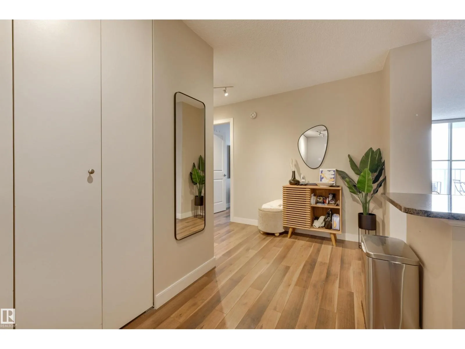 SPECTACULAR RIVER VALLEY VIEW from every window in this BRIGHT, COMPLETELY RENOVATED 1126 sq.ft. 2 bedroom 1.5 bathroom condo in TOP OF THE VALLEY conveniently located with transportation at your doorstep, close to unique shops, restaurants, coffee shops, Art Galleries, the Brewery District, the river valley walking/biking trails & quick access to the U of A. Spacious living room overlooking the river & access to the sunny south facing balcony. The gourmet kitchen is open to the living area with espresso color cabinetry, granite countertops, S/S appliances. The dining room has built-in cabinets. The primary suite is complete with a walk-in closet & a 2 piece bathroom. Spacious 2nd bedroom & a 4 piece bathroom with tile tub surround, new vanity & toilet. Laminate flooring throughout except for tile in the bathrooms. Large storage room. The condo fees include heat, water, power, laundry & underground parking. The building features a completely remodelled exercise room & lobby. Shows very well! (id:27476)