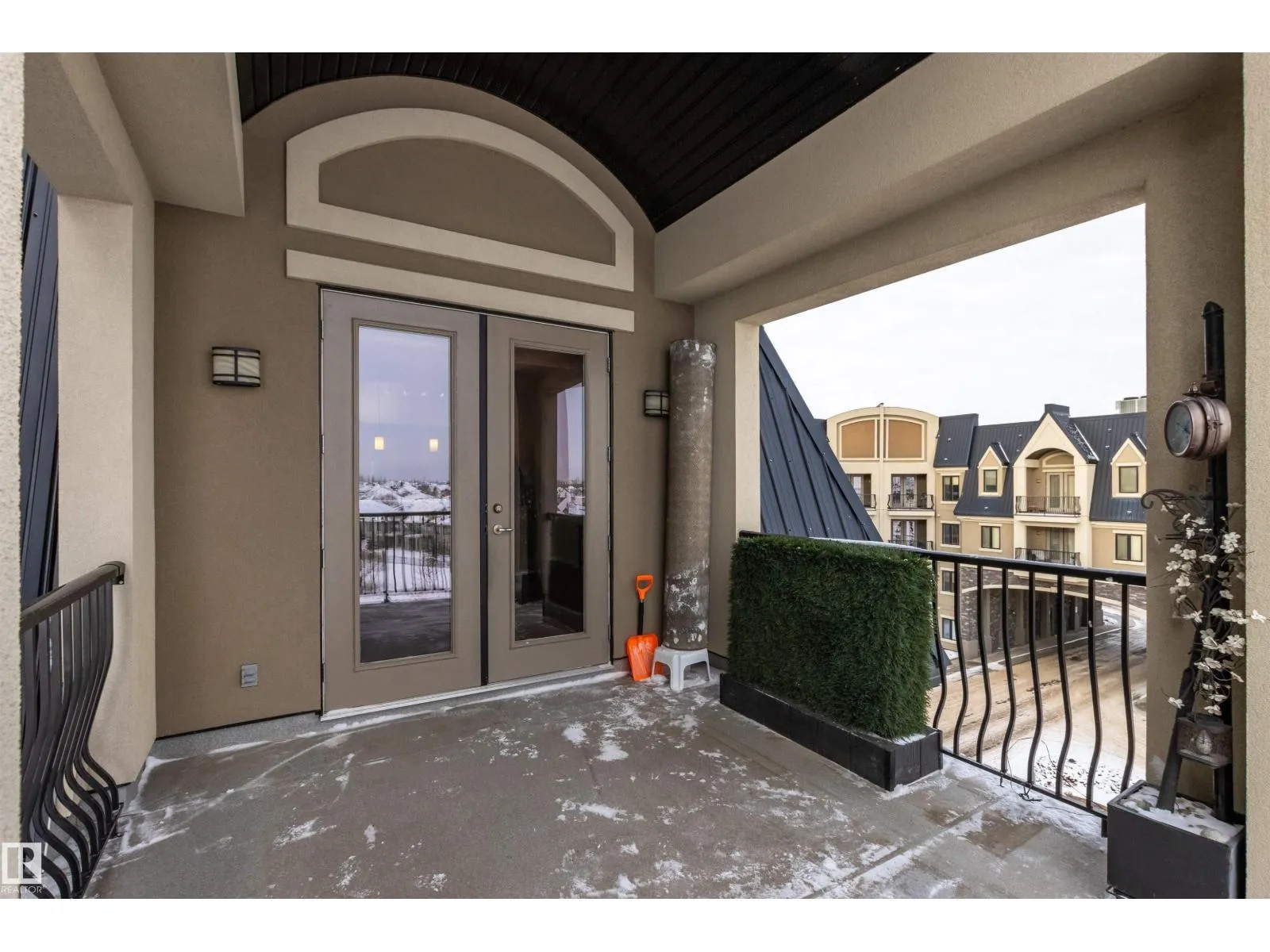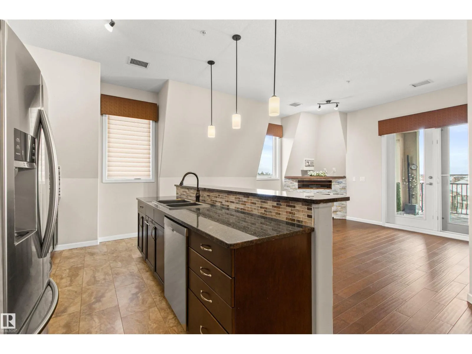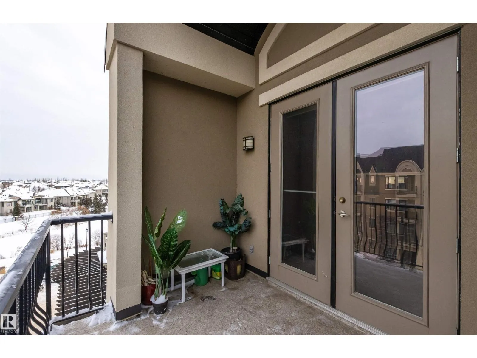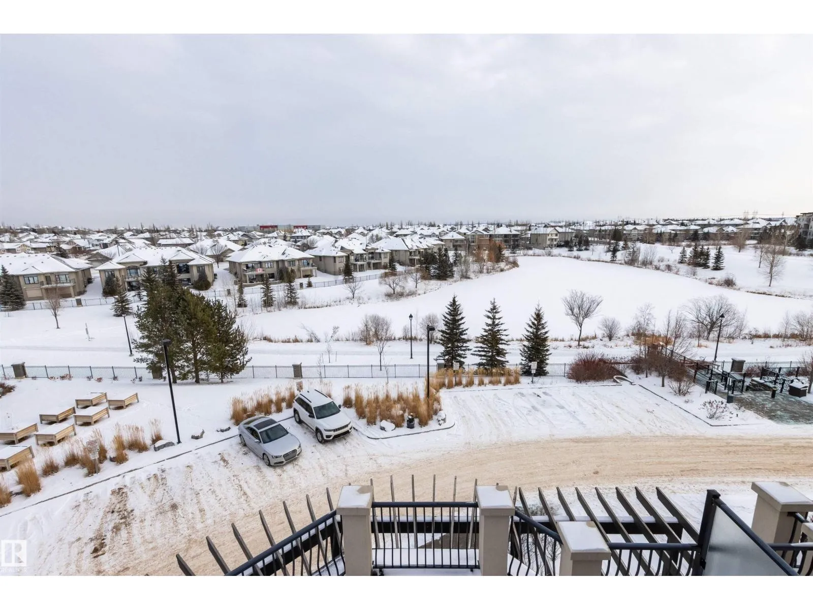Rare opportunity to own this penthouse corner end unit with spectacular views off the balcony overlooking 2 lakes, landscaped trees, & walking trails! This 2 bedroom + den open concept layout features; chefs galley kitchen, cherry stained mahogany cabinets, granite counter tops, s/s appliances, impressive 10' vaulted ceilings, engineered hickory hardwood, custom built-in murphy bed, den has built-in book shelf unit, ensuite off primary bed. has huge shower w/his & hers closets, in-suite laundry, spacious living rm w/corner mantle fireplace, formal dining rm., patio drs. lead to one of two covered private decks. A truly remarkable gem in Mactaggarts exclusive neighborhood. Best of all its an original owner & yes in showhome condition! Complete with two heated underground stalls, one storage cage, two gyms, social rms., & Guest Suites! Just minutes to Windemere, South Edmonton Common & Anthony Henday. (id:27476)