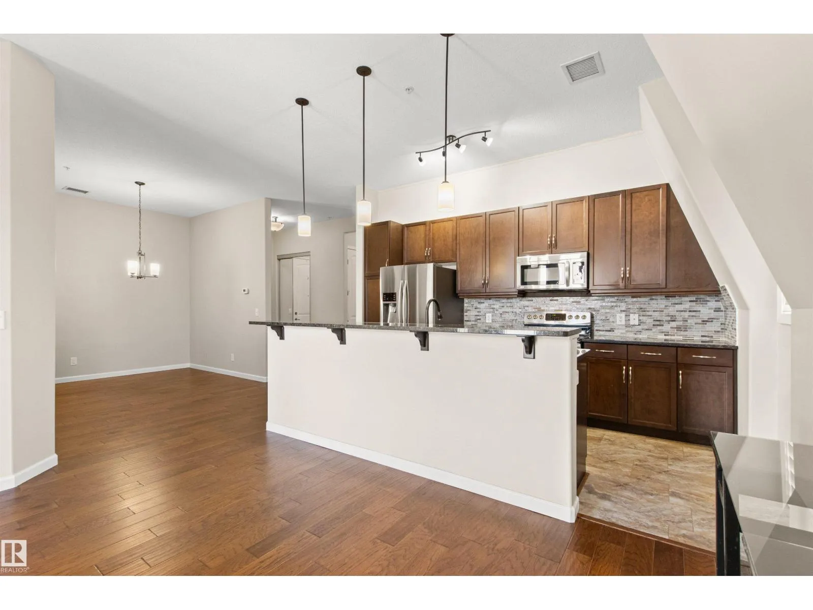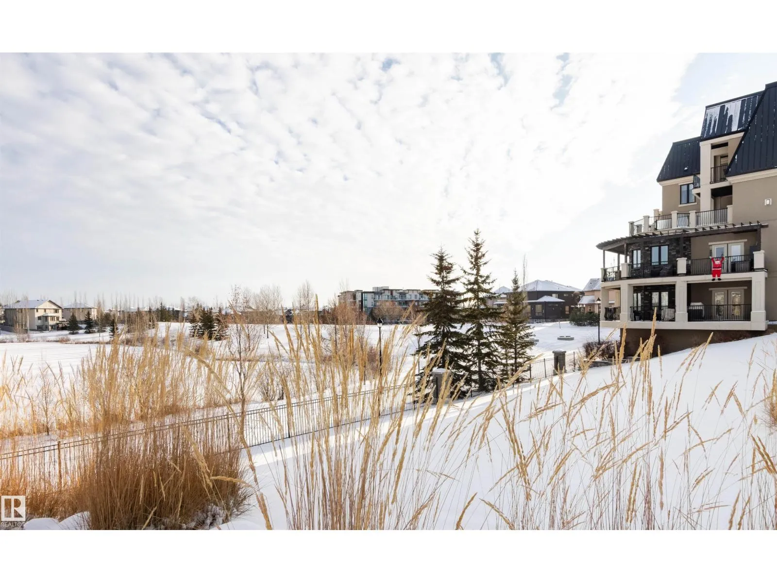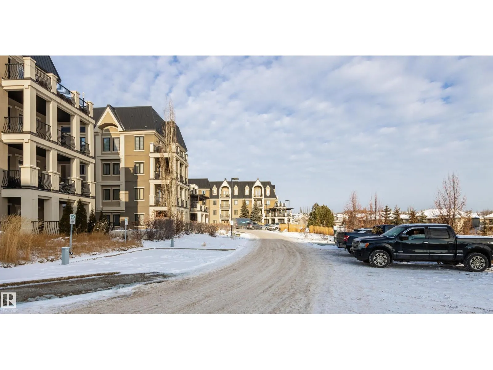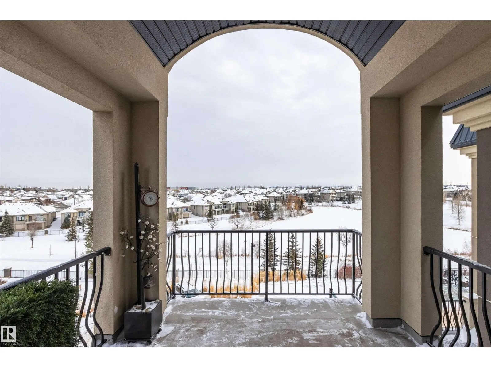 Rare opportunity to own this penthouse corner end unit with spectacular views off the balcony overlooking 2 lakes, landscaped trees, & walking trails! This 2 bedroom + den open concept layout features; chefs galley kitchen, cherry stained mahogany cabinets, granite counter tops, s/s appliances, impressive 10' vaulted ceilings, engineered hickory hardwood, custom built-in murphy bed, den has built-in book shelf unit, ensuite off primary bed. has huge shower w/his & hers closets, in-suite laundry, spacious living rm w/corner mantle fireplace, formal dining rm., patio drs. lead to one of two covered private decks. A truly remarkable gem in Mactaggarts exclusive neighborhood. Best of all its an original owner & yes in showhome condition! Complete with two heated underground stalls, one storage cage, two gyms, social rms., & Guest Suites! Just minutes to Windemere, South Edmonton Common & Anthony Henday. (id:27476)