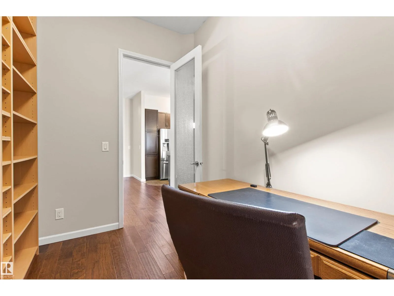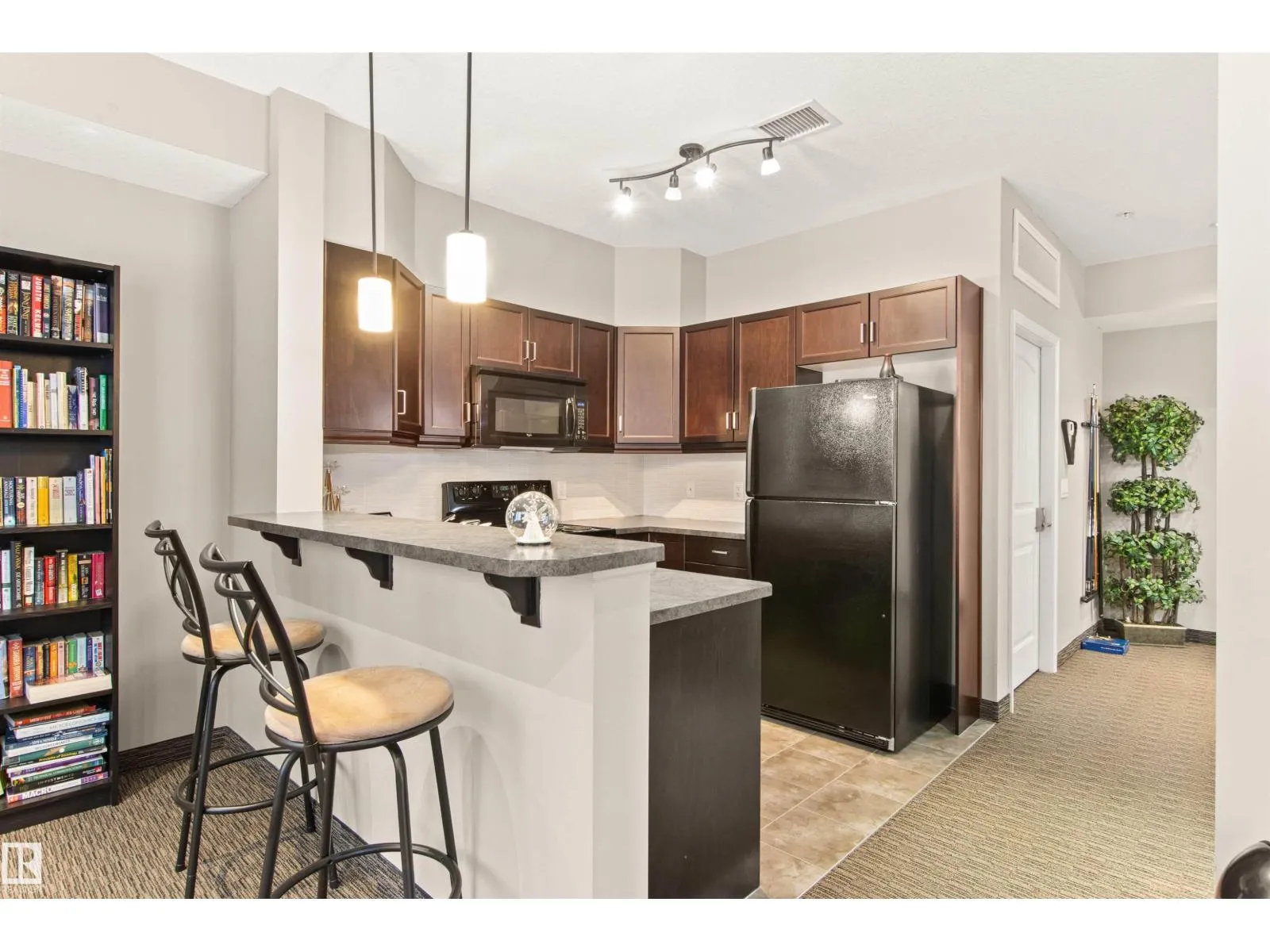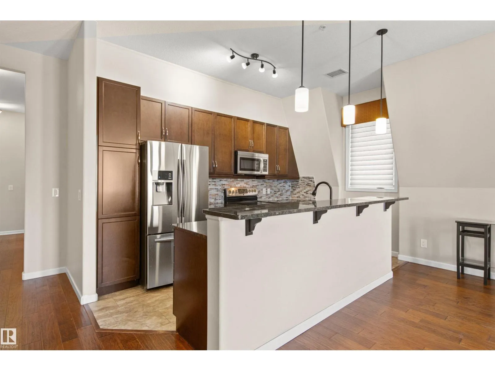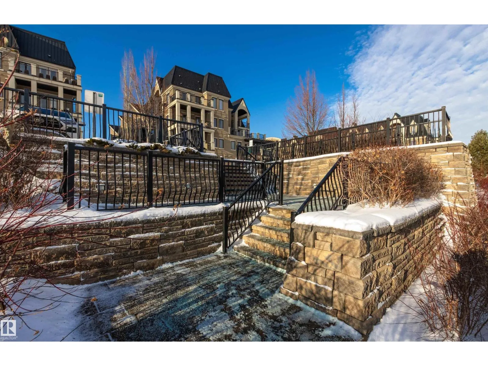 Rare opportunity to own this penthouse corner end unit with spectacular views off the balcony overlooking 2 lakes, landscaped trees, & walking trails! This 2 bedroom + den open concept layout features; chefs galley kitchen, cherry stained mahogany cabinets, granite counter tops, s/s appliances, impressive 10' vaulted ceilings, engineered hickory hardwood, custom built-in murphy bed, den has built-in book shelf unit, ensuite off primary bed. has huge shower w/his & hers closets, in-suite laundry, spacious living rm w/corner mantle fireplace, formal dining rm., patio drs. lead to one of two covered private decks. A truly remarkable gem in Mactaggarts exclusive neighborhood. Best of all its an original owner & yes in showhome condition! Complete with two heated underground stalls, one storage cage, two gyms, social rms., & Guest Suites! Just minutes to Windemere, South Edmonton Common & Anthony Henday. (id:27476)