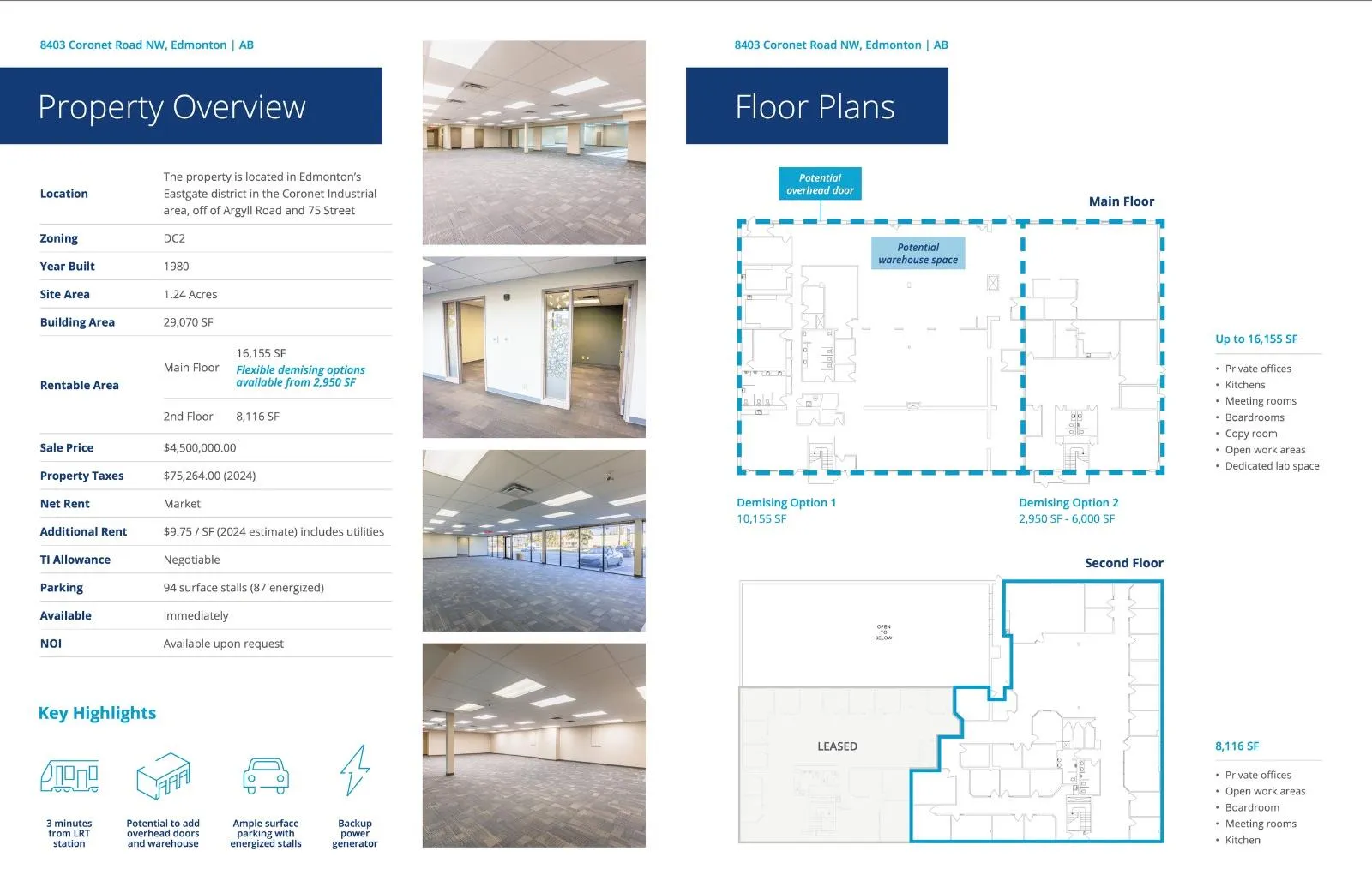 Visit the Listing Brokerage (and/or listing REALTOR®) website to obtain additional information. Opportunity to purchase or lease a developed office/flex commercial building in the Coronet Industrial area of Southeast Edmonton. The property is professionally built out with enclosed offices, open work areas, meeting rooms, kitchen space, and washrooms, and provides the ability to add warehouse space and/or secured yard storage. The property is located in Edmontonâs Eastgate district in the Coronet Industrial area, off of Argyll Road and 75 StreetOther Property Types: OfficeSubject Space Width: 114Ownership Interest: PrivateTitle to Land: Fee SimpleRPR Survey Available: NoSeller Rights: YesAppointment Name: Chance ThomasAppointment Phone: 780-969-3035Paragon Listing ID: E4452359 (id:27476)