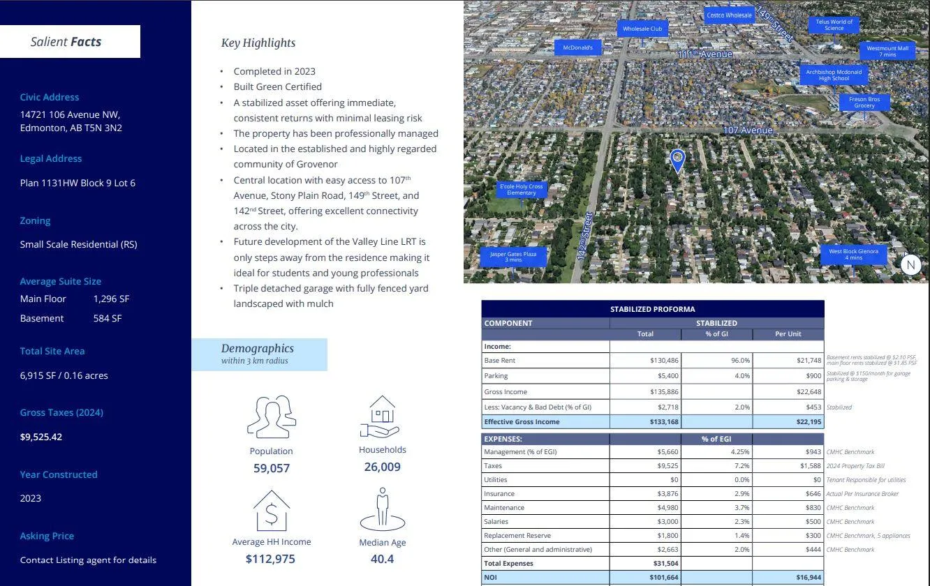 Six newly constructed turnkey suites situated in the highly sought after community of Grovenor, this rare multi-family asset offers a prime investment opportunity in a tightly held market. Completed in 2023 with a Built Green Certification. A stabilized asset offering immediate, consistent returns with minimal leasing risk. The property has been professionally managed and is located in the established and highly regarded community of Grovenor. Central location with easy access to 107th Avenue, Stony Plain Road, 149th Street, and 142nd Street, offering excellent connectivity across the city. Future development of the Valley Line LRT is only steps away from the residence making it ideal for students and young professionals. Triple detached garage with fully fenced yard landscaped with mulch.Unit Counts:Studio Apts: 0Bachelor Apts: 01 Bedroom Apts: 32 Bedroom Apts: 03 Bedroom Apts: 34+ Bedroom Apts: 0Other Units: 0Other Property Types: Multi-FamilyOwnership Interest: PrivateSite Influences: Landscaped,Playground Nearby,Back Lane,See RemarksTitle to Land: Fee SimpleRPR Survey Available: NoSeller Rights: YesAppointment Name: TaylorAppointment Phone: 780-970-5792Paragon Listing ID: E4440067 (id:27476)