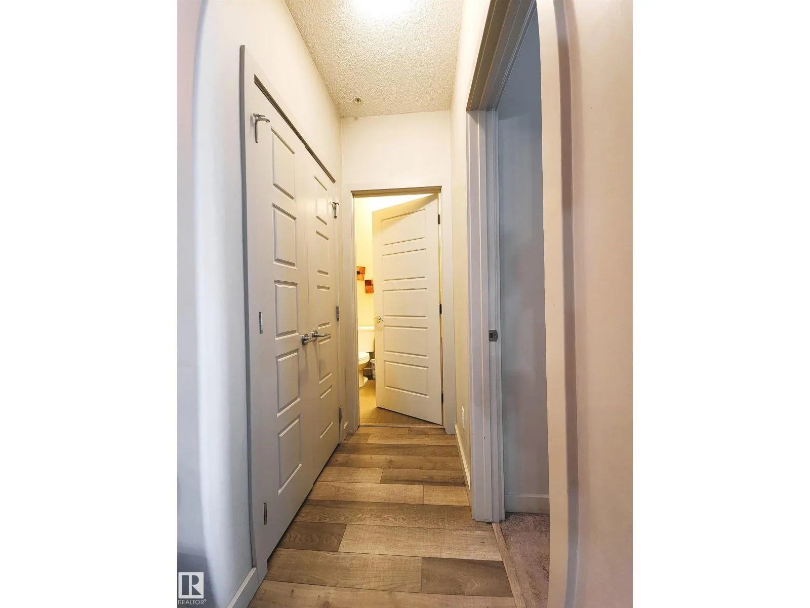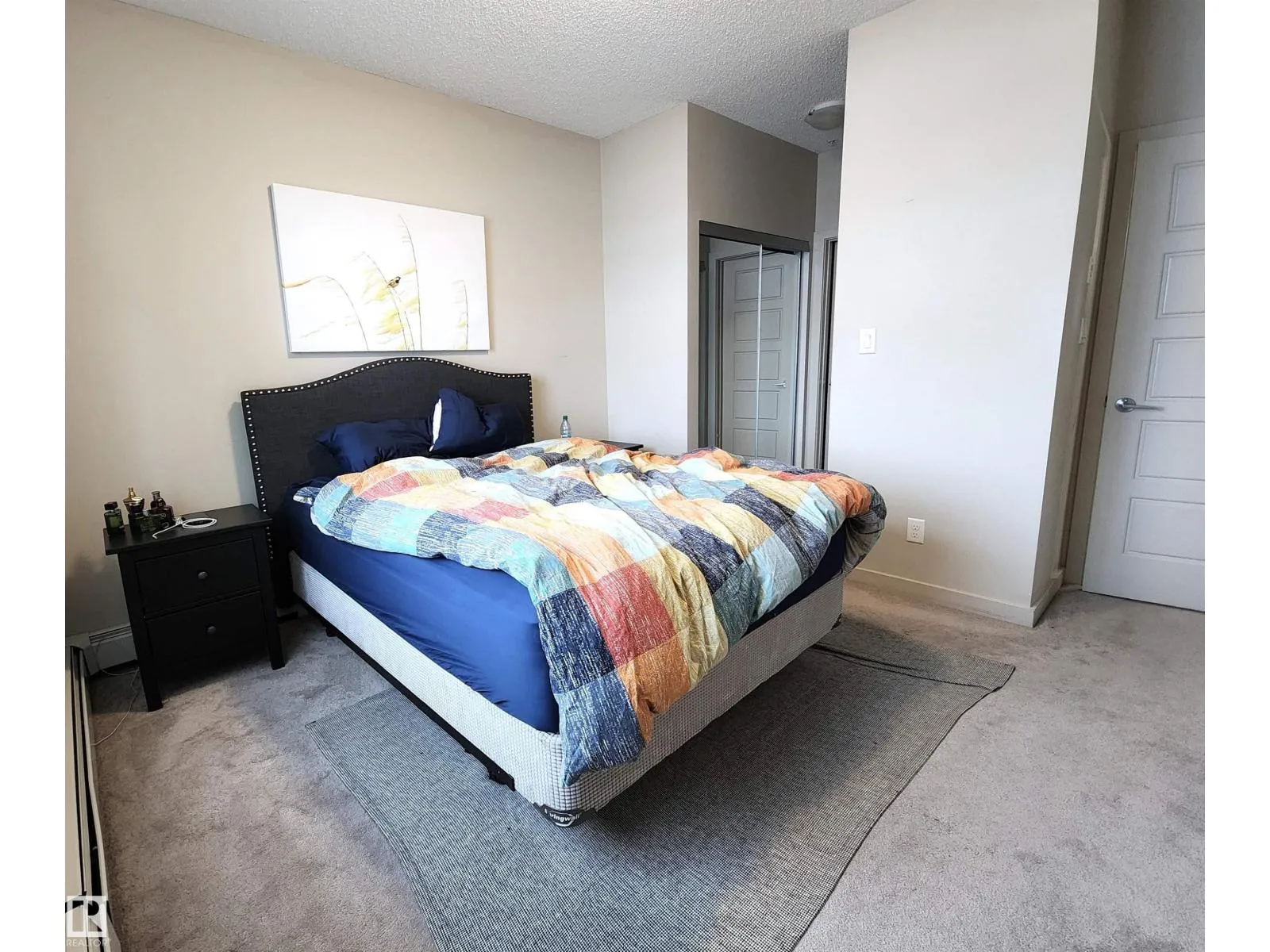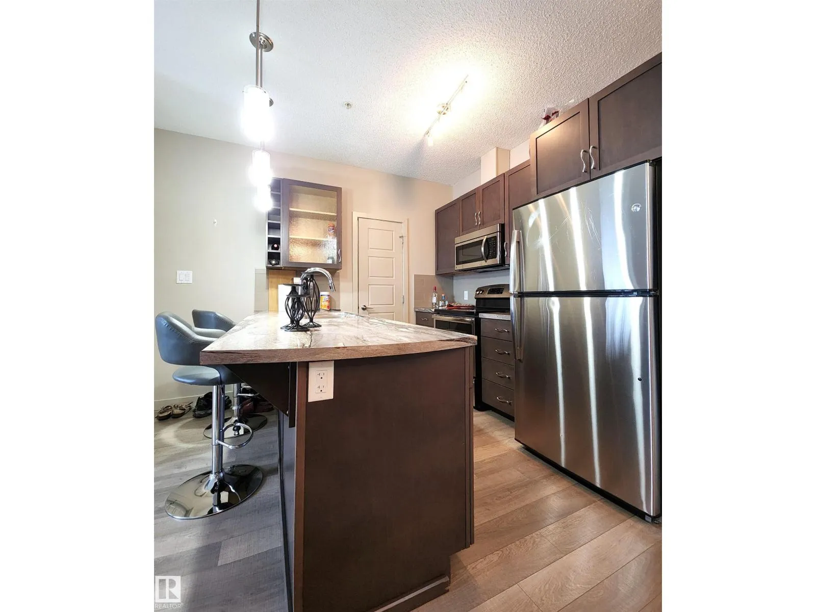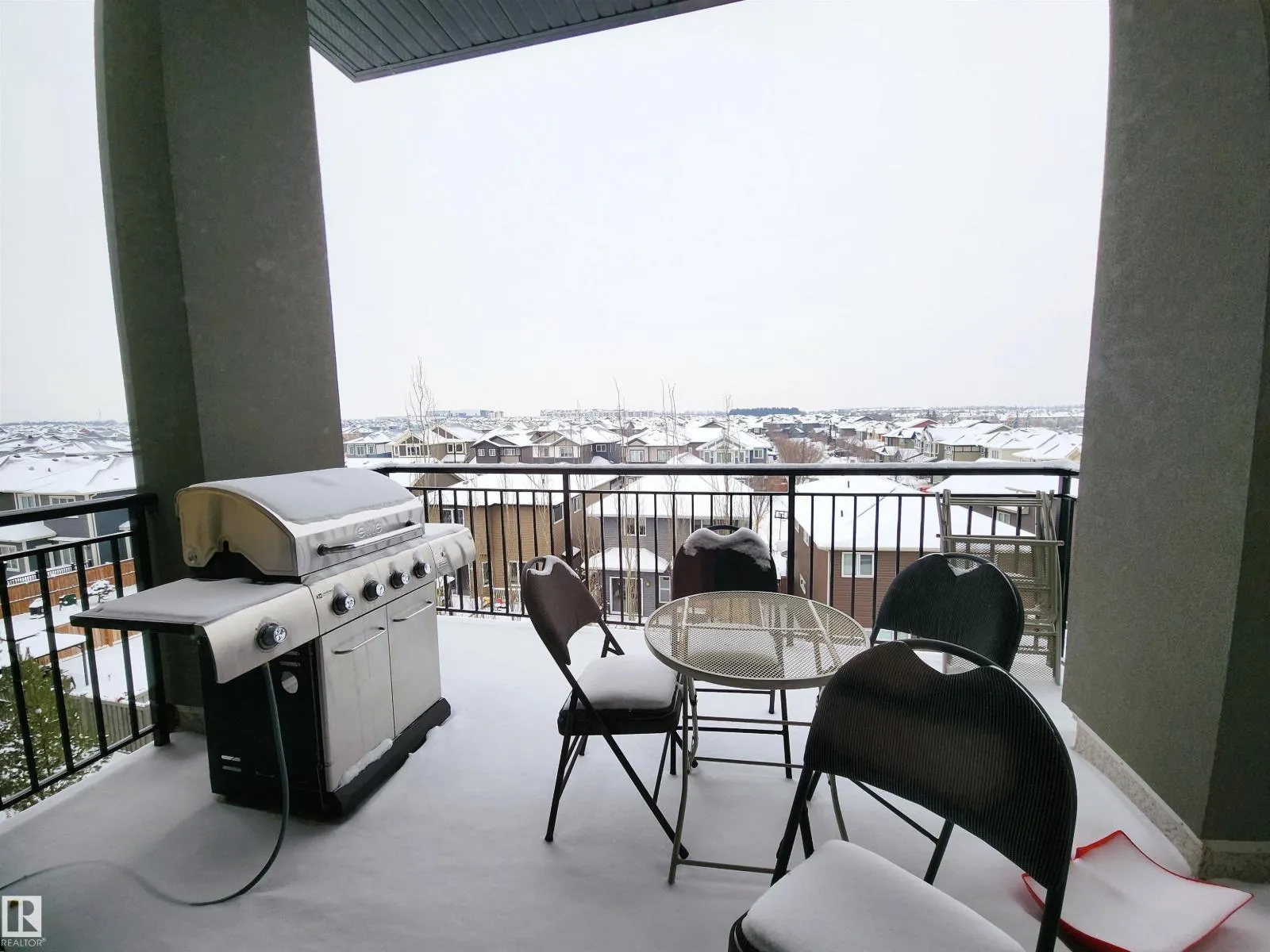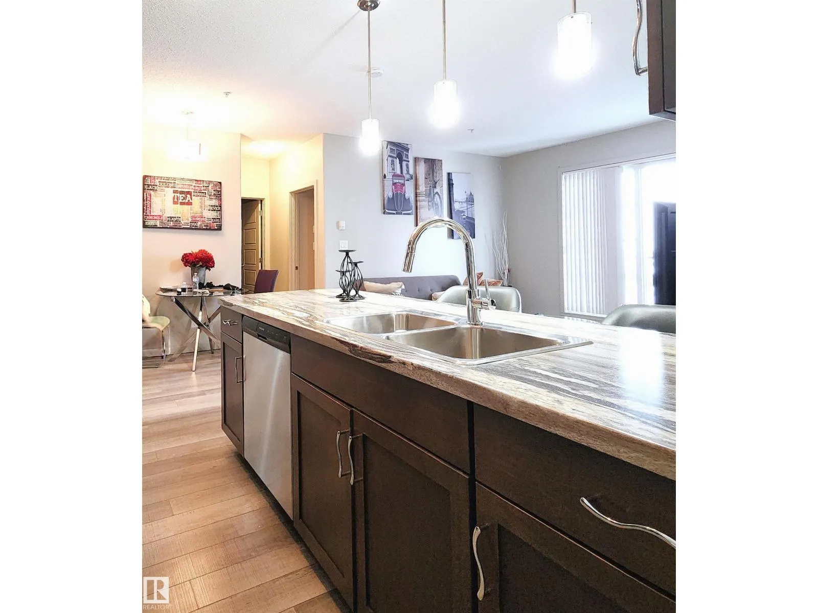 Top-floor 2-bedroom, 2-bathroom condo offering two TITLED underground parking stalls, extra storage, and a large balcony with gas BBQ hookup. This premium floor plan features a spacious open-concept layout with upgraded wide-plank flooring throughout, a modern kitchen with a large island and eating bar, plus generous cabinet and counter space that flows seamlessly into the dining and living areasâideal for entertaining. The king-sized primary bedroom includes a walk-through closet with organizers and a 3-piece ensuite, while the spacious second bedroom is conveniently located next to the 4-piece main bathroom. Enjoy added privacy and quiet top-floor living, along with building amenities such as a fitness room, social room with pool table and wet bar, and a guest suite. Ideally located steps from parks, trails, and man-made lakes, with quick access to Anthony Henday, Whitemud, shopping, and restaurants. (id:27476)