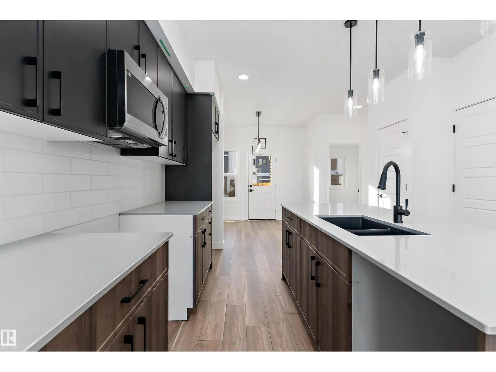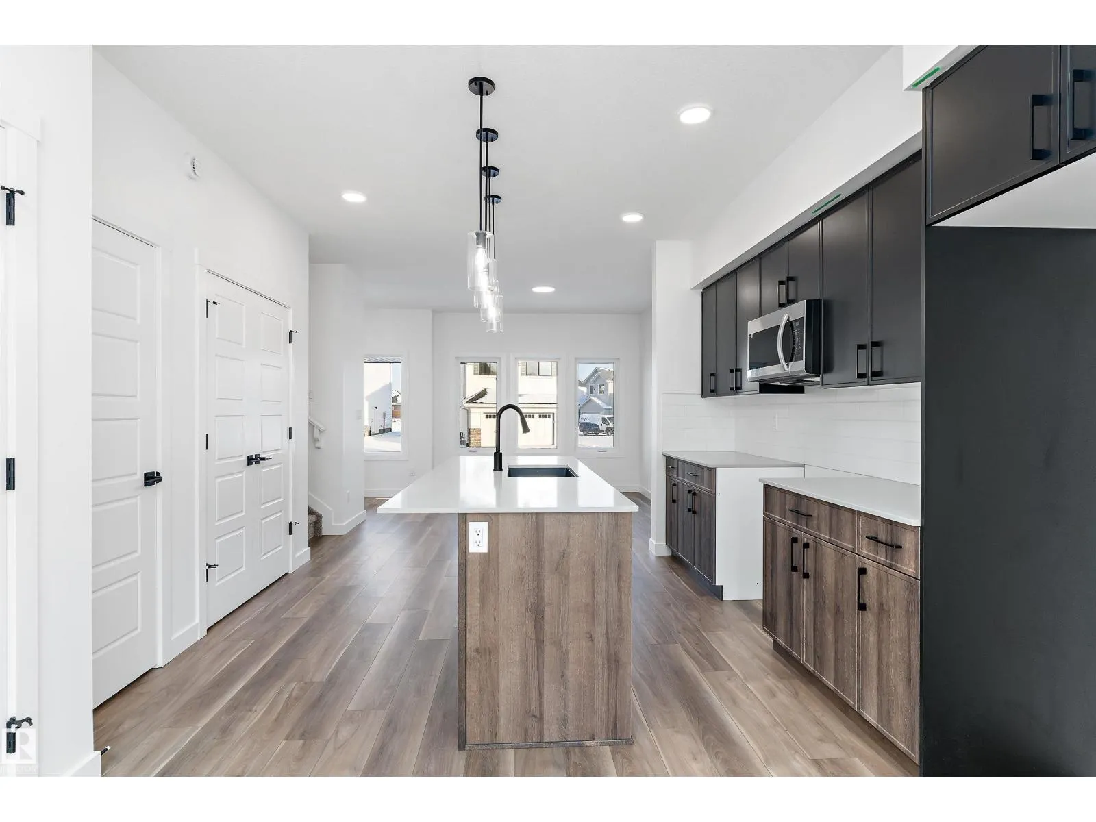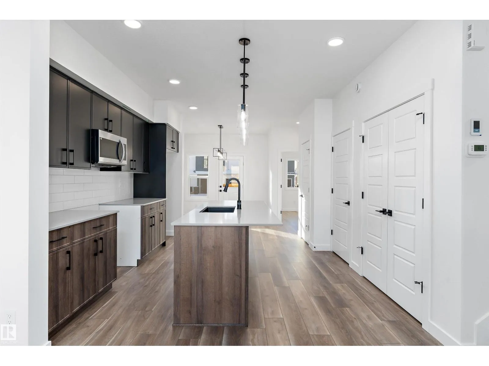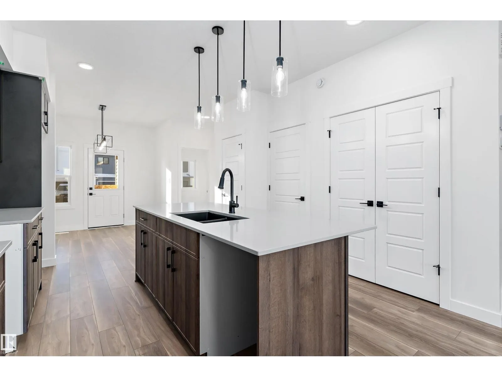 Discover the Sylvan by Sterling Homes, a well-crafted home designed for comfort and functionality. The main floor features luxury vinyl plank flooring and a welcoming foyer with coat storage leading to a bright great room. The kitchen offers quartz countertops, an island with flush eating ledge, Silgranit undermount sink, pendant lighting, over-the-range microwave, soft-close cabinetry with upgraded door profiles, and a pantry tucked near the stairs. At the rear, the sunlit nook overlooks the backyard and sits beside a main-floor bedroom and 3-piece bath with stand-up shower, with a garden door to the outdoors. Upstairs includes a primary suite with walk-in closet and 4-piece ensuite with tub/shower combo, two additional bedrooms, a full bath, and a laundry closet. 9â ceilings on main and basement levels, a separate side entrance, black plumbing and lighting fixtures, basement rough-in plumbing, and a parking pad with option for a detached double garage complete this home. (id:27476)