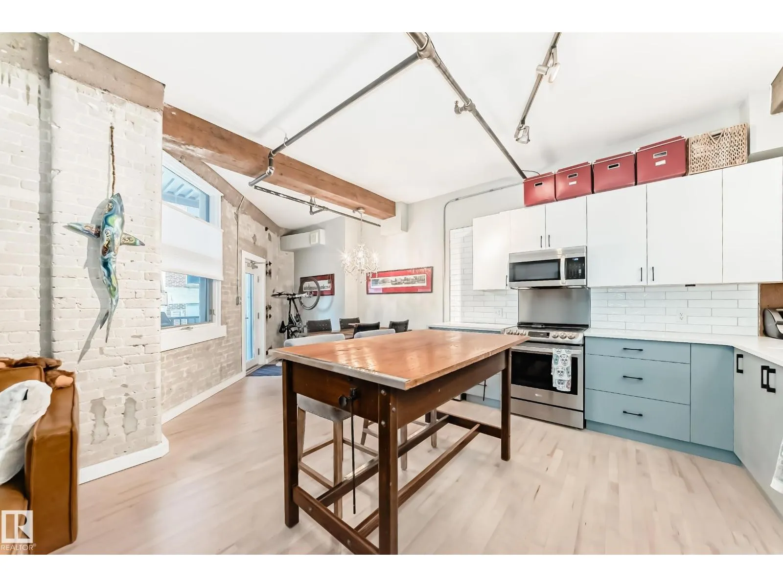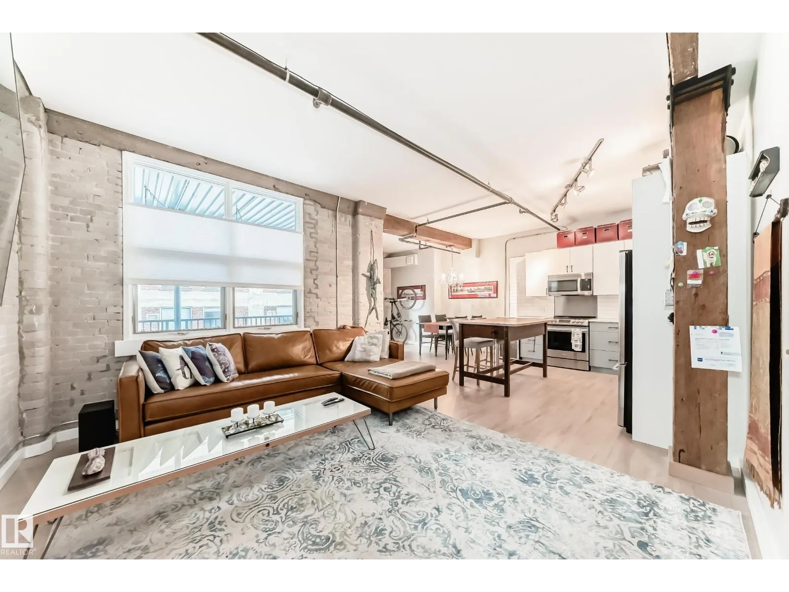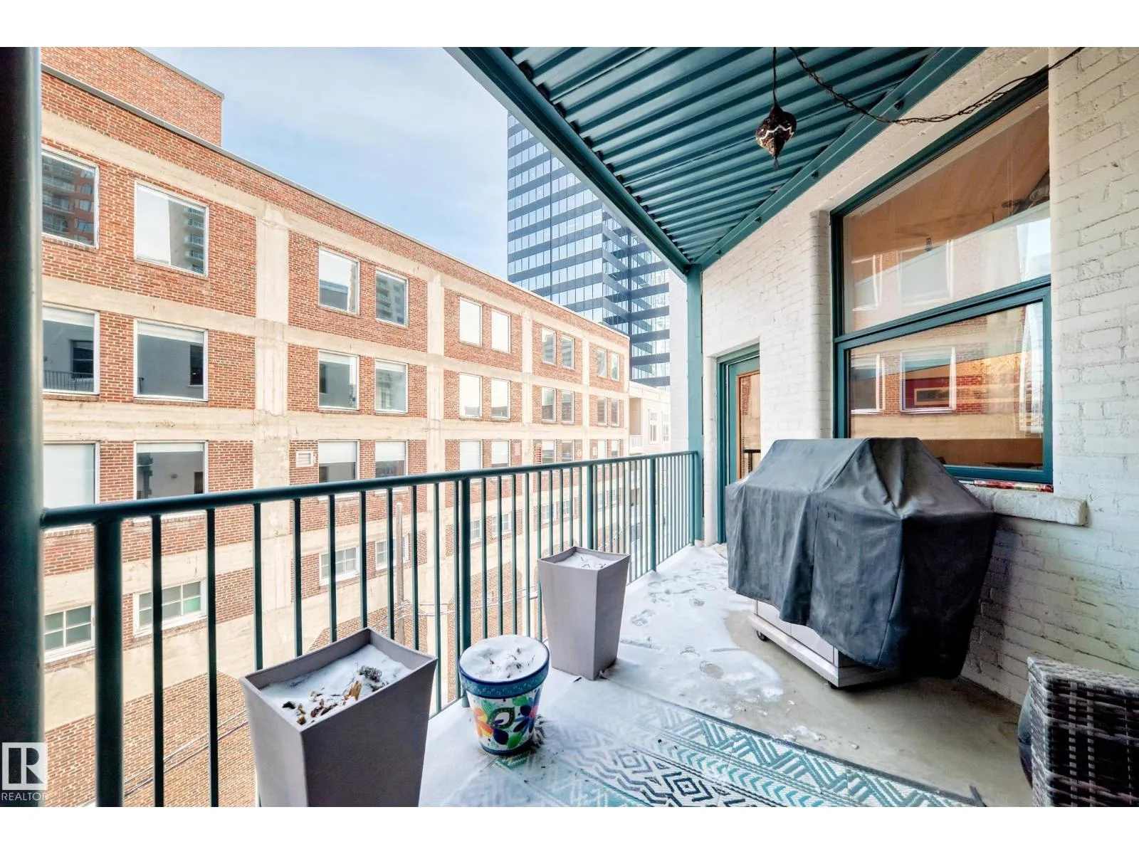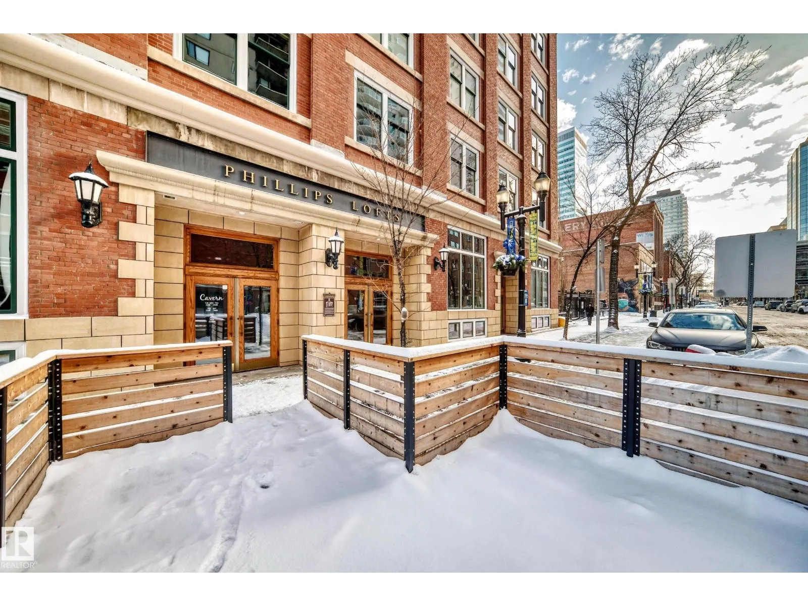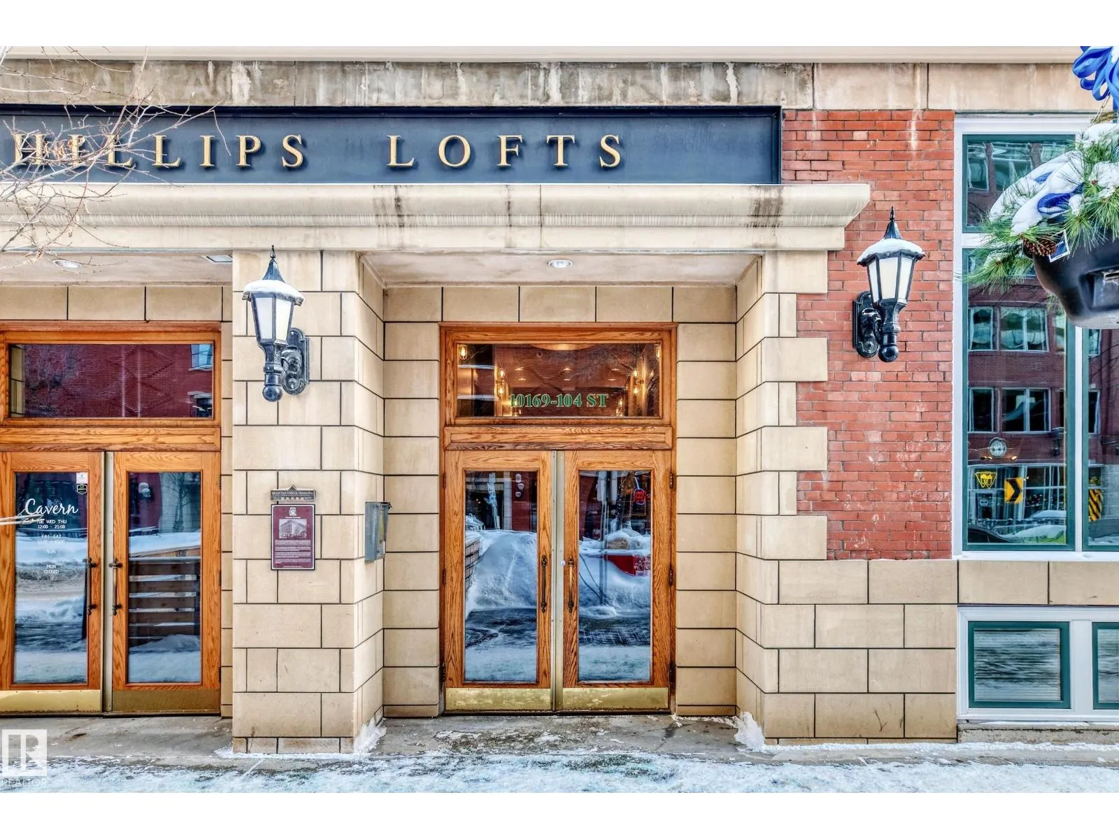 Pristine studio loft in the historic Phillips Lofts. This stunning warehouse-style unit offers 1,050 sq. ft. of open-concept living w/ exposed brick, original timber beams, 9â ceilings, & massive windows throughout. Thoughtfully renovated while preserving its character, the kitchen features new quartz countertops, new tile backsplash, refinished cabinets w/ new hardware, deep single-basin sink, & updated faucet, along w/ a premium LG induction range, LG over-the-range microwave, & Danby beverage centre. Custom built-in wardrobe cabinetry includes clothes rail, upper storage, & dimmable LED lighting, maximizing functionality while maintaining the loft aesthetic. Additional storage added w/ a new custom shelf in the front closet. The 4-piece bath includes new full-size LG washer & dryer, & a pocket-door. Maple hardwood floors have been professionally refinished, & the private balcony is enhanced w/ Turkish pendant lighting. Unbeatable location steps from Rogers Place, Jasper Ave., restaurants, cafés, &LRT. (id:27476)