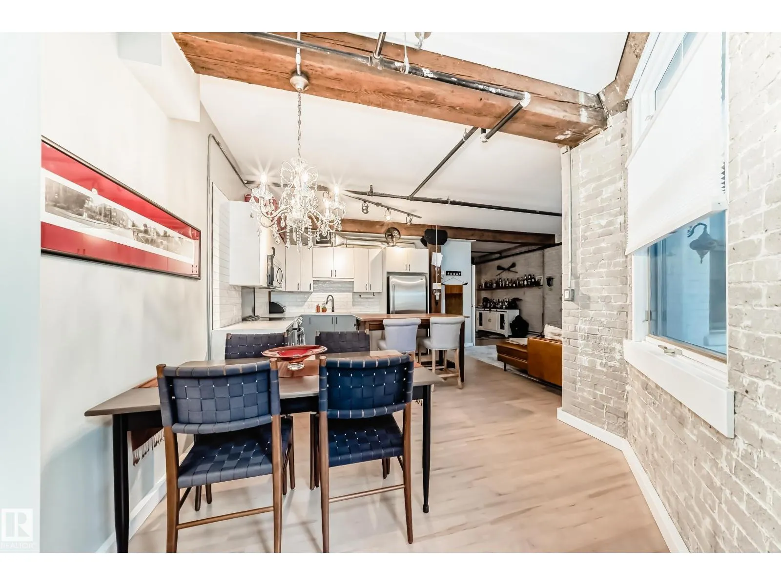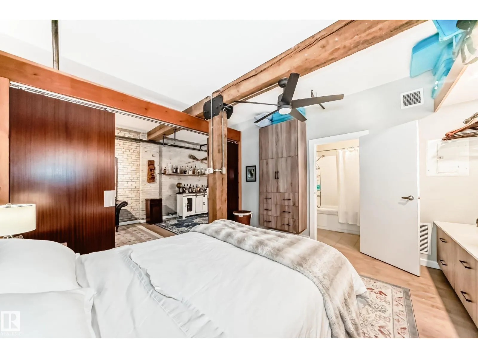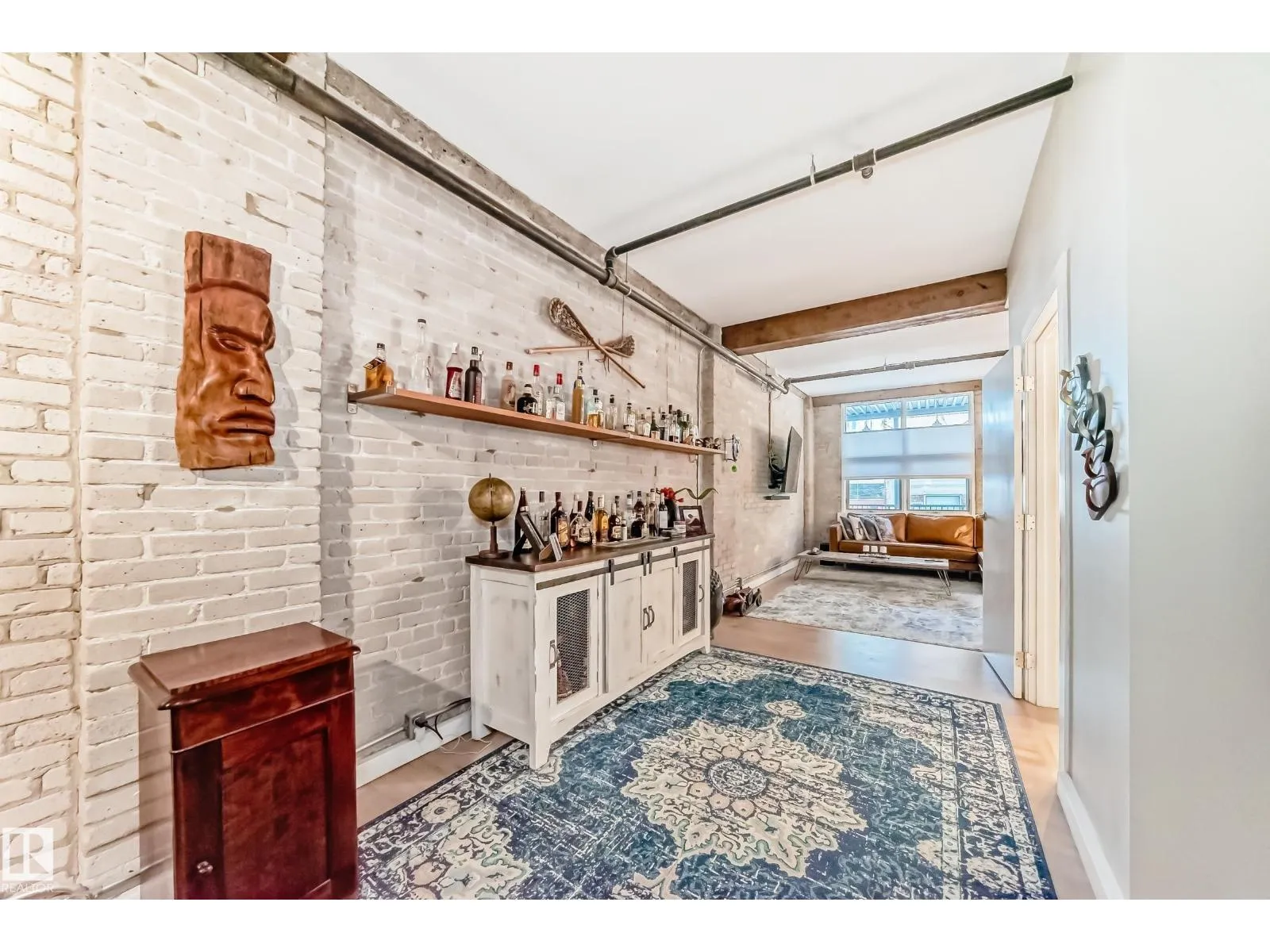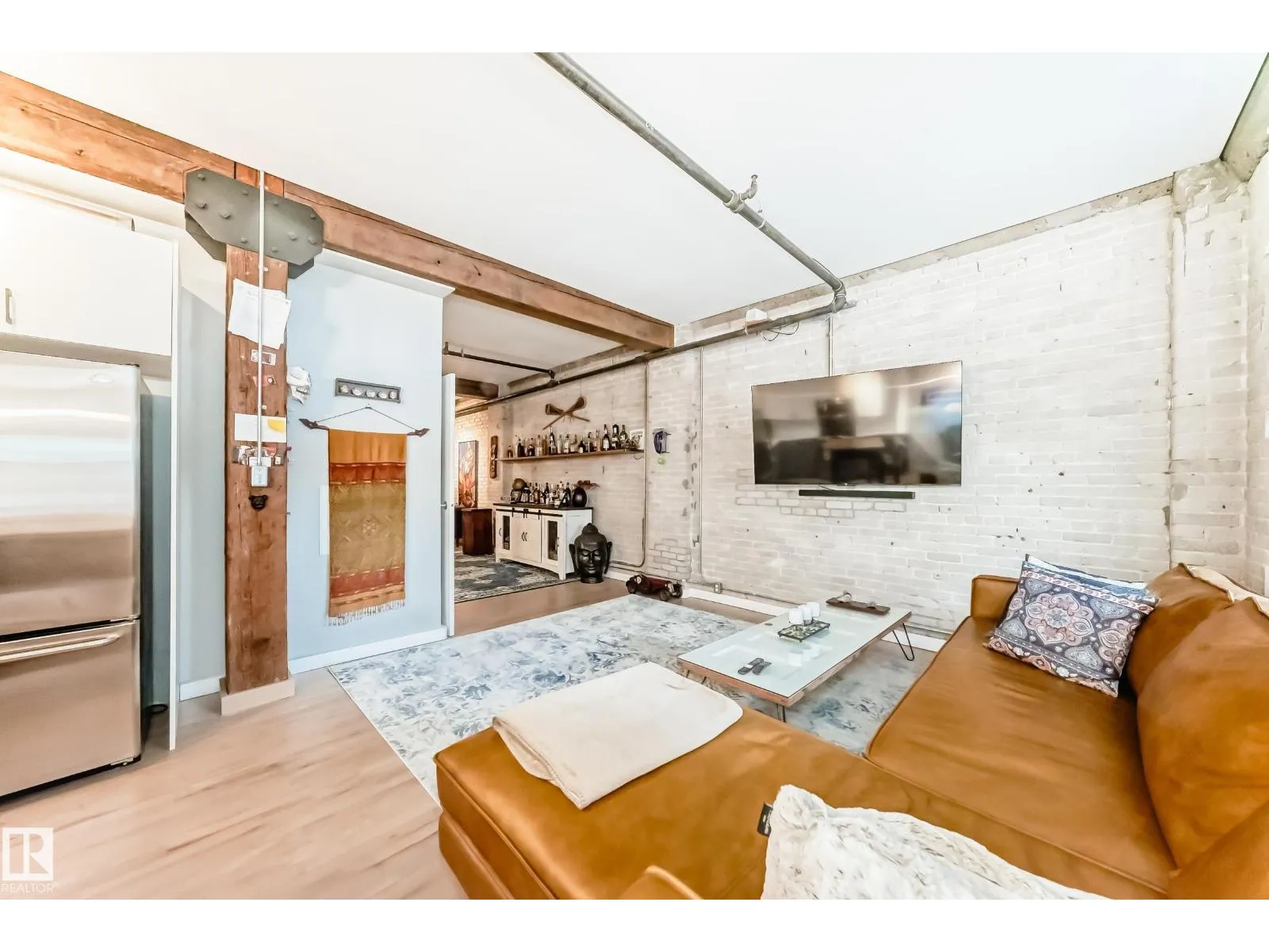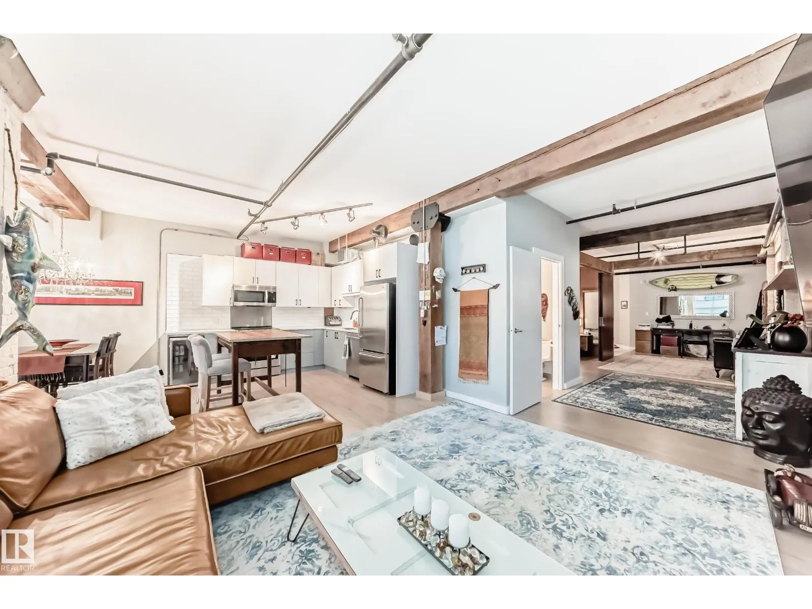 Pristine studio loft in the historic Phillips Lofts. This stunning warehouse-style unit offers 1,050 sq. ft. of open-concept living w/ exposed brick, original timber beams, 9â ceilings, & massive windows throughout. Thoughtfully renovated while preserving its character, the kitchen features new quartz countertops, new tile backsplash, refinished cabinets w/ new hardware, deep single-basin sink, & updated faucet, along w/ a premium LG induction range, LG over-the-range microwave, & Danby beverage centre. Custom built-in wardrobe cabinetry includes clothes rail, upper storage, & dimmable LED lighting, maximizing functionality while maintaining the loft aesthetic. Additional storage added w/ a new custom shelf in the front closet. The 4-piece bath includes new full-size LG washer & dryer, & a pocket-door. Maple hardwood floors have been professionally refinished, & the private balcony is enhanced w/ Turkish pendant lighting. Unbeatable location steps from Rogers Place, Jasper Ave., restaurants, cafés, &LRT. (id:27476)