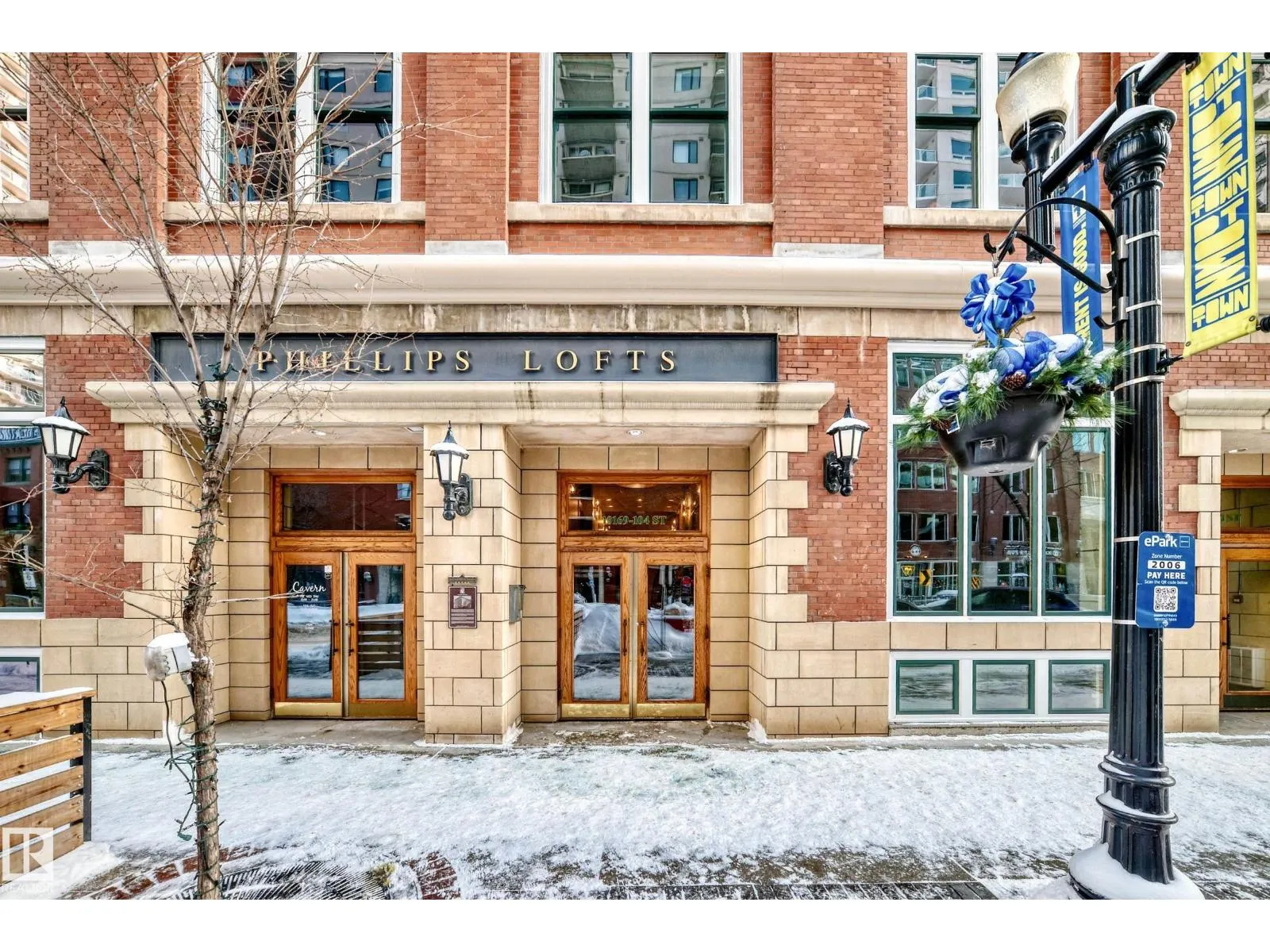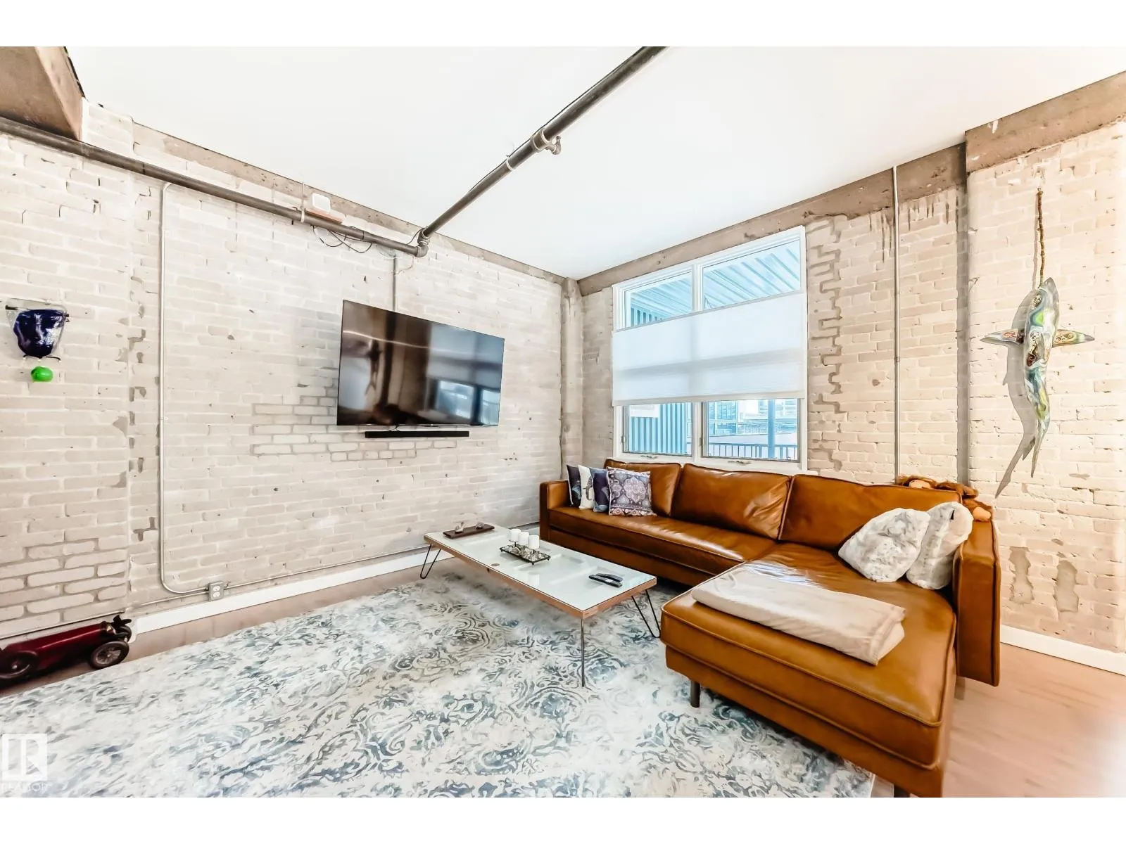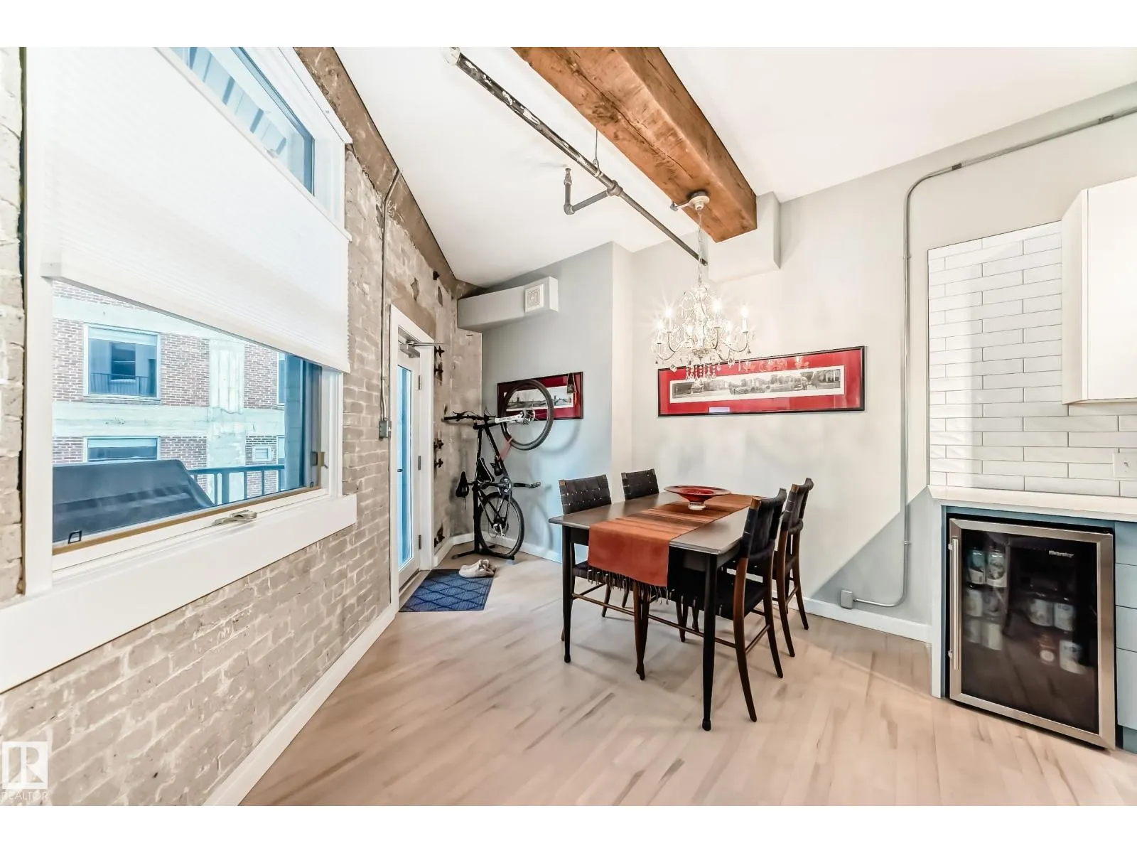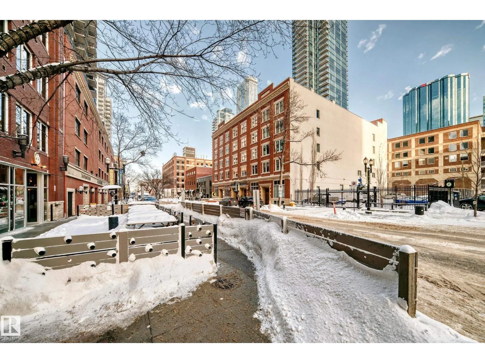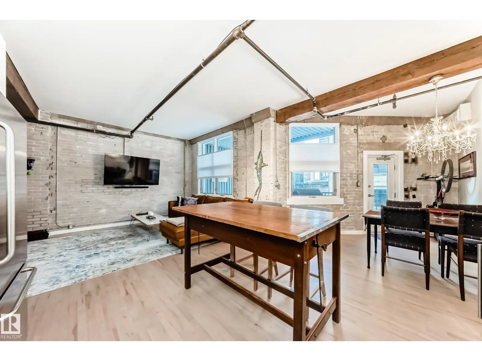 Pristine studio loft in the historic Phillips Lofts. This stunning warehouse-style unit offers 1,050 sq. ft. of open-concept living w/ exposed brick, original timber beams, 9â ceilings, & massive windows throughout. Thoughtfully renovated while preserving its character, the kitchen features new quartz countertops, new tile backsplash, refinished cabinets w/ new hardware, deep single-basin sink, & updated faucet, along w/ a premium LG induction range, LG over-the-range microwave, & Danby beverage centre. Custom built-in wardrobe cabinetry includes clothes rail, upper storage, & dimmable LED lighting, maximizing functionality while maintaining the loft aesthetic. Additional storage added w/ a new custom shelf in the front closet. The 4-piece bath includes new full-size LG washer & dryer, & a pocket-door. Maple hardwood floors have been professionally refinished, & the private balcony is enhanced w/ Turkish pendant lighting. Unbeatable location steps from Rogers Place, Jasper Ave., restaurants, cafés, &LRT. (id:27476)