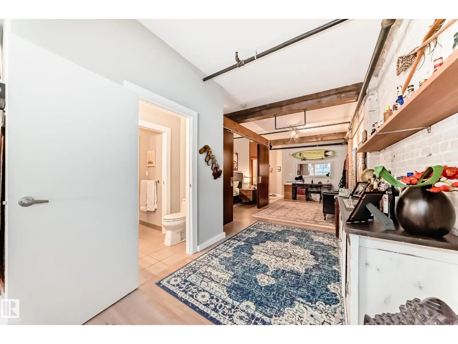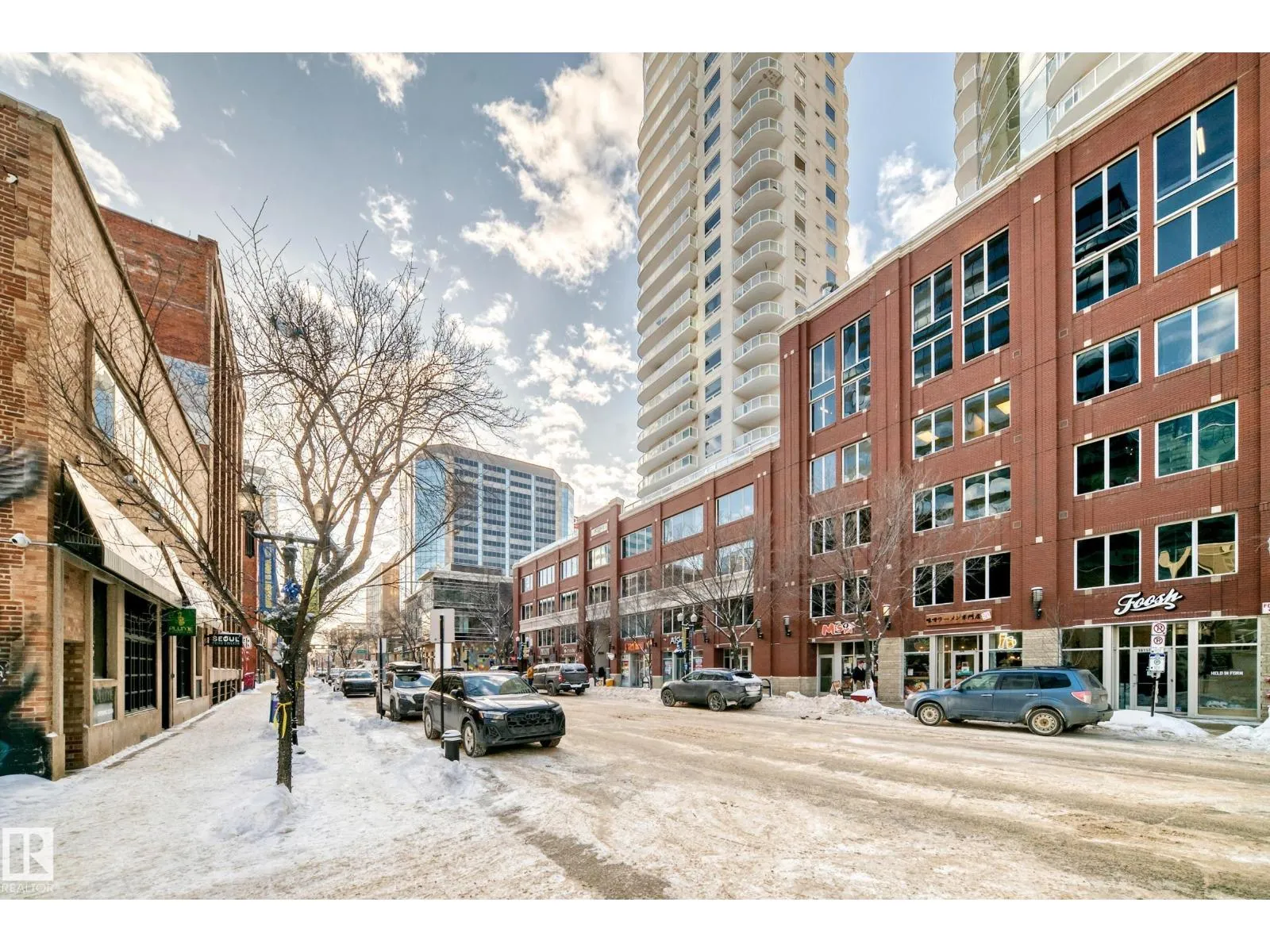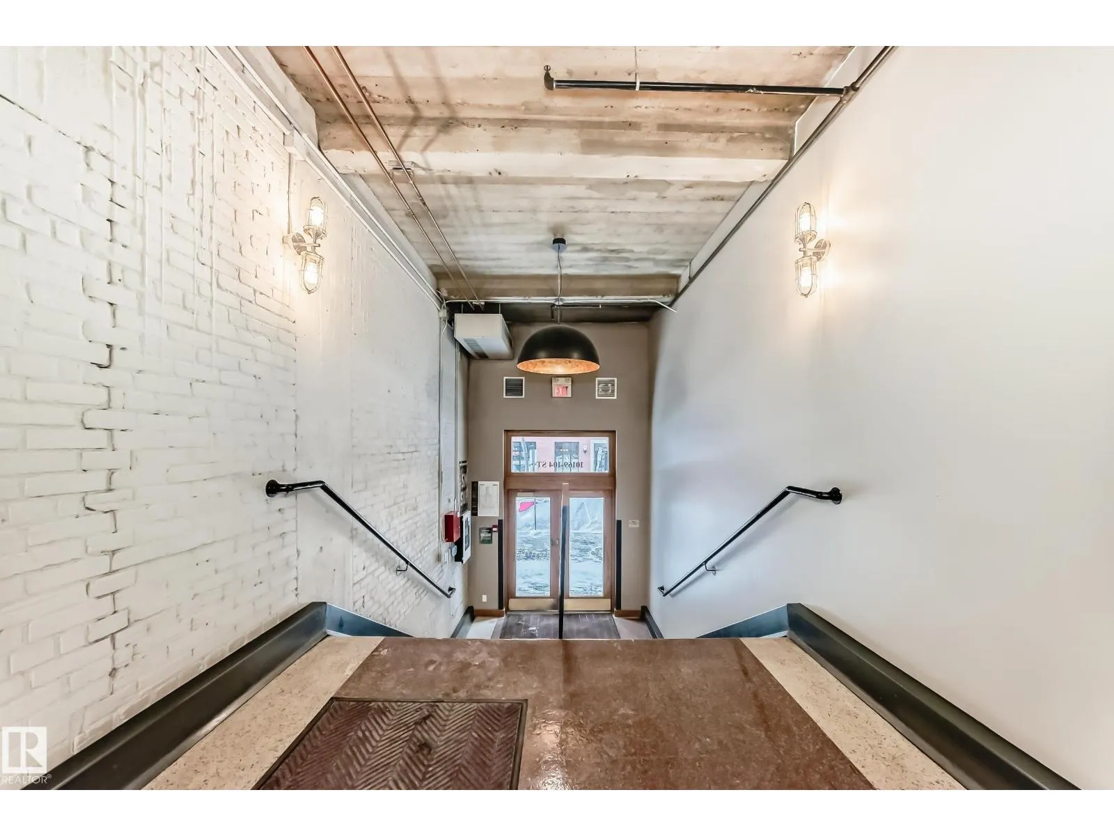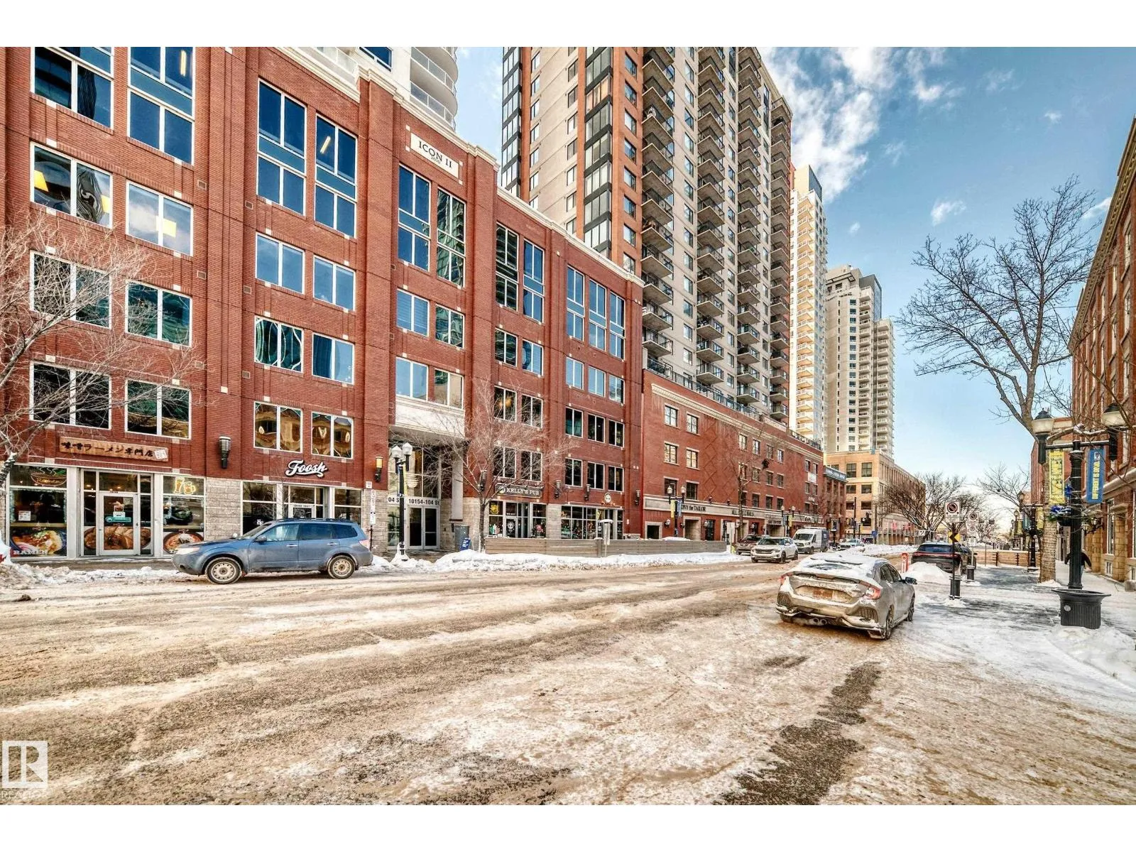 Pristine studio loft in the historic Phillips Lofts. This stunning warehouse-style unit offers 1,050 sq. ft. of open-concept living w/ exposed brick, original timber beams, 9â ceilings, & massive windows throughout. Thoughtfully renovated while preserving its character, the kitchen features new quartz countertops, new tile backsplash, refinished cabinets w/ new hardware, deep single-basin sink, & updated faucet, along w/ a premium LG induction range, LG over-the-range microwave, & Danby beverage centre. Custom built-in wardrobe cabinetry includes clothes rail, upper storage, & dimmable LED lighting, maximizing functionality while maintaining the loft aesthetic. Additional storage added w/ a new custom shelf in the front closet. The 4-piece bath includes new full-size LG washer & dryer, & a pocket-door. Maple hardwood floors have been professionally refinished, & the private balcony is enhanced w/ Turkish pendant lighting. Unbeatable location steps from Rogers Place, Jasper Ave., restaurants, cafés, &LRT. (id:27476)