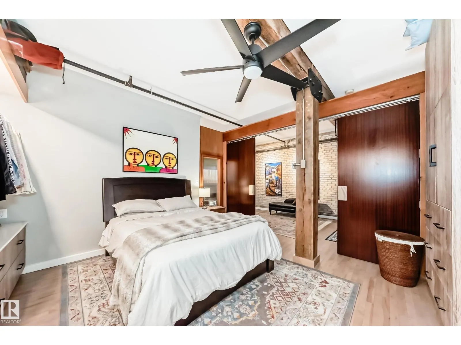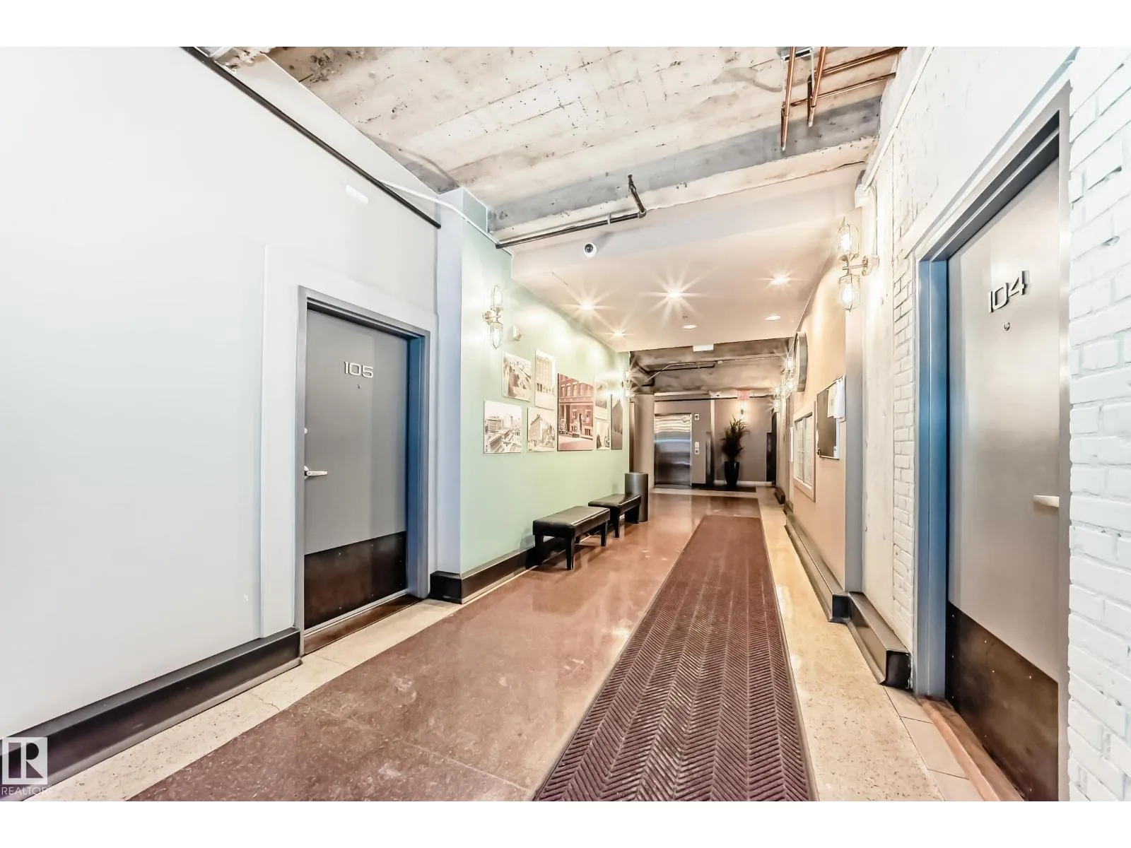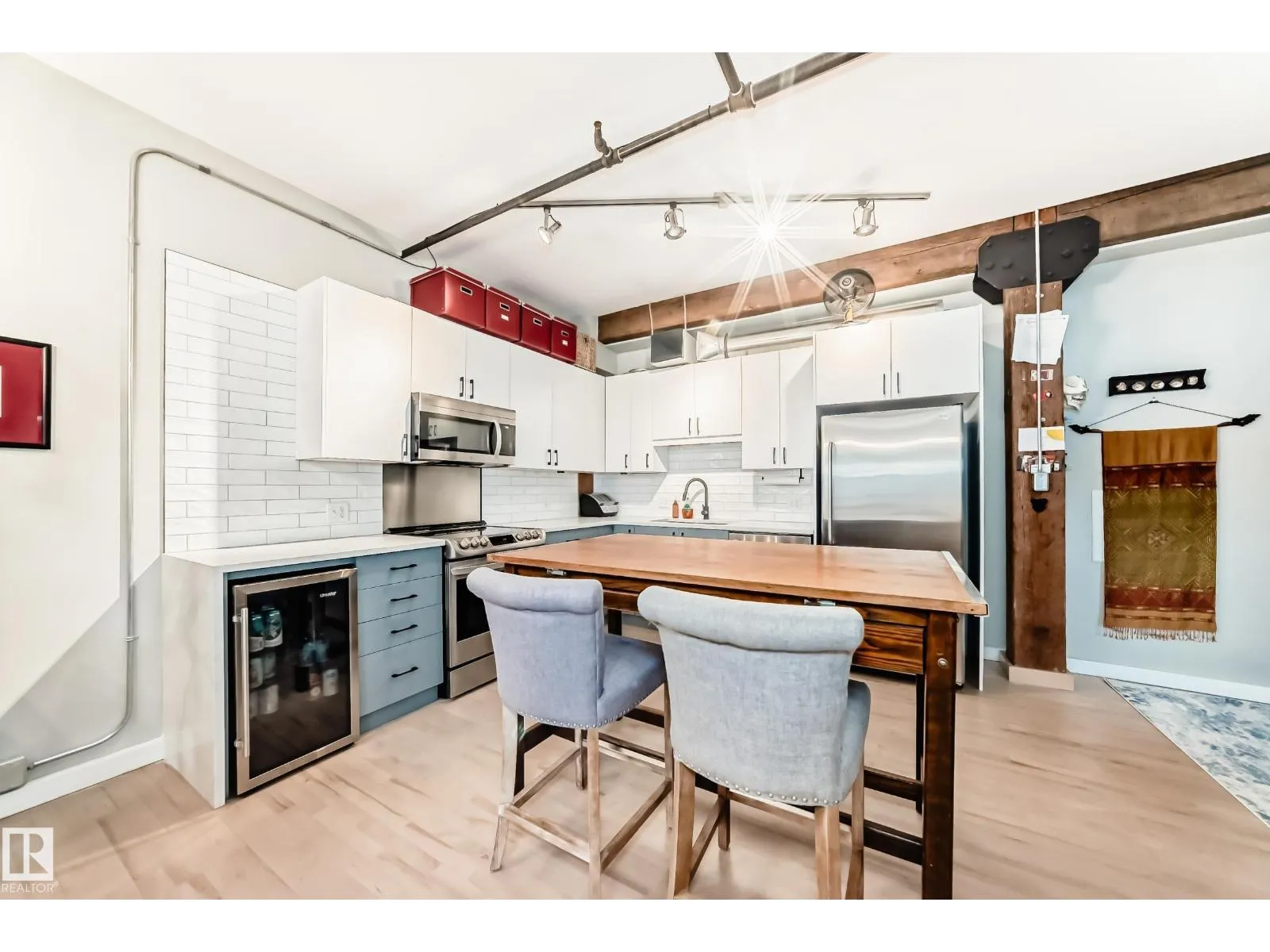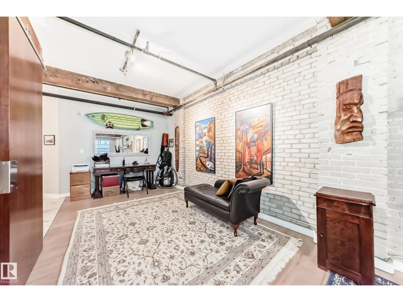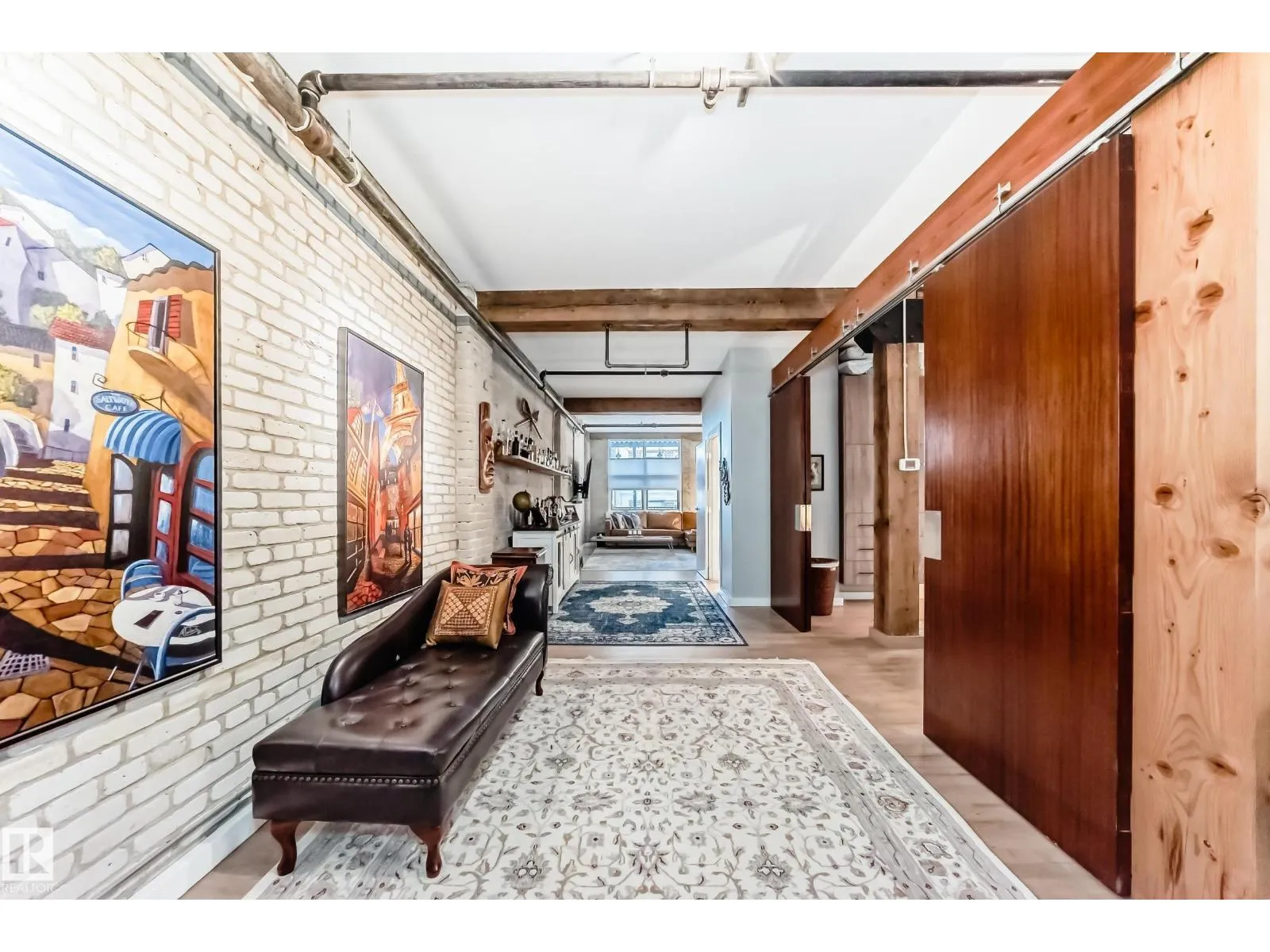 Pristine studio loft in the historic Phillips Lofts. This stunning warehouse-style unit offers 1,050 sq. ft. of open-concept living w/ exposed brick, original timber beams, 9â ceilings, & massive windows throughout. Thoughtfully renovated while preserving its character, the kitchen features new quartz countertops, new tile backsplash, refinished cabinets w/ new hardware, deep single-basin sink, & updated faucet, along w/ a premium LG induction range, LG over-the-range microwave, & Danby beverage centre. Custom built-in wardrobe cabinetry includes clothes rail, upper storage, & dimmable LED lighting, maximizing functionality while maintaining the loft aesthetic. Additional storage added w/ a new custom shelf in the front closet. The 4-piece bath includes new full-size LG washer & dryer, & a pocket-door. Maple hardwood floors have been professionally refinished, & the private balcony is enhanced w/ Turkish pendant lighting. Unbeatable location steps from Rogers Place, Jasper Ave., restaurants, cafés, &LRT. (id:27476)