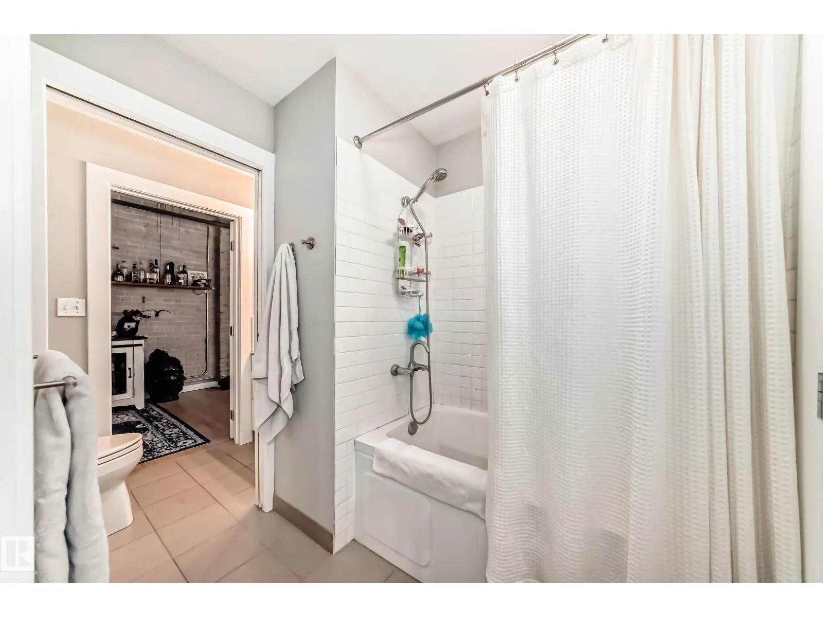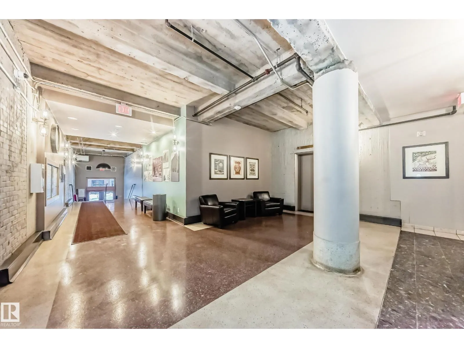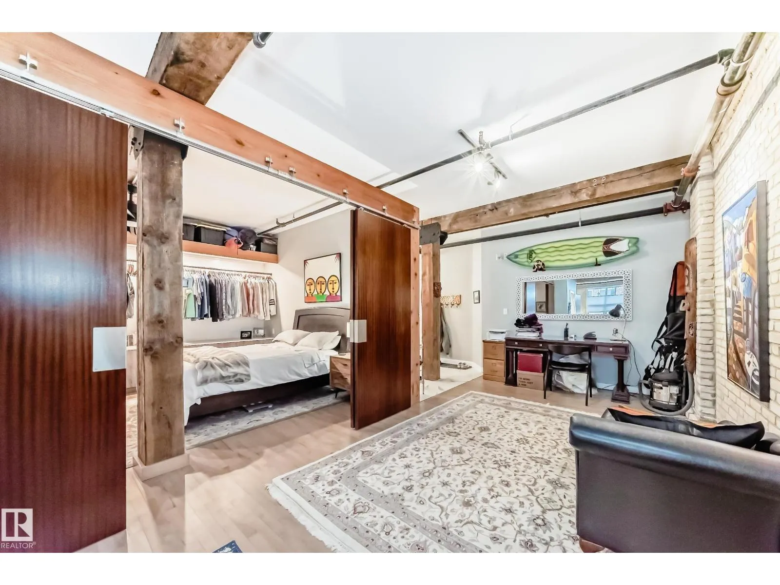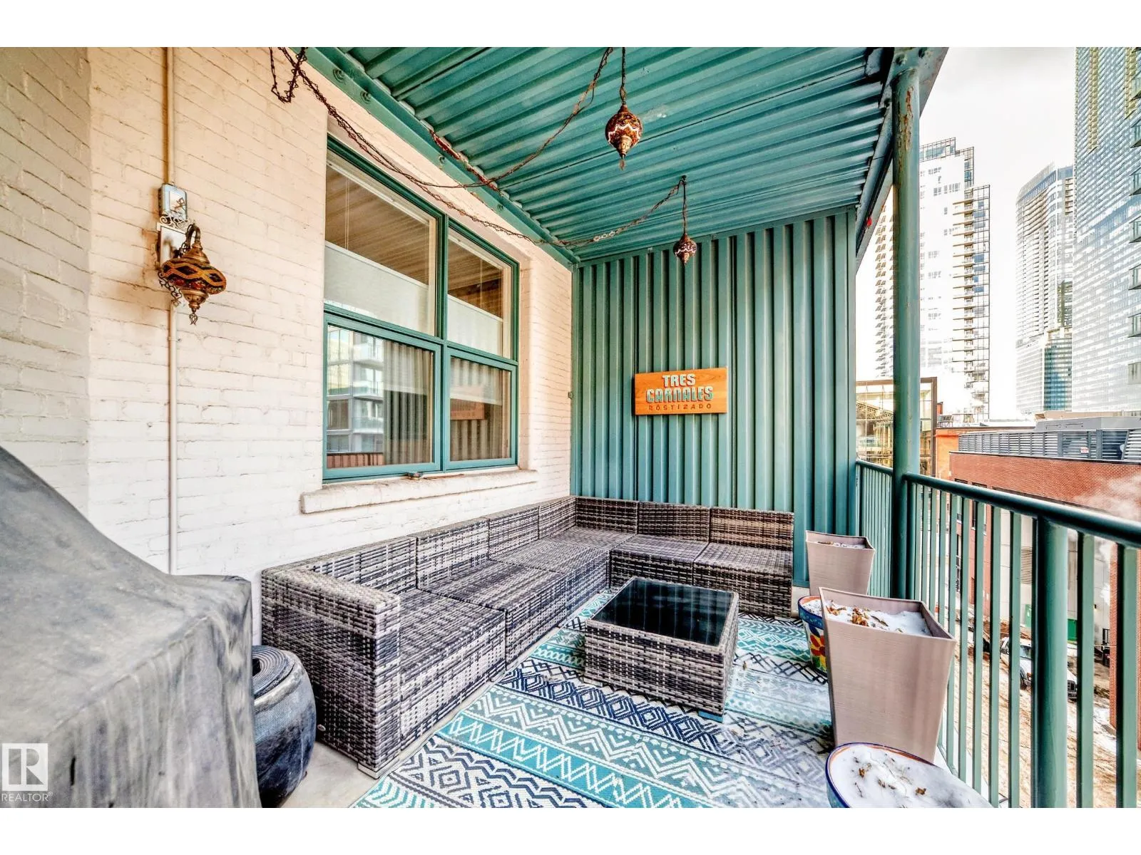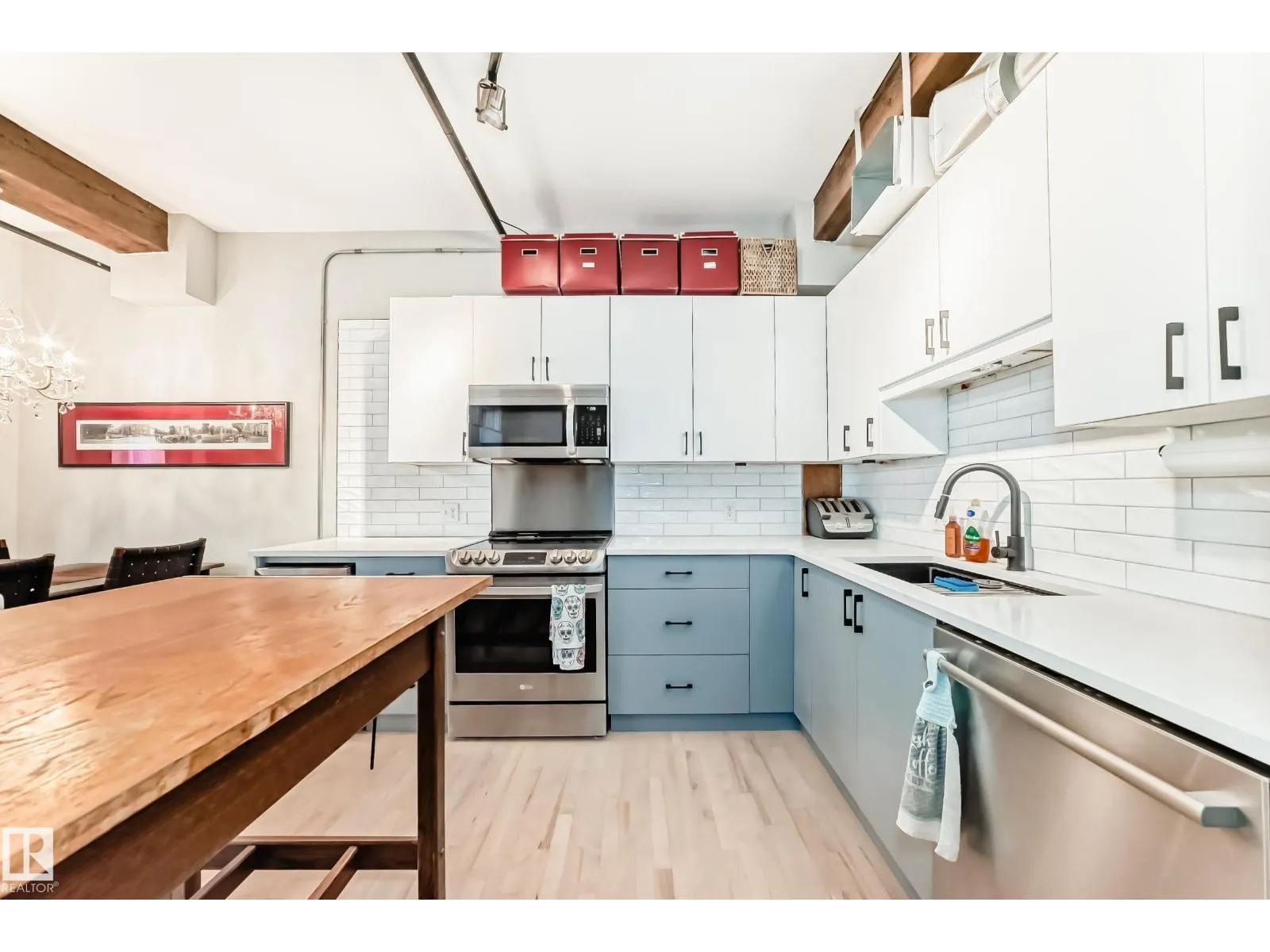 Pristine studio loft in the historic Phillips Lofts. This stunning warehouse-style unit offers 1,050 sq. ft. of open-concept living w/ exposed brick, original timber beams, 9â ceilings, & massive windows throughout. Thoughtfully renovated while preserving its character, the kitchen features new quartz countertops, new tile backsplash, refinished cabinets w/ new hardware, deep single-basin sink, & updated faucet, along w/ a premium LG induction range, LG over-the-range microwave, & Danby beverage centre. Custom built-in wardrobe cabinetry includes clothes rail, upper storage, & dimmable LED lighting, maximizing functionality while maintaining the loft aesthetic. Additional storage added w/ a new custom shelf in the front closet. The 4-piece bath includes new full-size LG washer & dryer, & a pocket-door. Maple hardwood floors have been professionally refinished, & the private balcony is enhanced w/ Turkish pendant lighting. Unbeatable location steps from Rogers Place, Jasper Ave., restaurants, cafés, &LRT. (id:27476)
