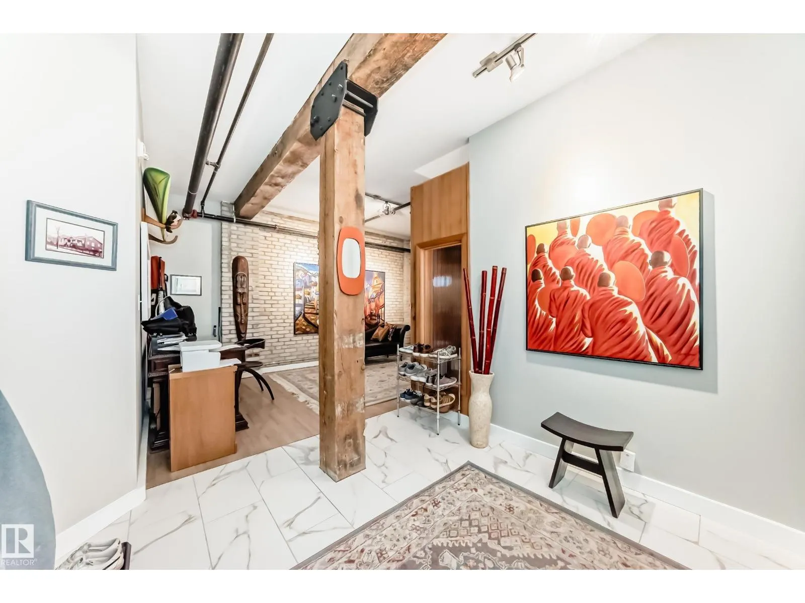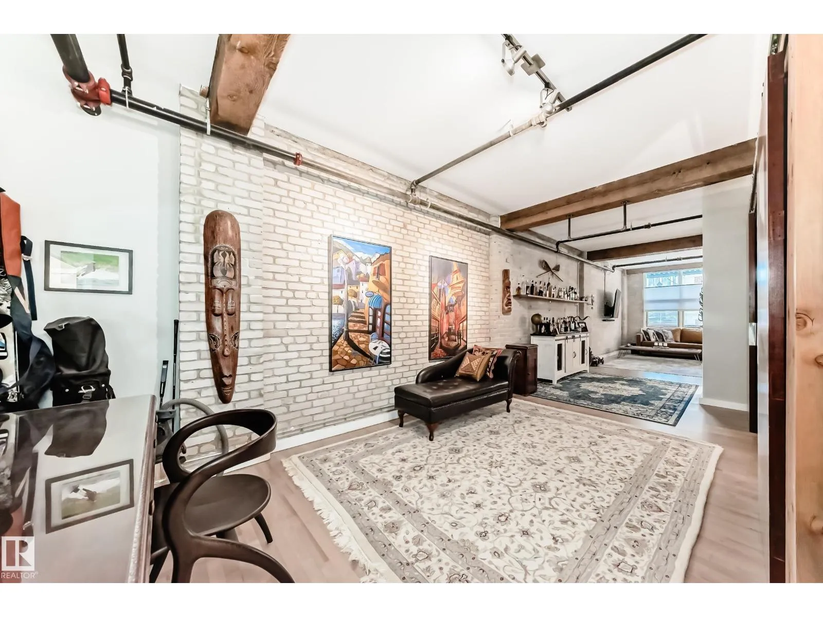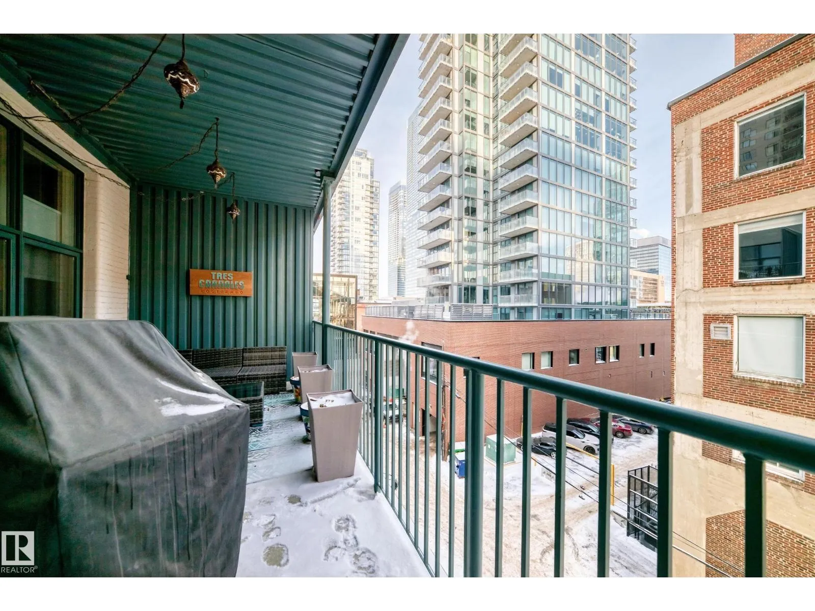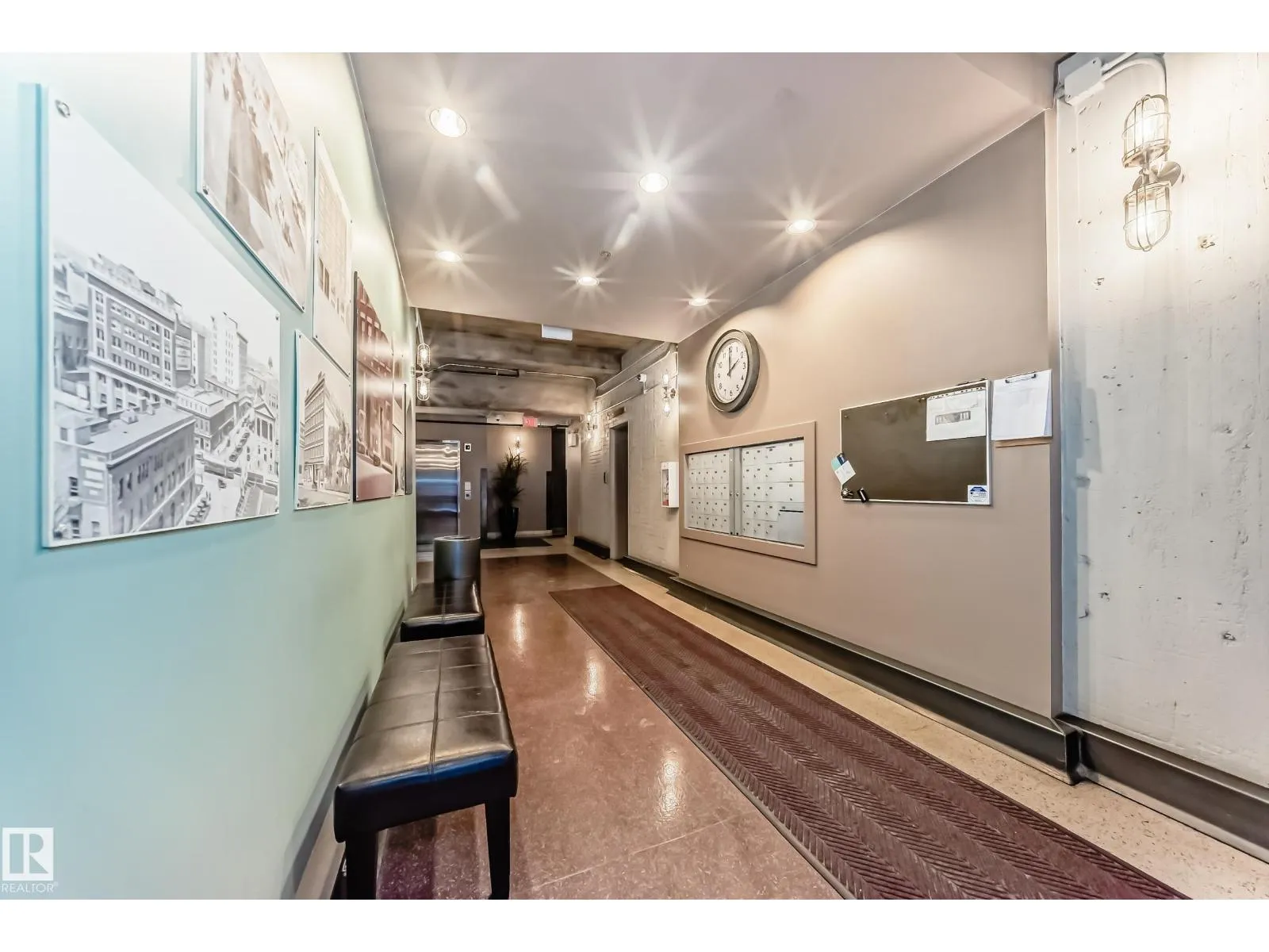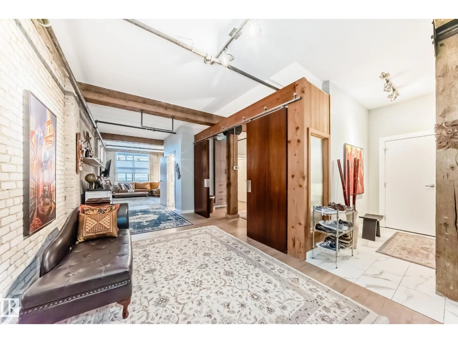 Pristine studio loft in the historic Phillips Lofts. This stunning warehouse-style unit offers 1,050 sq. ft. of open-concept living w/ exposed brick, original timber beams, 9â ceilings, & massive windows throughout. Thoughtfully renovated while preserving its character, the kitchen features new quartz countertops, new tile backsplash, refinished cabinets w/ new hardware, deep single-basin sink, & updated faucet, along w/ a premium LG induction range, LG over-the-range microwave, & Danby beverage centre. Custom built-in wardrobe cabinetry includes clothes rail, upper storage, & dimmable LED lighting, maximizing functionality while maintaining the loft aesthetic. Additional storage added w/ a new custom shelf in the front closet. The 4-piece bath includes new full-size LG washer & dryer, & a pocket-door. Maple hardwood floors have been professionally refinished, & the private balcony is enhanced w/ Turkish pendant lighting. Unbeatable location steps from Rogers Place, Jasper Ave., restaurants, cafés, &LRT. (id:27476)
